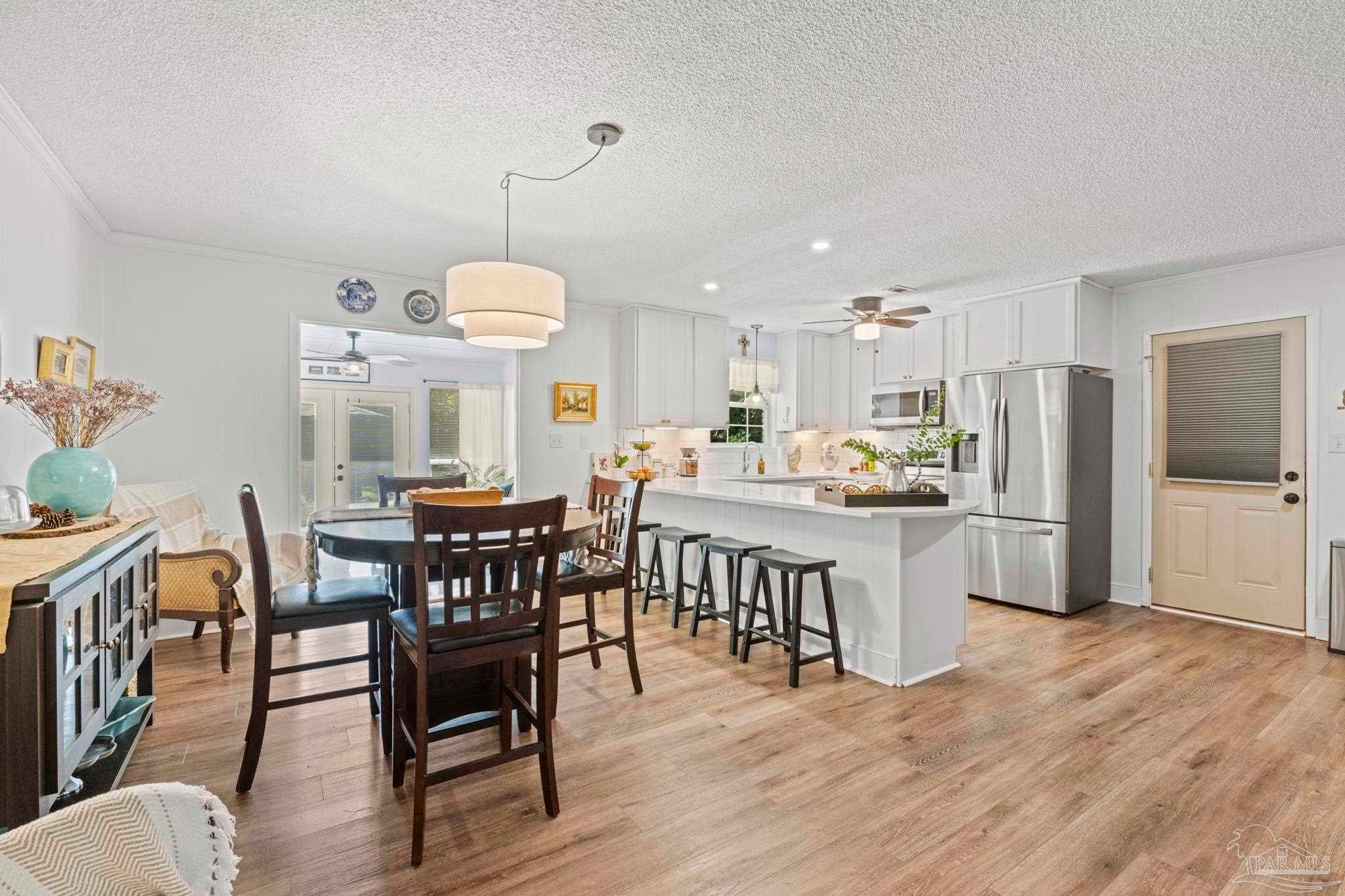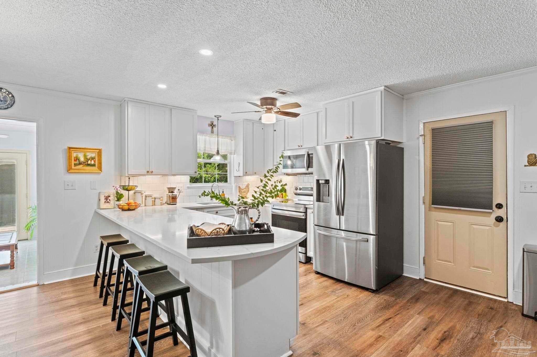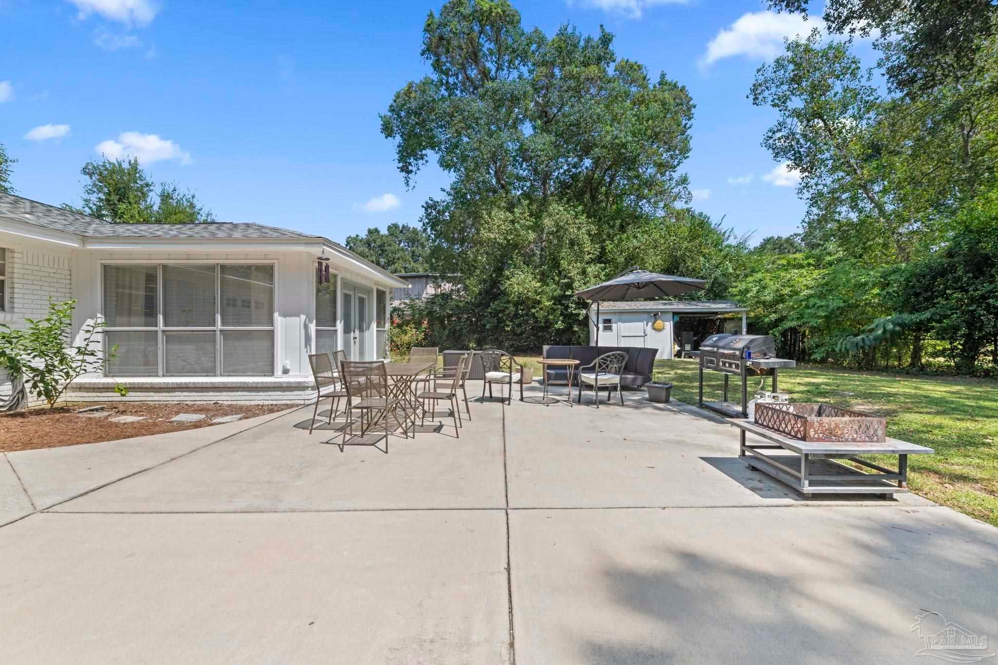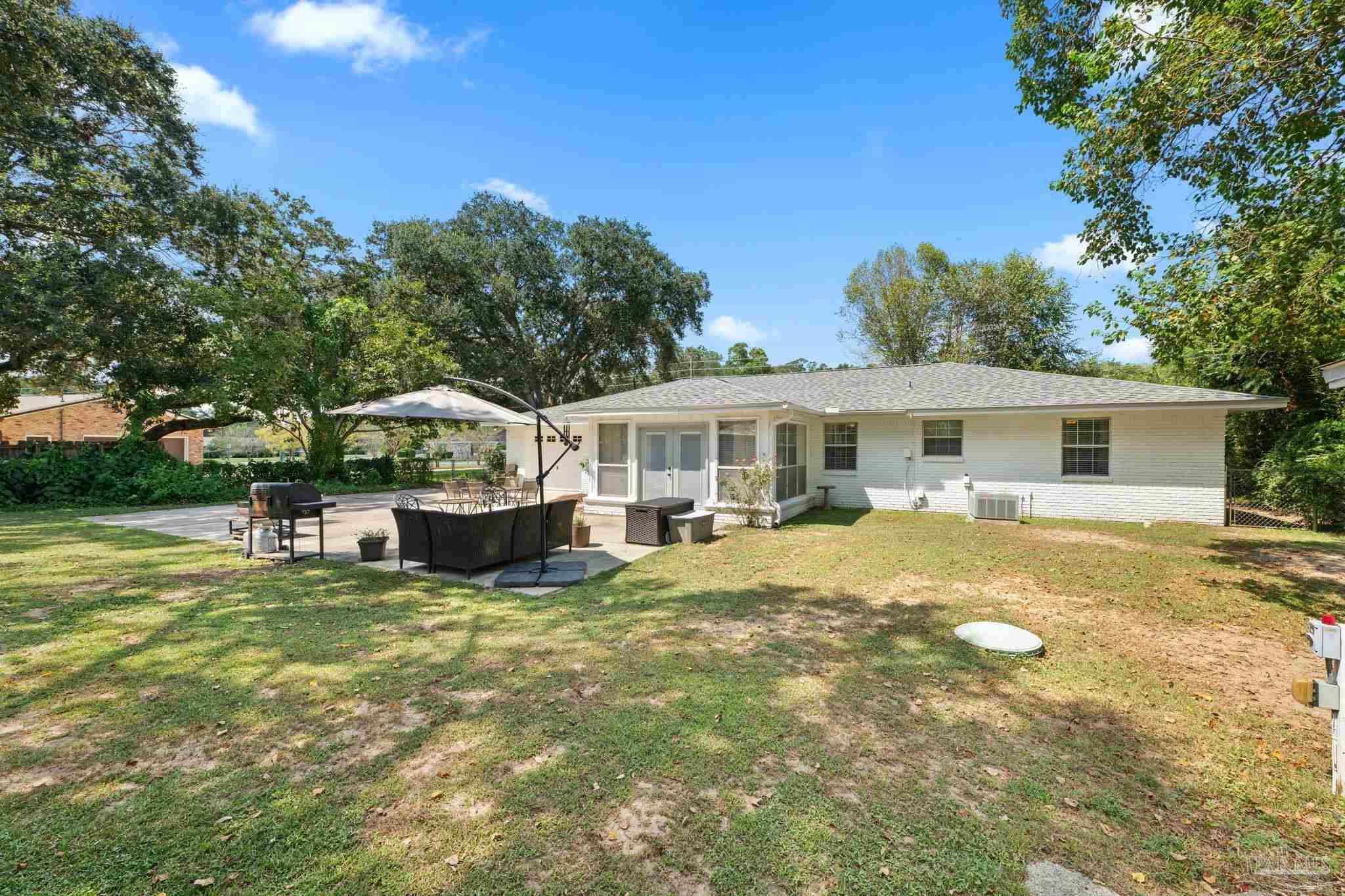 Welcome home! This brick, ranch-style home is a true classic with an open concept living area, 3 beds, 2 baths, and a sunroom. Located in NW Pensacola, only 5 minutes from I-10, shopping, dining, theaters, schools, and the airport are only minutes away! The interior of the home has two dining areas, and a living room with built-in book cases. The stunning kitchen features high-end finishes including stainless-steel appliances and quartz countertops, this kitchen will be a joy to entertain in. Throughout the home you will notice fresh paint, tastefully selected light fixtures, and new LVP floors continuing from main rooms to the bathrooms, making easy cleaning. The master suite has two closets and a remodeled bathroom with a lovely walk-in, tile shower. Outdoor living provides many amenities including a large, third of an acre with fenced in backyard, tool shed with electricity, oversized patio, rear-loading, single car garage and enough driveway space to park an RV. (All concrete poured in ‘22.) Many extensive updates have recently been made to ensure your enjoyment for years to come, including a roof (‘22), HVAC (brand new), and rewire. Only 30 minutes from Pensacola Beach and Perdido Key Beach, the white sands and sparkling waters of the Gulf Coast are near this quintessential FL home. Book your showing today!