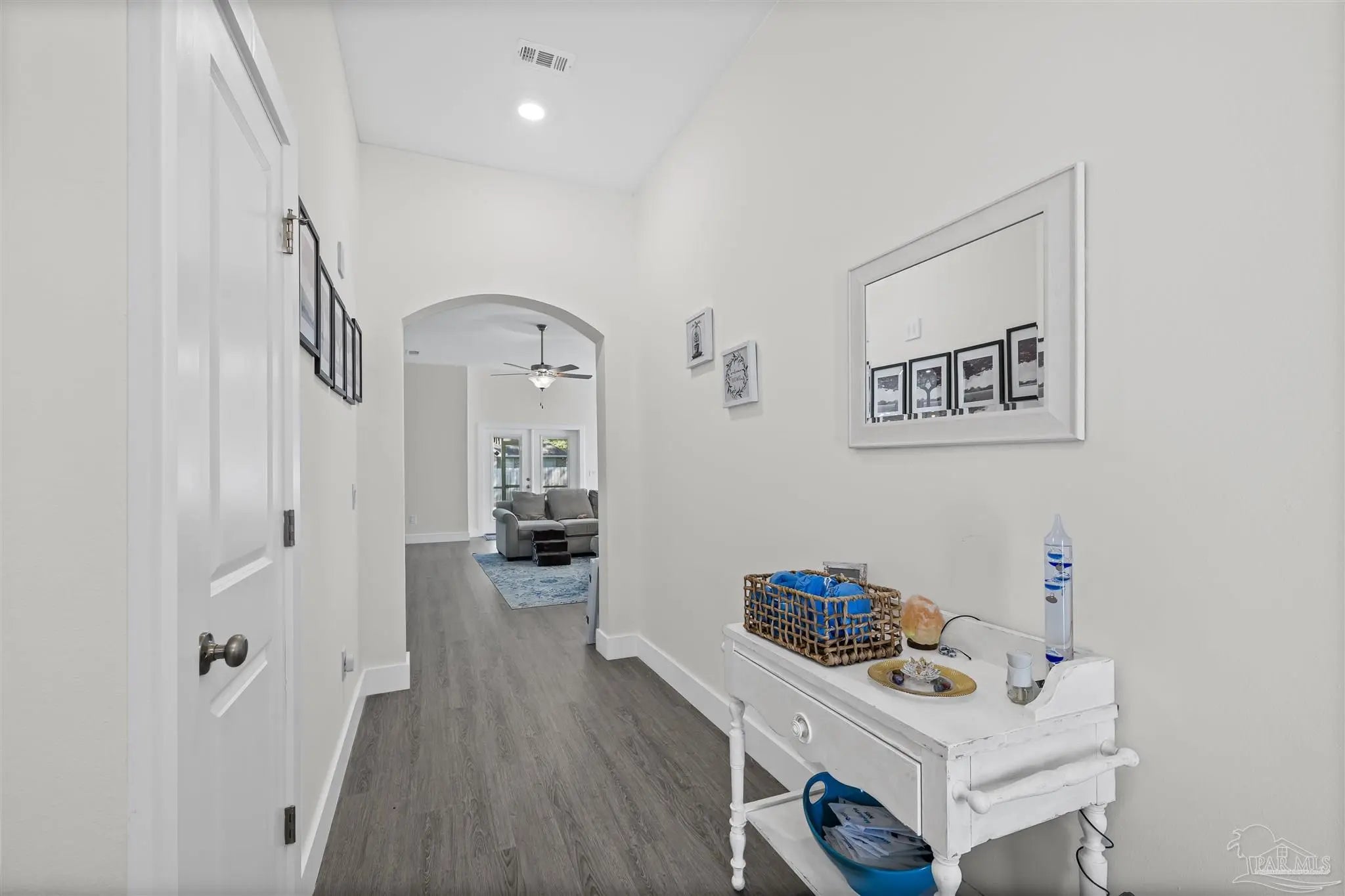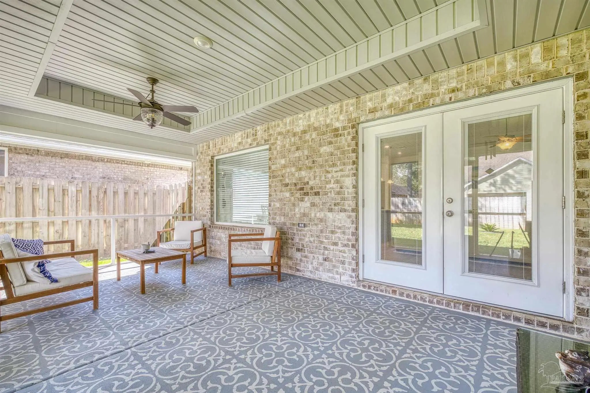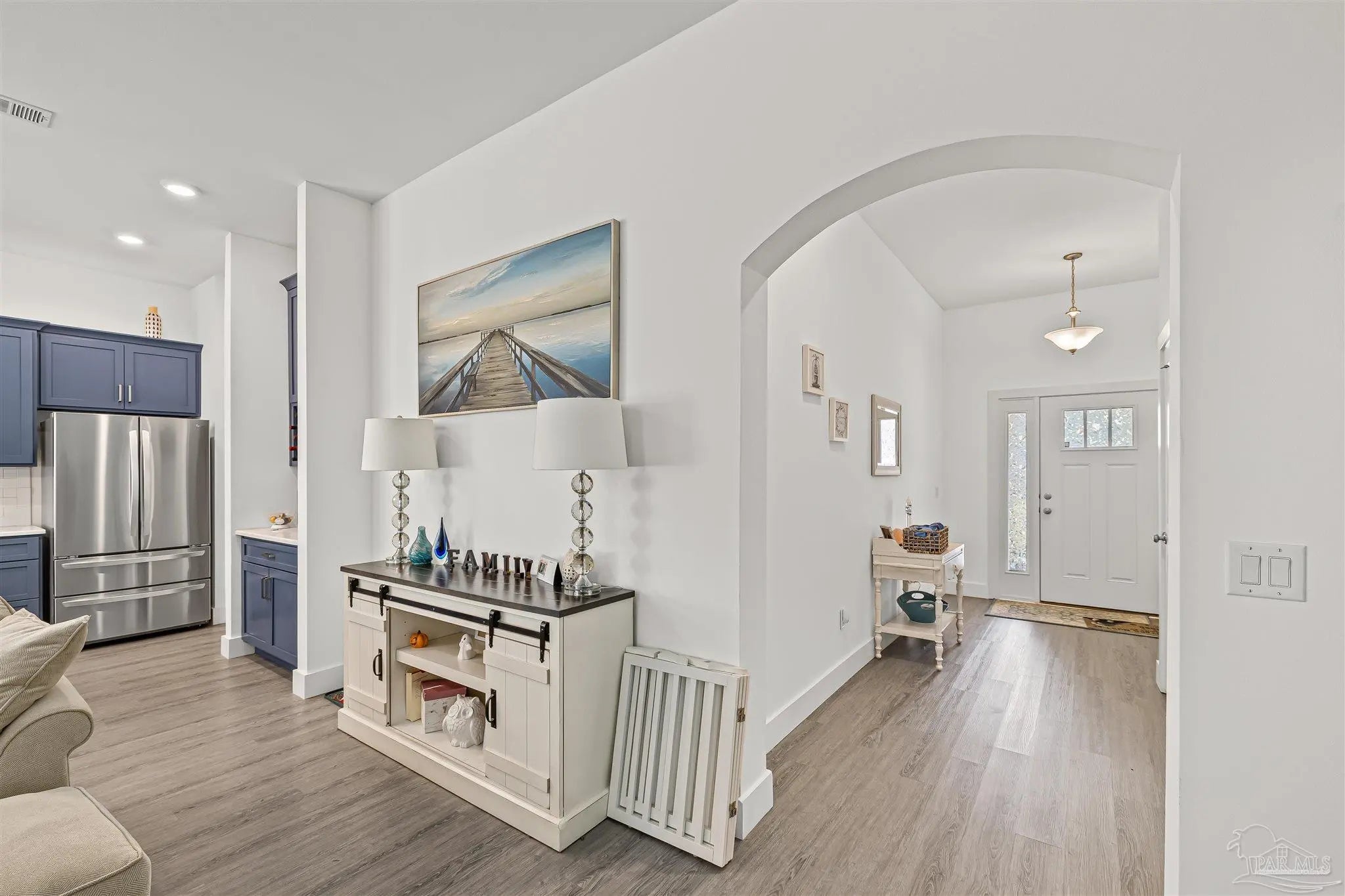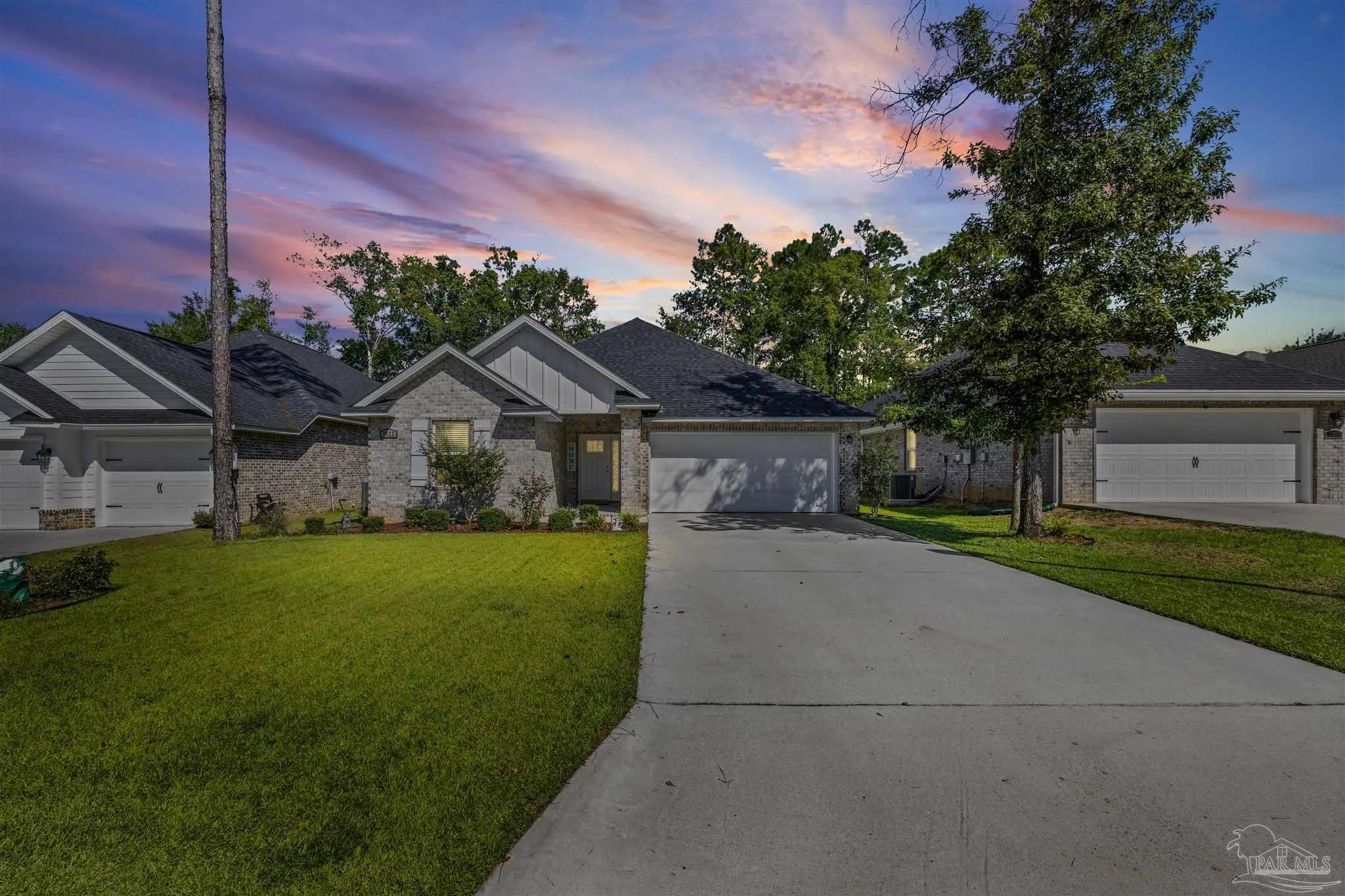 Stonechase Gated Community in Pace, FL is synonymous with class, charm and quality construction. This Semi-Custom, all brick home with premium upgrades is a unique opportunity that you wont find anywhere else in the neighborhood and was completed by the neighborhood's original builder! Note the ornate custom printed concrete as you approach the front door. Grand entry ceilings greet you as you enter the home. Drop your outerwear in the coat closet on your way into the open floorplan's living space. The Chef's Kitchen is loaded with custom features, like Calcutta Luna Quartz counters, Solid Maple Cabinets in elegant blue, premium Samsung gas range with dedicated ventilation, built in wine storage, subway tile backsplash and premium (non builder grade) appliances like the Bostch dishwasher and LG refrigerator. Plenty of prep and service space for any size gathering! Both bathrooms are fitted with Shadow Blue Marble counters and custom cabinetry. The large master suite is finished with a box trey ceilings and ensuite bathroom with even more custom upgrades. The tub is a stand alone, with separate Romana Tile Shower and independent water closet for privacy. The oversized walk in closet is double hung and has built in shelving and drawers as well. Not a stitch of carpet with LVP lining the entire home with scratch and water resistant LVP flooring throughout. Bali premium blinds on the windows. Recessed LED lighting, custom fixtures and Horchow ceiling fans, The front bedroom features a vault ceiling, opening up the space. The yard is tastefully landscaped and well manicured, with reclaimed water irrigation, fully fenced backyard and screened in back porch for outdoor entertaining without the bugs! Smart doorbell and Garage Door Opener with Fiber internet lines in multiple rooms. Samsung Washer and Dryer can convey. Eligible for USDA 100% No Down Payment Financing - Call today for a tour!