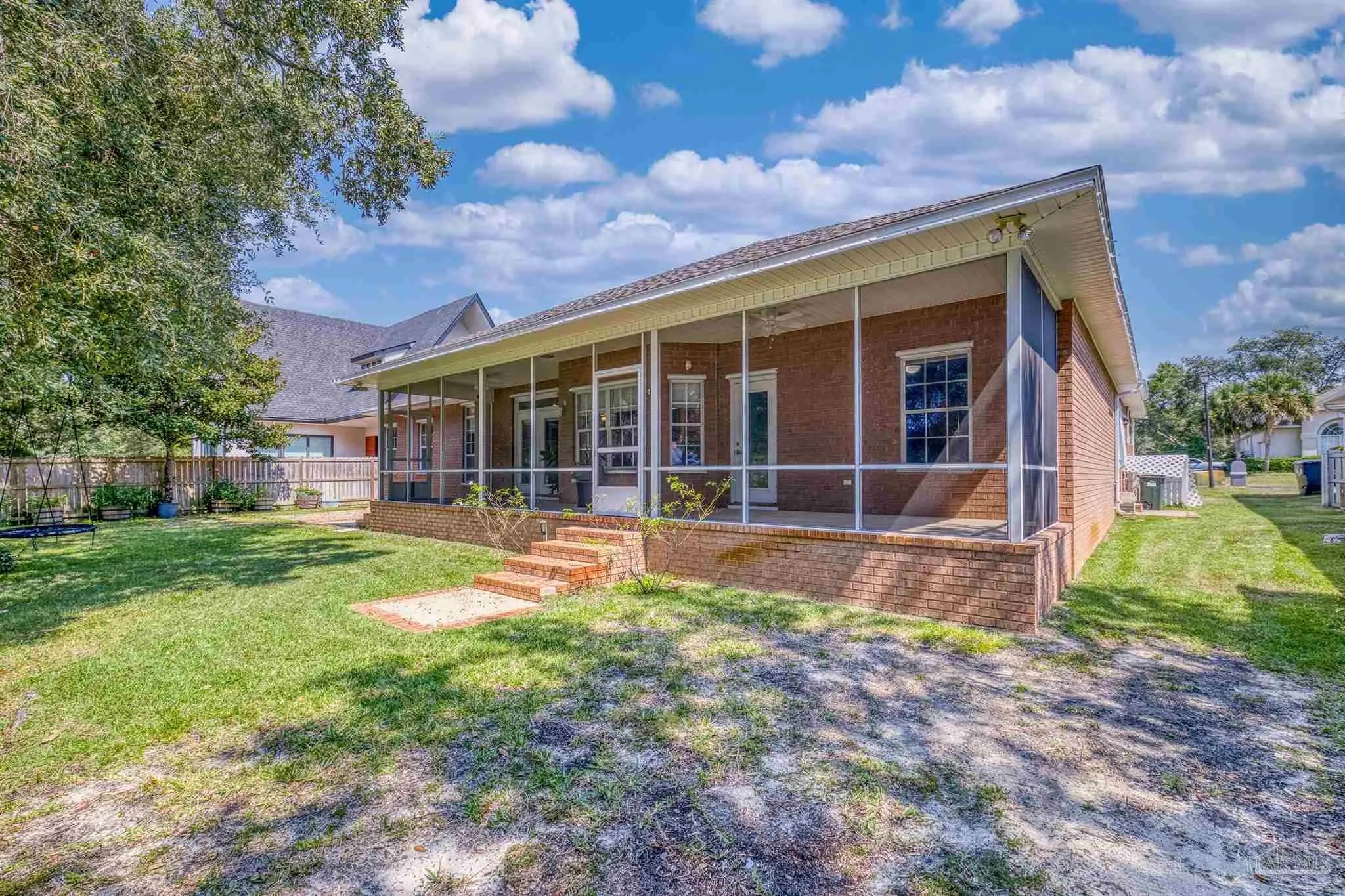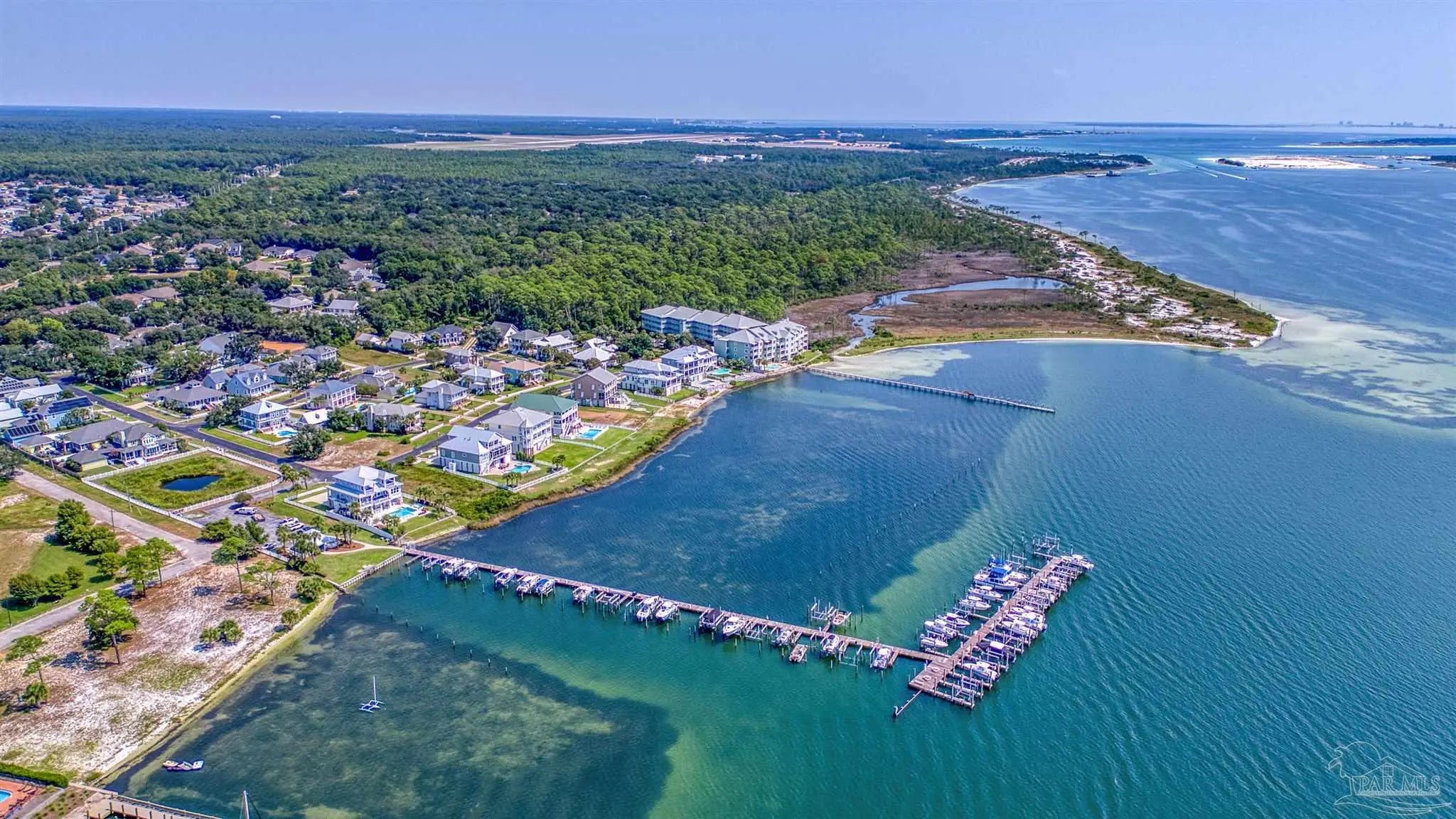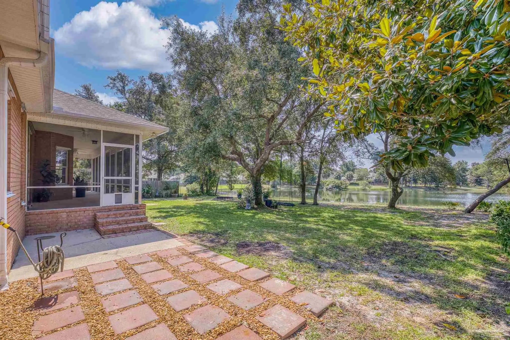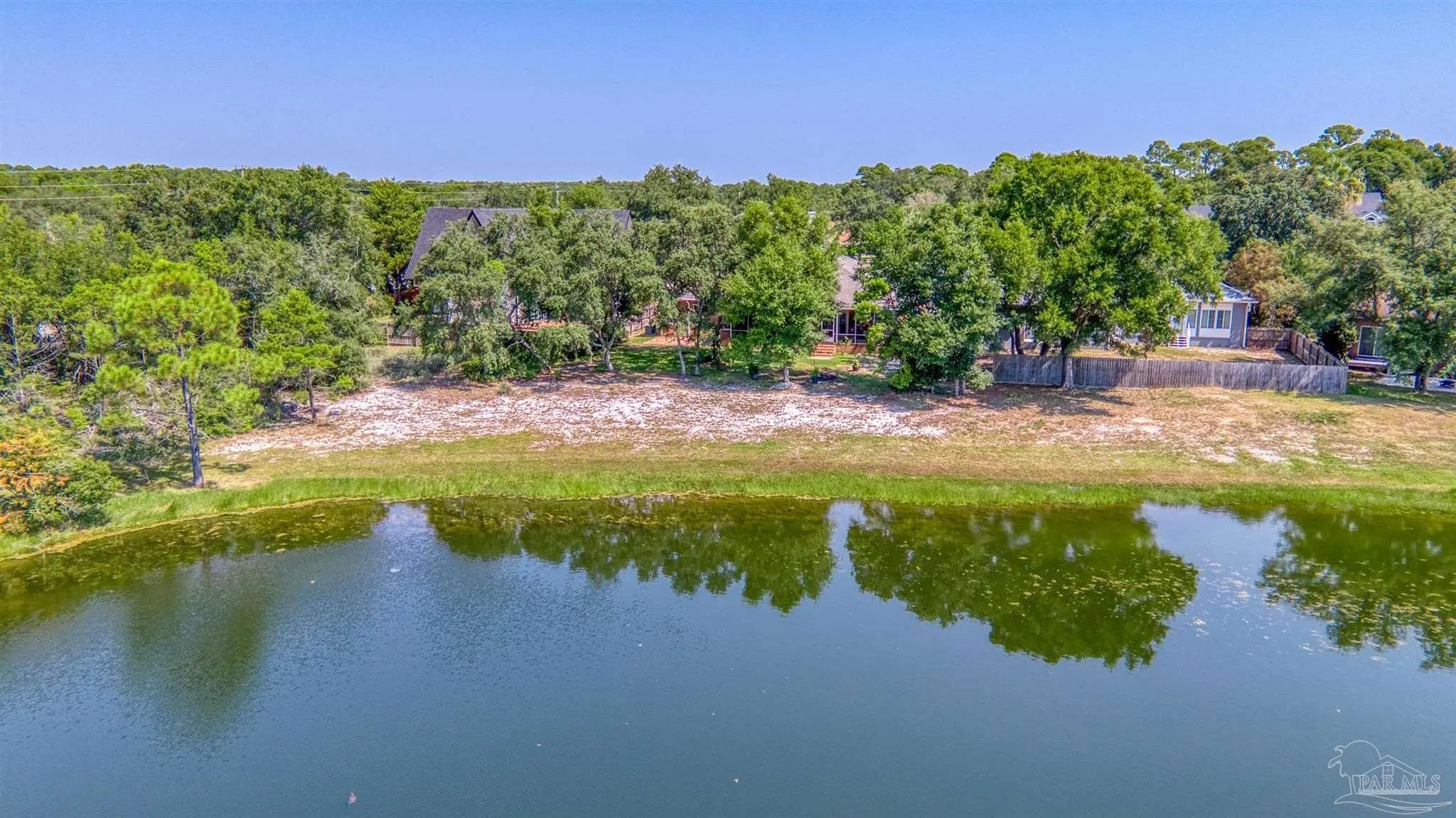 Landfall Subdivision, a maritime community in Perdido Key. This 4 Bed 2.5 Bath single story brick home backs up to a serene pond with mature trees and a variety of colorful healthy potted plants. Step into a bright and inviting foyer with crown molding, wainscoting, a chandelier and soft designer paint creating a welcoming ambiance. Beautiful well-maintained LVP flooring and built-in–shelving with a charming gas fireplace as a focal point in the spacious living room. Open concept living room with natural light from large windows, with seamless flow to adjacent rooms and French doors that allow access to the backyard for indoor-outdoor living. Modern stainless steel appliances, including gas range, built-in microwave, and French-door refrigerator. Honed granite countertops and mosaic tile backsplash compliments the elegant white cabinets and the farmhouse sink. The open floor plan flows into a bright breakfast nook surrounded by windows, with natural light shining in. There is a nice view of the pond from the Primary Bedroom. The bathroom features a freestanding soaking tub beneath a glass block window for great natural light. Dual granite vanities with ample storage and a walk in shower with a sliding glass door. Split floor plan, additional three bedrooms and full bath with a tub/shower combo and double vanities on the opposite side of the house. A half bath located close to the kitchen and laundry room. Laundry room has a deep sink, hanging rod for clothes and cabinets for storage. Large spacious garage. Enjoy the gazebo for picnics and the unlimited view of the Intracoastal waterway from the Marina. A great place to relax, if you're not in your hammock by the pond out back!