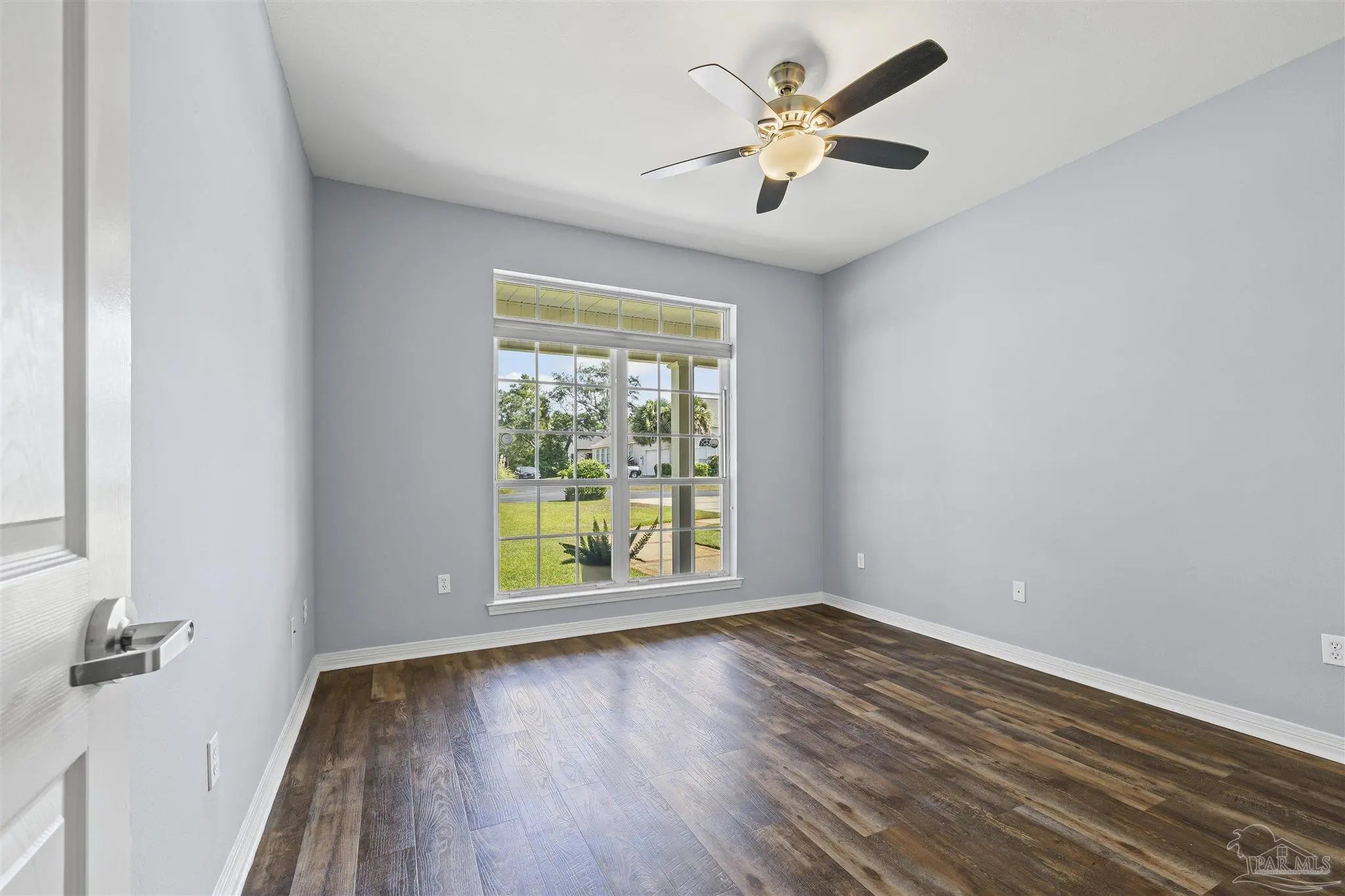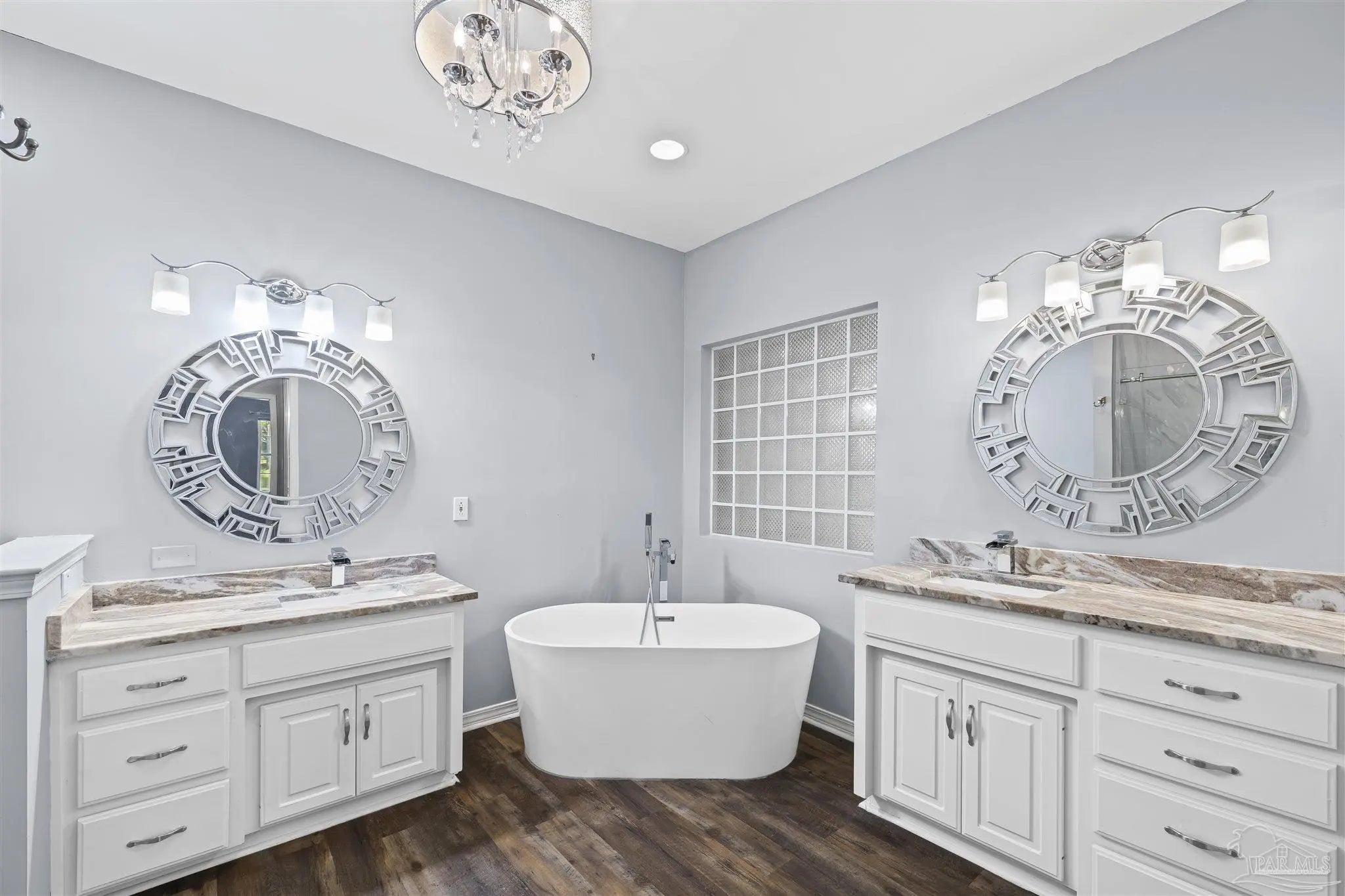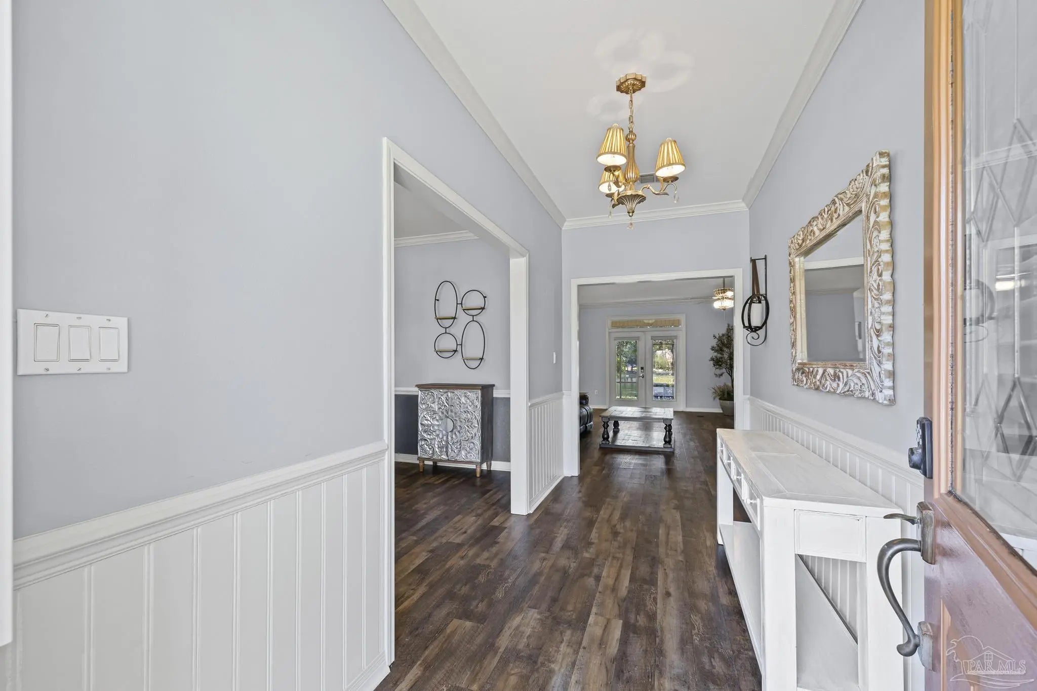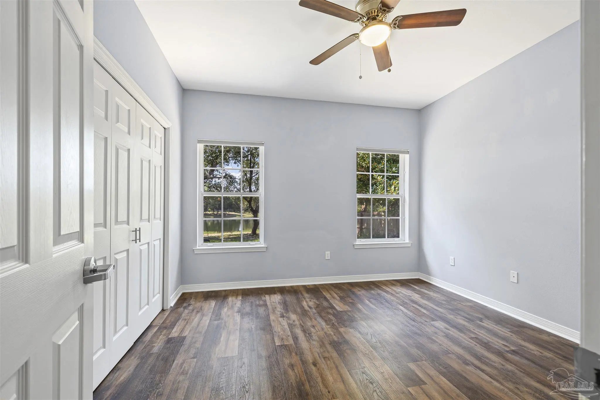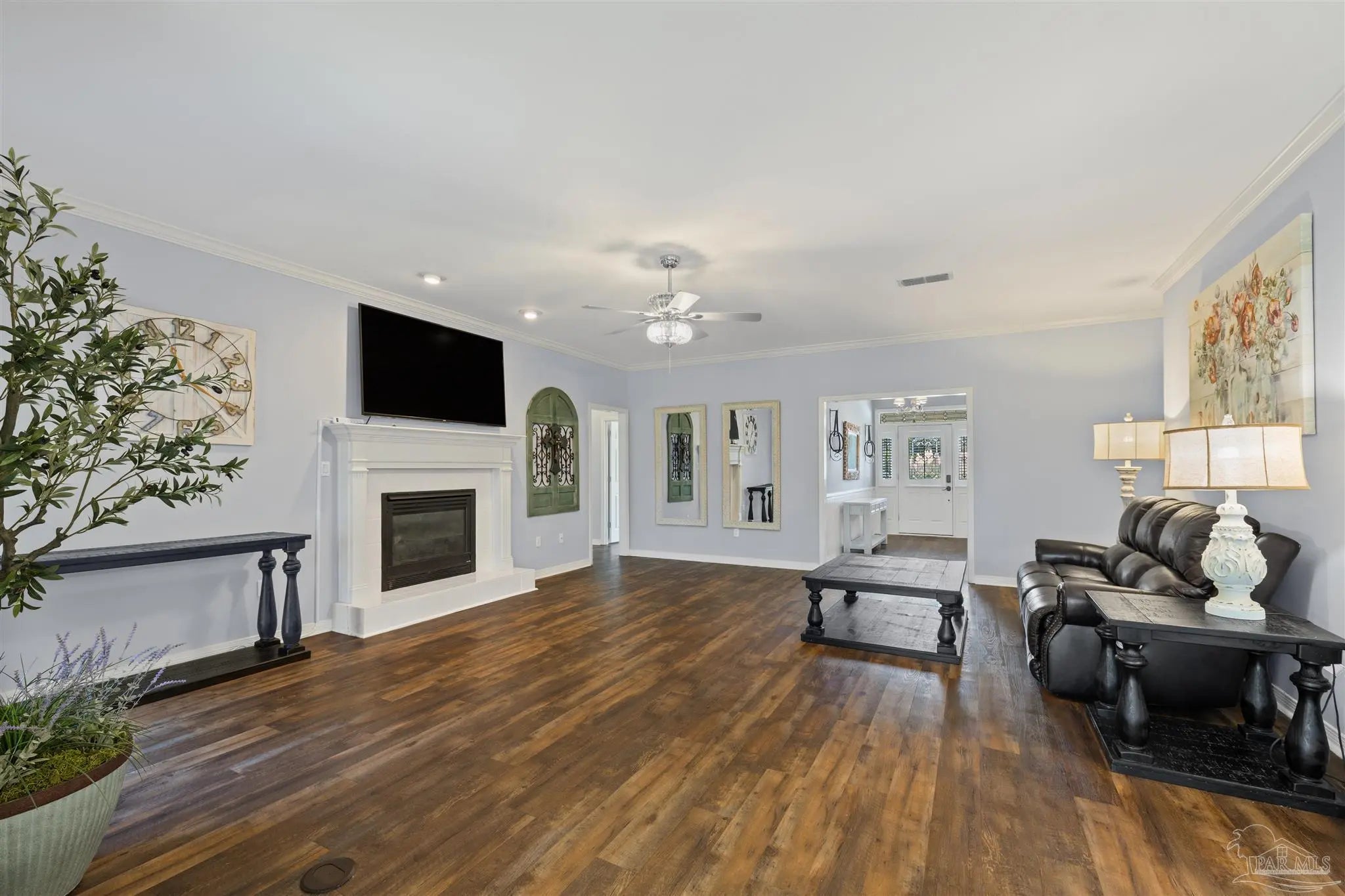 Landfall Subdivision, a maritime community in Perdido Key. This 4 Bed 2.5 Bath single story brick home backs up to a serene pond with mature trees and a variety of colorful healthy potted plants. Step into a bright and inviting foyer with crown molding, wainscoting, a chandelier and soft designer paint creating a welcoming ambiance. Beautiful well-maintained LVP flooring and built-in–shelving with a charming gas fireplace as a focal point in the spacious living room. Open concept living room with natural light from large windows, with seamless flow to adjacent rooms and French doors that allow access to the backyard for indoor-outdoor living. Modern stainless steel appliances, including gas range, built-in microwave, and French-door refrigerator. Honed granite countertops and mosaic tile backsplash compliments the elegant white cabinets and the farmhouse sink. The open floor plan flows into a bright breakfast nook surrounded by windows, with natural light shining in. There is a nice view of the pond from the Primary Bedroom. The bathroom features a freestanding soaking tub beneath a glass block window for great natural light. Dual granite vanities with ample storage and a walk in shower with a sliding glass door. Split floor plan, additional three bedrooms and full bath with a tub/shower combo and double vanities on the opposite side of the house. A half bath located close to the kitchen and laundry room. Laundry room has a deep sink, hanging rod for clothes and cabinets for storage. Large spacious garage. Enjoy the gazebo for picnics and the unlimited view of the Intracoastal waterway from the Marina. A great place to relax, if you're not in your hammock by the pond out back!