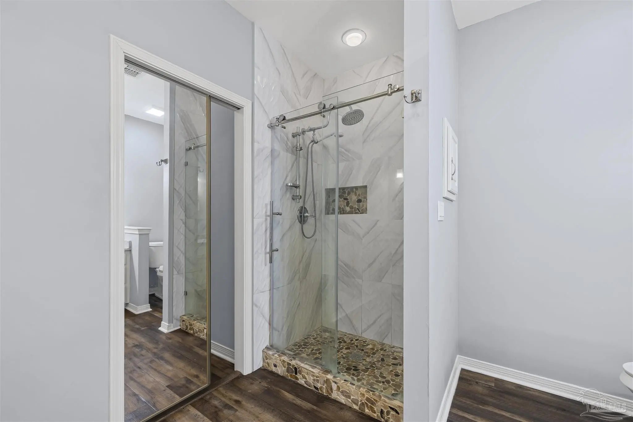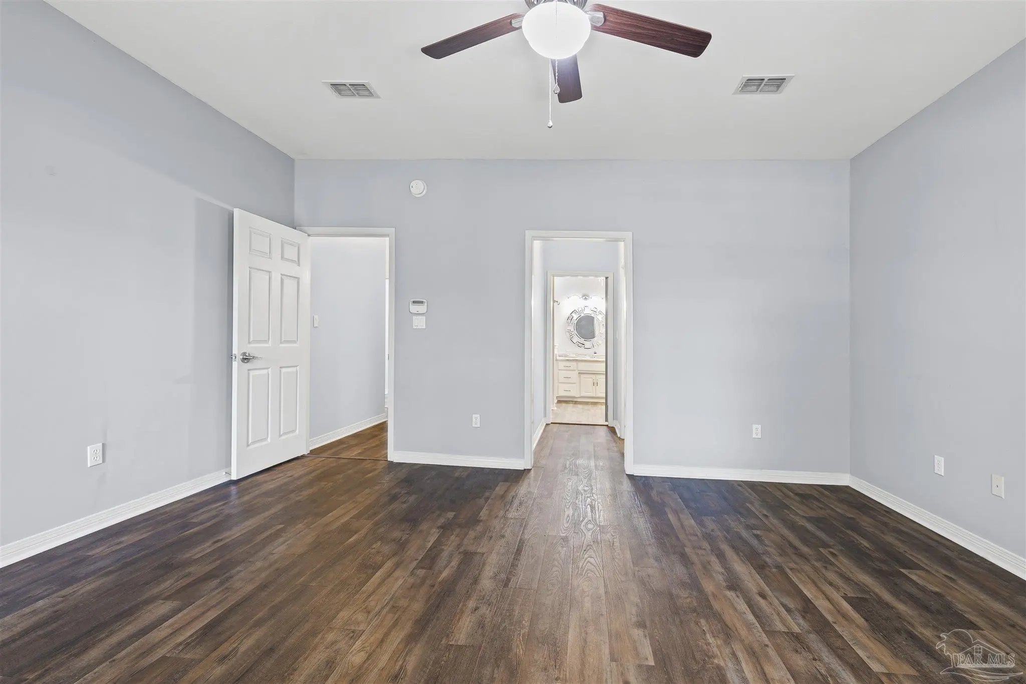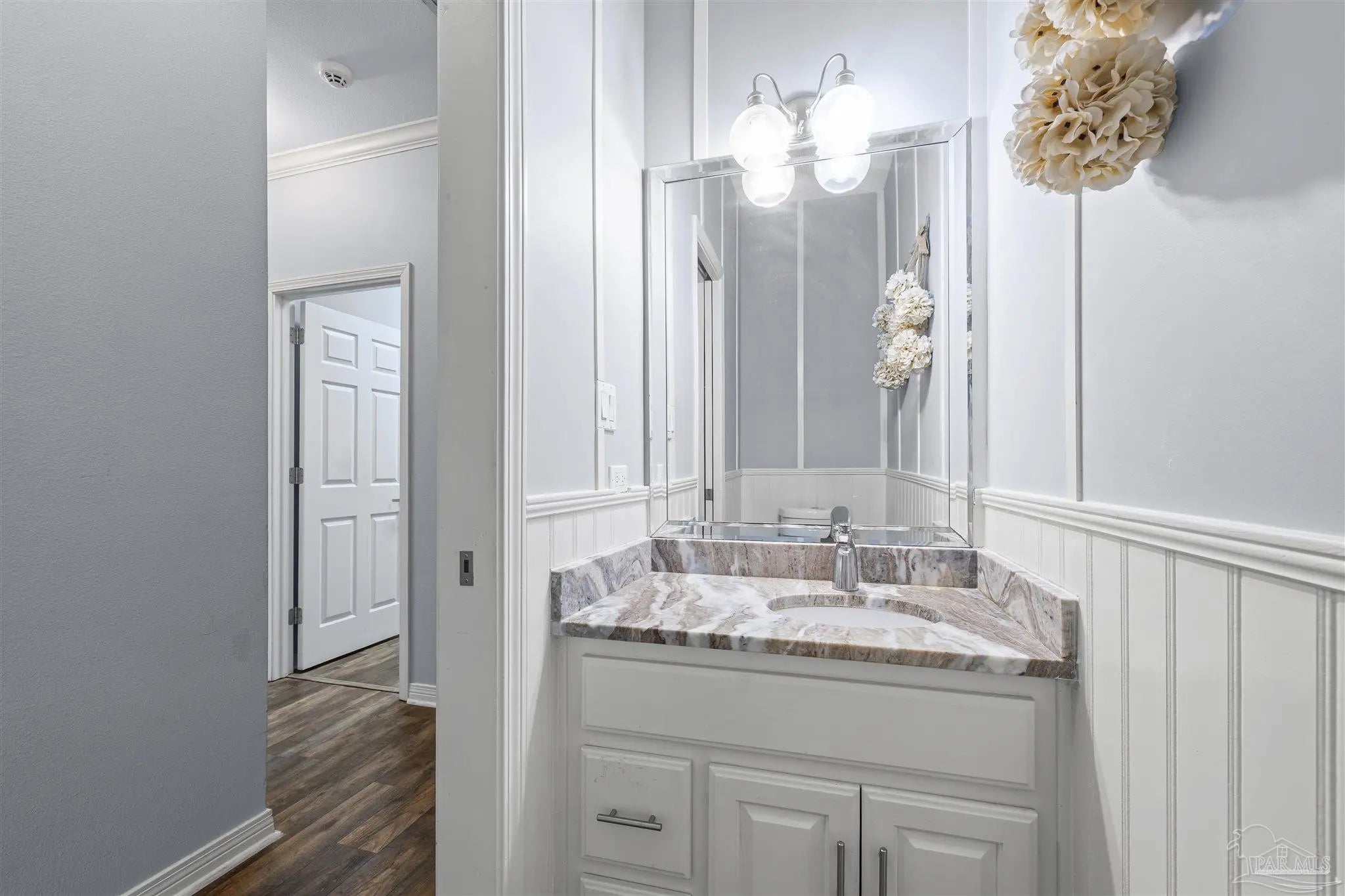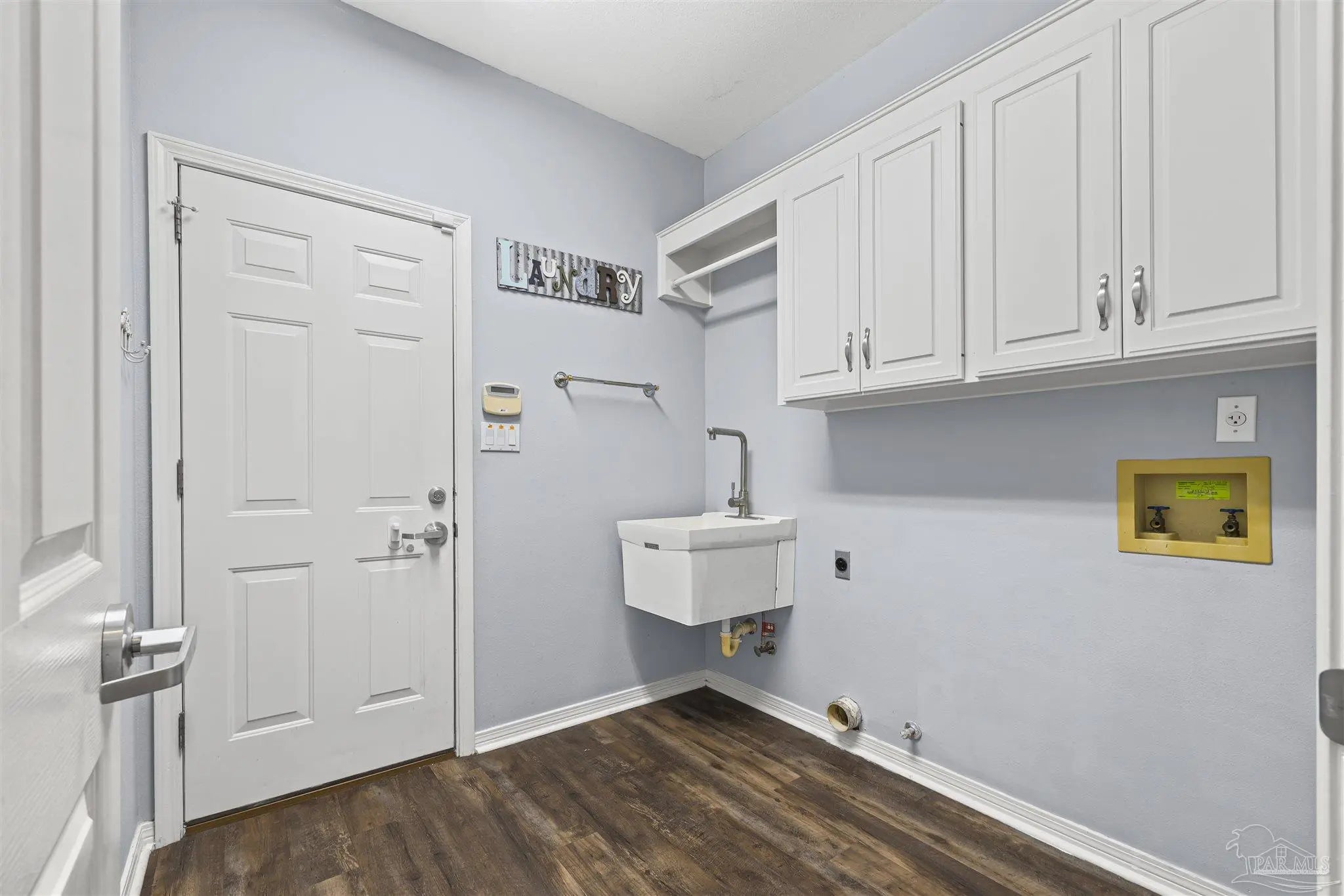 Landfall Subdivision, a maritime community in Perdido Key. This 4 Bed 2.5 Bath single story brick home backs up to a serene pond with mature trees and a variety of colorful healthy potted plants. Step into a bright and inviting foyer with crown molding, wainscoting, a chandelier and soft designer paint creating a welcoming ambiance. Beautiful well-maintained LVP flooring and built-in–shelving with a charming gas fireplace as a focal point in the spacious living room. Open concept living room with natural light from large windows, with seamless flow to adjacent rooms and French doors that allow access to the backyard for indoor-outdoor living. Modern stainless steel appliances, including gas range, built-in microwave, and French-door refrigerator. Honed granite countertops and mosaic tile backsplash compliments the elegant white cabinets and the farmhouse sink. The open floor plan flows into a bright breakfast nook surrounded by windows, with natural light shining in. There is a nice view of the pond from the Primary Bedroom. The bathroom features a freestanding soaking tub beneath a glass block window for great natural light. Dual granite vanities with ample storage and a walk in shower with a sliding glass door. Split floor plan, additional three bedrooms and full bath with a tub/shower combo and double vanities on the opposite side of the house. A half bath located close to the kitchen and laundry room. Laundry room has a deep sink, hanging rod for clothes and cabinets for storage. Large spacious garage. Enjoy the gazebo for picnics and the unlimited view of the Intracoastal waterway from the Marina. A great place to relax, if you're not in your hammock by the pond out back!