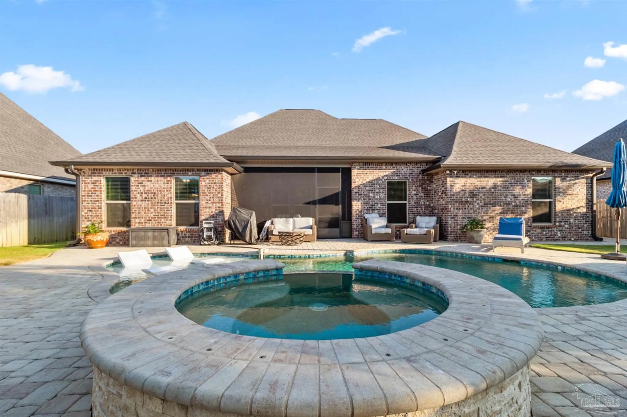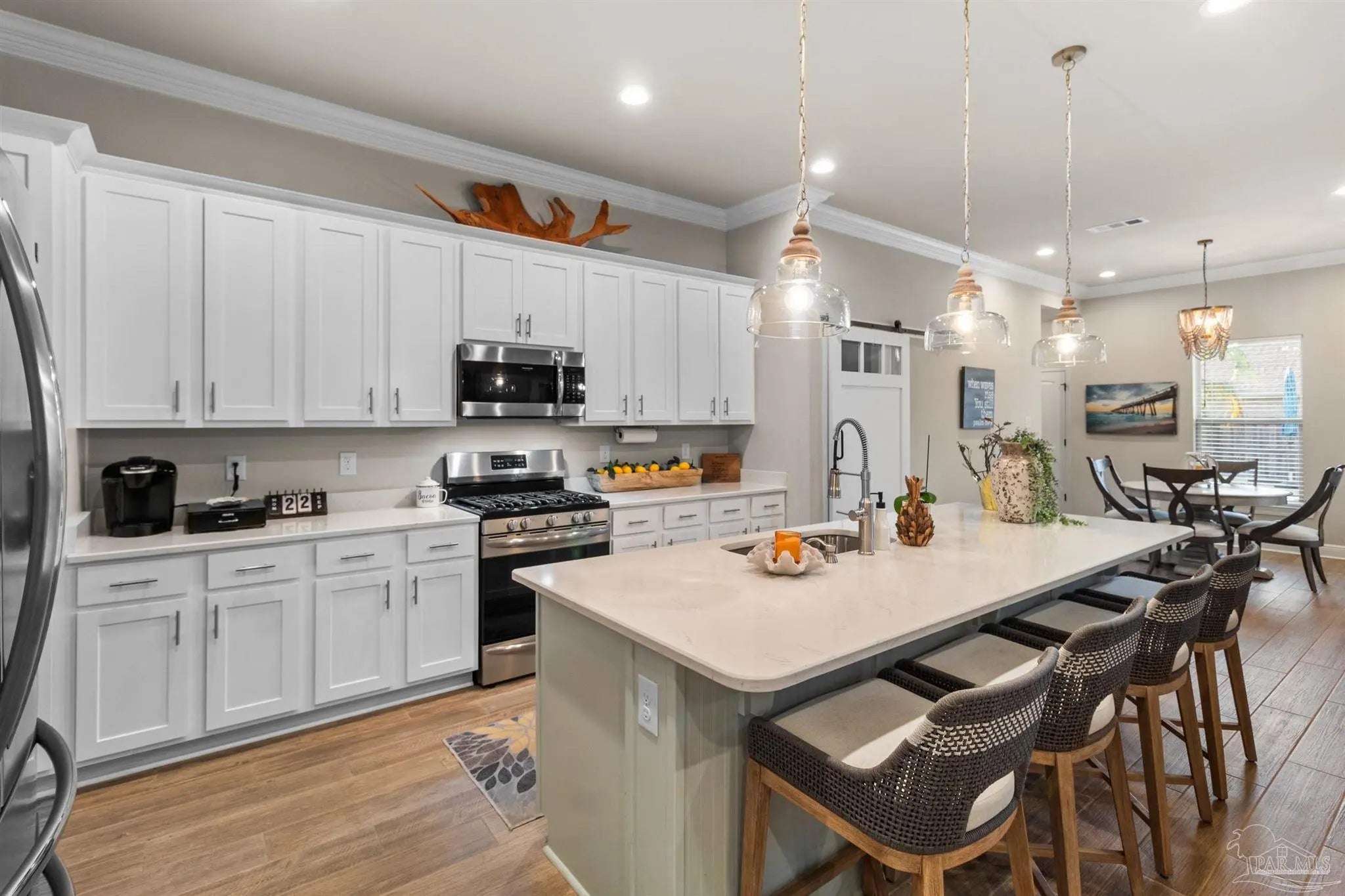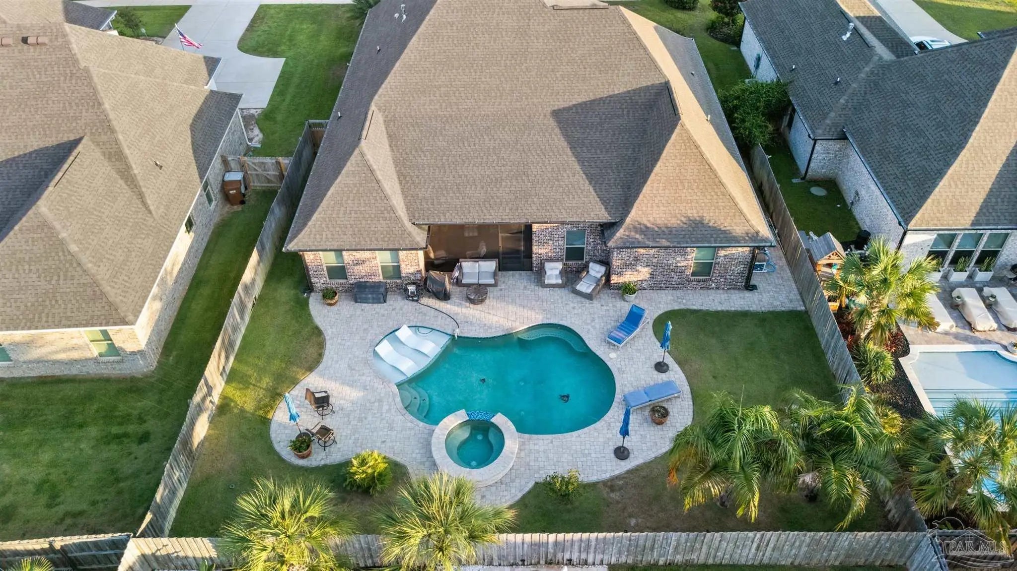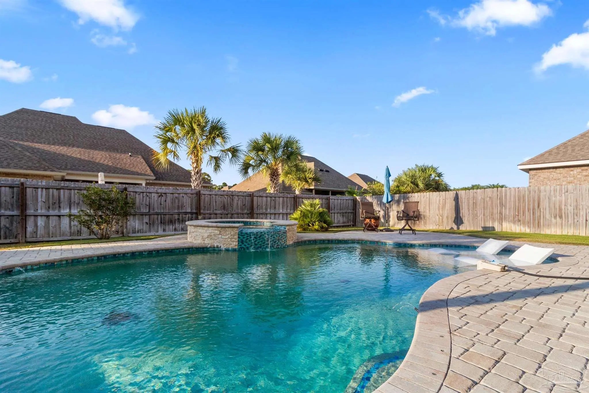 Welcome to your dream home, where every detail has been meticulously crafted for the perfect lifestyle. Nestled in the desirable Waters on Soundside Drive community, this stunning 4-bed, 3-bath residence offers an unparalleled living experience. Enjoy the convenience of sidewalks and underground utilities, all within easy reach of the Sound's serene public boat ramp and nature preserve. This home is designed for effortless luxury, featuring a whole-house generator and a spectacular saltwater/ozone gunite pool with a tranquil waterfall spa. Step inside to discover a flawless interior with beautiful wood-look tile and elegant quartz countertops throughout. The kitchen is a chef's delight, boasting an oversized island and a huge walk-in pantry, while high ceilings with tray accents add an extra touch of sophistication. Modern comforts abound with a smart thermostat, a whole-house water filtration system, and a comprehensive security system. Outside, the lush, tropical landscaping and a screened lanai create your own private oasis. Perfectly situated between the stunning Navarre and Pensacola beaches and just minutes from fantastic shopping and dining, this home truly has everything you could ever wish for.