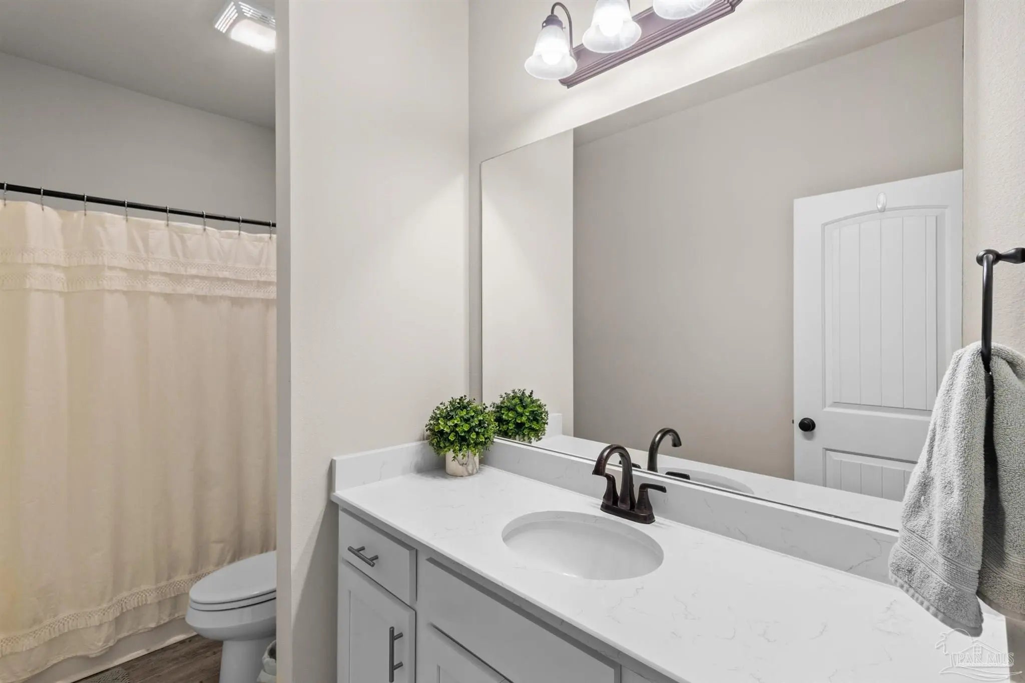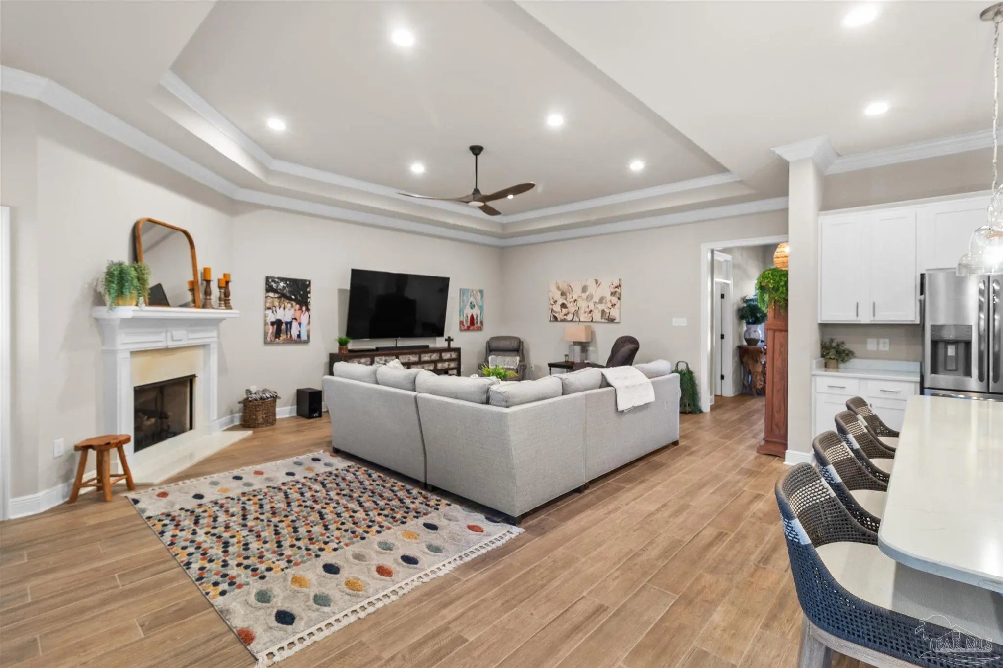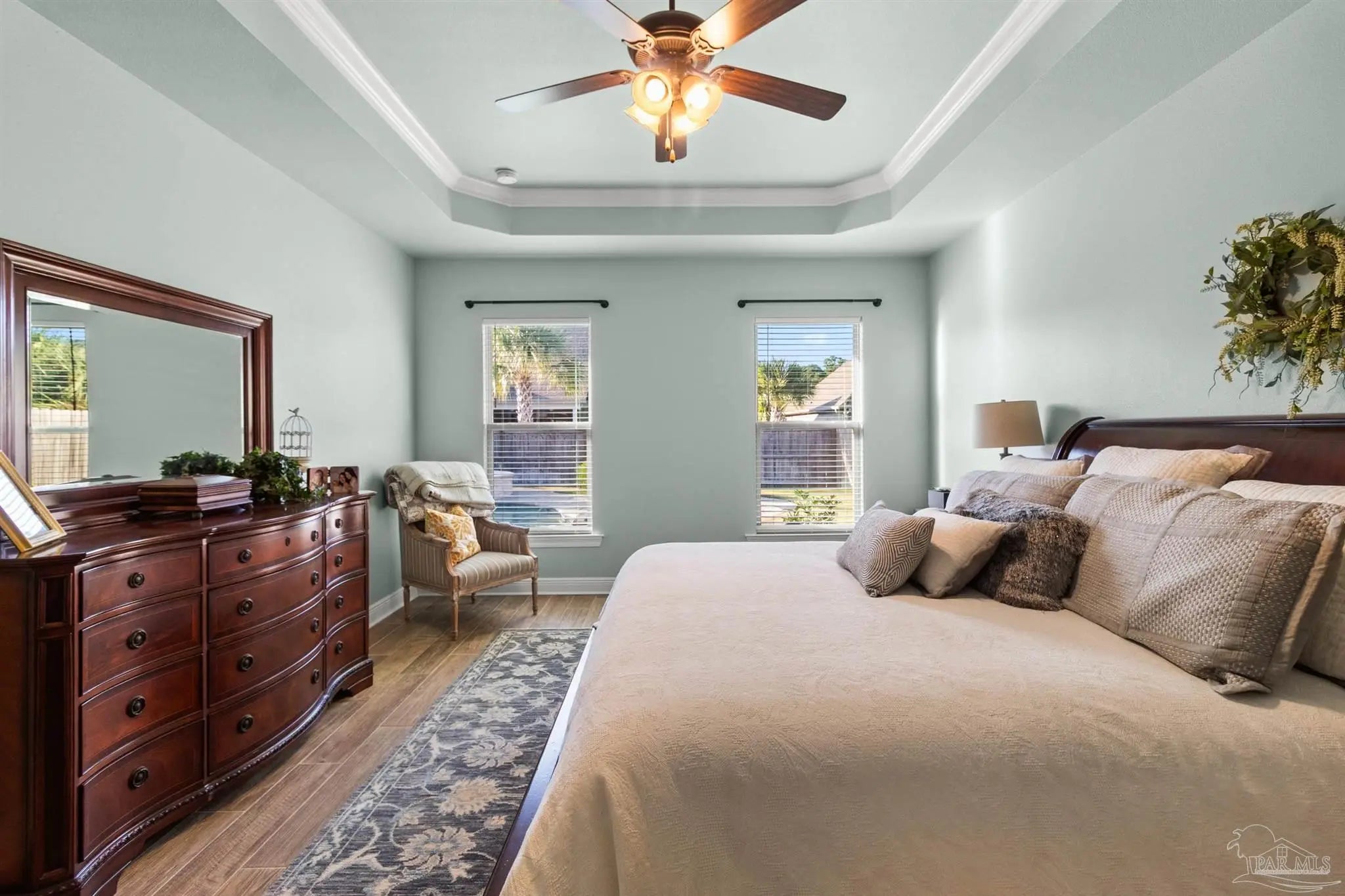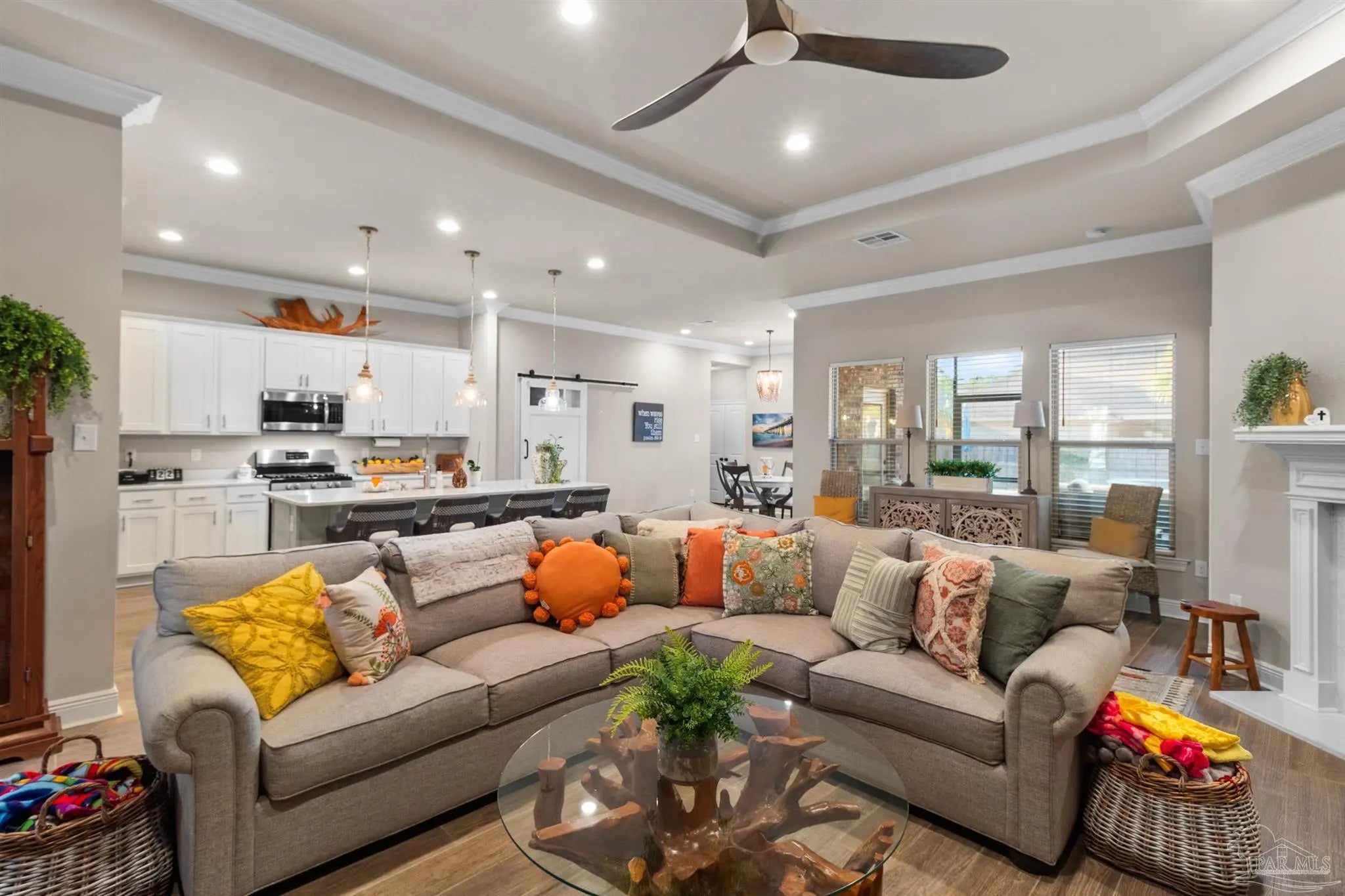 Welcome to your dream home, where every detail has been meticulously crafted for the perfect lifestyle. Nestled in the desirable Waters on Soundside Drive community, this stunning 4-bed, 3-bath residence offers an unparalleled living experience. Enjoy the convenience of sidewalks and underground utilities, all within easy reach of the Sound's serene public boat ramp and nature preserve. This home is designed for effortless luxury, featuring a whole-house generator and a spectacular saltwater/ozone gunite pool with a tranquil waterfall spa. Step inside to discover a flawless interior with beautiful wood-look tile and elegant quartz countertops throughout. The kitchen is a chef's delight, boasting an oversized island and a huge walk-in pantry, while high ceilings with tray accents add an extra touch of sophistication. Modern comforts abound with a smart thermostat, a whole-house water filtration system, and a comprehensive security system. Outside, the lush, tropical landscaping and a screened lanai create your own private oasis. Perfectly situated between the stunning Navarre and Pensacola beaches and just minutes from fantastic shopping and dining, this home truly has everything you could ever wish for.