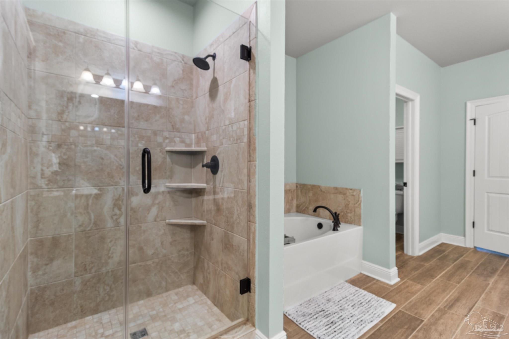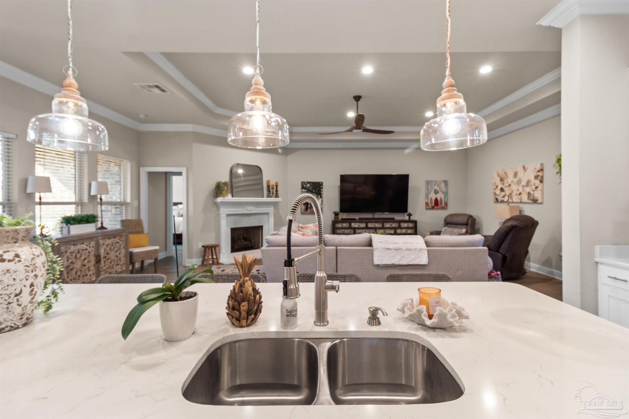 Welcome to your dream home, where every detail has been meticulously crafted for the perfect lifestyle. Nestled in the desirable Waters on Soundside Drive community, this stunning 4-bed, 3-bath residence offers an unparalleled living experience. Enjoy the convenience of sidewalks and underground utilities, all within easy reach of the Sound's serene public boat ramp and nature preserve. This home is designed for effortless luxury, featuring a whole-house generator and a spectacular saltwater/ozone gunite pool with a tranquil waterfall spa. Step inside to discover a flawless interior with beautiful wood-look tile and elegant quartz countertops throughout. The kitchen is a chef's delight, boasting an oversized island and a huge walk-in pantry, while high ceilings with tray accents add an extra touch of sophistication. Modern comforts abound with a smart thermostat, a whole-house water filtration system, and a comprehensive security system. Outside, the lush, tropical landscaping and a screened lanai create your own private oasis. Perfectly situated between the stunning Navarre and Pensacola beaches and just minutes from fantastic shopping and dining, this home truly has everything you could ever wish for.