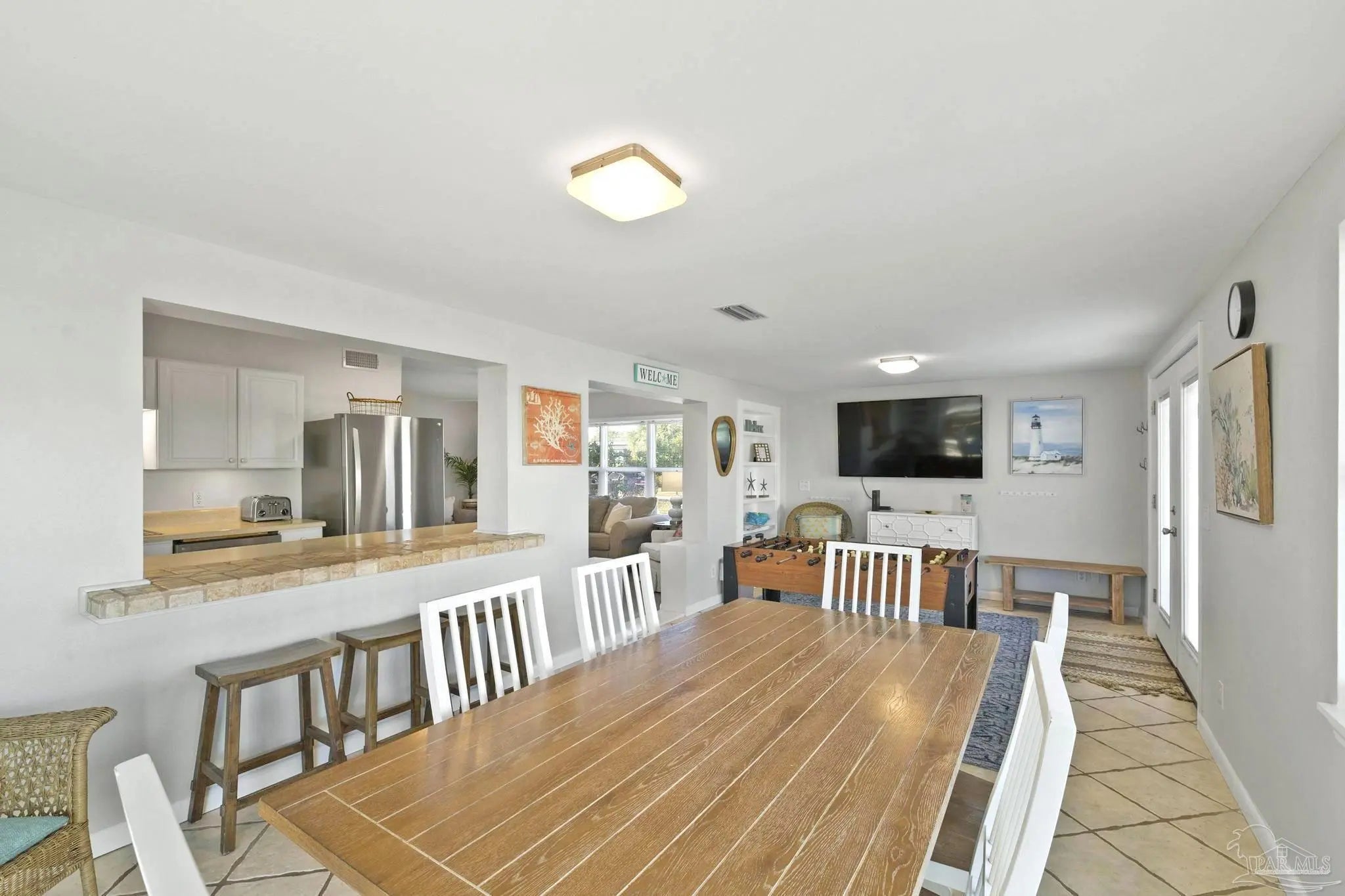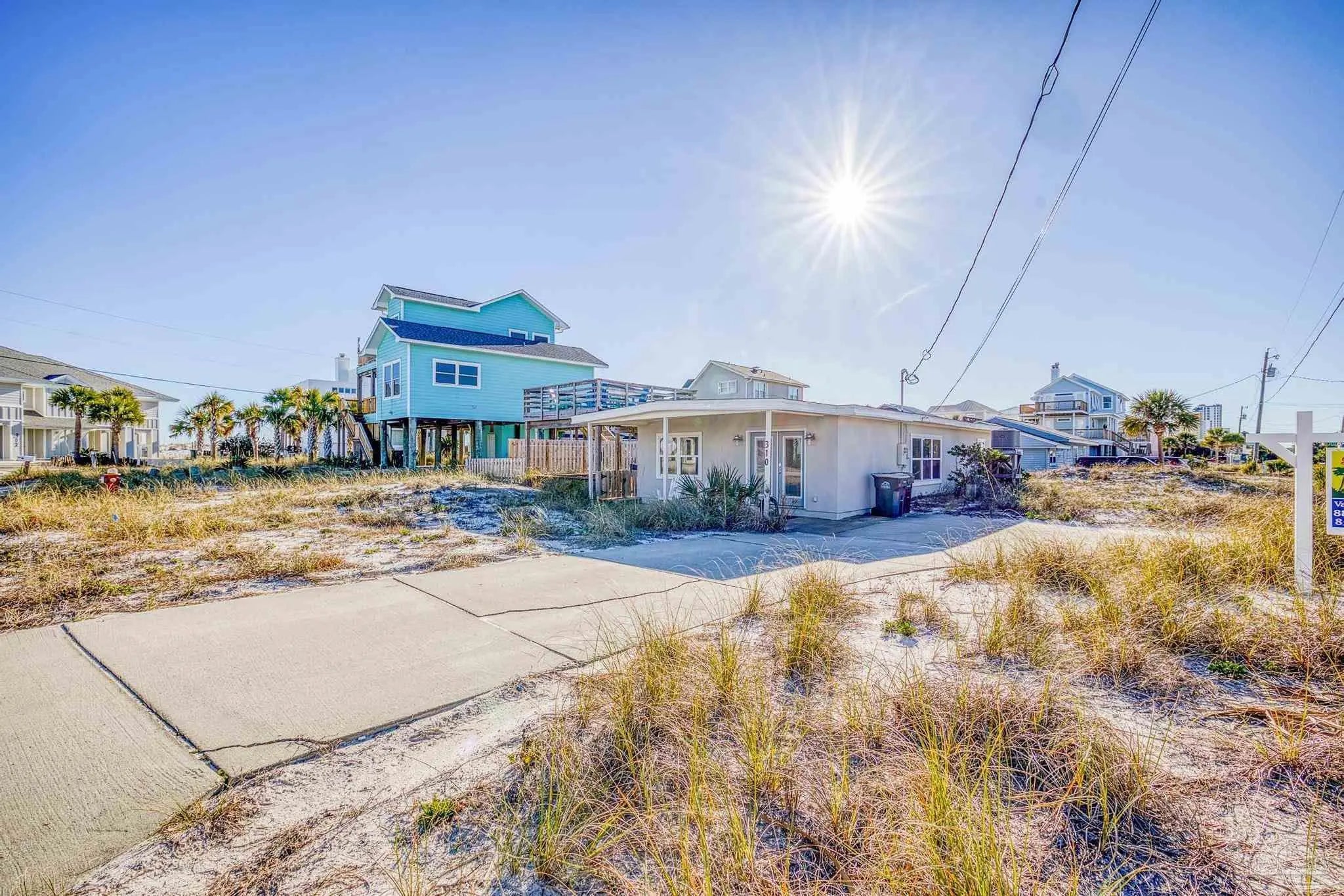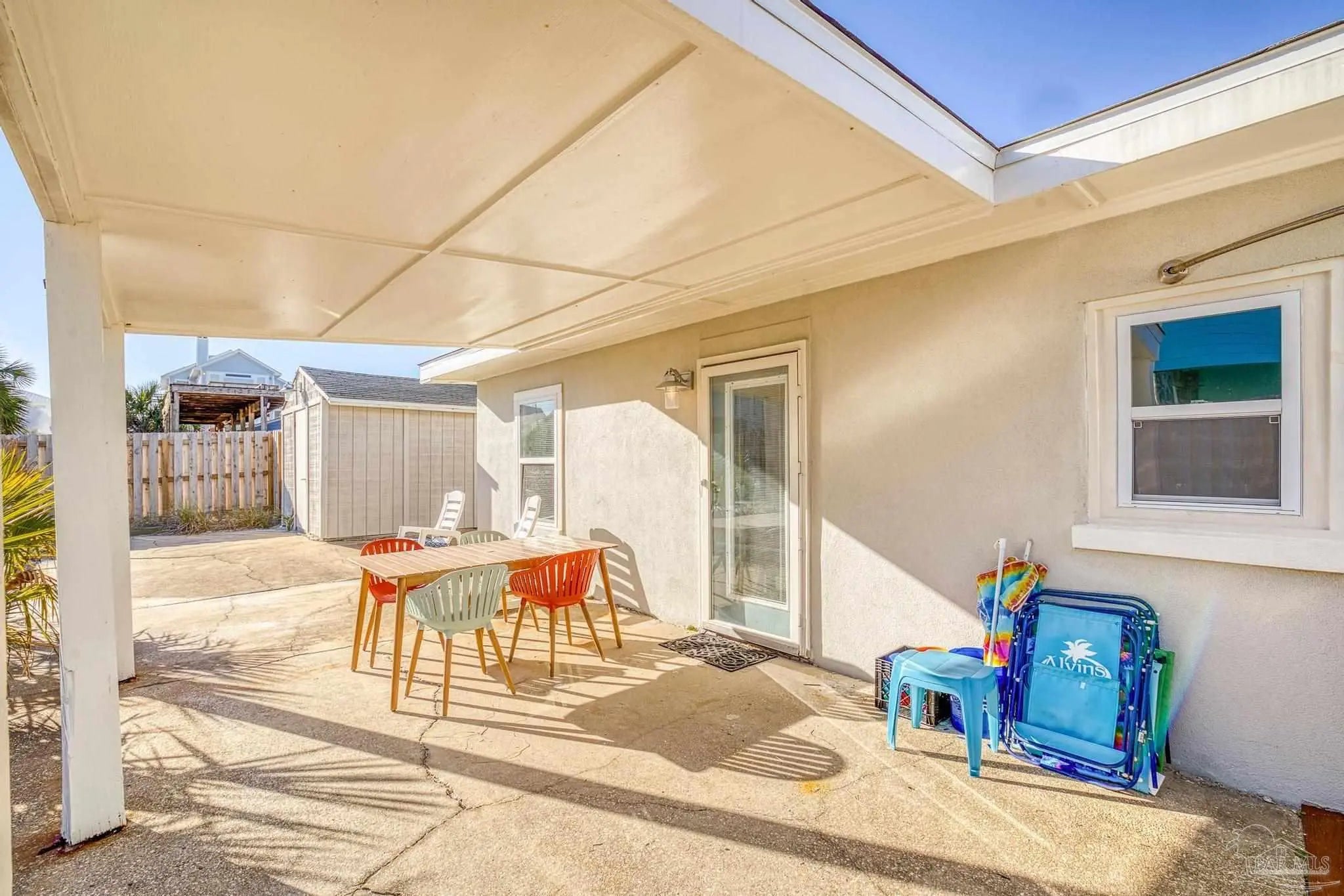 An original Pensacola Beach bungalow! Charming cottage. Vintage terrazzo floors in good condition. Open living area with living room, dining and kitchen all flowing together making entertaining a joy. Dining room open to covered outdoor area and access to upstairs deck which has amazing views of the Gulf. This is an ideal location. It's a corner lot just across the street from the Gulf. It's a short walk, bike ride or tram ride to nightlife, dining and shopping. It has been painted inside and out. Roof was replaced in August of 2020. There are new sliding glass doors in the dining room along with new lighting. Outdoor storage building.