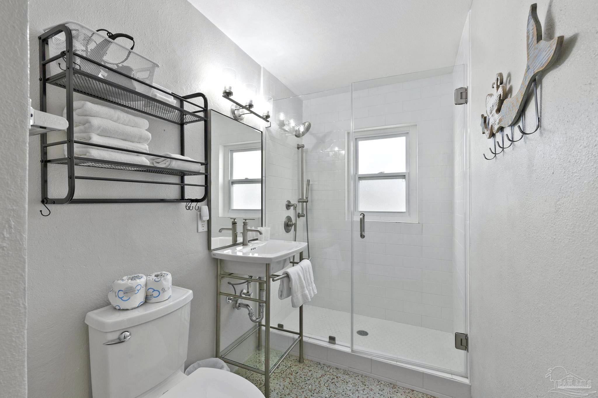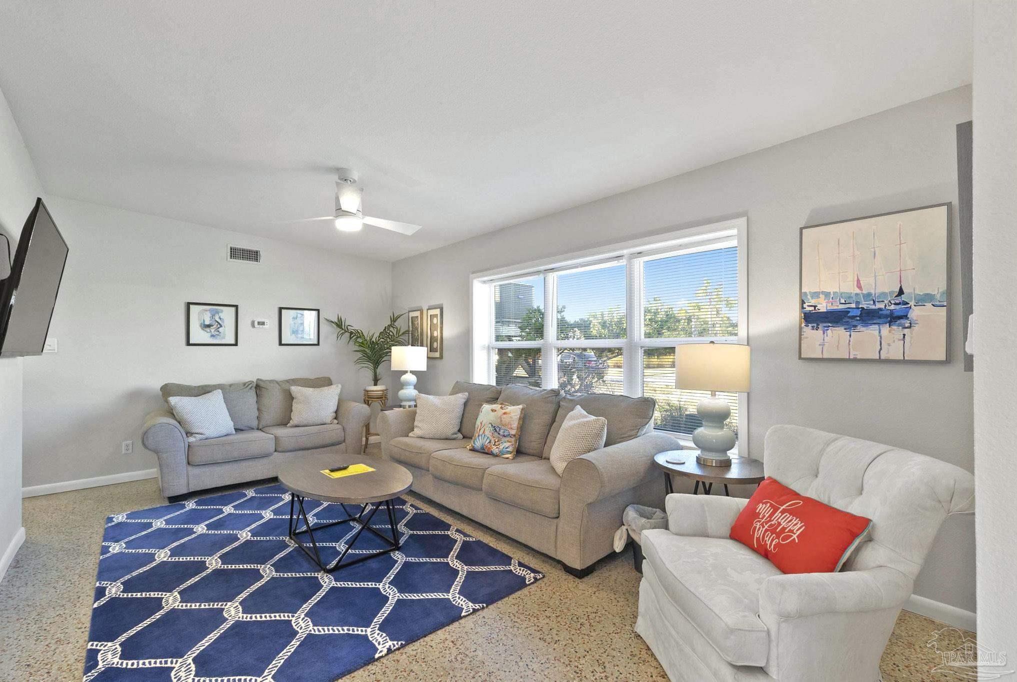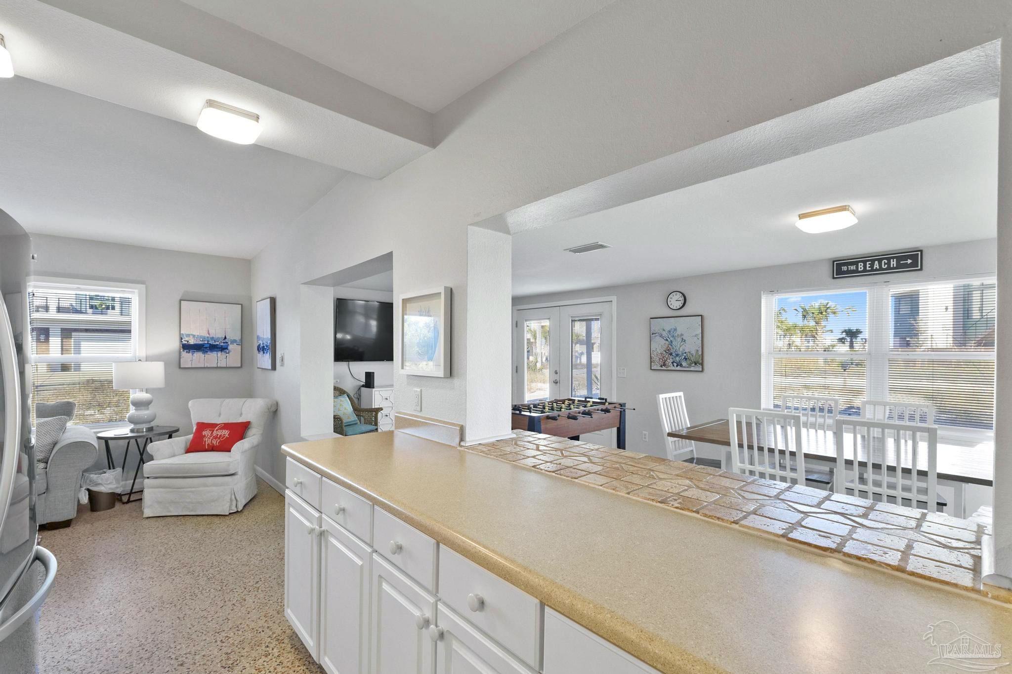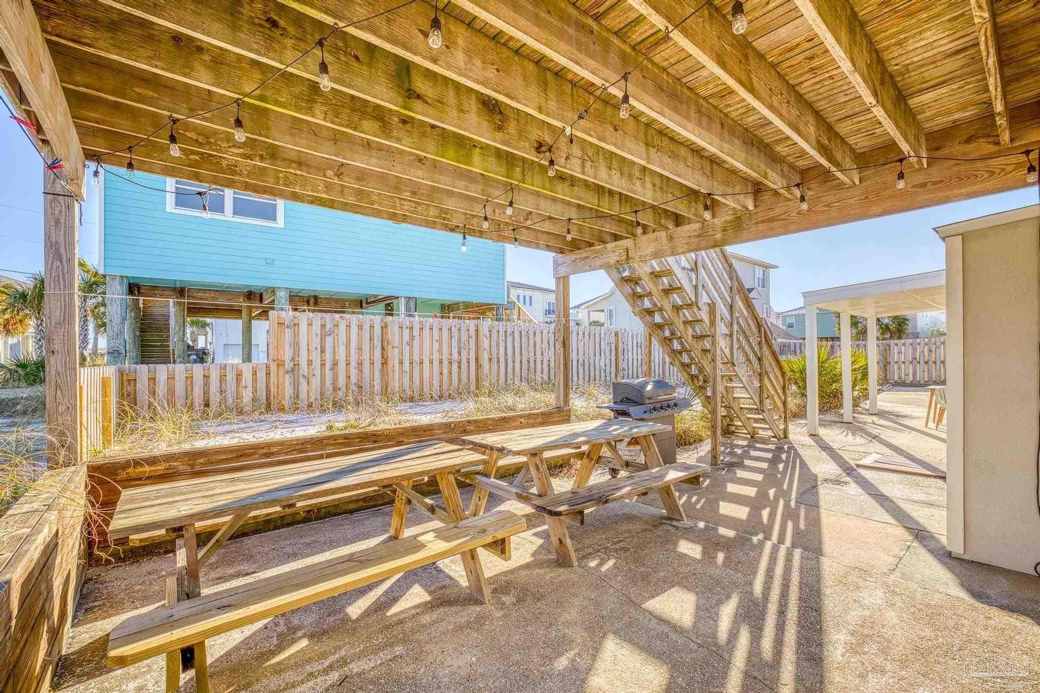 An original Pensacola Beach bungalow! Charming cottage. Vintage terrazzo floors in good condition. Open living area with living room, dining and kitchen all flowing together making entertaining a joy. Dining room open to covered outdoor area and access to upstairs deck which has amazing views of the Gulf. This is an ideal location. It's a corner lot just across the street from the Gulf. It's a short walk, bike ride or tram ride to nightlife, dining and shopping. It has been painted inside and out. Roof was replaced in August of 2020. There are new sliding glass doors in the dining room along with new lighting. Outdoor storage building.