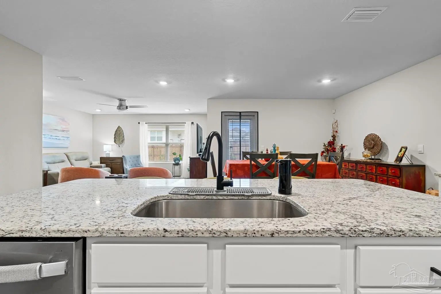 This four-bedroom, two-bathroom home combines modern design with thoughtful upgrades offering both comfort and convenience- Sellers are willing to sell the home fully furnished, providing a true turnkey experience (furnishings not included in the sale price). Step inside to be welcomed by soaring 9-foot ceilings, recessed lighting and warm neutral color palette that creates an inviting atmosphere leading into the kitchen with an oversized granite island, 33 inch under mount sink, matte black hardware, and stylish herringbone mosaic backsplash tile that blends seamlessly adding elegance and sophistication. The open layout flows easily into the living and dining areas with LVP flooring making it ideal for durability and low maintenance. The Master Bath features a double vanity, updated lighting, and a glass barn-style shower door. Ceiling fans have been added throughout the home to enhance efficiency and comfort. Additional shelving and cabinetry in the closets, bathrooms, and laundry room have been added offering smart storage solutions for everyday organization. This property also includes standard smart-home technology, such as keyless entry, a SkyBell video doorbell, automated front porch lighting, an Echo Dot device, and a Qolsys touch panel for centralized control of lighting, climate, and security when out of town. Enjoy your private backyard enclosed by a 6-foot privacy fence with multiple aluminum framed access gates. A complete gutter system and termite bond ensure proper drainage and structural integrity of the home. At this price point accompanied with these upgrades, this home provides tremendous value!