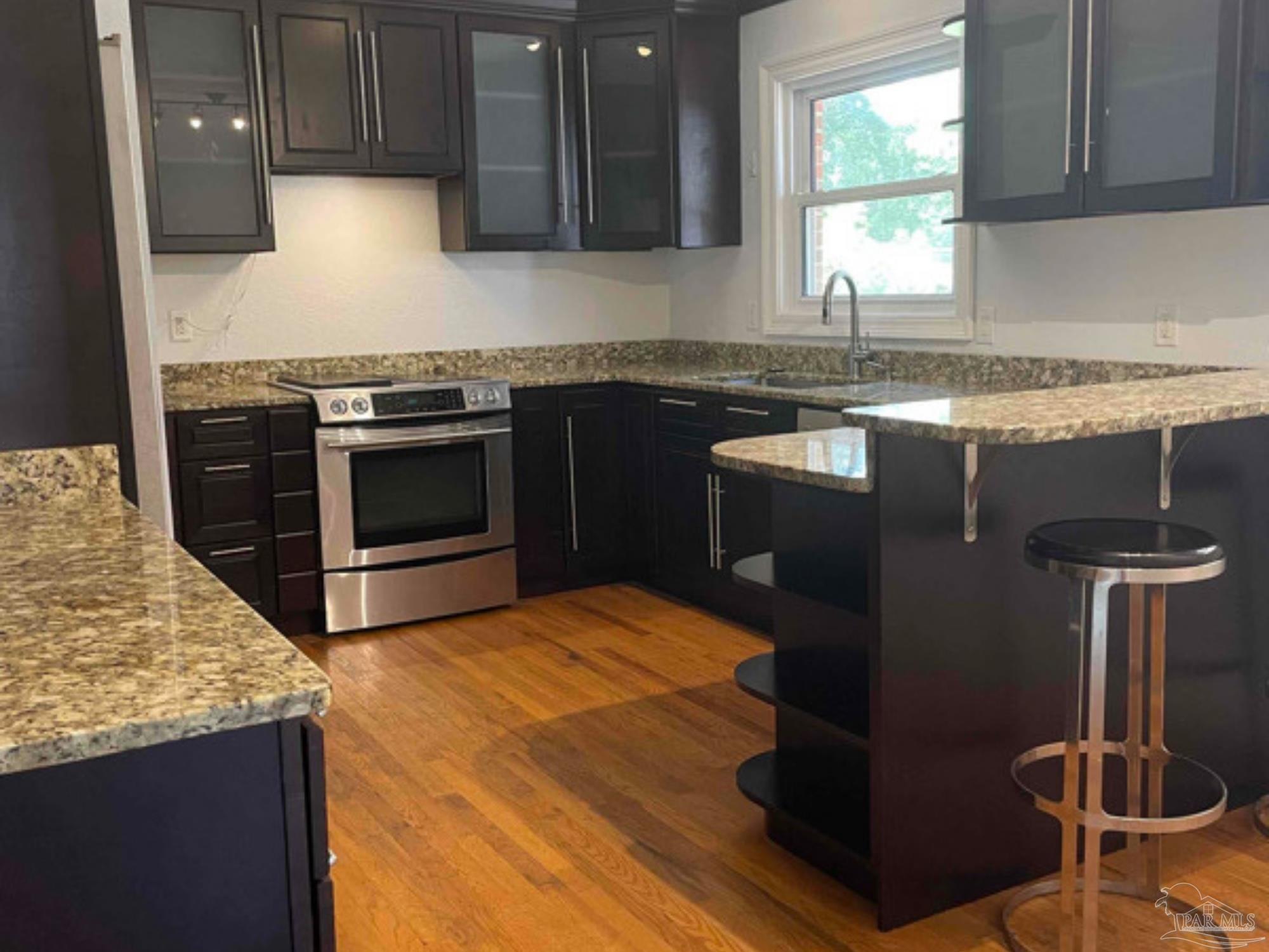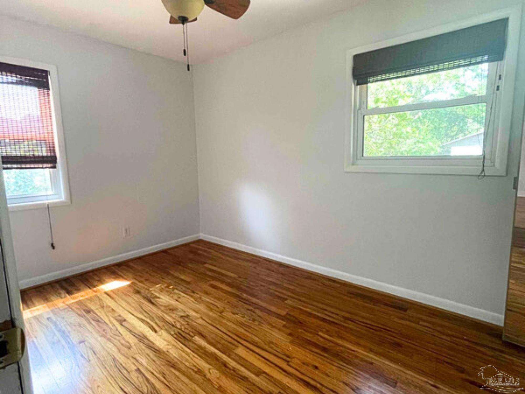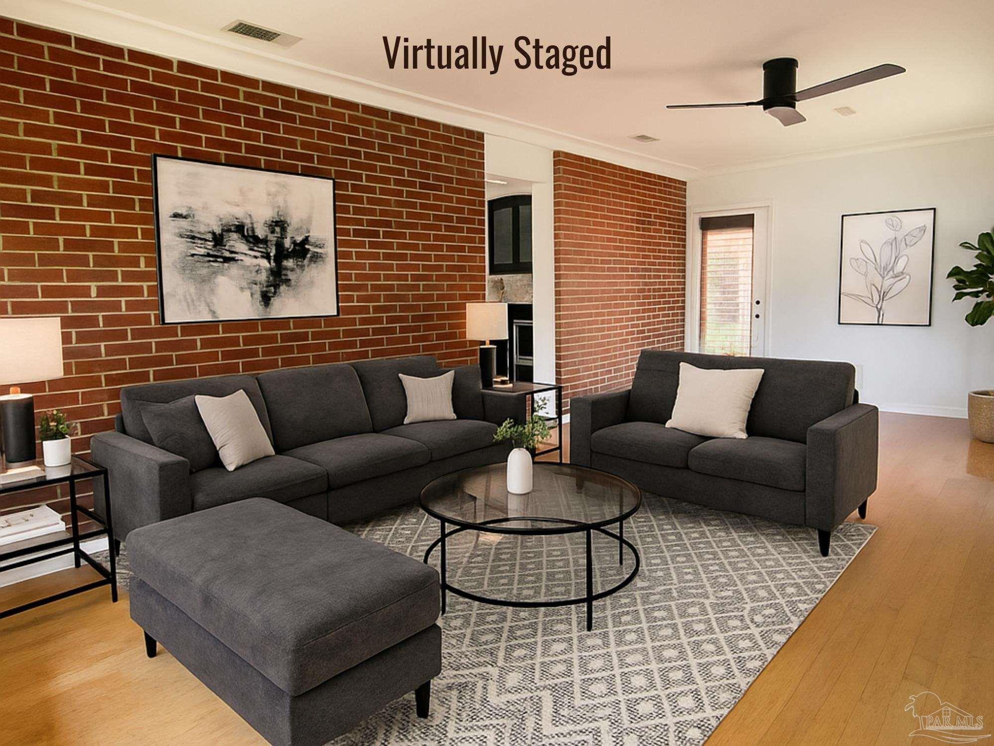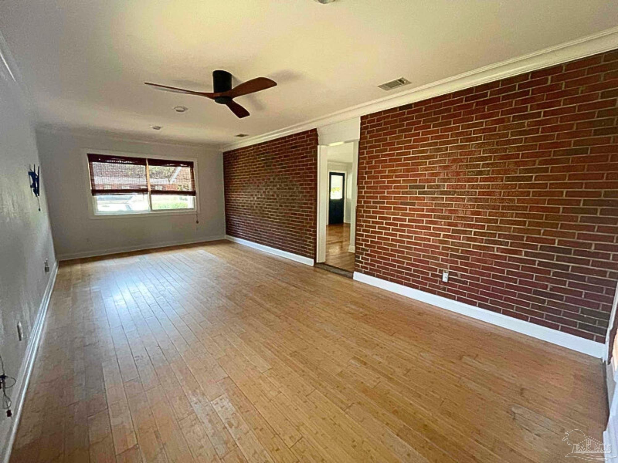 Welcome to this updated Scenic Heights ranch home, where mid-century character meets tasteful modern touches. From the moment you arrive, the home welcomes you with charm: a covered front porch accented by a floor-to-ceiling window that floods the interior with natural light. Inside, you’ll find the warmth of original oak hardwood floors, an exposed brick accent wall, and two separate living room spaces, ideal for both entertaining and everyday comfort. The kitchen is the true heart of the home, thoughtfully designed for those who love to cook, featuring abundant cabinet storage, heatproof granite countertops with a hightop bar, and an adjoining dining nook perfect for casual meals or morning coffee. A downdraft stove with a cast-iron flat top adds both function and style. Step outside into your private, fully fenced backyard retreat. Evenings can be spent gathered around the fire pit beneath two grand pines, swaying on the porch swing, or enjoying the grapevines and established orange tree that dot the landscape. Landscape maintenance is not included but can be added for an additional monthly fee. This home is located in the desirable Scenic Heights neighborhood, offering easy access to parks, a recreation complex, top-rated schools, shopping, restaurants, hospitals, and Pensacola International Airport. And with both historic downtown Pensacola and the sugar-white sands of Pensacola Beach just 15 minutes away, you’ll enjoy the best of coastal living.
