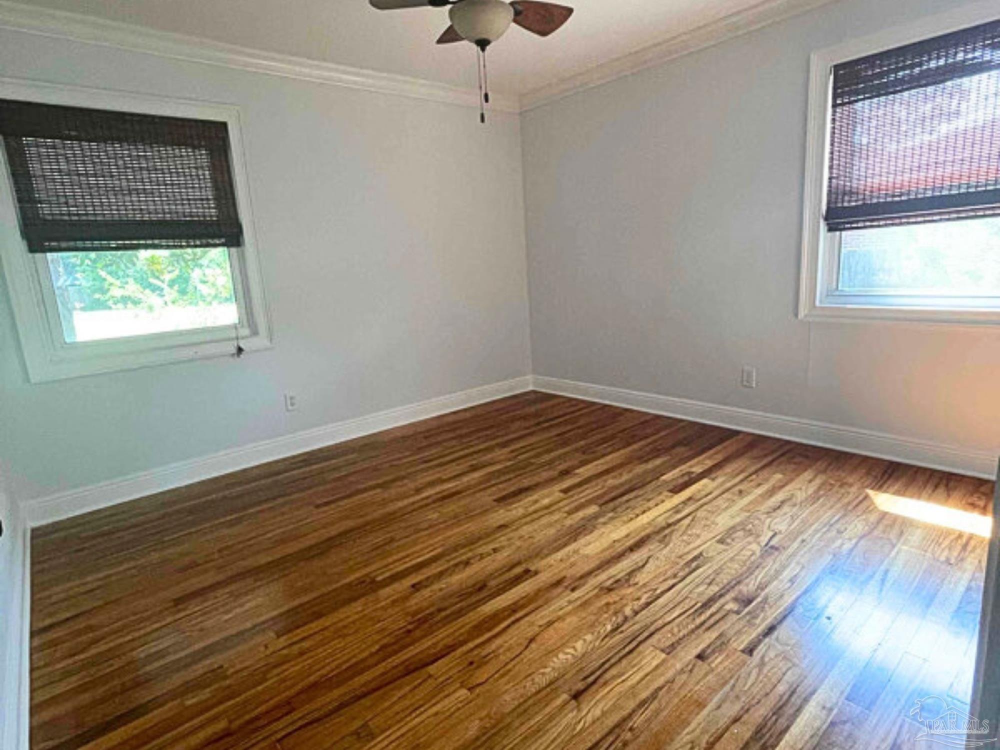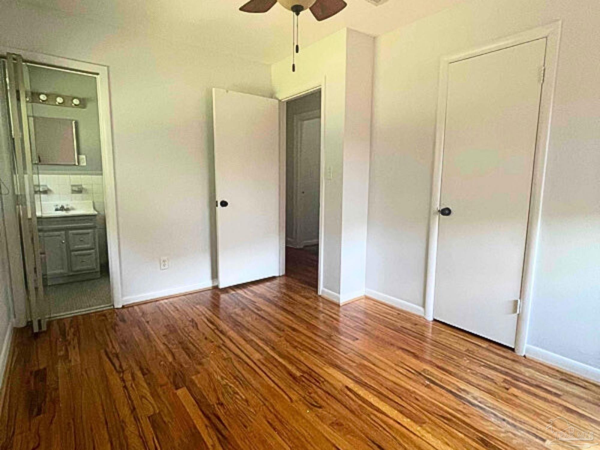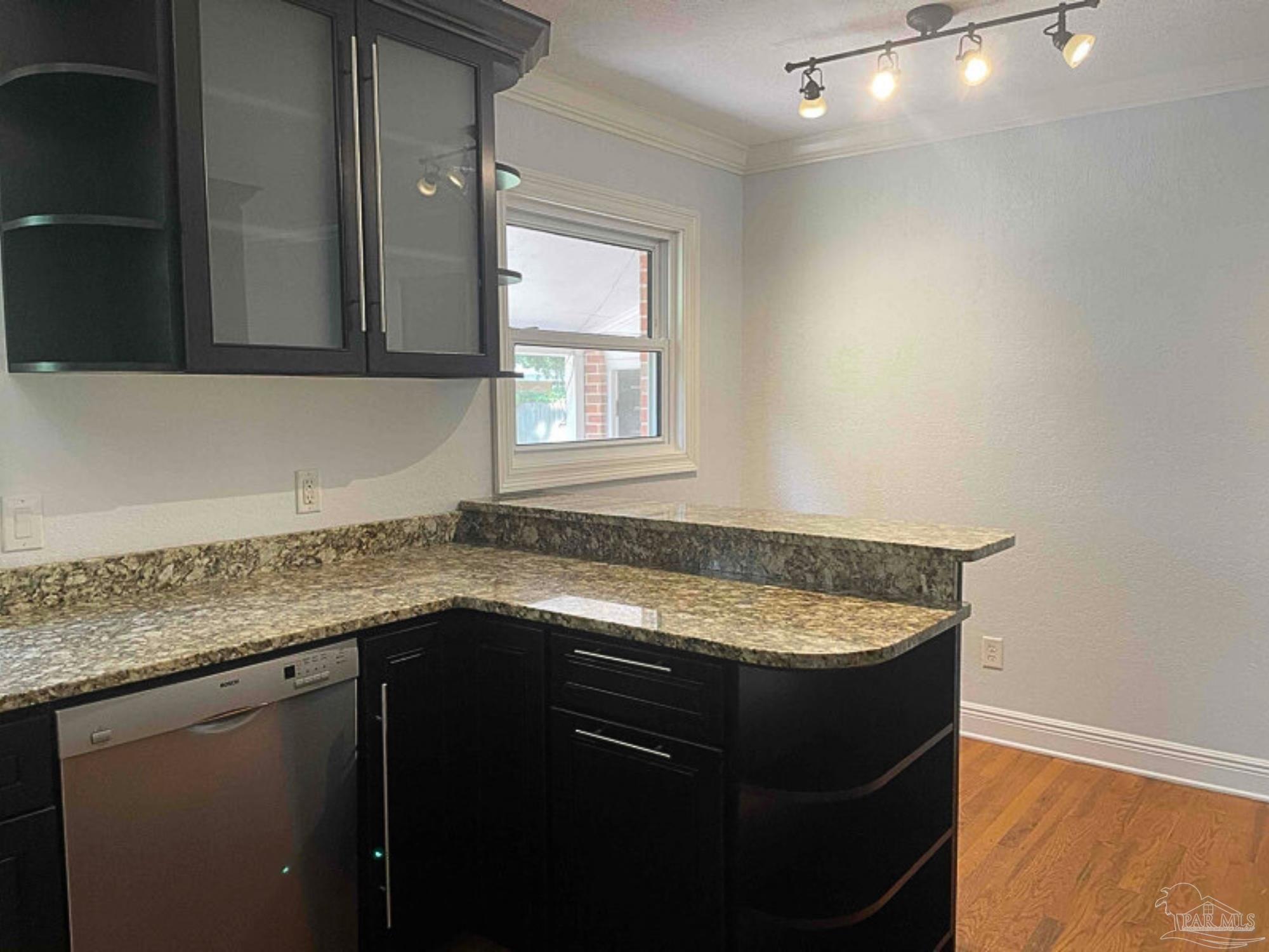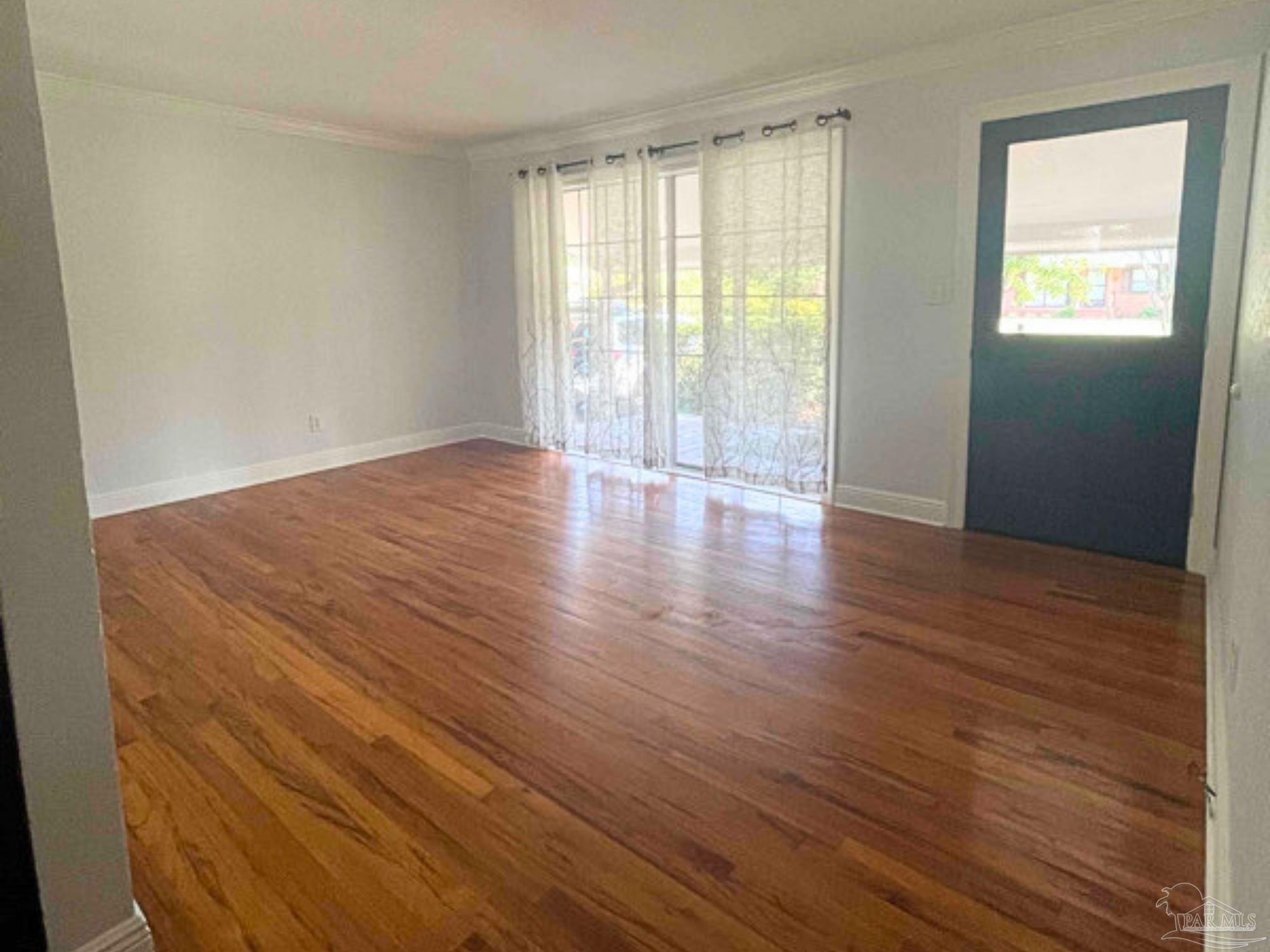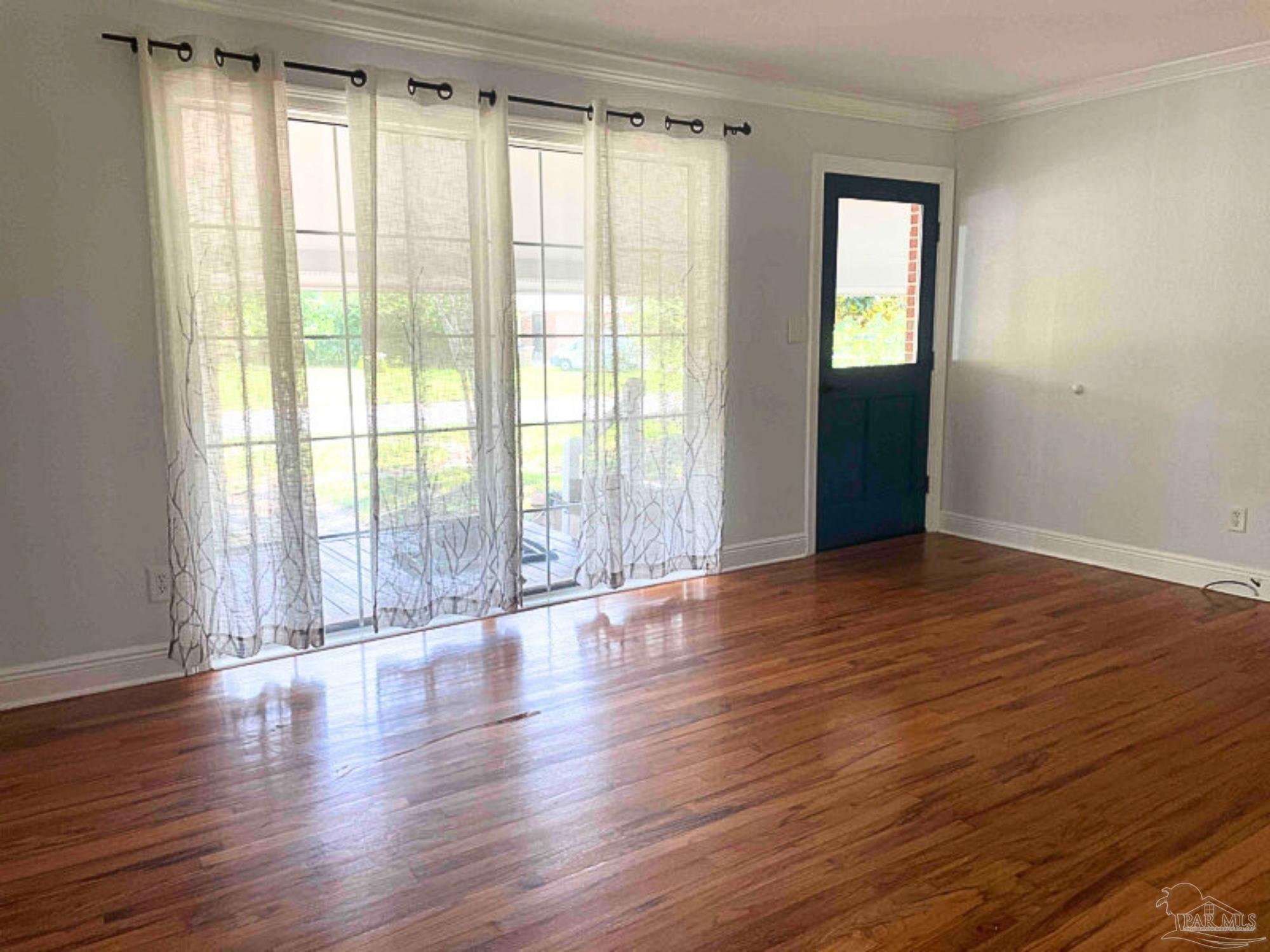Welcome to this updated Scenic Heights ranch home, where mid-century character meets tasteful modern touches. From the moment you arrive, the home welcomes you with charm: a covered front porch accented by a floor-to-ceiling window that floods the interior with natural light. Inside, you’ll find the warmth of original oak hardwood floors, an exposed brick accent wall, and two separate living room spaces, ideal for both entertaining and everyday comfort. The kitchen is the true heart of the home, thoughtfully designed for those who love to cook, featuring abundant cabinet storage, heatproof granite countertops with a hightop bar, and an adjoining dining nook perfect for casual meals or morning coffee. A downdraft stove with a cast-iron flat top adds both function and style. Step outside into your private, fully fenced backyard retreat. Evenings can be spent gathered around the fire pit beneath two grand pines, swaying on the porch swing, or enjoying the grapevines and established orange tree that dot the landscape. Landscape maintenance is not included but can be added for an additional monthly fee. This home is located in the desirable Scenic Heights neighborhood, offering easy access to parks, a recreation complex, top-rated schools, shopping, restaurants, hospitals, and Pensacola International Airport. And with both historic downtown Pensacola and the sugar-white sands of Pensacola Beach just 15 minutes away, you’ll enjoy the best of coastal living.