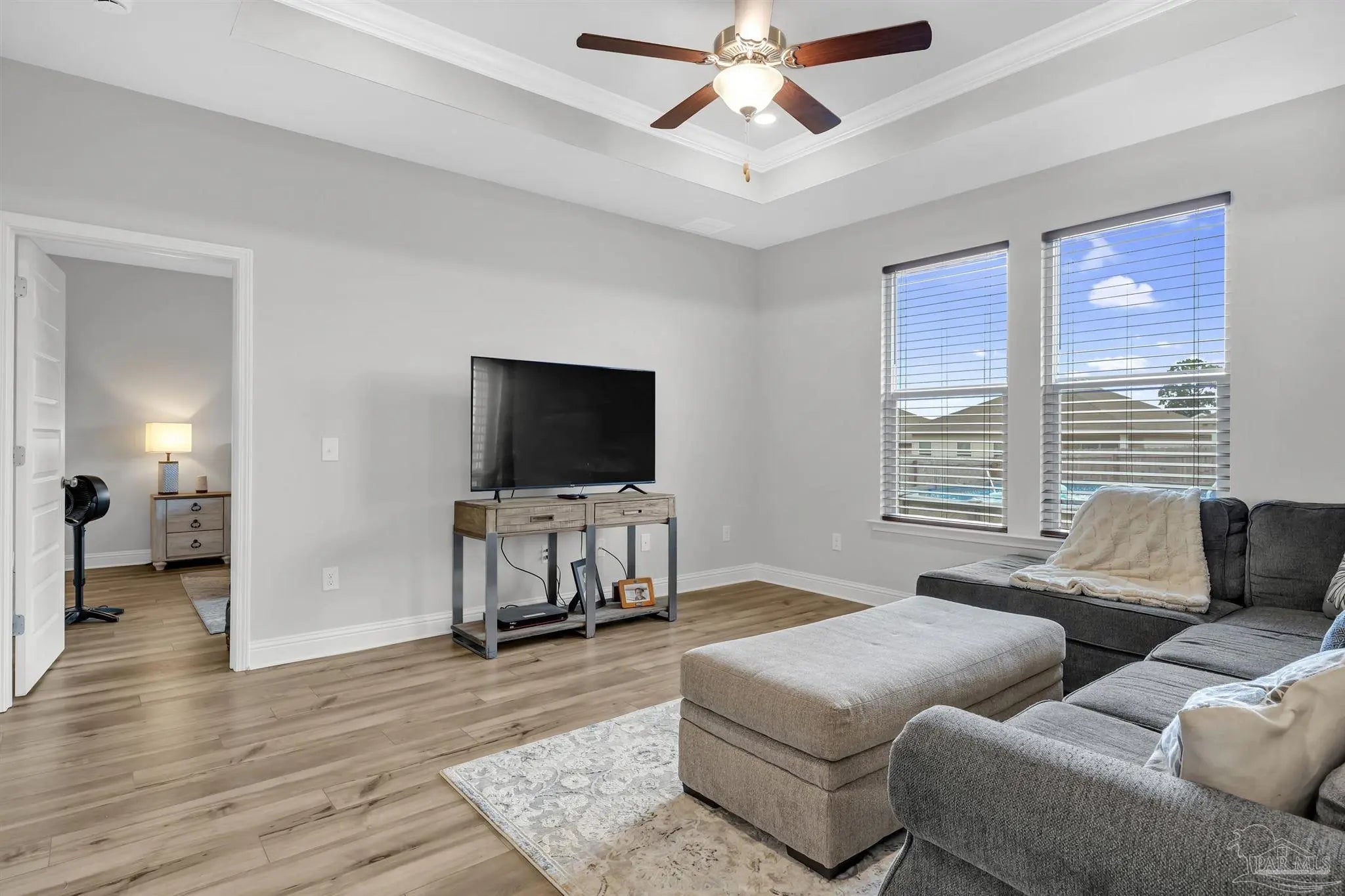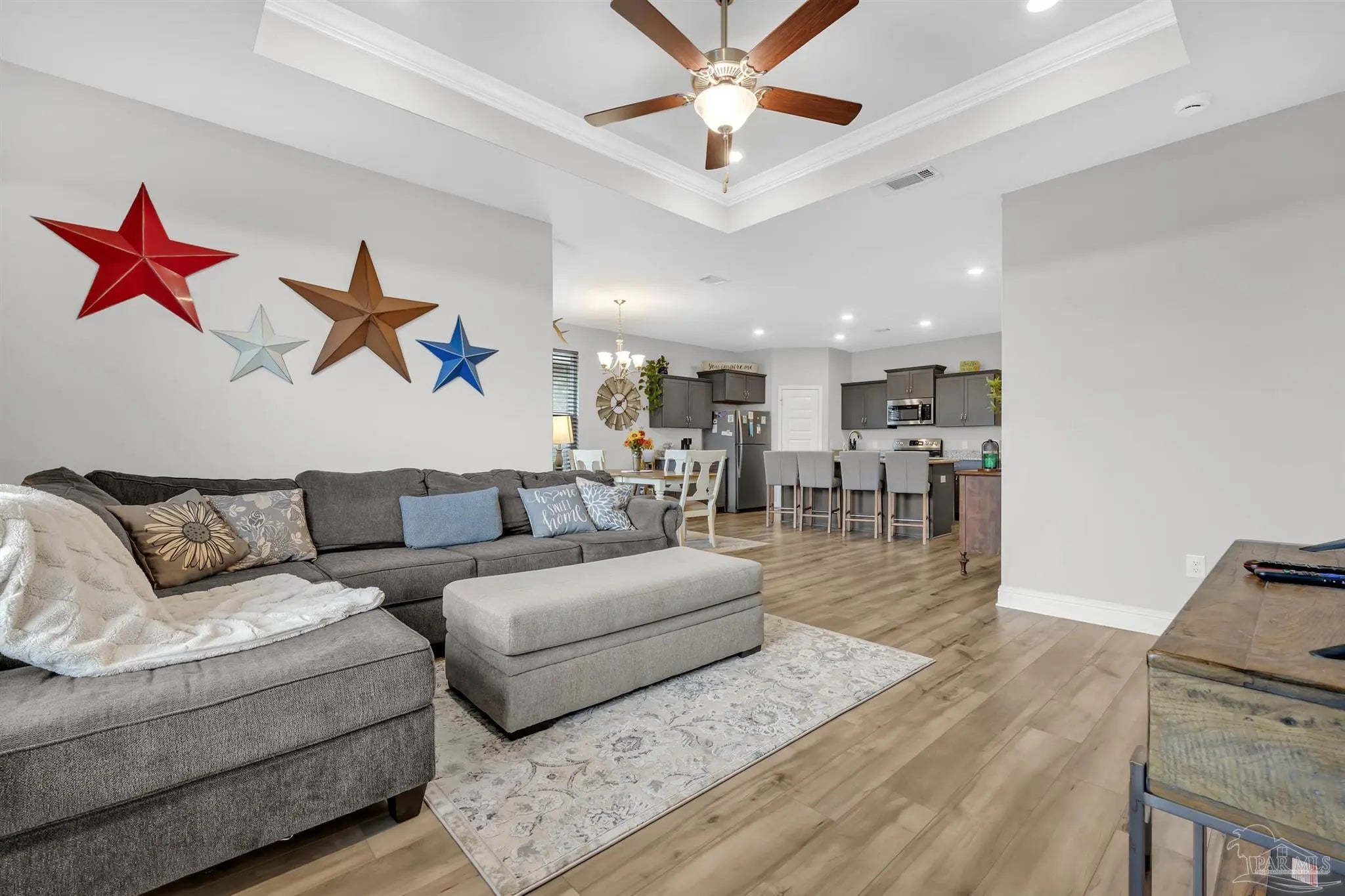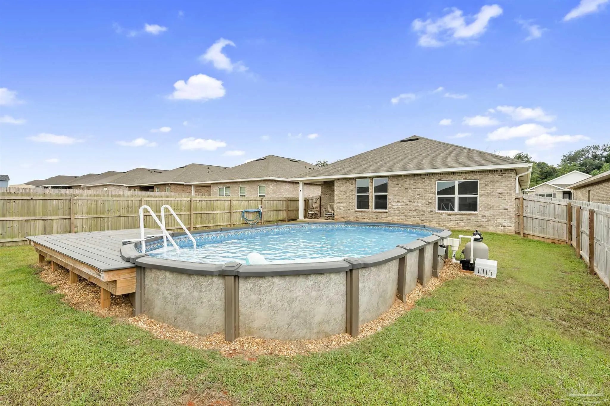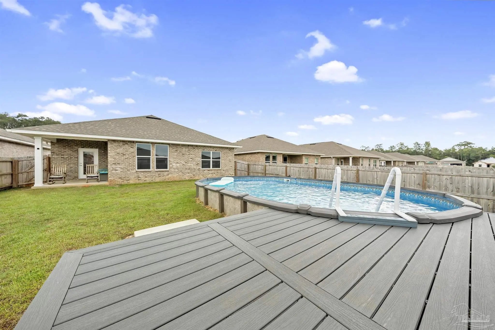 Welcome to this well-maintained 3 bedroom, 2 bath home with a 2-car garage and private pool. This property blends comfort and functionality with thoughtful design throughout. The exterior features four sides of brick, a welcoming front porch, and a backyard oasis with a pool that’s perfect for relaxing or entertaining. Inside, you’ll find 9-foot ceilings, with tray ceilings and crown molding enhancing both the family room and the primary suite. The open-concept layout creates a bright, spacious feel. The kitchen is equipped with stainless steel appliances, including a range, built-in microwave, and dishwasher. Flooring includes luxury vinyl plank throughout the main living areas and primary suite, with carpet only in the two guest bedrooms. Conveniently located near military bases, beaches, downtown Pensacola, and hospitals, this home offers easy access to everything the Gulf Coast has to offer. Don’t miss your chance to make this move-in ready home with a pool yours—schedule your private tour today!