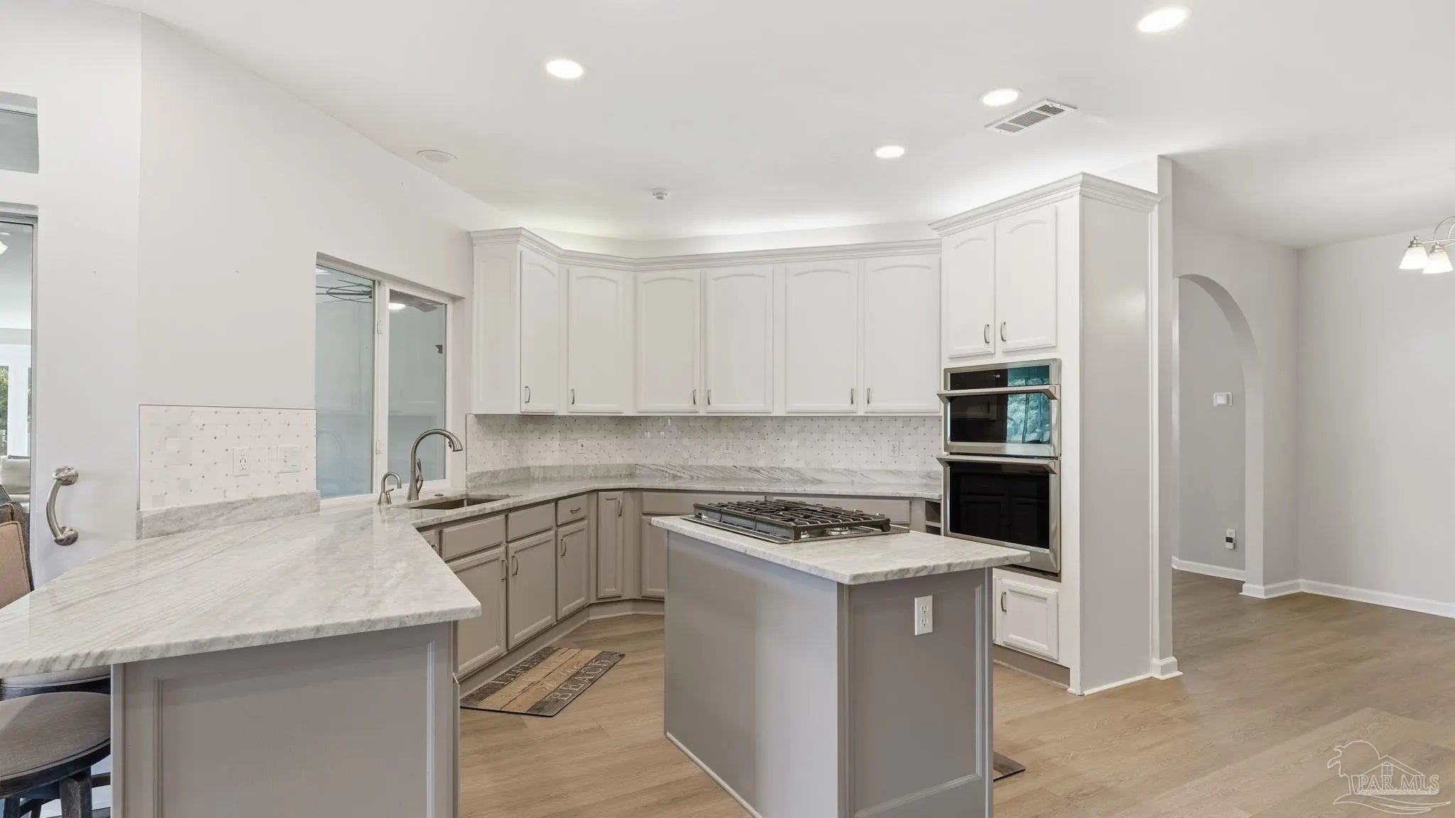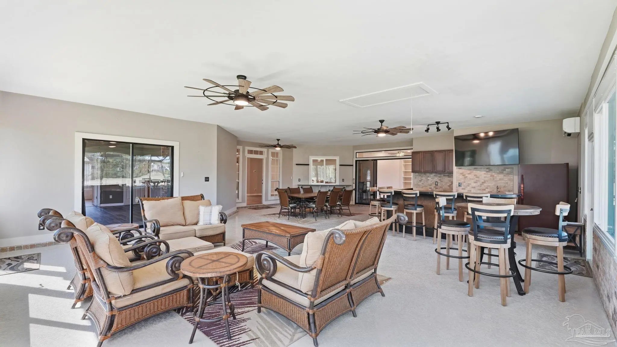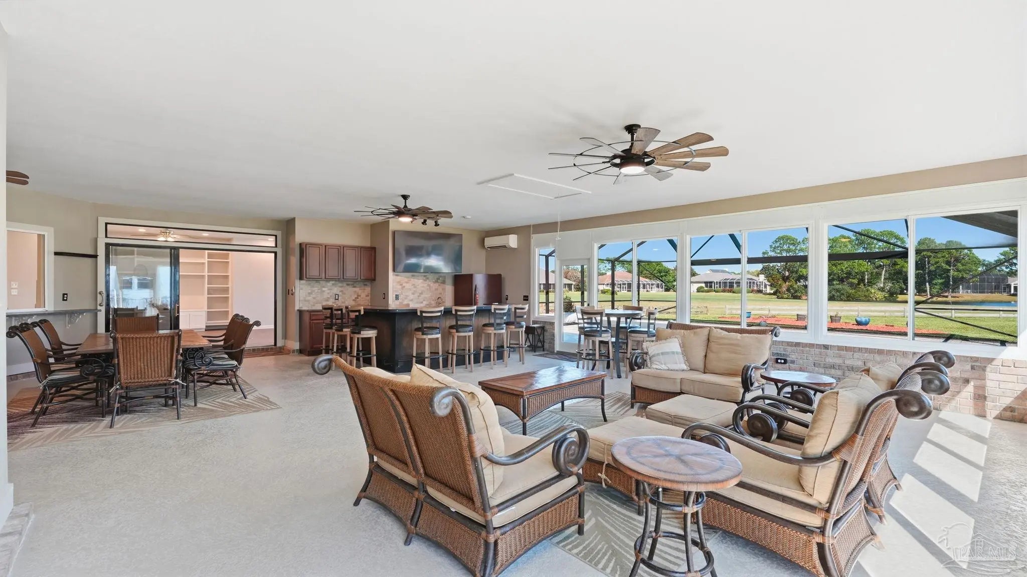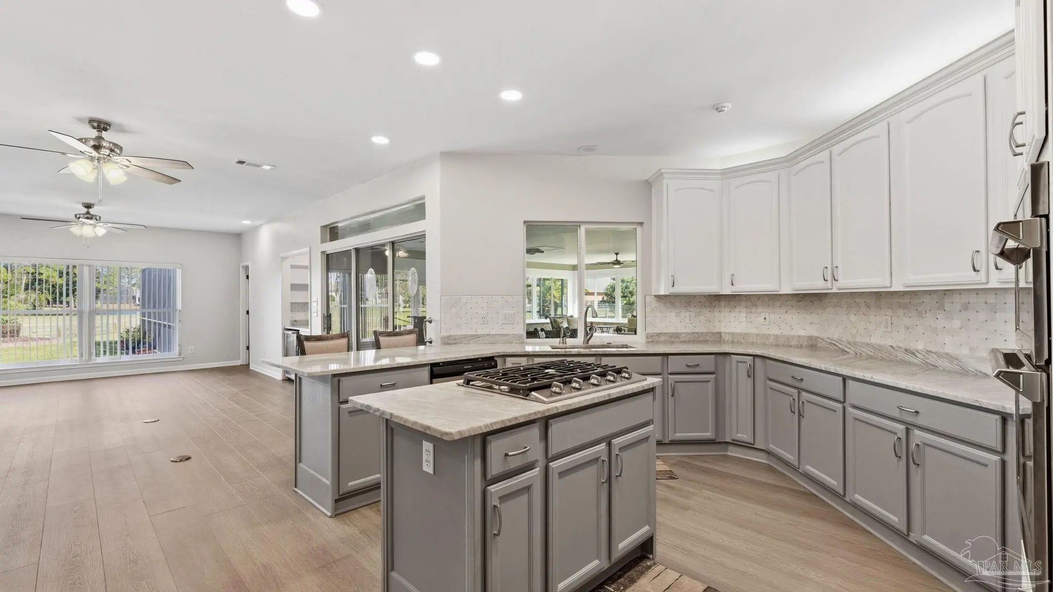 This beautifully updated 4 bedroom, 3 bathroom residence in Tiger Point Village offers breathtaking views of Tiger Point East signature hole #5 with its island green, along with glimpses of Santa Rosa Sound from the pool area, front of the house and the newly enclosed Florida room. Designed with both comfort and entertainment in mind, this single story split-level floor plan boasts multiple living areas, creating the perfect space for relaxation and hosting guests. The updated kitchen features stainless steel appliances, a walk-in pantry and ability to serve straight into the Florida room. The master suite features a walk-in shower, separate soaking tub and walk-in closets. Two other bedrooms share a jack and jill bathroom with walk-in shower. Major upgrades bring peace of mind, including a newer roof, HVAC system, and updated ductwork for improved efficiency and comfort. From the Florida room, step outside to your private oasis. A heated gunite pool, enclosed within a screened lanai, making it enjoyable year-round. Whether you're soaking up the serene golf course views, hosting gatherings, or simply unwinding, this home is truly an entertainer’s dream. Don’t miss this rare opportunity to own a move-in-ready gem in Gulf Breeze! Schedule your private showing today.