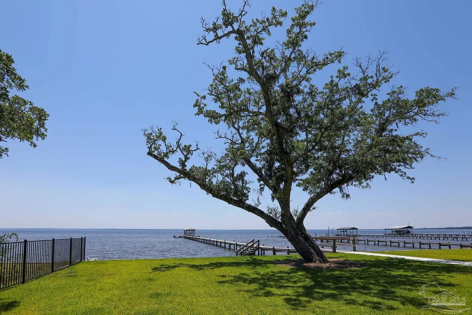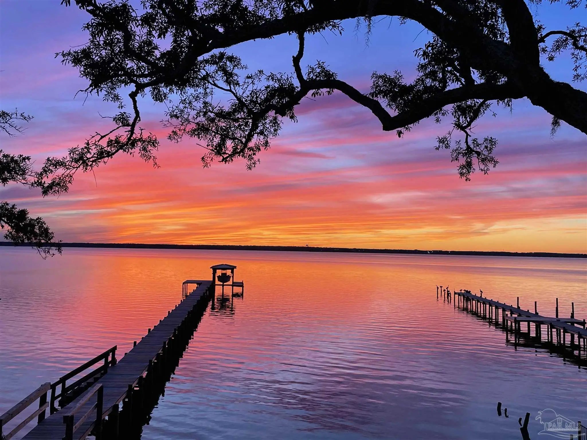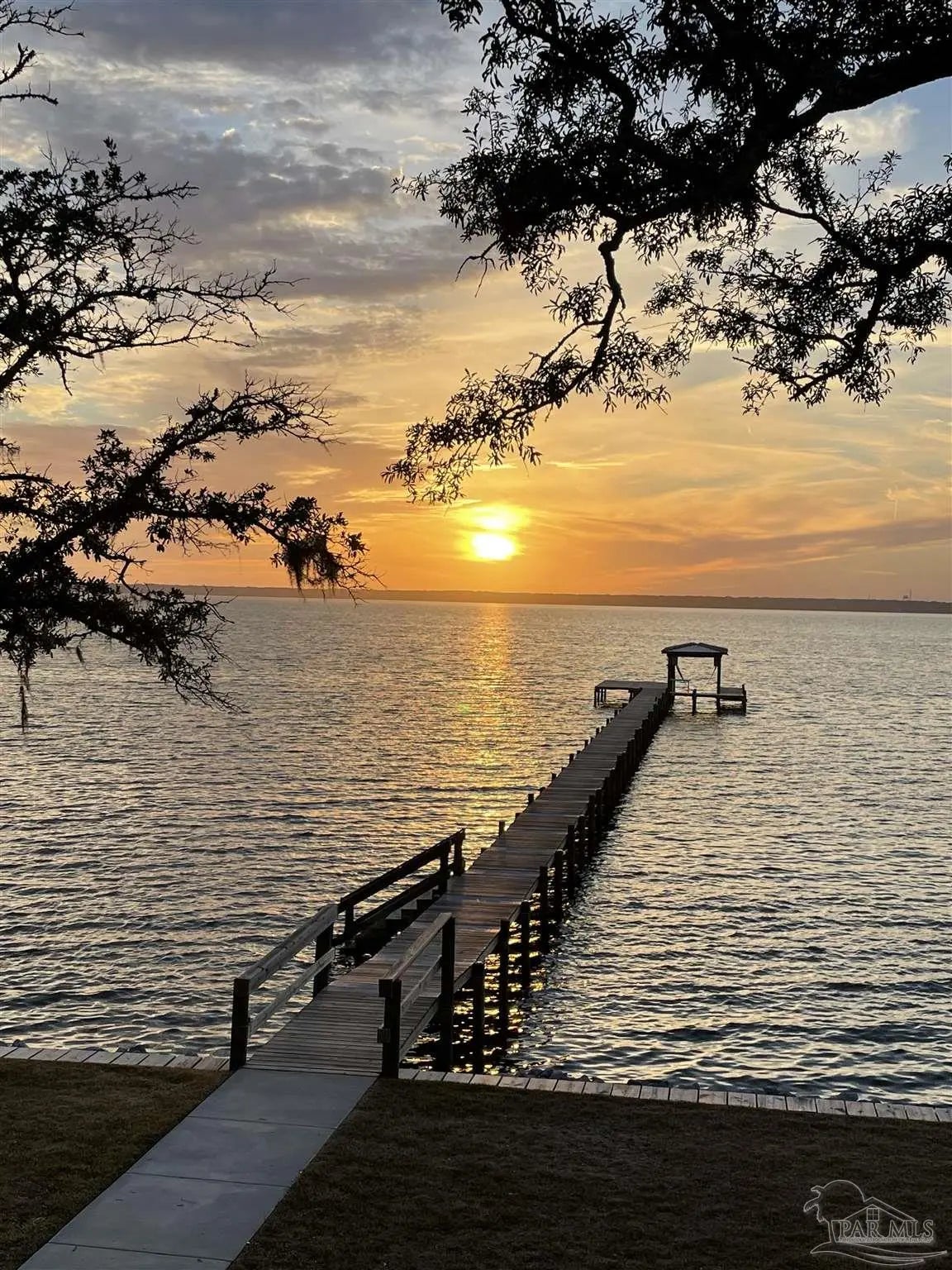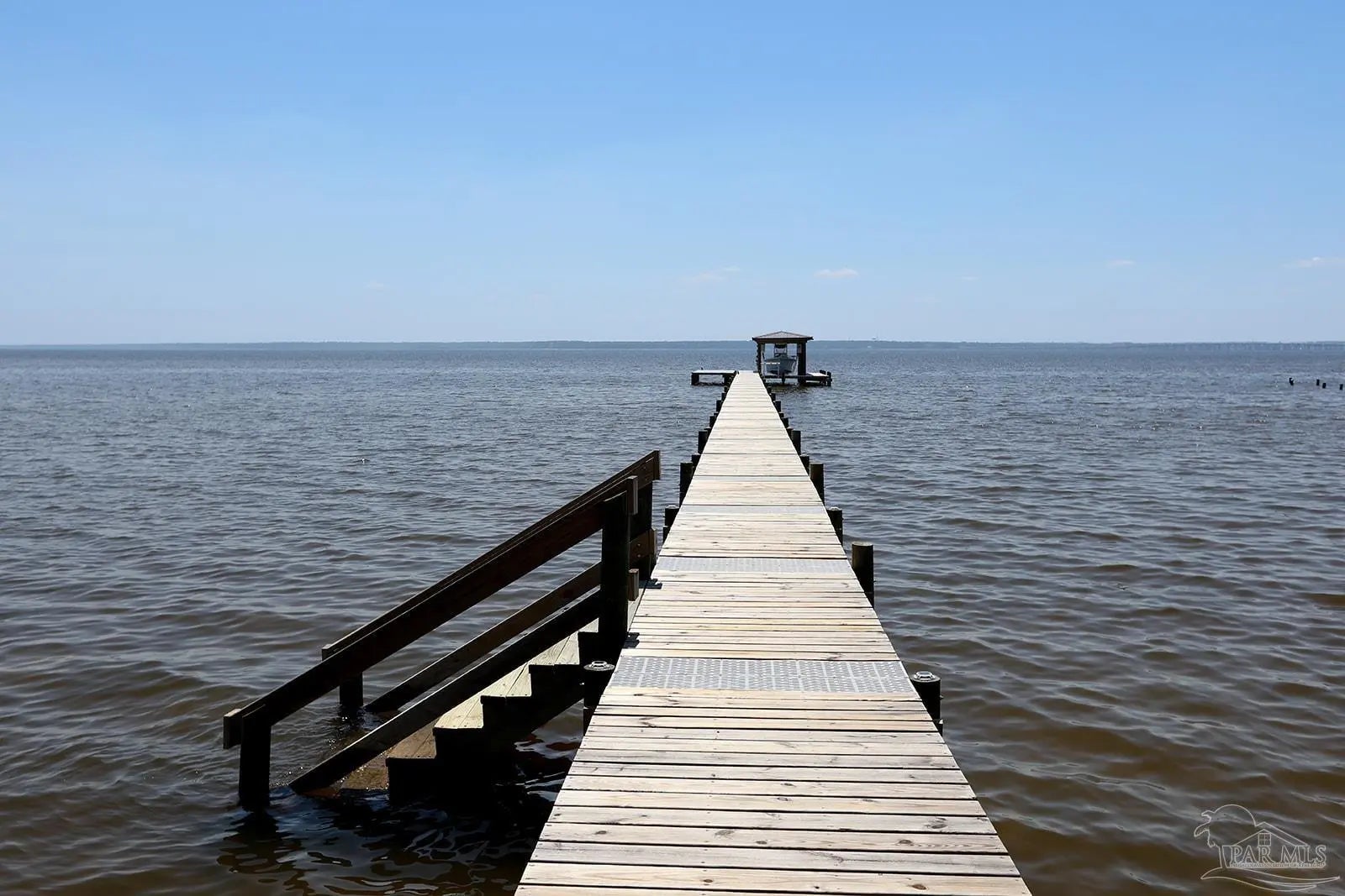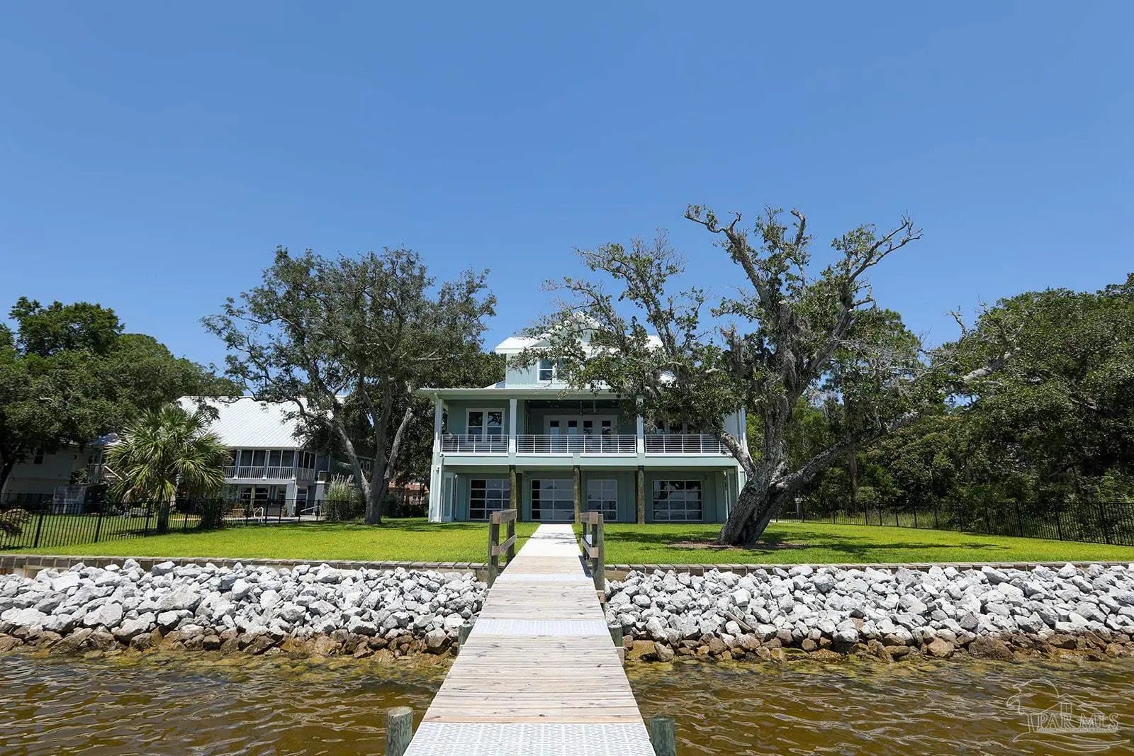Fully Furnished Luxury Waterfront Living!! This custom built home sits on a half acre lot directly on Escambia Bay. Nestled among mature oaks in a quiet cup-da-sac, this home is waterfront living at its best. The 330' dock leads to a 30' boat house with lift. There is a 15'x30' platform great for entertaining. When you enter the front door the views through the rear French doors sets the stage. With coffer ceiling in the living room with stacked stone fireplace with built in book cases on each side. The living room is directly open to the kitchen and dining room. The kitchen features quartz countertops, gas cooktop, double oven, dishwasher and fridge. The dining room is directly off the kitchen with spectacular views of the bay. The butlers pantry you will find more cabinets along with a beverage fridge with a custom pantry with additional storage and microwave. The large main bedroom has high ceilings with black out curtains with windows overlooking the bay. The main bathroom has double vanity, make up area, freestanding tub and over sized tile shower with dual shower heads. The oversized closet has window seat and custom cabinetry. To the right of the front door you will find a half bath, a large storage closet that could be used as an office and oversized laundry room with custom cabinets, washer and dryer. Upstairs you will find two more bedrooms and a Jack and Jill bath. The loft area is great place for kids to hang out. Upstairs you will also find additional storage and the Media closet. The house has security cameras, alarm system, wifi extenders, 3 zone stereo system. The covered back patio has cypress ceiling with two huge ceiling fans, gas fireplace, with TV. The oversized garage under house has glass garage door across the back and a storage room with ice machine Floor plan in Docs