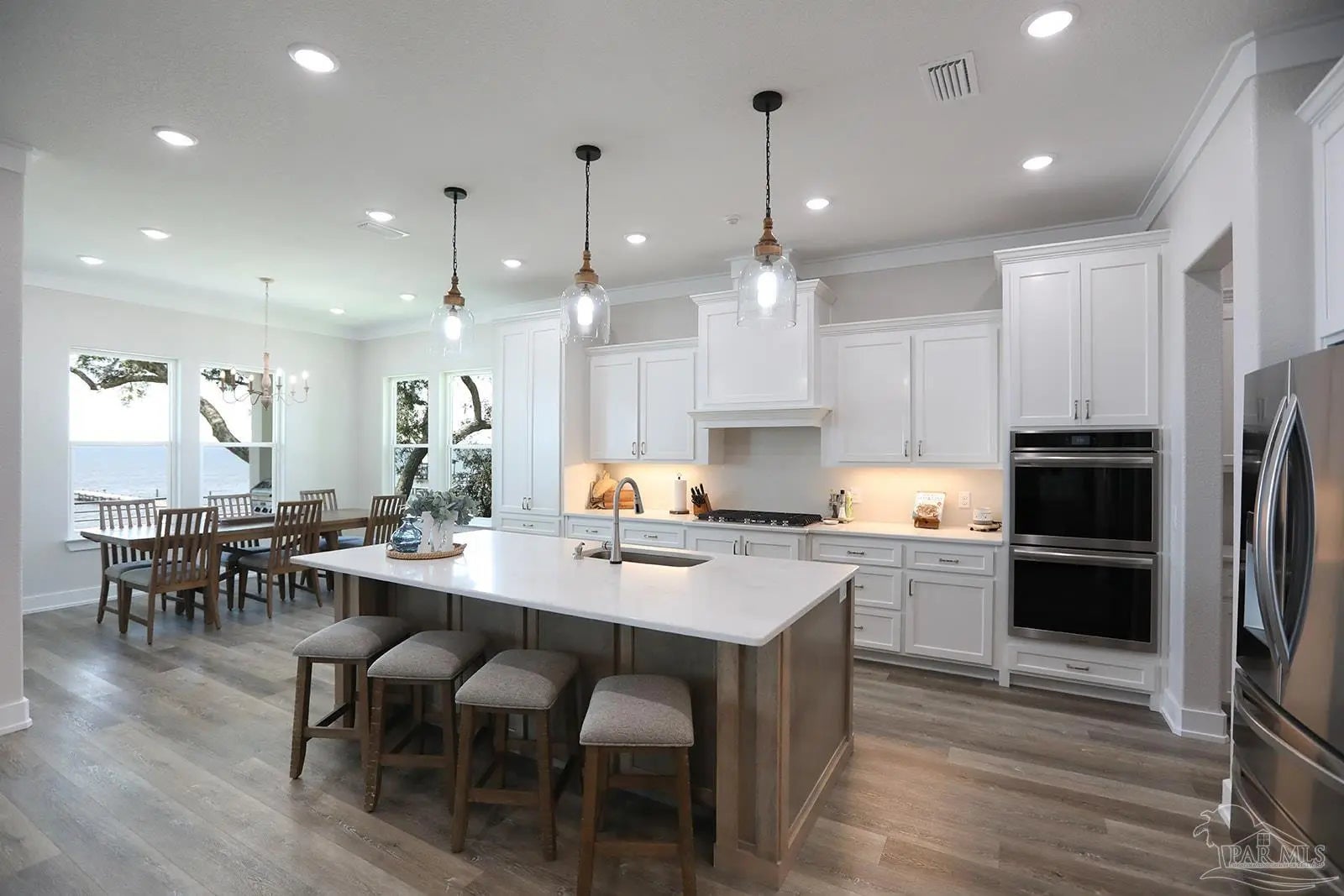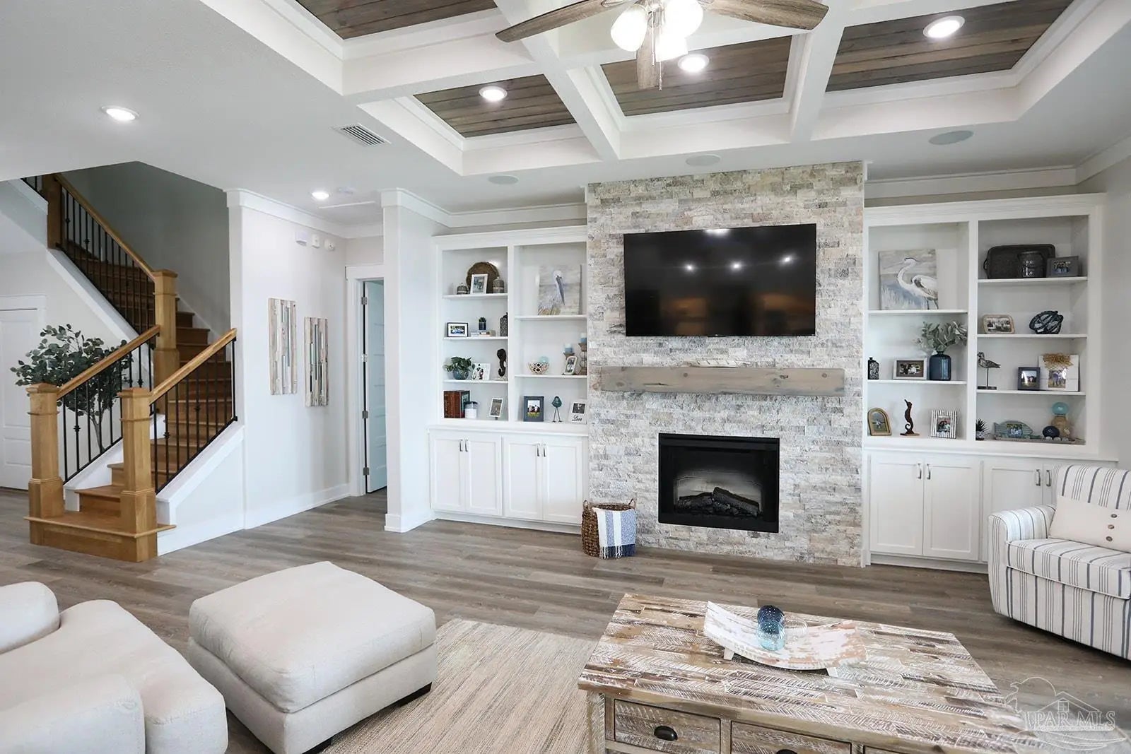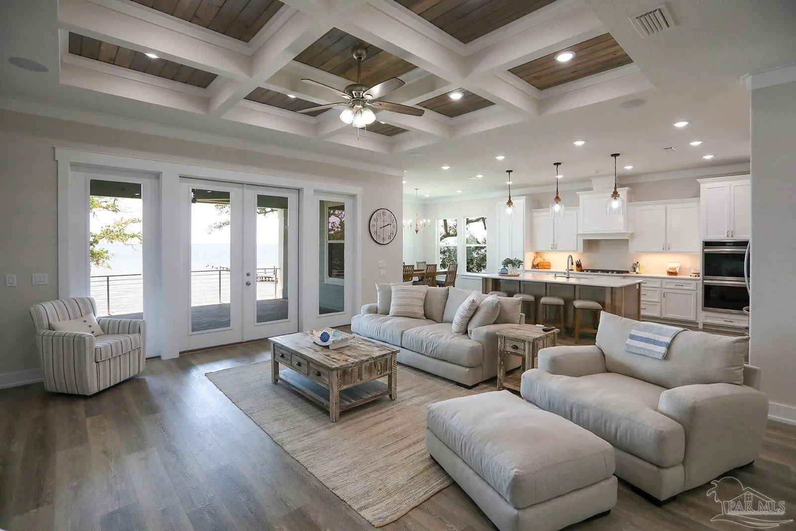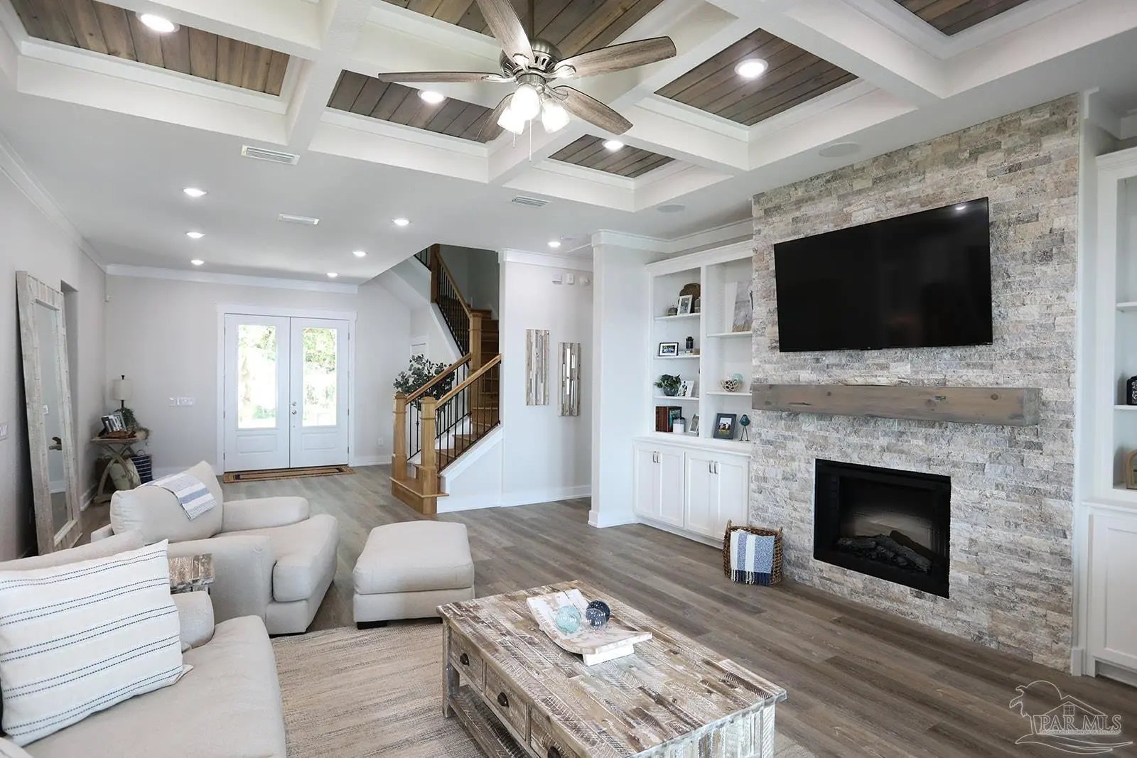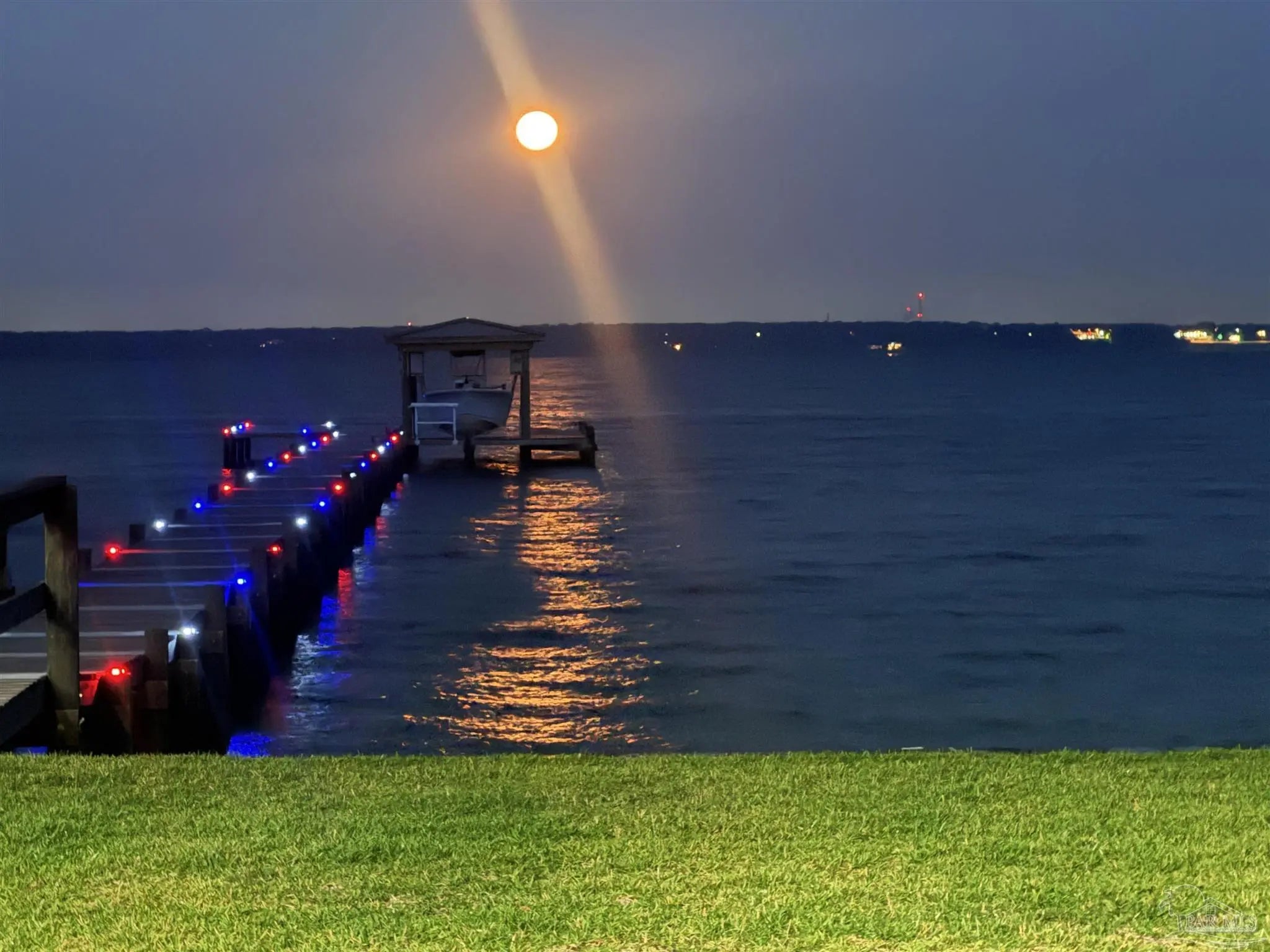Fully Furnished Luxury Waterfront Living!! This custom built home sits on a half acre lot directly on Escambia Bay. Nestled among mature oaks in a quiet cup-da-sac, this home is waterfront living at its best. The 330' dock leads to a 30' boat house with lift. There is a 15'x30' platform great for entertaining. When you enter the front door the views through the rear French doors sets the stage. With coffer ceiling in the living room with stacked stone fireplace with built in book cases on each side. The living room is directly open to the kitchen and dining room. The kitchen features quartz countertops, gas cooktop, double oven, dishwasher and fridge. The dining room is directly off the kitchen with spectacular views of the bay. The butlers pantry you will find more cabinets along with a beverage fridge with a custom pantry with additional storage and microwave. The large main bedroom has high ceilings with black out curtains with windows overlooking the bay. The main bathroom has double vanity, make up area, freestanding tub and over sized tile shower with dual shower heads. The oversized closet has window seat and custom cabinetry. To the right of the front door you will find a half bath, a large storage closet that could be used as an office and oversized laundry room with custom cabinets, washer and dryer. Upstairs you will find two more bedrooms and a Jack and Jill bath. The loft area is great place for kids to hang out. Upstairs you will also find additional storage and the Media closet. The house has security cameras, alarm system, wifi extenders, 3 zone stereo system. The covered back patio has cypress ceiling with two huge ceiling fans, gas fireplace, with TV. The oversized garage under house has glass garage door across the back and a storage room with ice machine Floor plan in Docs