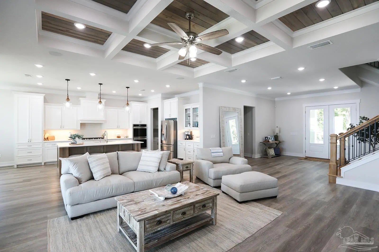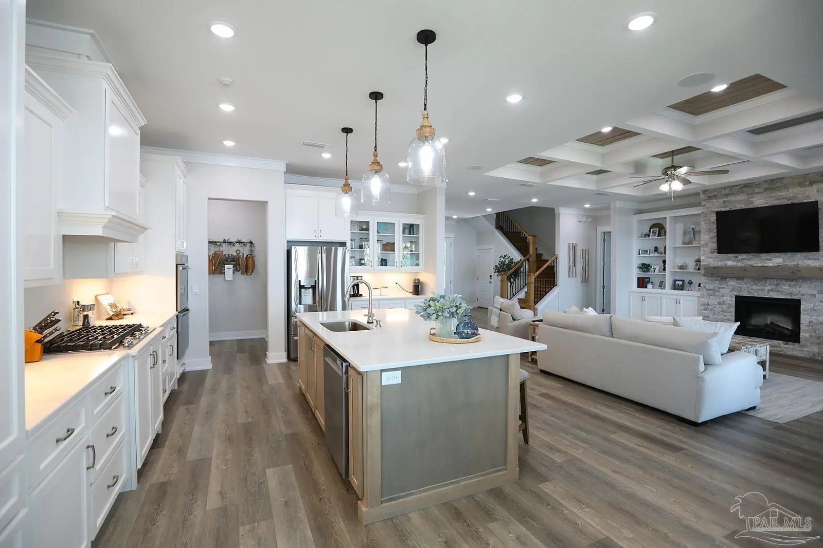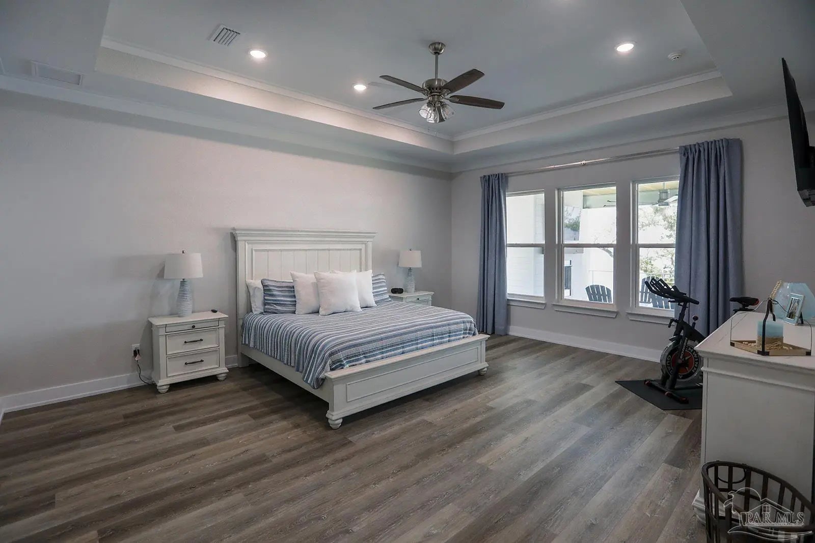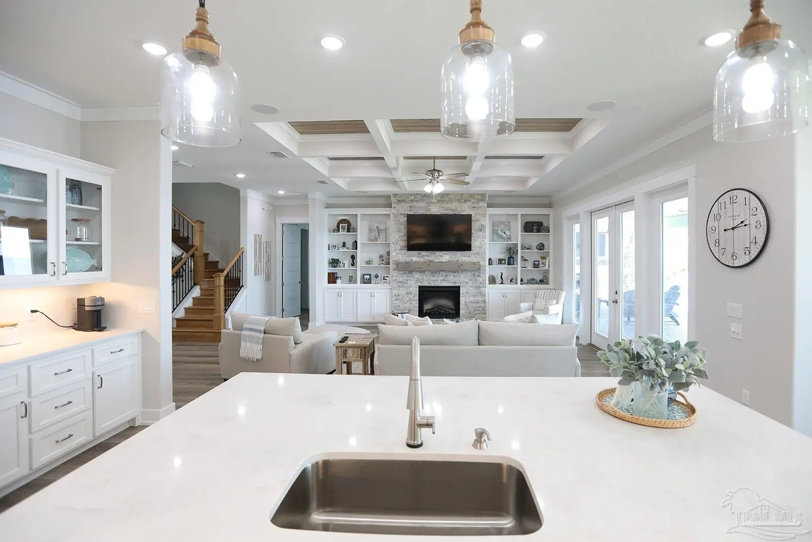 Fully Furnished Luxury Waterfront Living!! This custom built home sits on a half acre lot directly on Escambia Bay. Nestled among mature oaks in a quiet cup-da-sac, this home is waterfront living at its best. The 330' dock leads to a 30' boat house with lift. There is a 15'x30' platform great for entertaining. When you enter the front door the views through the rear French doors sets the stage. With coffer ceiling in the living room with stacked stone fireplace with built in book cases on each side. The living room is directly open to the kitchen and dining room. The kitchen features quartz countertops, gas cooktop, double oven, dishwasher and fridge. The dining room is directly off the kitchen with spectacular views of the bay. The butlers pantry you will find more cabinets along with a beverage fridge with a custom pantry with additional storage and microwave. The large main bedroom has high ceilings with black out curtains with windows overlooking the bay. The main bathroom has double vanity, make up area, freestanding tub and over sized tile shower with dual shower heads. The oversized closet has window seat and custom cabinetry. To the right of the front door you will find a half bath, a large storage closet that could be used as an office and oversized laundry room with custom cabinets, washer and dryer. Upstairs you will find two more bedrooms and a Jack and Jill bath. The loft area is great place for kids to hang out. Upstairs you will also find additional storage and the Media closet. The house has security cameras, alarm system, wifi extenders, 3 zone stereo system. The covered back patio has cypress ceiling with two huge ceiling fans, gas fireplace, with TV. The oversized garage under house has glass garage door across the back and a storage room with ice machine Floor plan in Docs