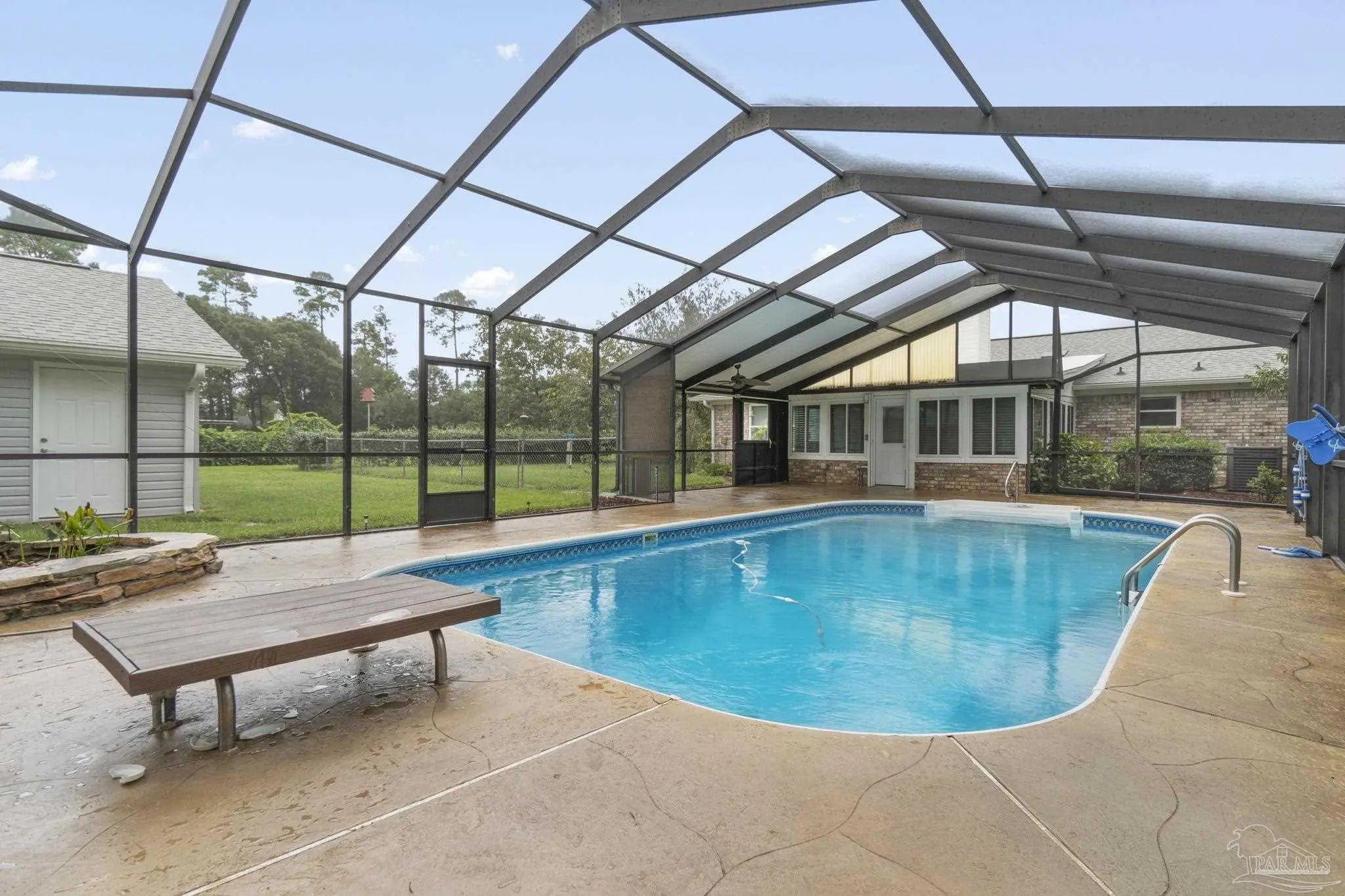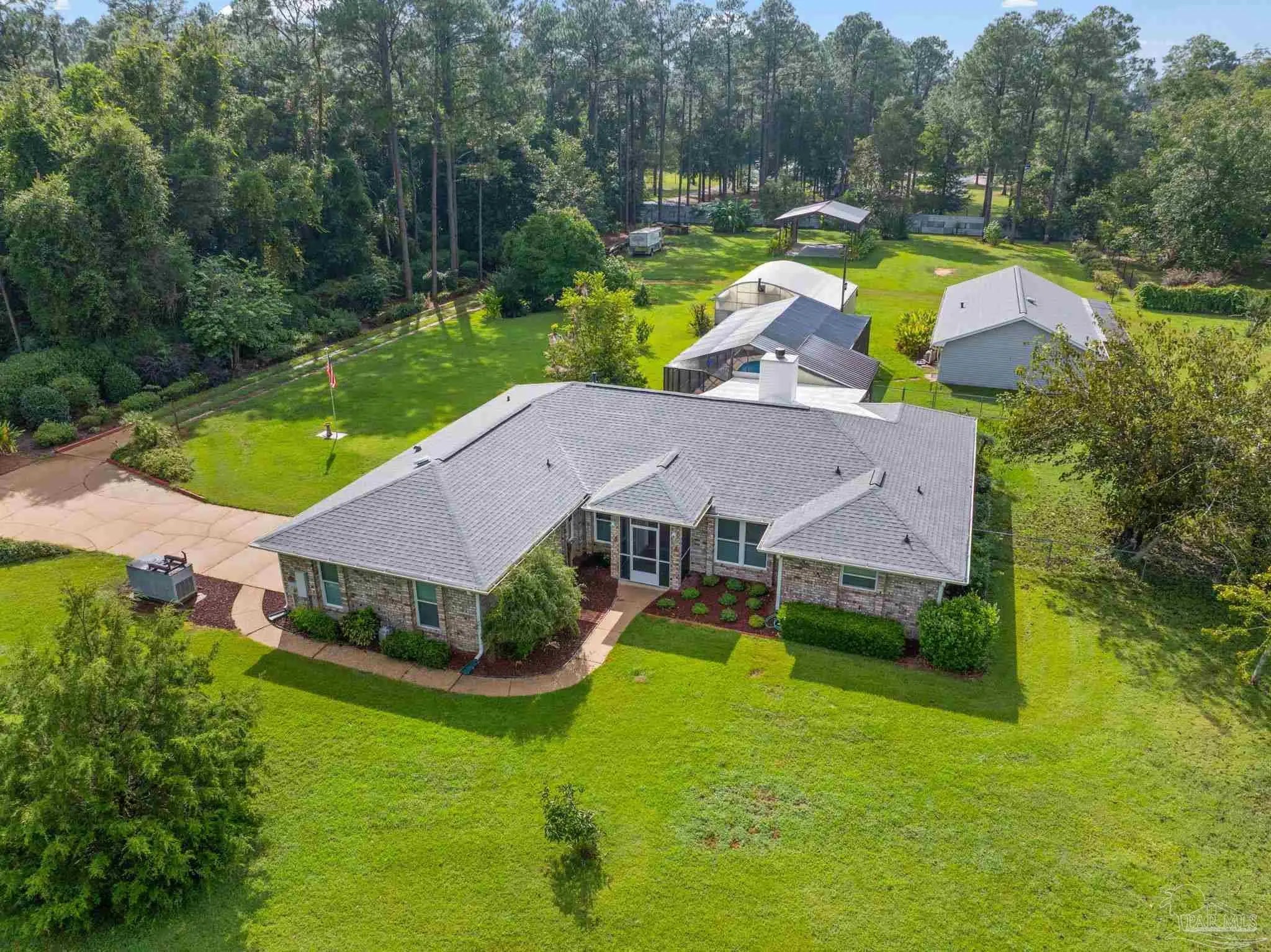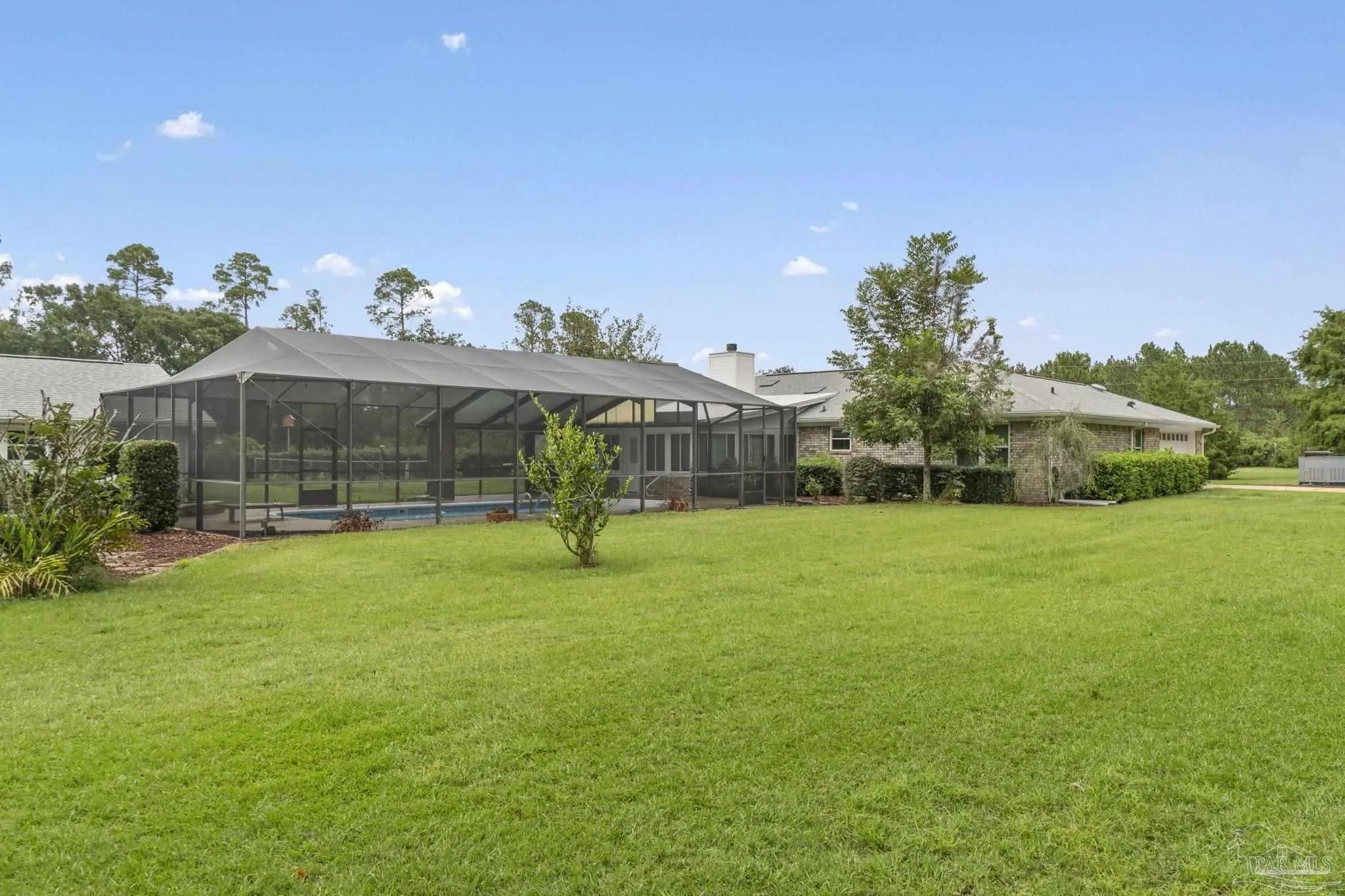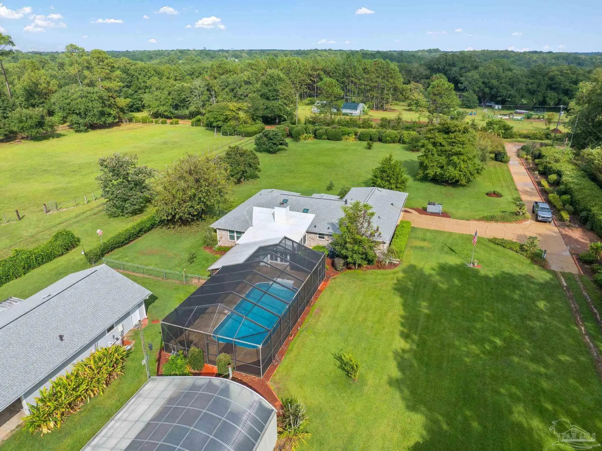 Set amid four peaceful acres in sought-after Pace, this four-bedroom, two-bath residence blends the ease of modern living with the charm of a private country estate. A welcoming front porch leads into an open, light-filled interior where generous living spaces and warm finishes create an inviting atmosphere. The kitchen offers ample counter space and storage, while the adjoining dining and family areas are perfect for gatherings large or small. A 320-square-foot sunroom stretches across the back of the home, framed by walls of windows that overlook the sparkling inground pool and landscaped grounds. The screened pool enclosure ensures year-round enjoyment, whether you’re swimming on warm afternoons or hosting evening get-togethers under the stars. Outdoors, the property is designed for versatility and self-sufficiency. A detached 1,000-square-foot garage provides room for multiple vehicles, a workshop, or serious storage. Nearby, a 24×36 pole barn offers storage for your boat or tractor. A 24×36 horse barn accommodate animals, equipment, or hobby projects, while a greenhouse invites you to cultivate vegetables and flowers throughout the seasons. A whole-home generator offers peace of mind during storms, and a full sprinkler system keeps the grounds lush with minimal effort. Despite its quiet, rural setting, the home sits just minutes from top-rated schools, shopping, and dining in Pace. Whether you envision a small farm, an equestrian retreat, or simply a spacious haven away from the rush of town, this property delivers privacy, practicality, and room to grow—making it a rare find in today’s market.
