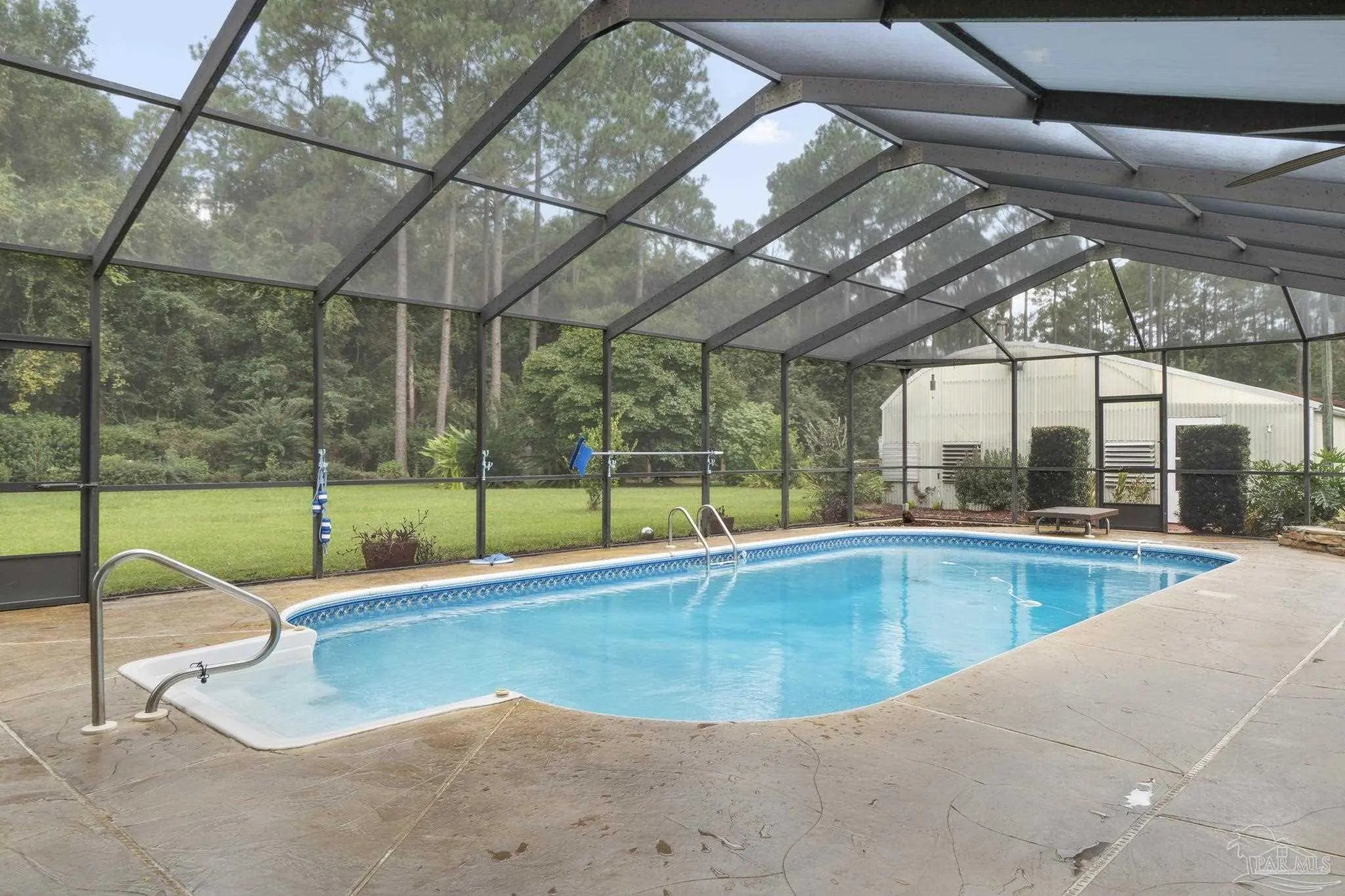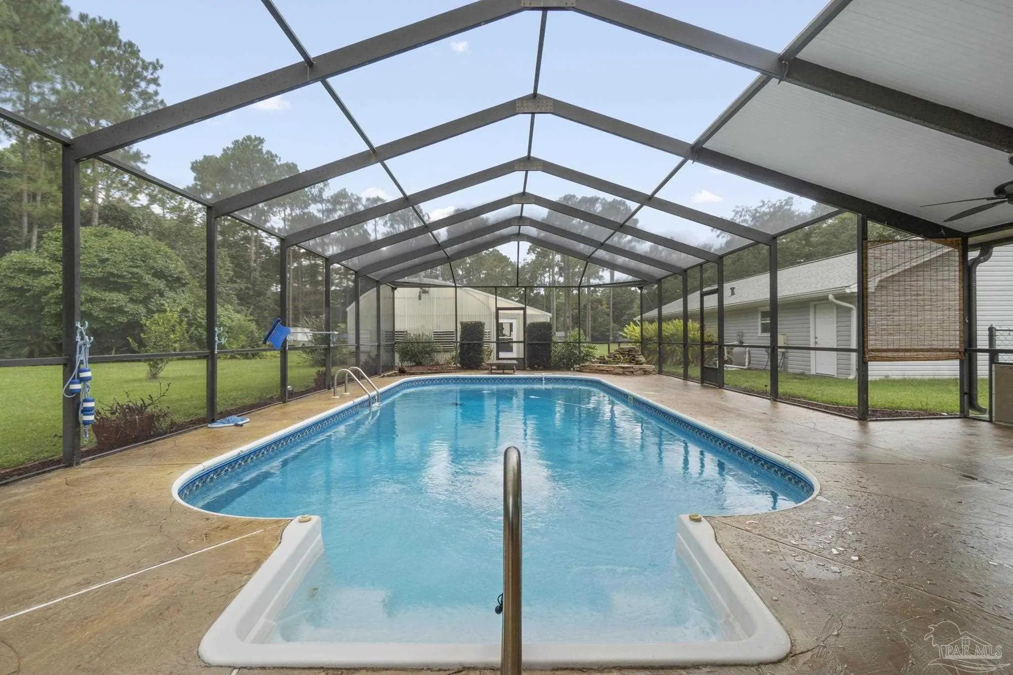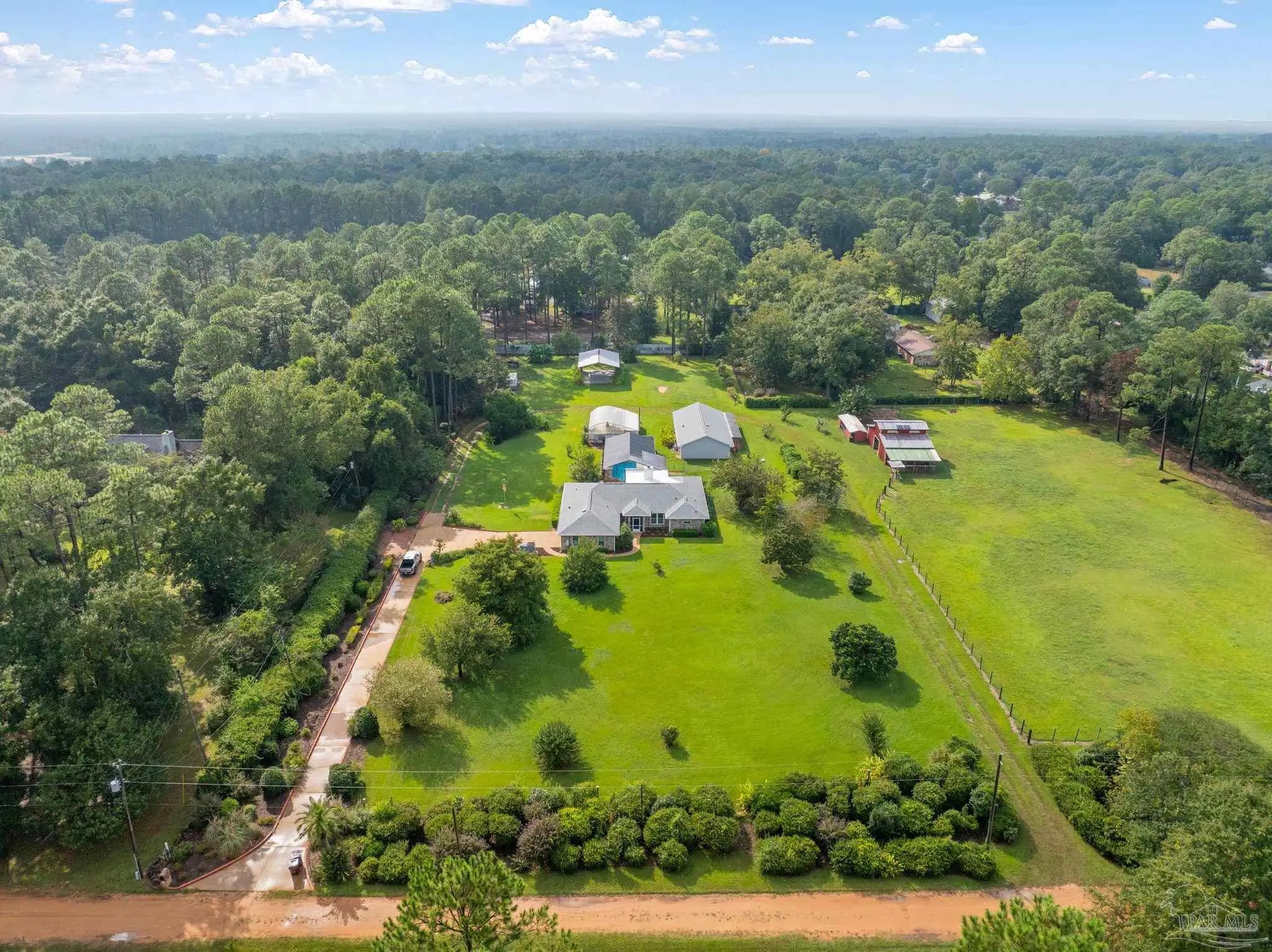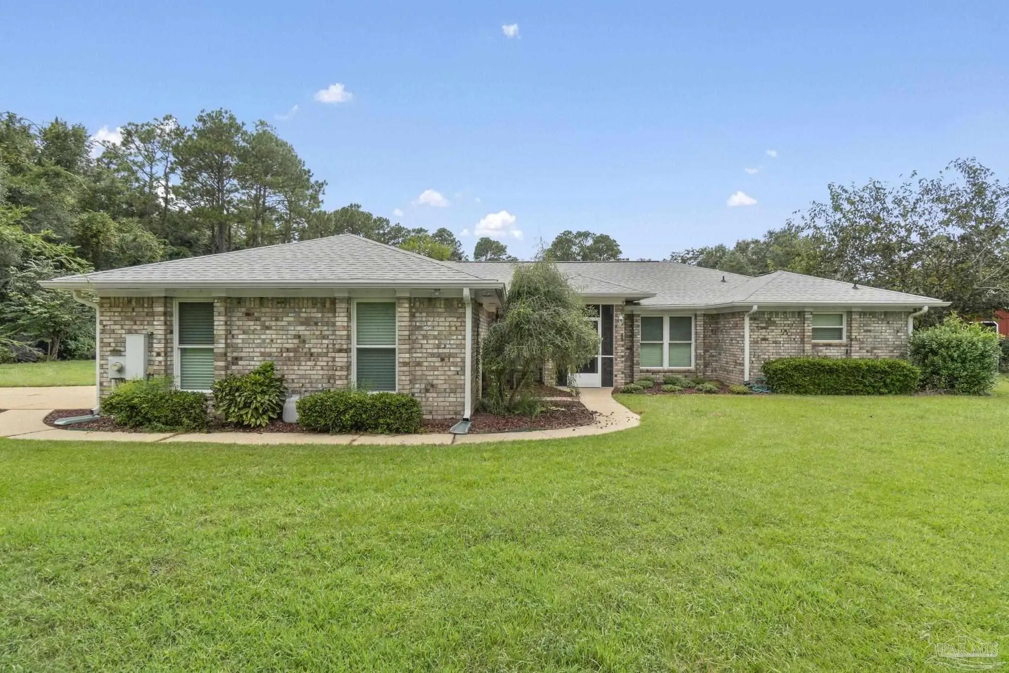 Set amid four peaceful acres in sought-after Pace, this four-bedroom, two-bath residence blends the ease of modern living with the charm of a private country estate. A welcoming front porch leads into an open, light-filled interior where generous living spaces and warm finishes create an inviting atmosphere. The kitchen offers ample counter space and storage, while the adjoining dining and family areas are perfect for gatherings large or small. A 320-square-foot sunroom stretches across the back of the home, framed by walls of windows that overlook the sparkling inground pool and landscaped grounds. The screened pool enclosure ensures year-round enjoyment, whether you’re swimming on warm afternoons or hosting evening get-togethers under the stars. Outdoors, the property is designed for versatility and self-sufficiency. A detached 1,000-square-foot garage provides room for multiple vehicles, a workshop, or serious storage. Nearby, a 24×36 pole barn offers storage for your boat or tractor. A 24×36 horse barn accommodate animals, equipment, or hobby projects, while a greenhouse invites you to cultivate vegetables and flowers throughout the seasons. A whole-home generator offers peace of mind during storms, and a full sprinkler system keeps the grounds lush with minimal effort. Despite its quiet, rural setting, the home sits just minutes from top-rated schools, shopping, and dining in Pace. Whether you envision a small farm, an equestrian retreat, or simply a spacious haven away from the rush of town, this property delivers privacy, practicality, and room to grow—making it a rare find in today’s market.