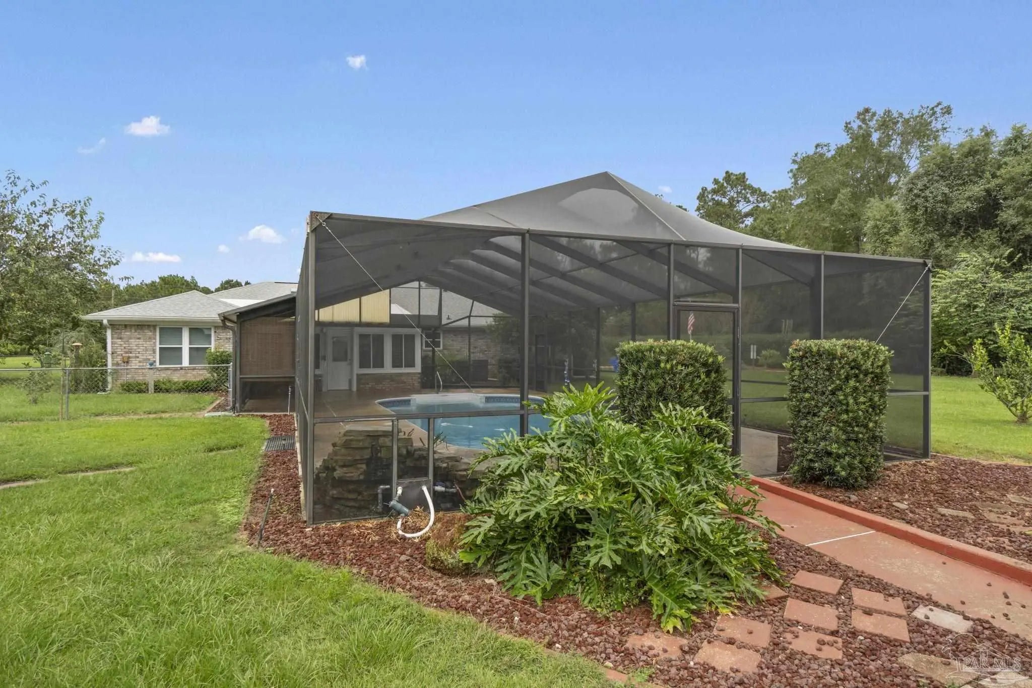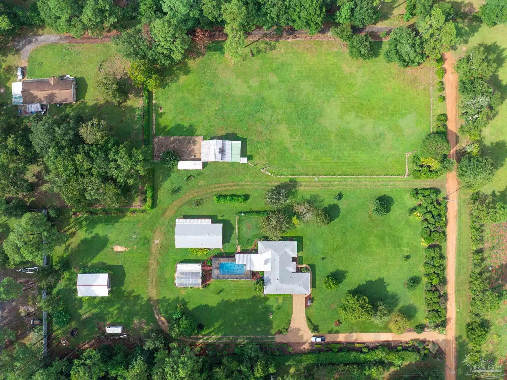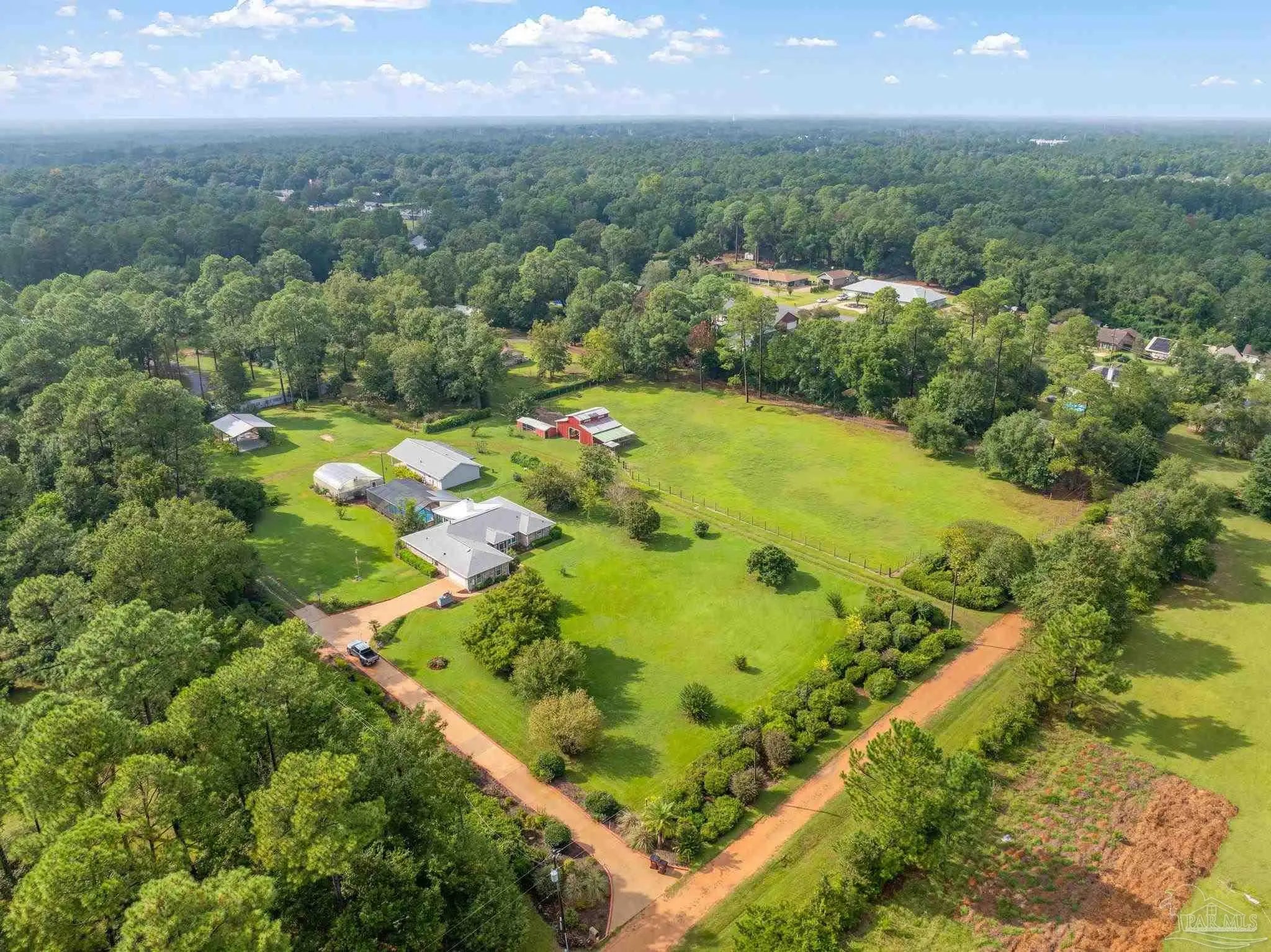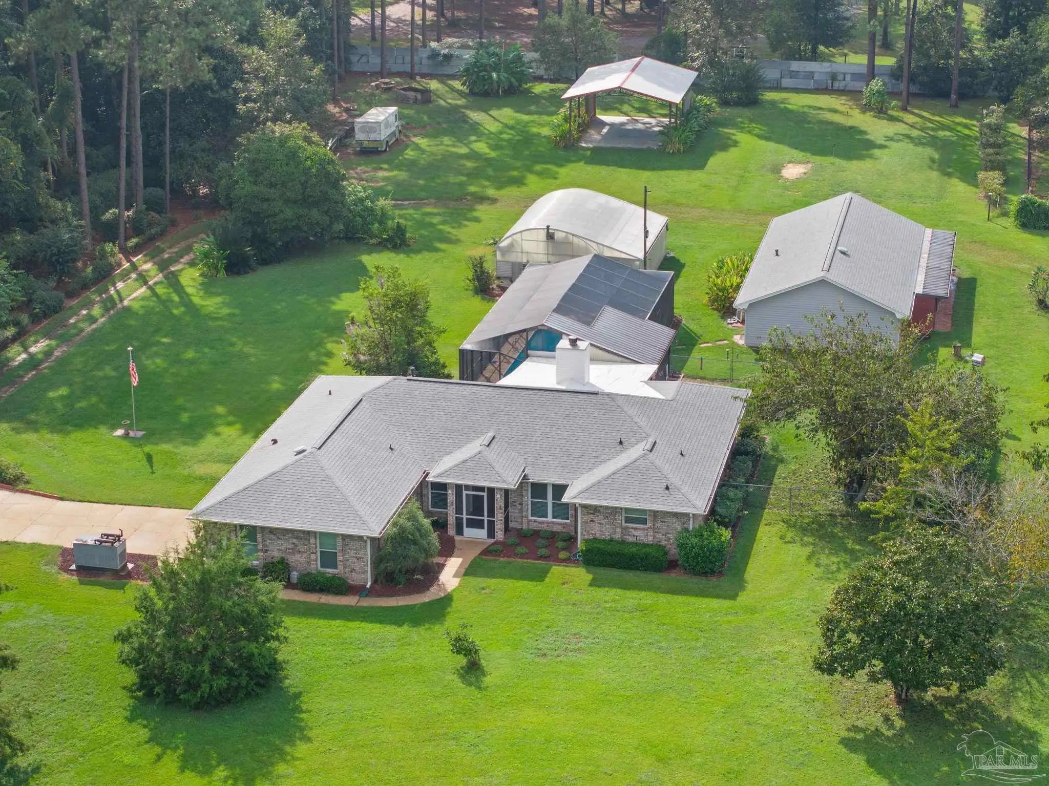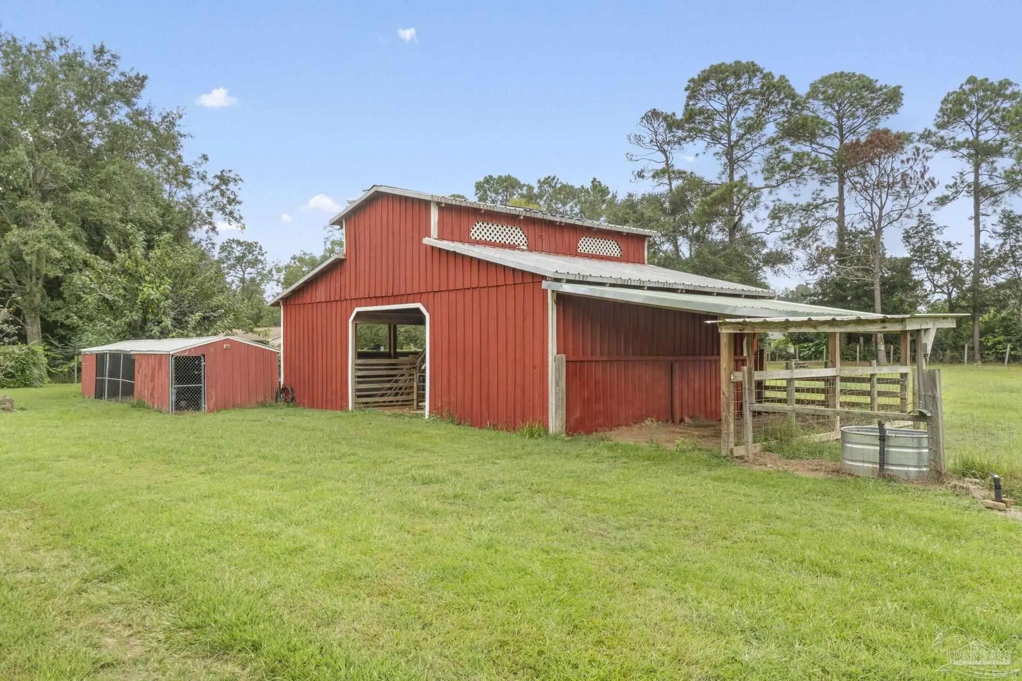 Set amid four peaceful acres in sought-after Pace, this four-bedroom, two-bath residence blends the ease of modern living with the charm of a private country estate. A welcoming front porch leads into an open, light-filled interior where generous living spaces and warm finishes create an inviting atmosphere. The kitchen offers ample counter space and storage, while the adjoining dining and family areas are perfect for gatherings large or small. A 320-square-foot sunroom stretches across the back of the home, framed by walls of windows that overlook the sparkling inground pool and landscaped grounds. The screened pool enclosure ensures year-round enjoyment, whether you’re swimming on warm afternoons or hosting evening get-togethers under the stars. Outdoors, the property is designed for versatility and self-sufficiency. A detached 1,000-square-foot garage provides room for multiple vehicles, a workshop, or serious storage. Nearby, a 24×36 pole barn offers storage for your boat or tractor. A 24×36 horse barn accommodate animals, equipment, or hobby projects, while a greenhouse invites you to cultivate vegetables and flowers throughout the seasons. A whole-home generator offers peace of mind during storms, and a full sprinkler system keeps the grounds lush with minimal effort. Despite its quiet, rural setting, the home sits just minutes from top-rated schools, shopping, and dining in Pace. Whether you envision a small farm, an equestrian retreat, or simply a spacious haven away from the rush of town, this property delivers privacy, practicality, and room to grow—making it a rare find in today’s market.