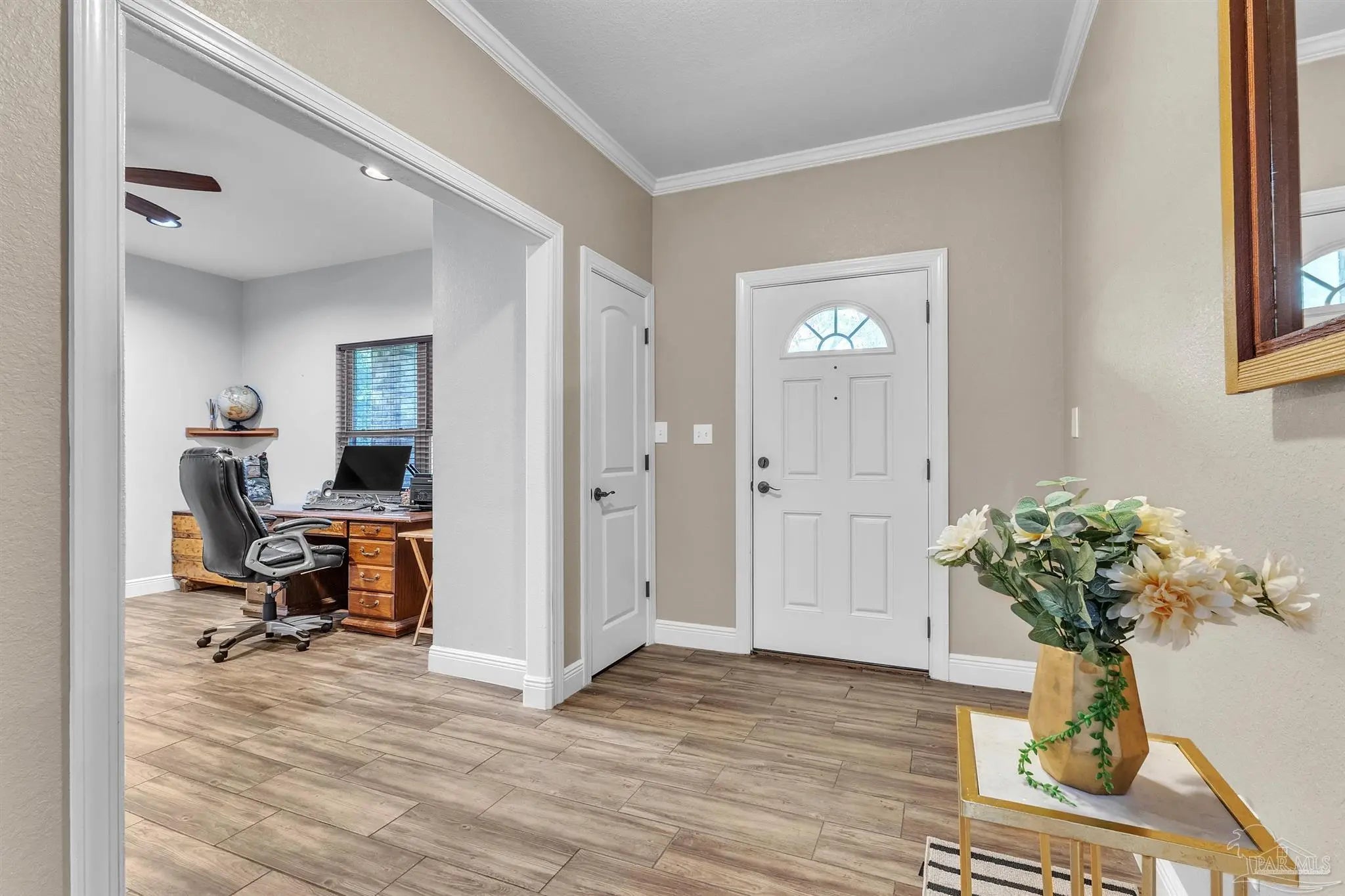Welcome to small-town charm with modern comfort. This custom-built home on a full acre in Baker, Florida offers the best of both worlds—peaceful, semi-rural living with quick access to I-10 and all the natural beauty the Florida Panhandle is known for. Baker is a community where neighbors know each other, life slows down, and outdoor adventures are right at your doorstep. From Blackwater River State Forest’s hiking, kayaking, and camping, to nearby springs, rivers, and world-class beaches, you’ll never run out of ways to explore. Designed with both everyday living and entertaining in mind, this home features an open, versatile floor plan with 9’ ceilings and porcelain floors throughout. A welcoming front porch leads you inside to a bright foyer and private office. The spacious living room, complete with a wood-burning fireplace (gas option) and custom built-ins, flows seamlessly to a gourmet kitchen boasting a gas cooktop with hood vent, double ovens, granite counters, abundant cabinetry, and a large walk-in pantry. The breakfast bar seats eight, and the breakfast nook offers serene backyard views. The primary suite is a true retreat with room for a sitting area, two walk-in closets with custom inserts, and a spa-like bath featuring dual vanities, dressing area, deluxe tiled shower with triple shower heads, and water closet. Two additional bedrooms include generous walk-in closets; one has an ensuite bath, and another full bath offers a jetted tub. A flexible craft/dining room, oversized laundry with utility sink, and 2-car garage add even more convenience. Step outside to a covered back porch overlooking nature and wildlife. With gas hookups for an outdoor kitchen, wiring for a whole-house generator, and pre-plumbing for a pool, this home is ready for future upgrades. A yard building with 220-volt power is perfect for hobbies, storage, or RV hookup. Come experience the quiet luxury of Baker living—space, comfort, and connection to both community and nature.