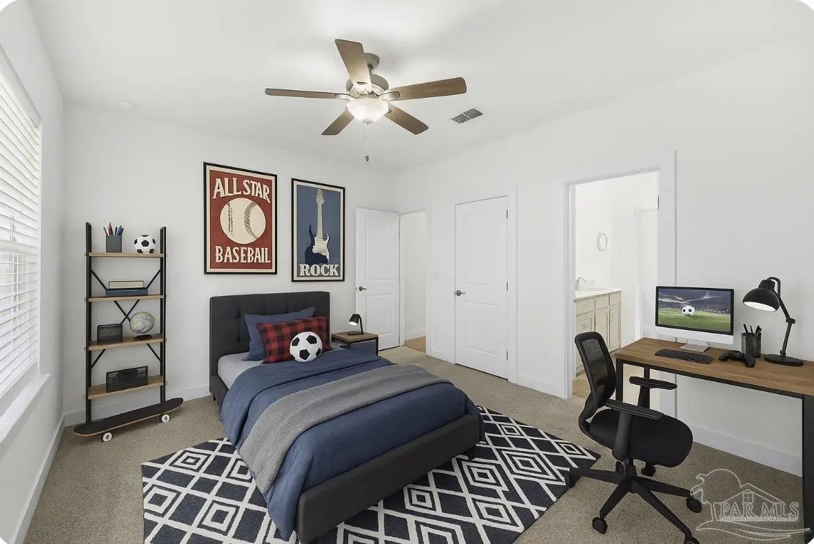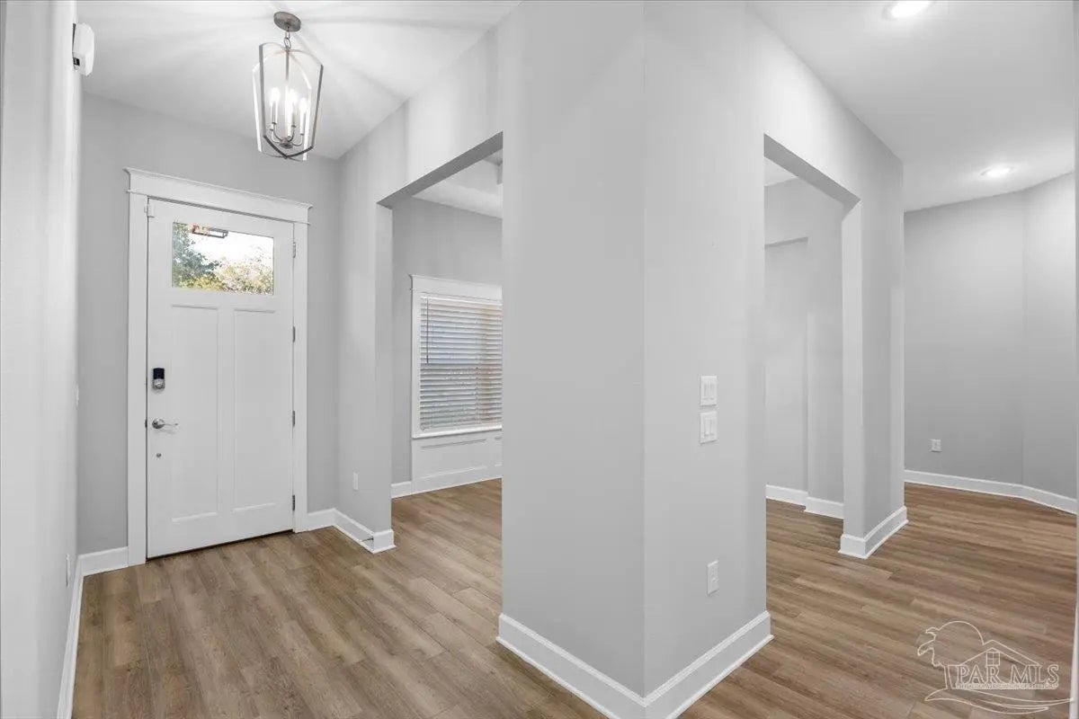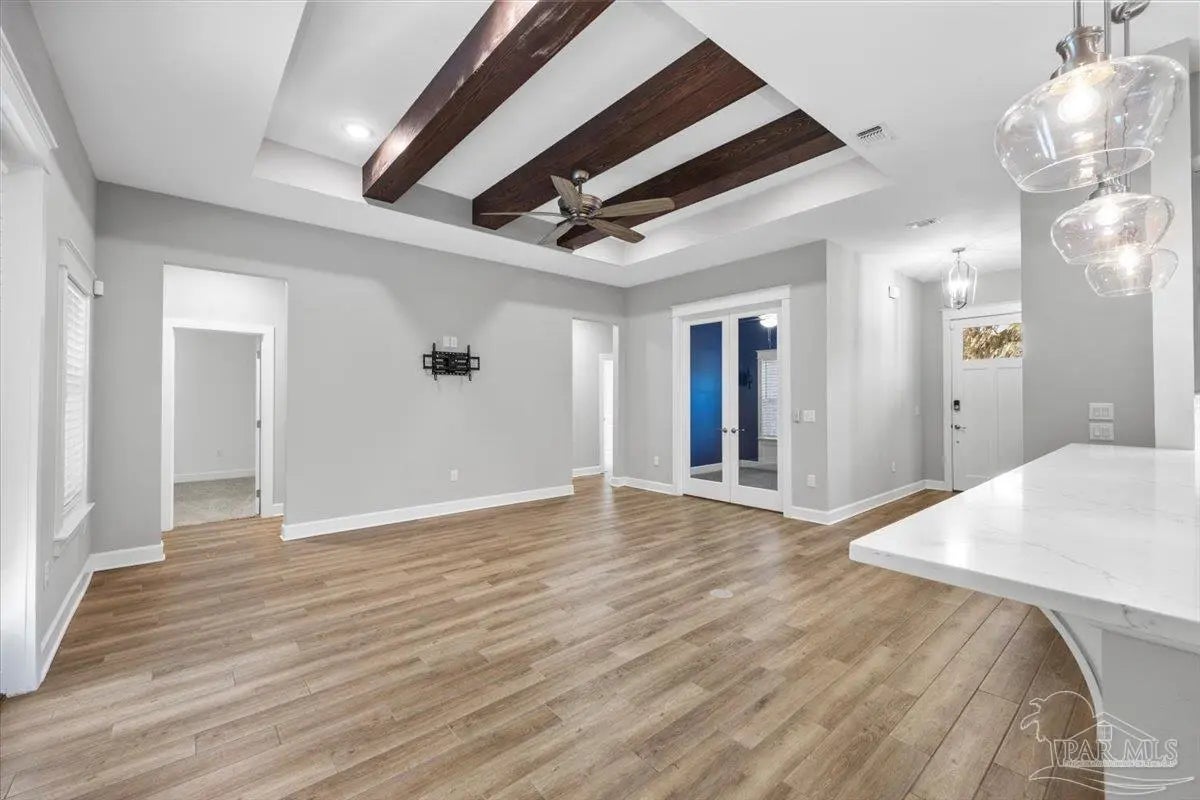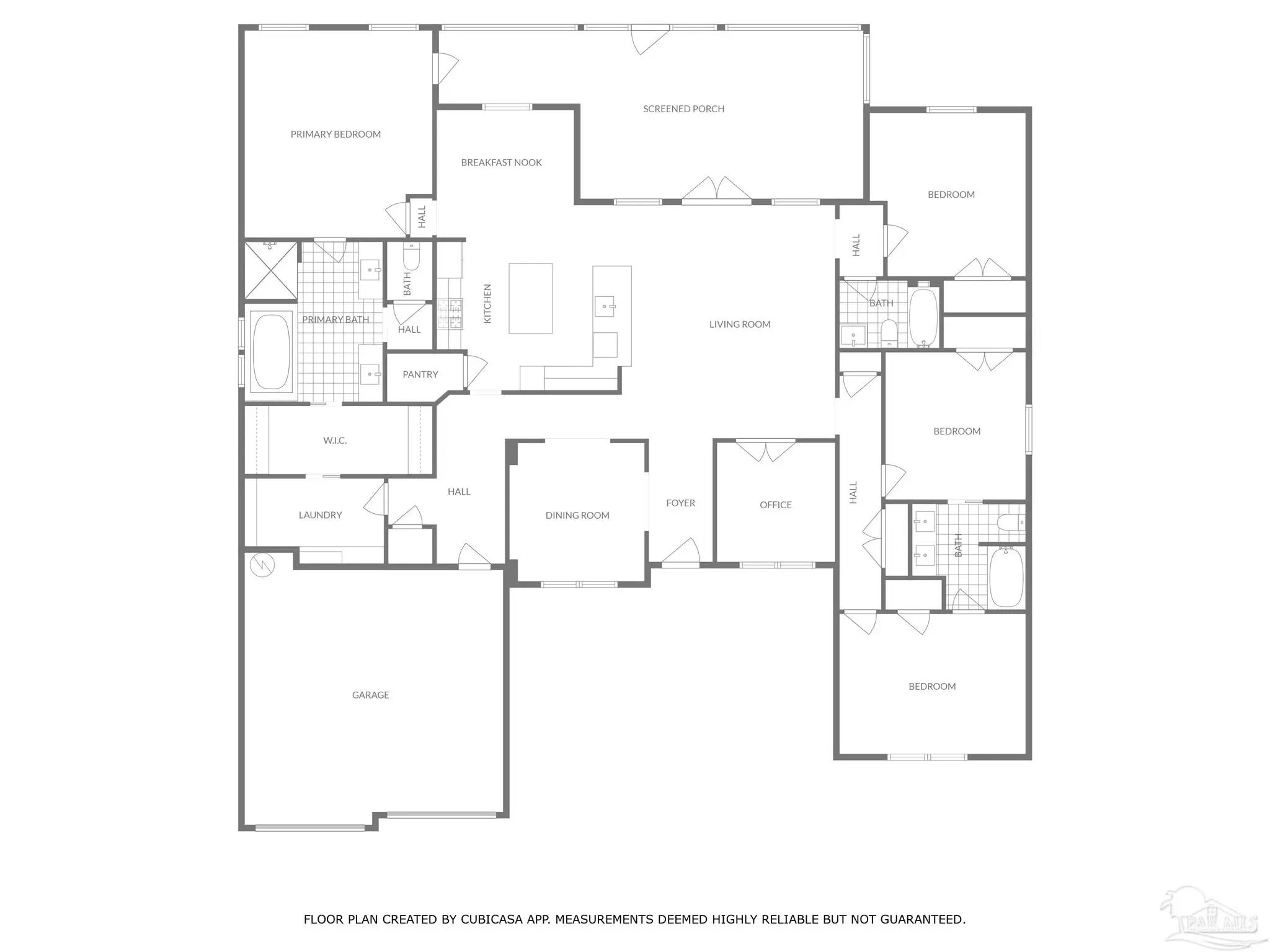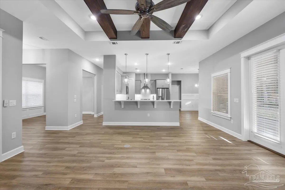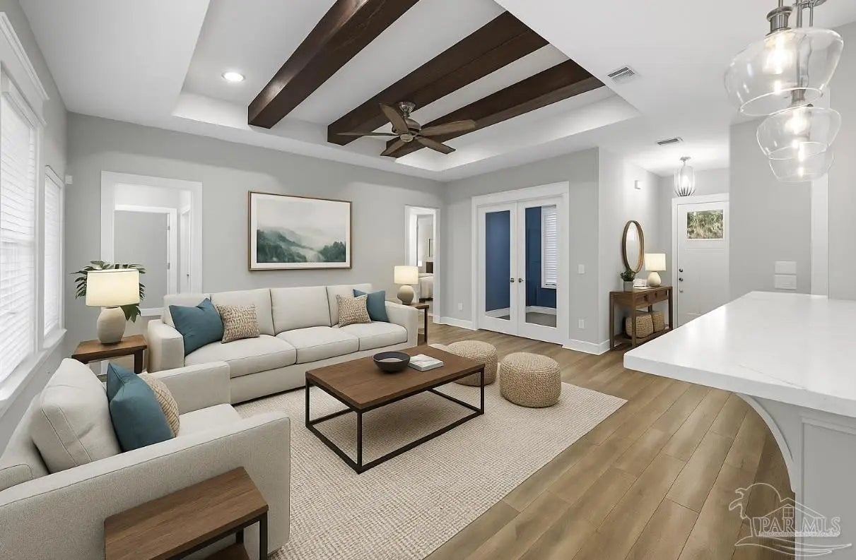 Discover unparalleled elegance and convenience in this custom built, open floor plan home, nestled within a highly sought-after gated community that is walking distance to the Sounds and Boat ramp. Key features include 4 Bedrooms, 3 Full Bathrooms. Stunning Vaulted Beamed Ceilings in the Living Room. Gourment Kitchen with a large Breakfast Bar, abundant cabinets and storage, and a walk-in pantry with wooden shelves. Multiple Dining areas include a separate Dining Room and a Breakfast Nook. Dedicated Office and functional Laundry Room. The Primary Bedroom is situated away from the other bedrooms and boasts elegant step-up ceilings with crown molding. The Primary bathroom features a beam ceiling, a large soaker tub, a tiled walk-in shower, two separate Quartz vanities, and a private water closet. The Second and Third Bedrooms have a Jack & Jill bathroom between them. The Fourth Bedroom has a bathroom just outside in the hall, which is perfect for Mom/Dad or guests. Enjoy your morning coffee on the large screened in porch. The backyard is completely fenced in. This Home has many upgrades throughout. Don't miss your chance to own this beautiful home. Home is Virtually Staged. Please see sample pool photo. House does not have a pool.