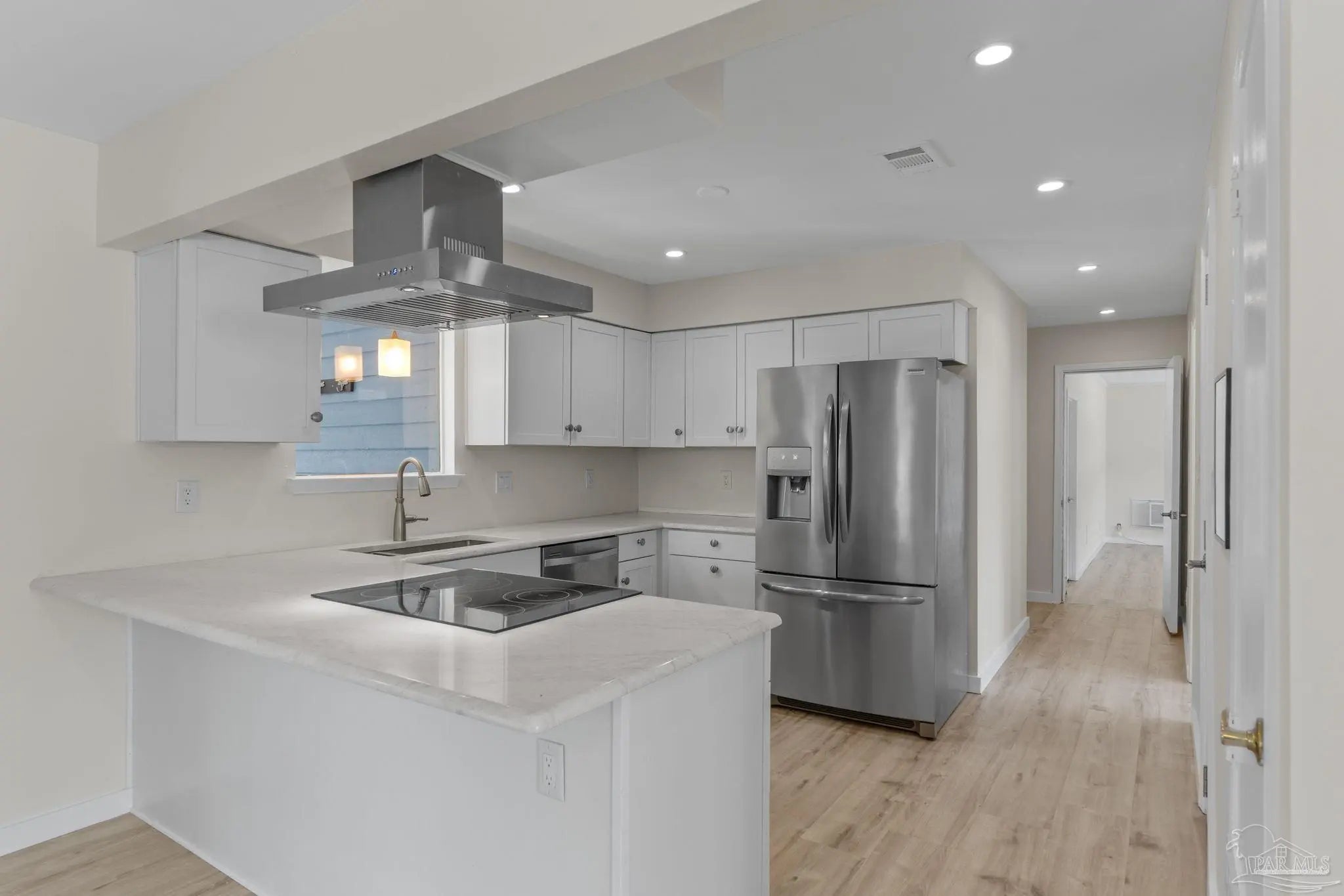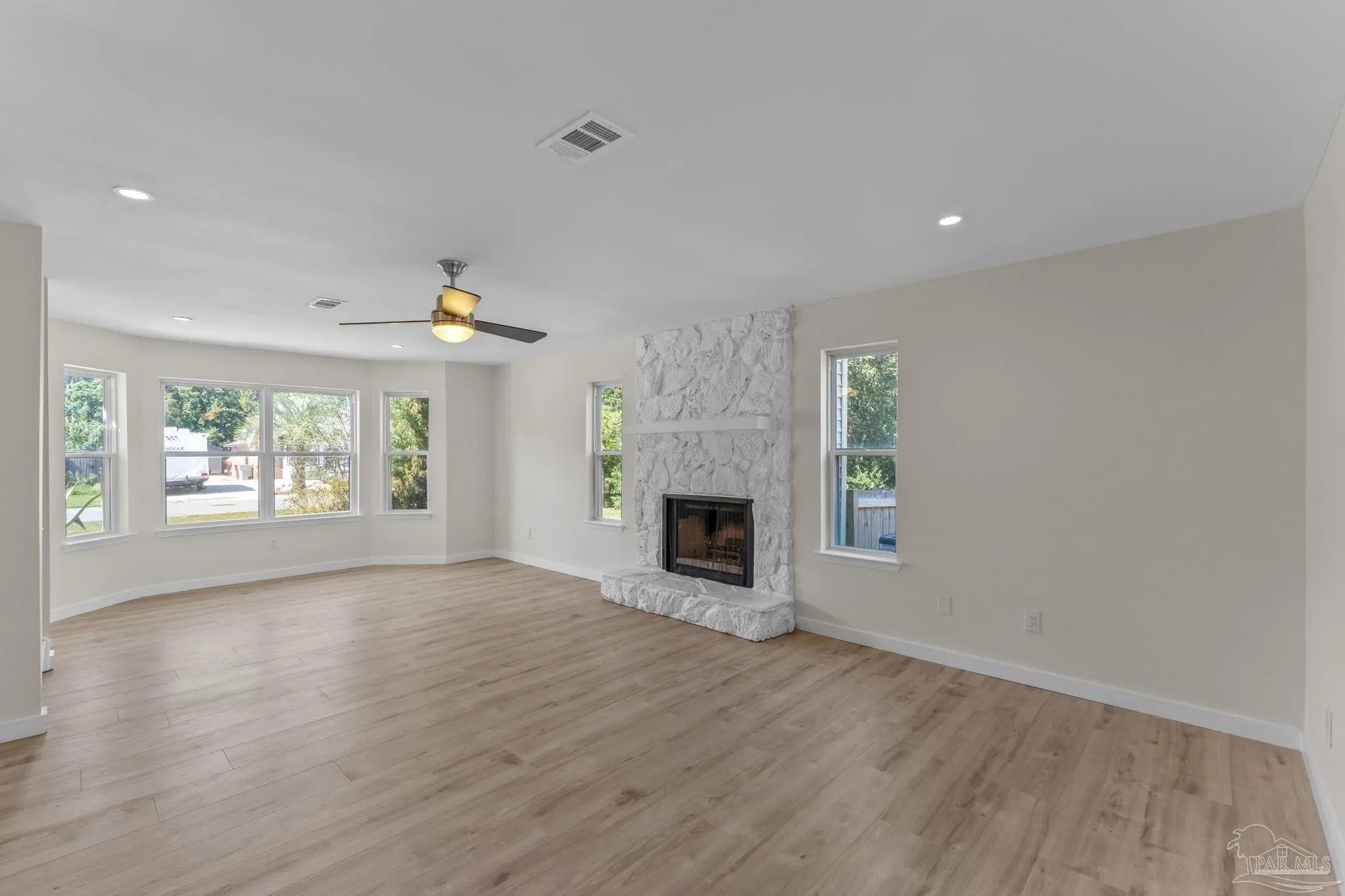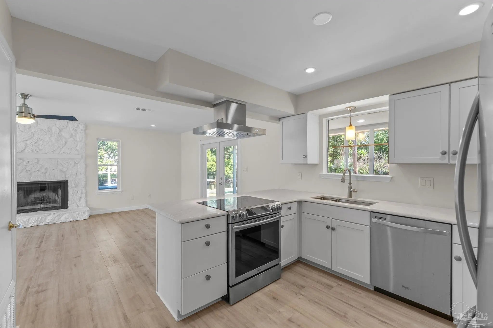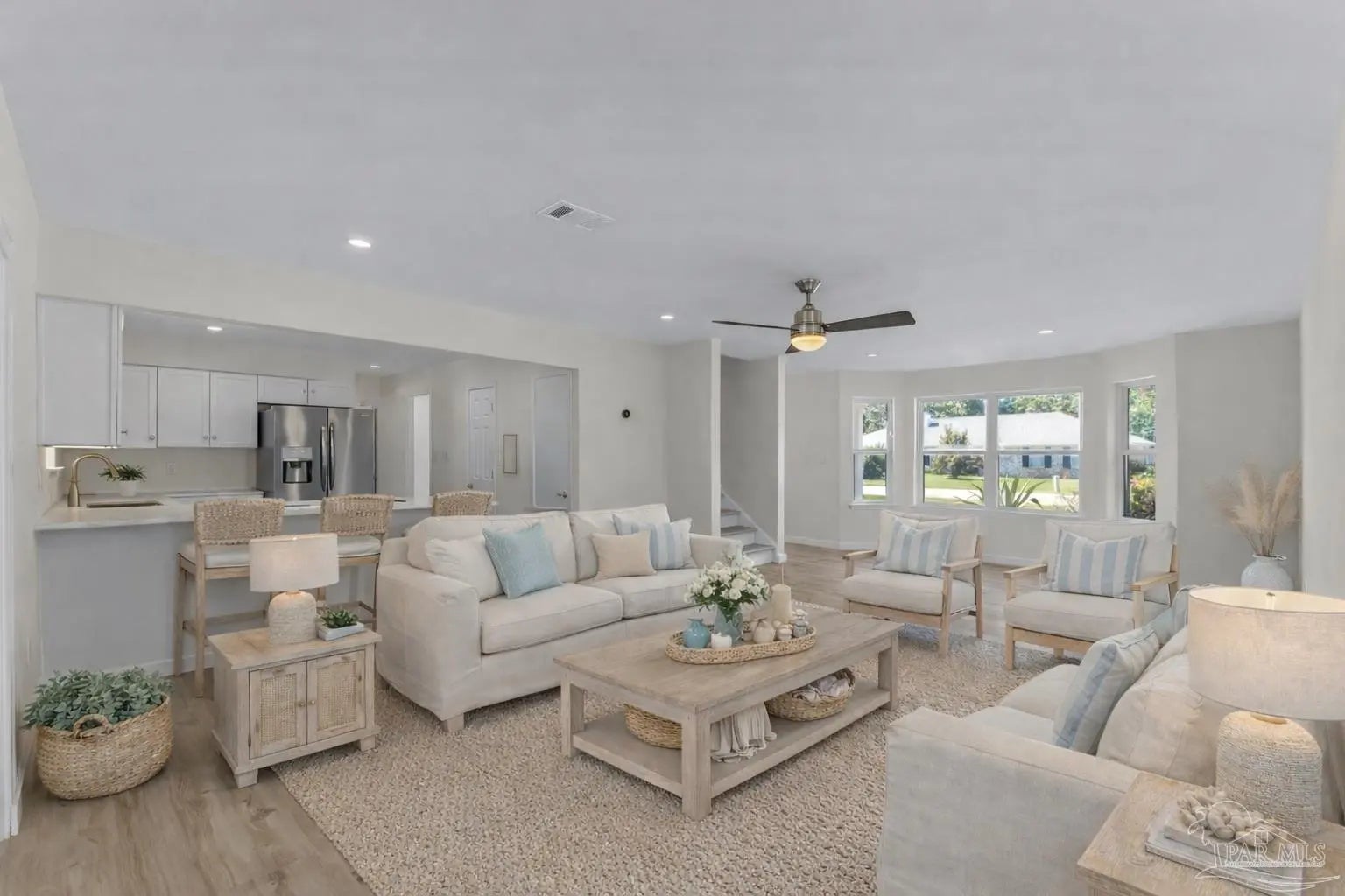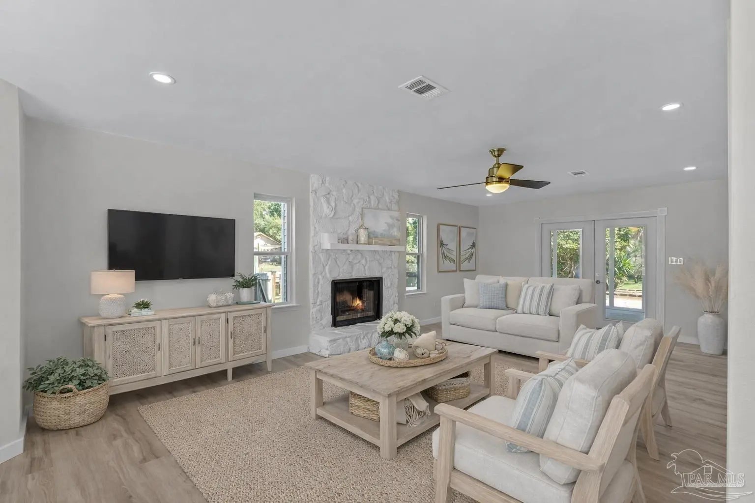 Experience Gulf Breeze waterfront living in this beautifully remodeled 4-bedroom canal-front home, offering direct access to Pensacola Bay. Situated on an oversized 0.34-acre lot, this property features a private backyard oasis where boating, paddle boarding, and fishing are just steps from your door. Inside, natural light fills the open-concept layout, highlighting new flooring, fresh coastal-inspired paint, and a striking wood-burning white stone fireplace—perfect for cozy evenings. The chef’s kitchen is the heart of the home, featuring white cabinetry, stainless steel appliances, and a sleek freestanding hood—ideal for entertaining. Step outside to enjoy a detached 3-car carport with additional storage, along with oversized parking for your RV, boat, or extra vehicles. With no HOA restrictions, you have the freedom to fully embrace the waterfront lifestyle. Located in the top-rated Gulf Breeze School District and just minutes from sugar-white beaches and the vibrant energy of downtown Pensacola, this home isn’t just a place to live—it’s a year-round retreat where every day feels like a vacation.