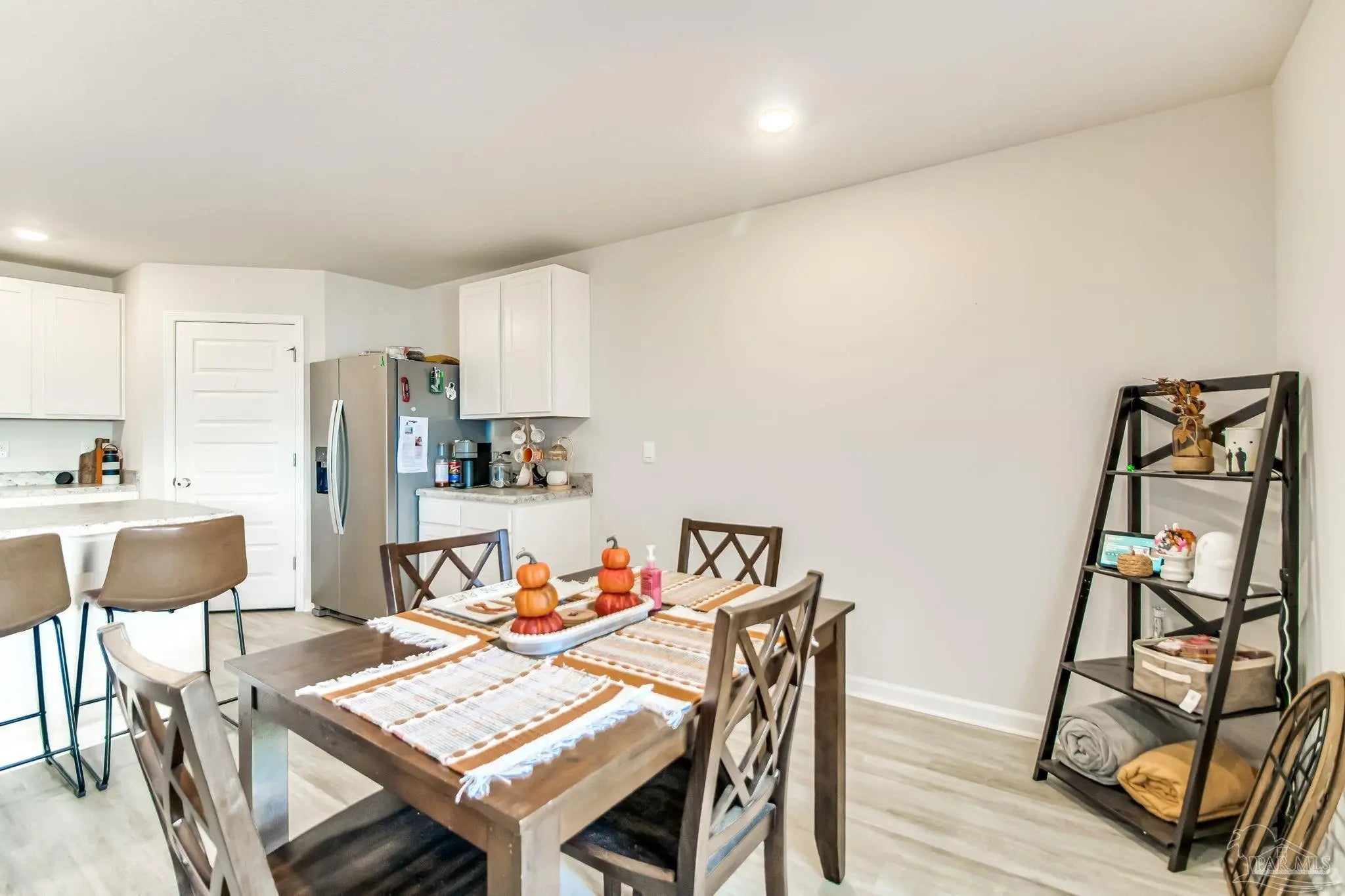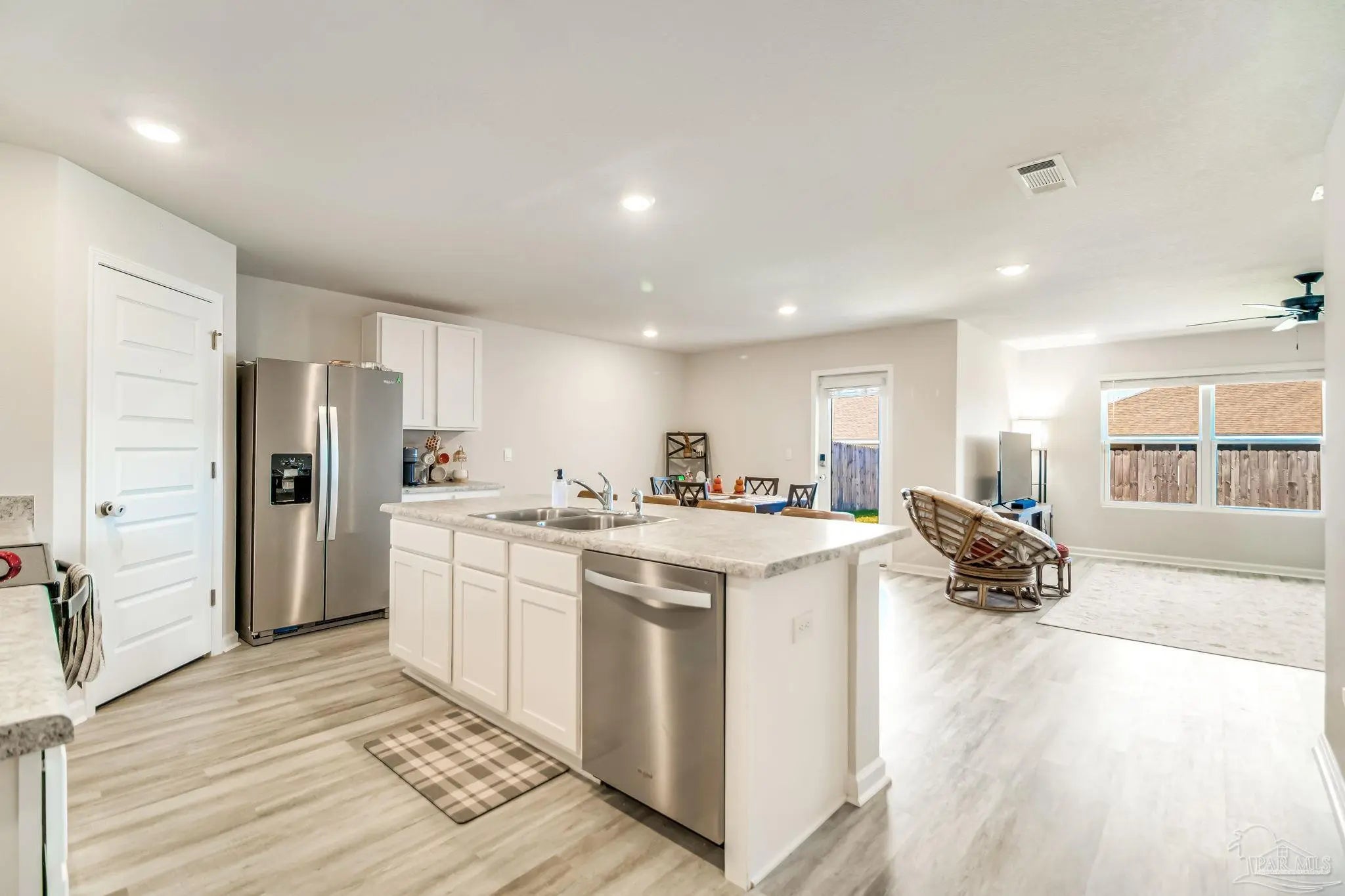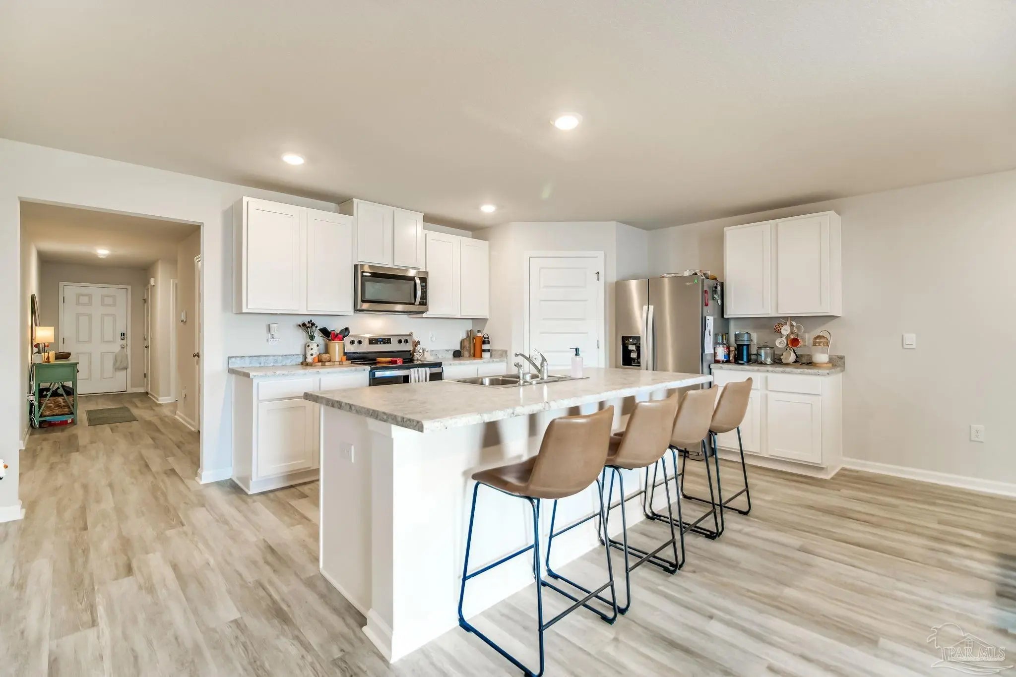 Ideally located in a charming Santa Rosa County neighborhood, this community offers sidewalks, a community park with an interactive splash pad and open green space with covered seating areas. The home features 4 bedrooms, 2 baths, a covered patio, and a 2-car garage. A lovely front entry welcomes you into the foyer and leads down the hall into the light and bright living area. The open kitchen is designed with stainless steel appliances, a spacious island with bar seating, a generously sized pantry and ample counter space. The living area is open to the kitchen and dining space, allowing you to easily interact with guests or relax after a nice meal. The combination living space opens directly to the rear, covered patio, making gatherings that span indoors and outdoors a snap. The primary bedroom, located apart from the 3 additional bedrooms, includes an adjoining bath with a double vanity, large shower, and walk-in closet. The home’s additional bedrooms share a full bath and are oriented at the front of the home, assuring privacy for homeowners, generational living, and guests. The Smart Home features include keyless entry, video doorbell, automated front porch lighting, touch panel to control lighting, thermostat, entry, and more. The neighborhood has an active HOA with monthly activities, weekly food trucks and the opportunity to be involved as much or as little as you would like. At The Woodlands, you’re just a short drive from the Highway 90 corridor with shopping, dining, medical and everyday conveniences AND a short drive to I-10, which is an easy commute East towards Eglin AFB or West to Pensacola. Experience the lifestyle this community has to offer!