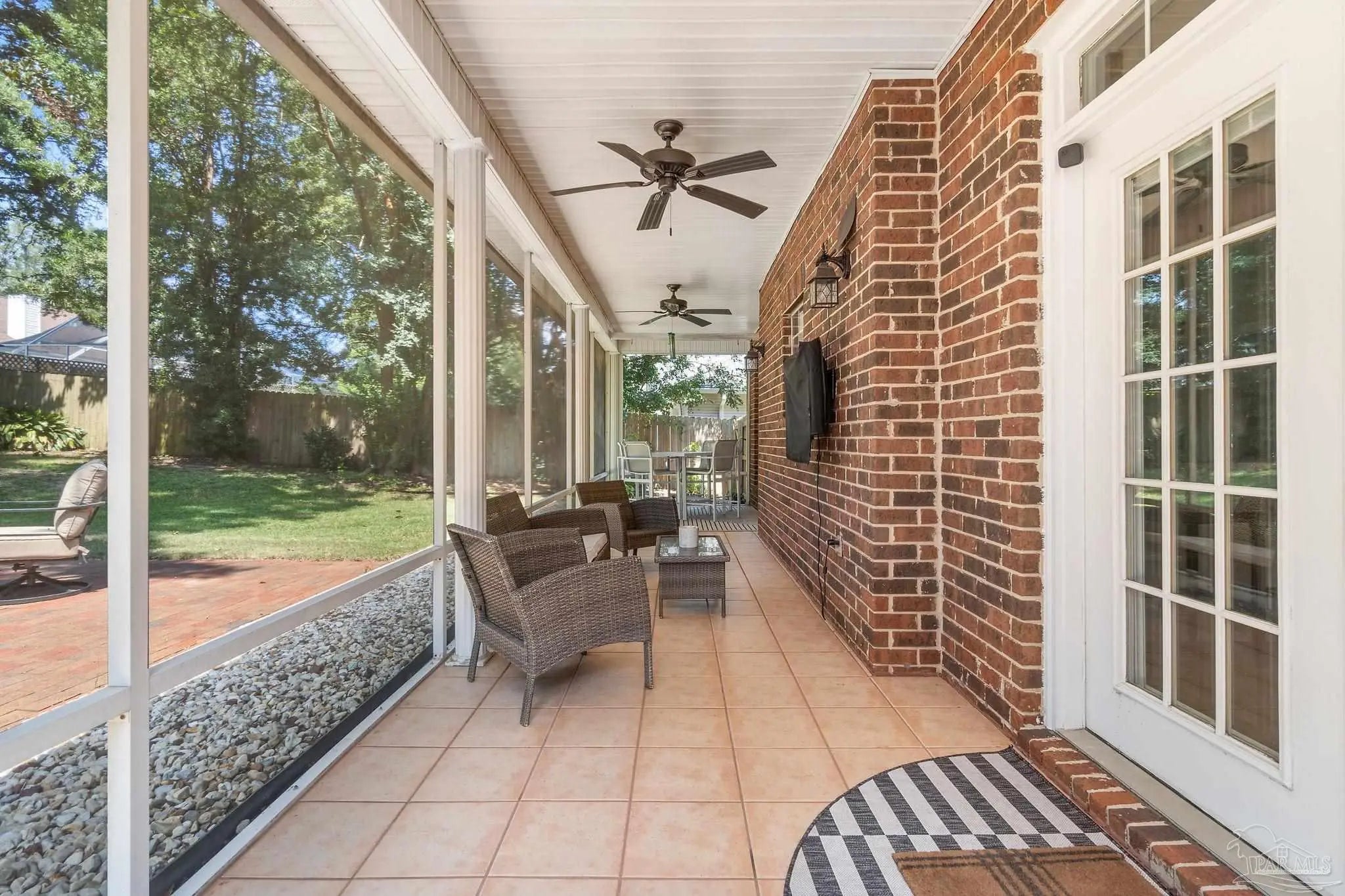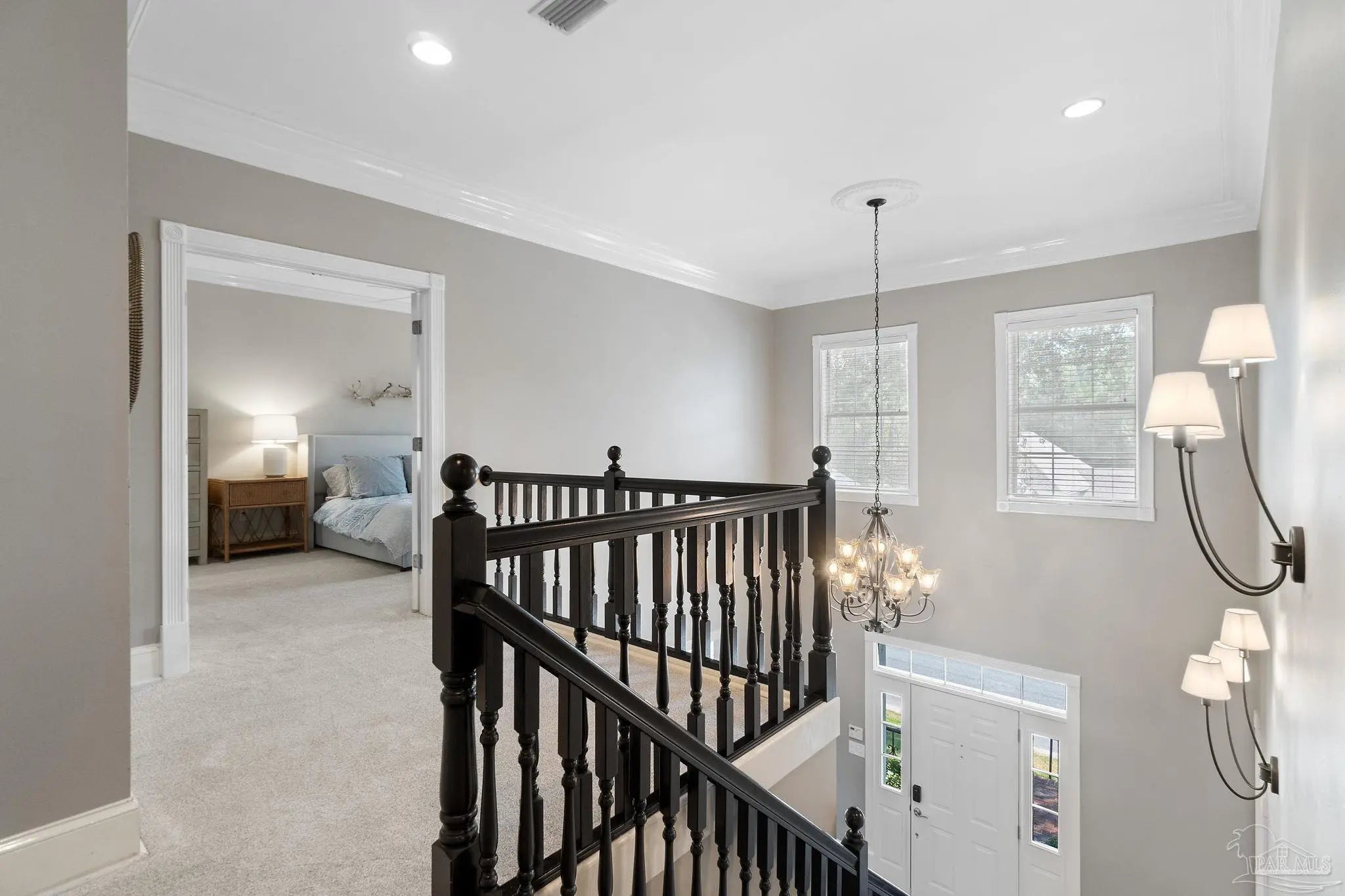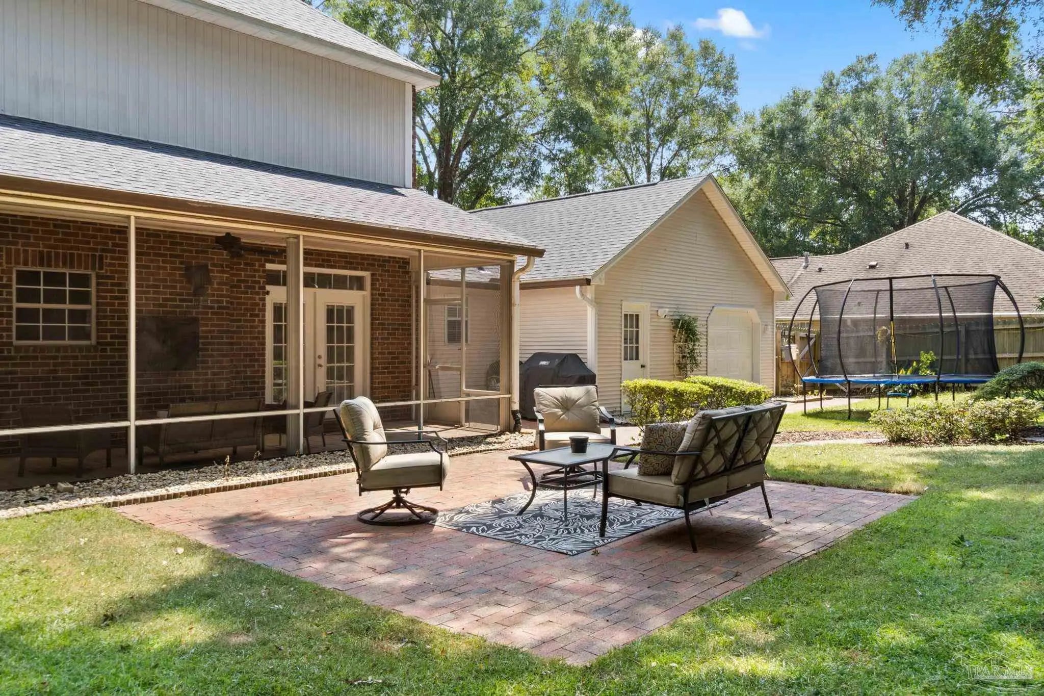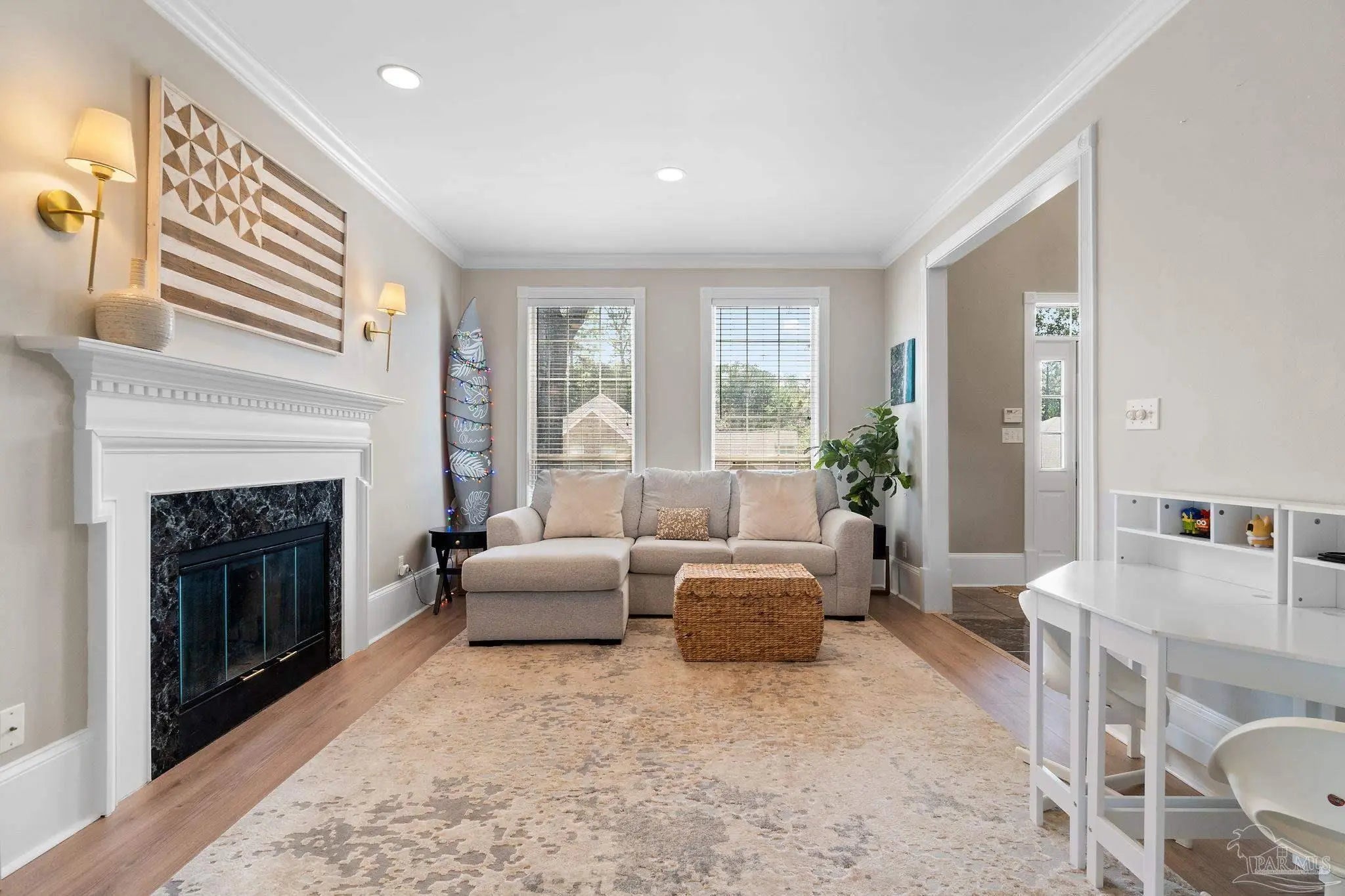 Timeless elegance in this distinguished Colonial residence, gracefully situated in the desirable Marcus Pointe Golf Community. This unique 3-bedroom, 2.5-bath home offers refined living spaces including a formal living, den, office or formal dining room could be used and a guest bedroom, and breakfast area, enhanced by exquisite crown molding, rose motifs, 12-inch baseboards, and two fireplaces for comfort. (1 insert, 1 wood) The grand foyer, accented with marble tile flooring and a sweeping oak staircase, creates a truly impressive entry. A convenient half bath is located just off the foyer for guests. The kitchen is a chef’s delight with solid oak custom cabinetry, granite countertops, a breakfast bar, island with storage, walk-in pantry, and a window overlooking the backyard. Laminate, wood-look flooring and updated finishes add to the sophistication, while double French doors open to a screened porch, seamlessly blending indoor and outdoor living. Upstairs, the spacious primary suite offers a private retreat with a luxurious bath featuring a clawfoot tub, separate shower, double vanity, linen storage, tile flooring, and an expansive walk-in closet. The landing area provides space for a reading nook overlooking the grand entry, while two additional bedrooms share a full hall bath. Outdoors, enjoy the tranquil backyard with a screened porch, paver patio, firepit with seating, and a charming wooden bridge surrounded by mature landscaping and an irrigation system. A two-car garage with a rear roll-up door provides additional convenience for storage or lawn equipment. Residents of Marcus Pointe enjoy golf cart access to the clubhouse for dining and recreation, as well as a lifestyle defined by leisure and community. Ideally located just off I-10, this property offers both elegance and convenience, placing you within easy reach of all that Pensacola has to offer. Roof 2023, HVAC 2023/2024, Carpet replaced 2024.