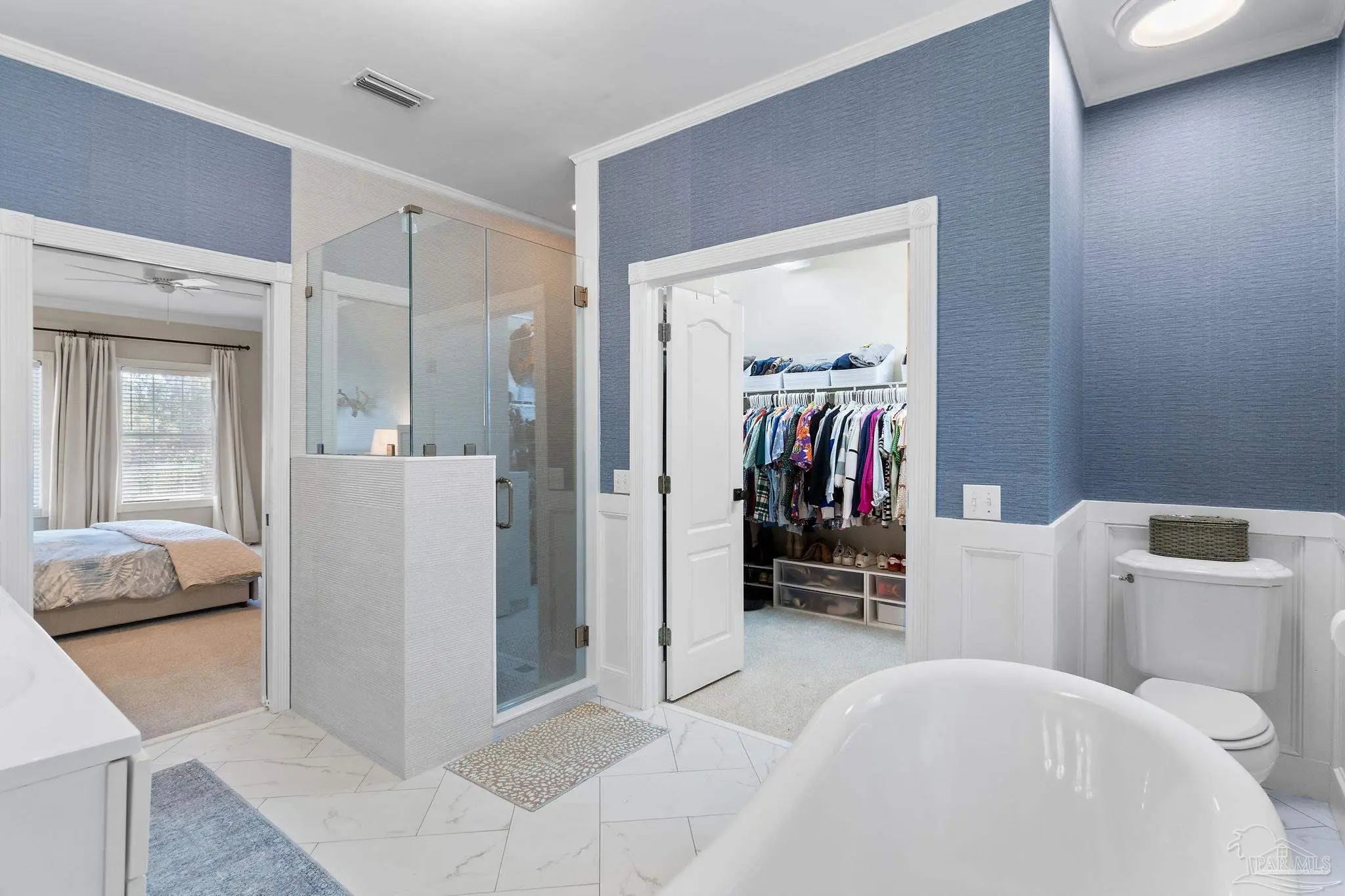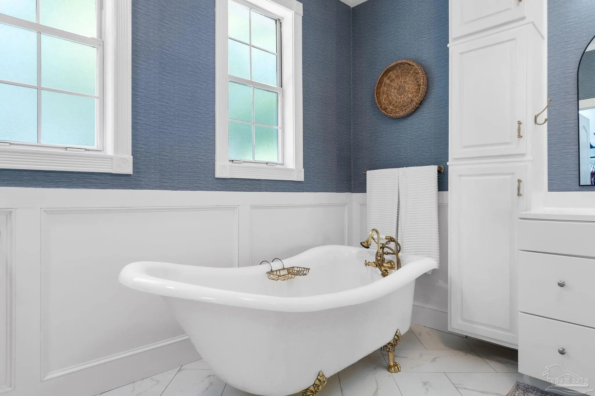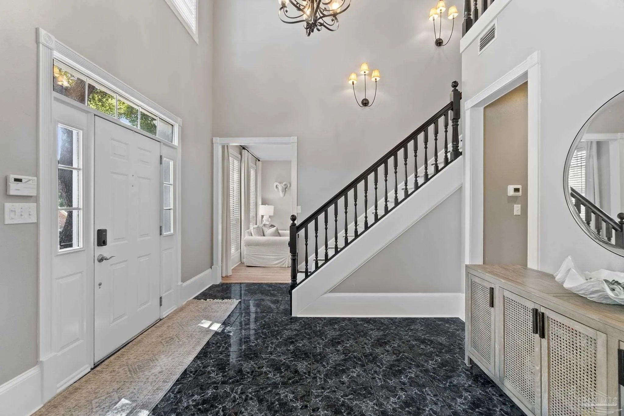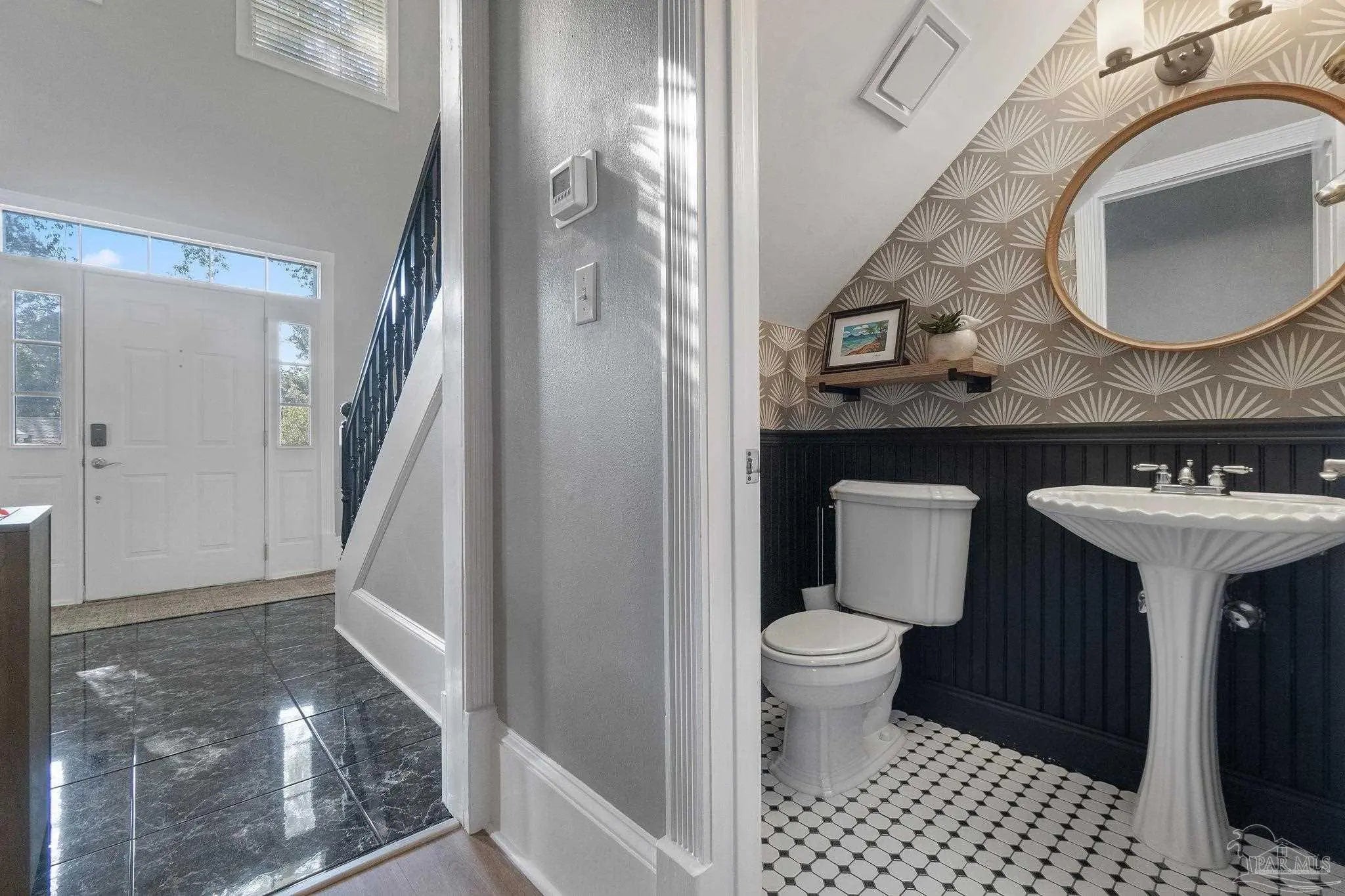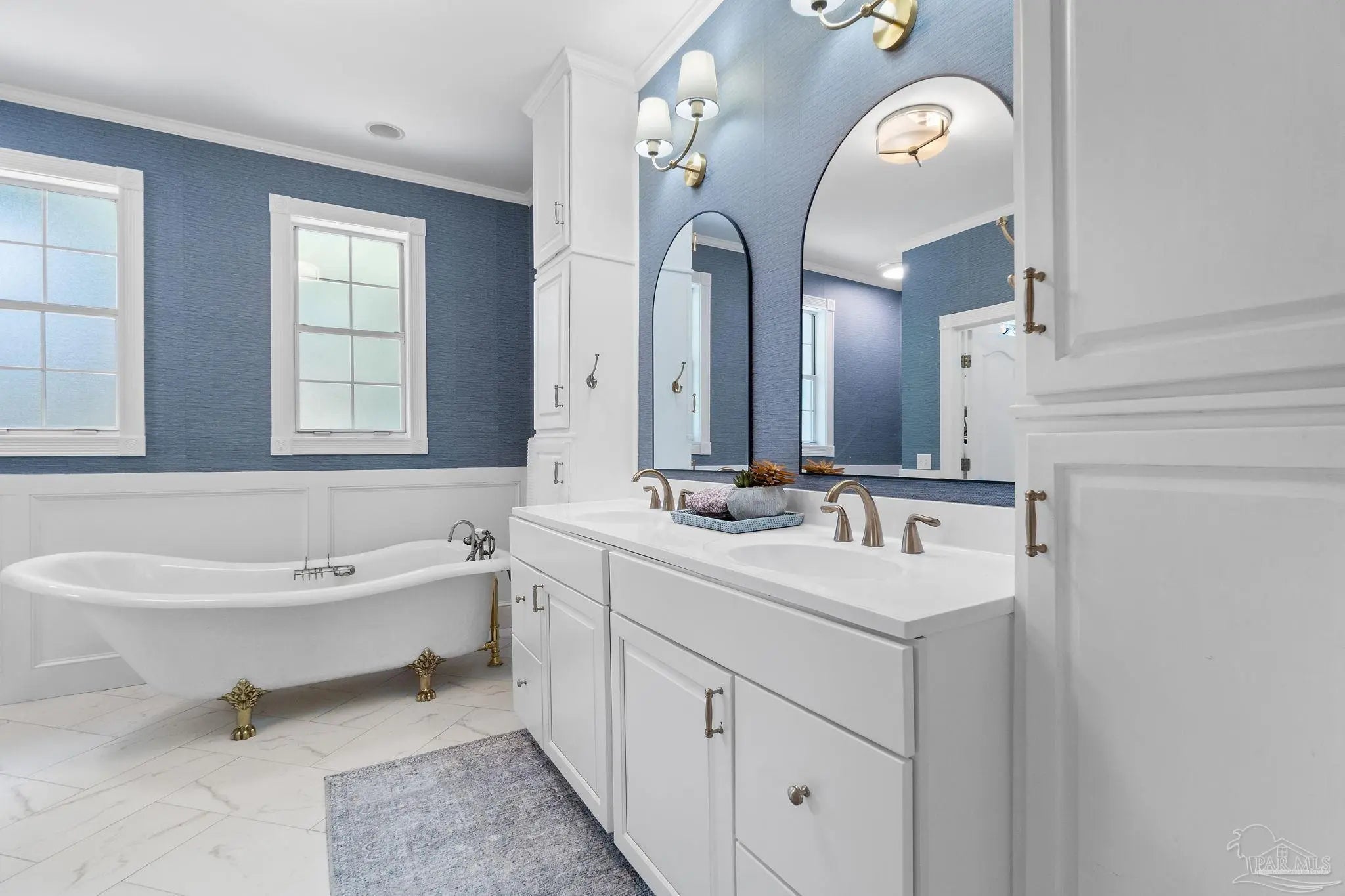 Timeless elegance in this distinguished Colonial residence, gracefully situated in the desirable Marcus Pointe Golf Community. This unique 3-bedroom, 2.5-bath home offers refined living spaces including a formal living, den, office or formal dining room could be used and a guest bedroom, and breakfast area, enhanced by exquisite crown molding, rose motifs, 12-inch baseboards, and two fireplaces for comfort. (1 insert, 1 wood) The grand foyer, accented with marble tile flooring and a sweeping oak staircase, creates a truly impressive entry. A convenient half bath is located just off the foyer for guests. The kitchen is a chef’s delight with solid oak custom cabinetry, granite countertops, a breakfast bar, island with storage, walk-in pantry, and a window overlooking the backyard. Laminate, wood-look flooring and updated finishes add to the sophistication, while double French doors open to a screened porch, seamlessly blending indoor and outdoor living. Upstairs, the spacious primary suite offers a private retreat with a luxurious bath featuring a clawfoot tub, separate shower, double vanity, linen storage, tile flooring, and an expansive walk-in closet. The landing area provides space for a reading nook overlooking the grand entry, while two additional bedrooms share a full hall bath. Outdoors, enjoy the tranquil backyard with a screened porch, paver patio, firepit with seating, and a charming wooden bridge surrounded by mature landscaping and an irrigation system. A two-car garage with a rear roll-up door provides additional convenience for storage or lawn equipment. Residents of Marcus Pointe enjoy golf cart access to the clubhouse for dining and recreation, as well as a lifestyle defined by leisure and community. Ideally located just off I-10, this property offers both elegance and convenience, placing you within easy reach of all that Pensacola has to offer. Roof 2023, HVAC 2023/2024, Carpet replaced 2024.