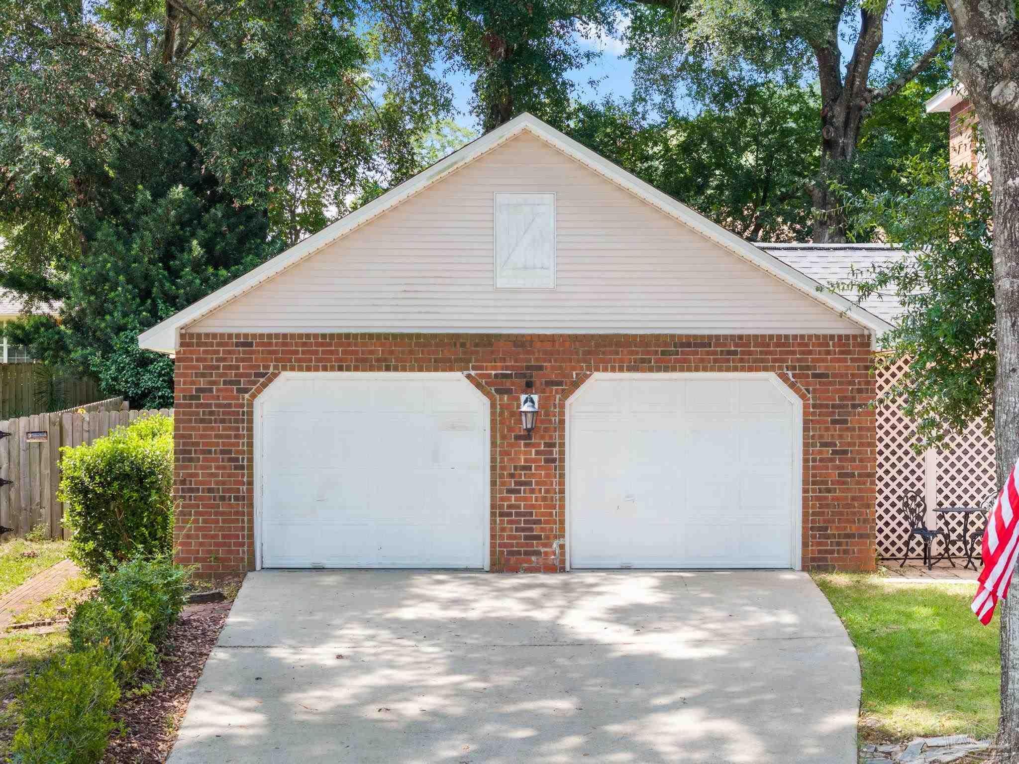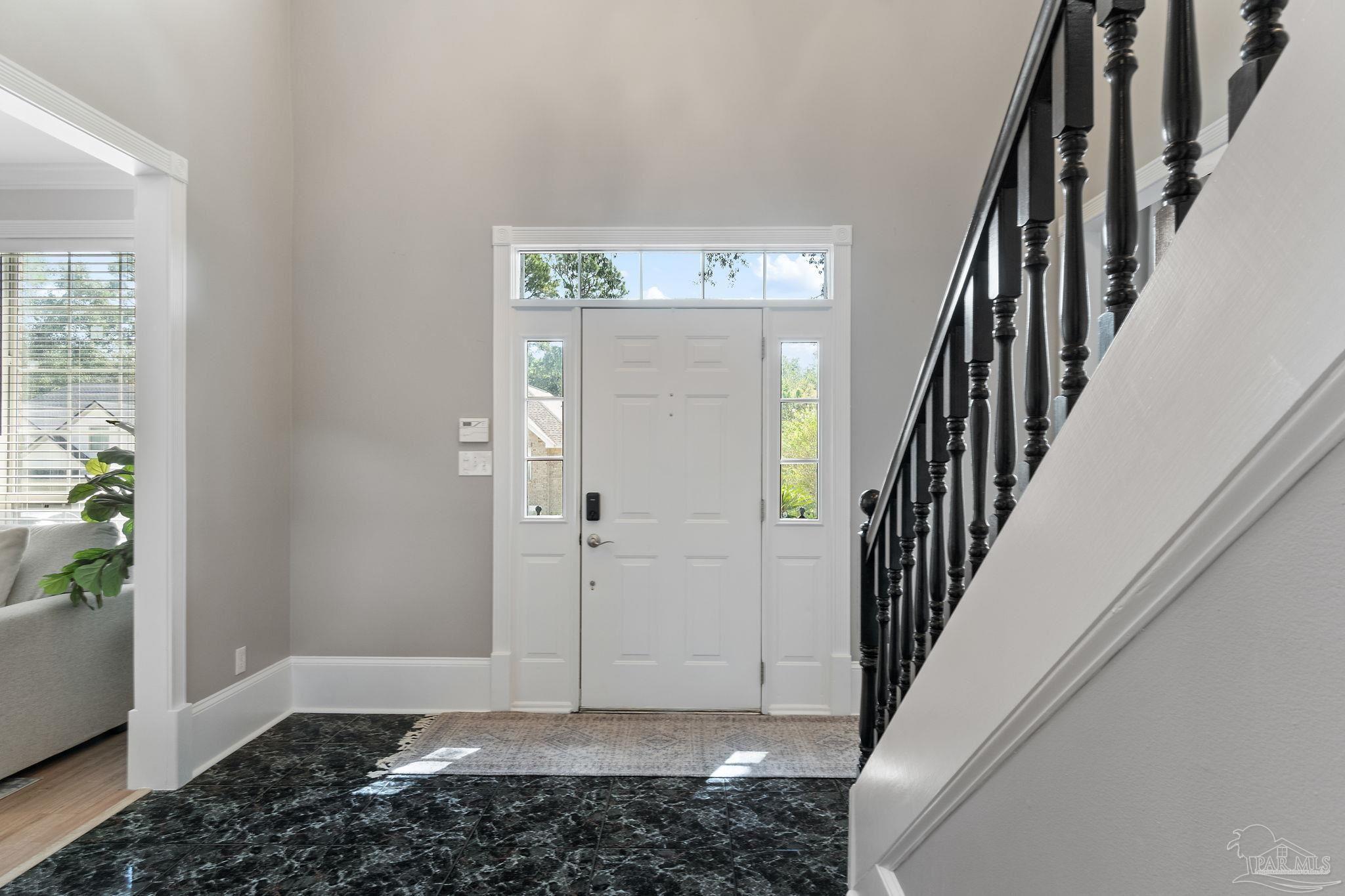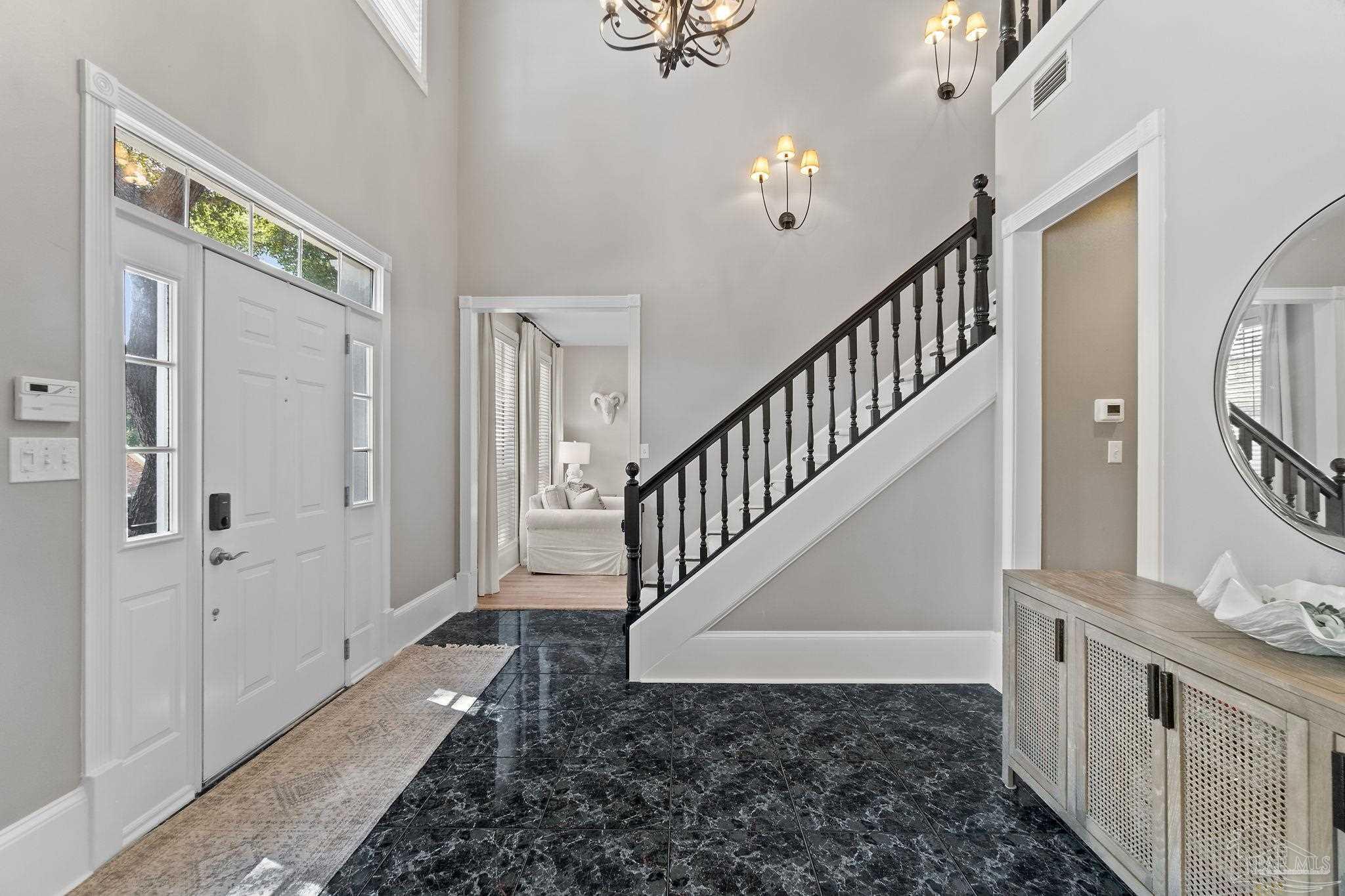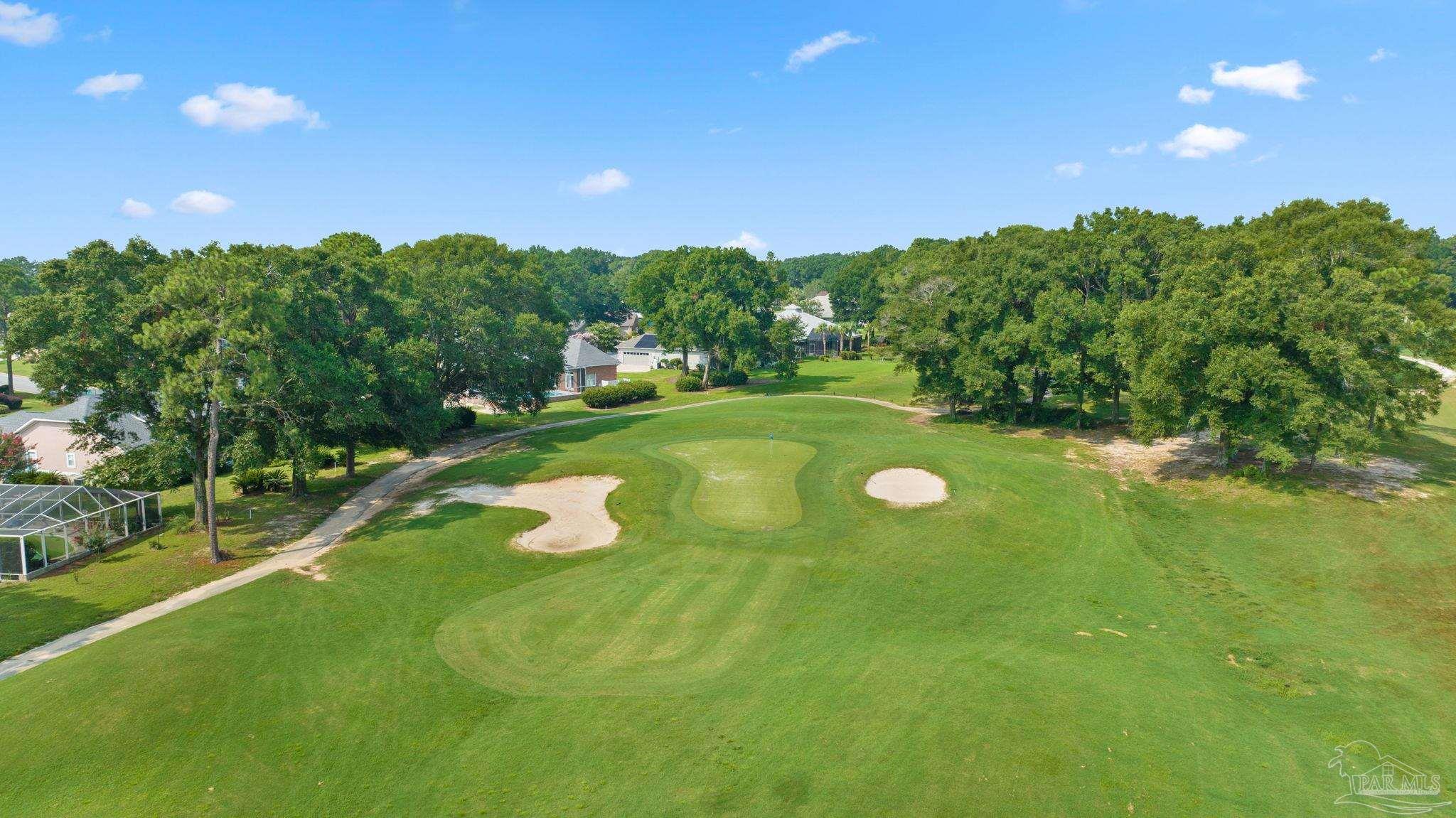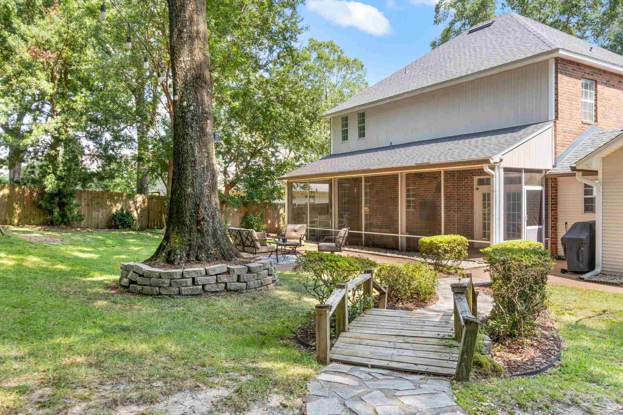 **OPEN HOUSE SATURDAY 10/25 @ 10-1!** Experience timeless elegance in this distinguished Colonial residence, gracefully situated in the desirable Marcus Pointe Golf Community. This unique 3-bedroom, 2.5-bath home offers refined living spaces including a formal living, den, office or formal dining room could be used and a guest bedroom, and breakfast area, enhanced by exquisite crown molding, rose motifs, 12-inch baseboards, and two fireplaces for comfort. (1 insert, 1 wood) The grand foyer, accented with marble tile flooring and a sweeping oak staircase, creates a truly impressive entry. A convenient half bath is located just off the foyer for guests. The kitchen is a chef’s delight with solid oak custom cabinetry, granite countertops, a breakfast bar, island with storage, walk-in pantry, and a window overlooking the backyard. Laminate, wood-look flooring and updated finishes add to the sophistication, while double French doors open to a screened porch, seamlessly blending indoor and outdoor living. Upstairs, the spacious primary suite offers a private retreat with a luxurious bath featuring a clawfoot tub, separate shower, double vanity, linen storage, tile flooring, and an expansive walk-in closet. The landing area provides space for a reading nook overlooking the grand entry, while two additional bedrooms share a full hall bath. Outdoors, enjoy the tranquil backyard with a screened porch, paver patio, firepit with seating, and a charming wooden bridge surrounded by mature landscaping and an irrigation system. A two-car garage with a rear roll-up door provides additional convenience for storage or lawn equipment. Residents of Marcus Pointe enjoy golf cart access to the clubhouse for dining and recreation, as well as a lifestyle defined by leisure and community. Ideally located just off I-10, this property offers both elegance and convenience, placing you within easy reach of all that Pensacola has to offer. Roof 2023, HVAC 2023/2024, Carpet replaced 2024.