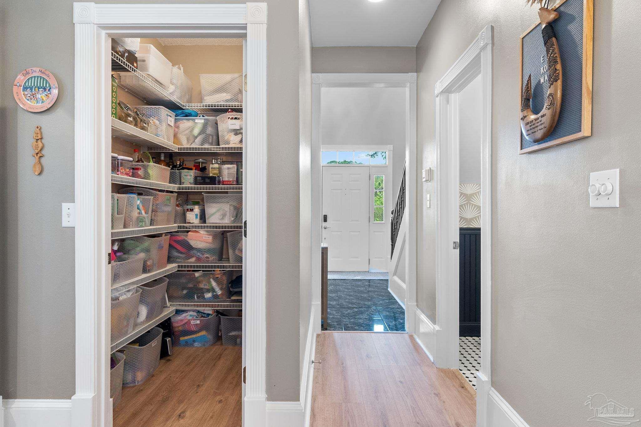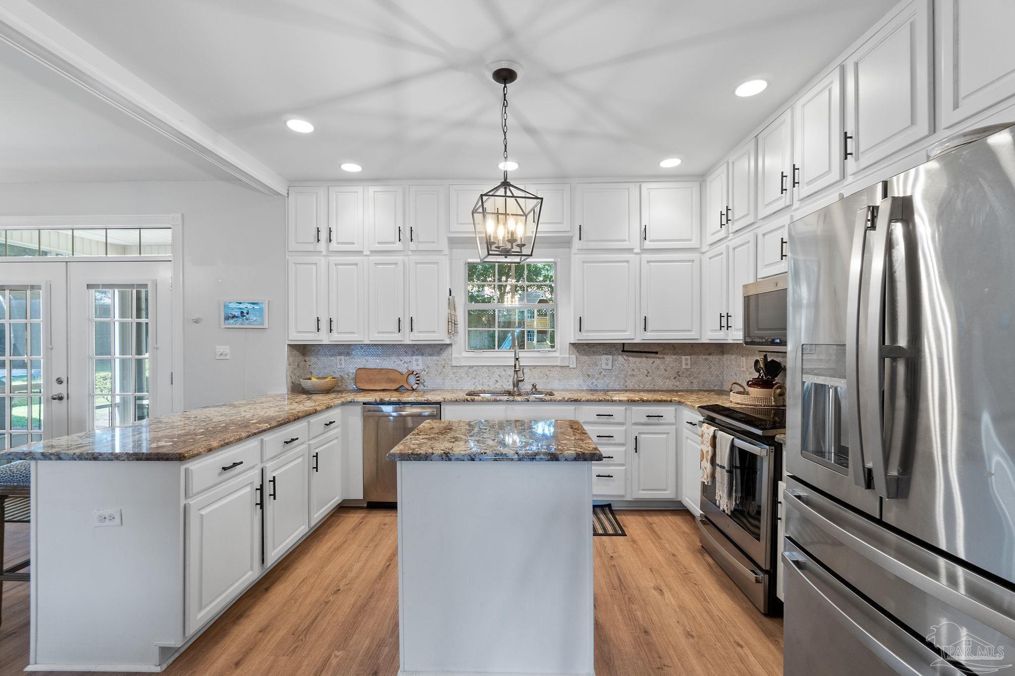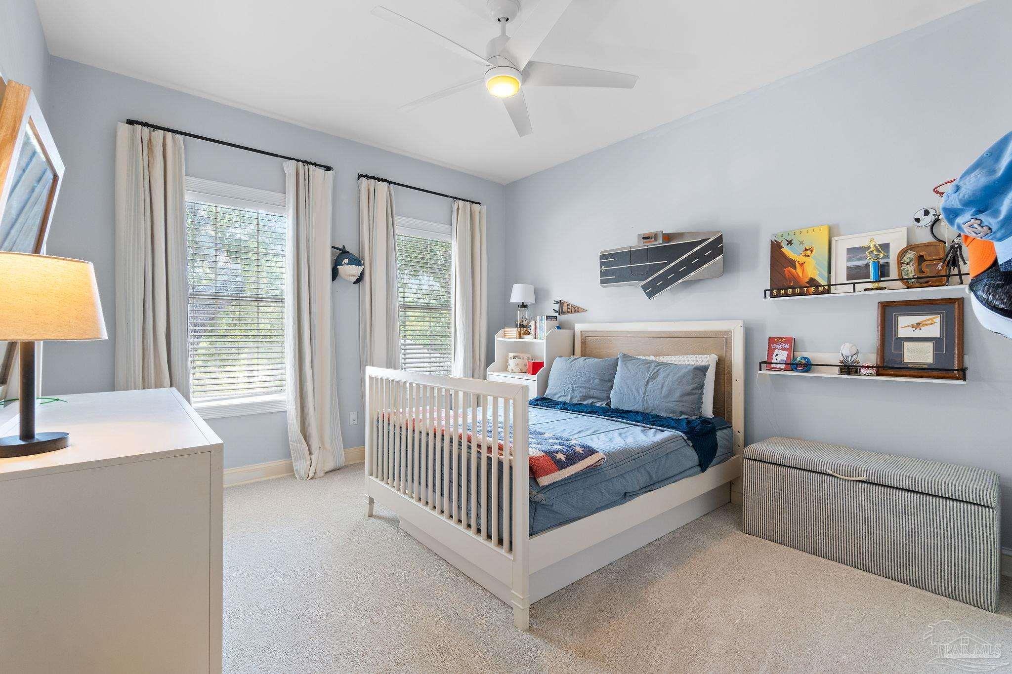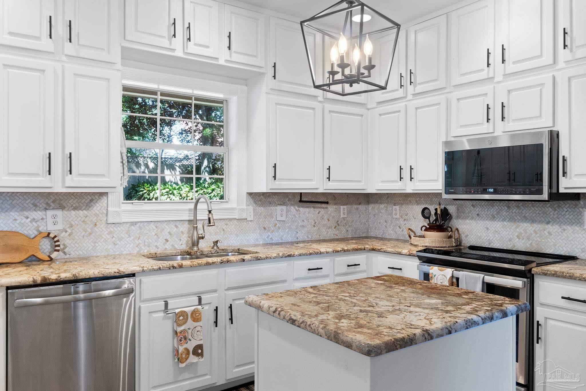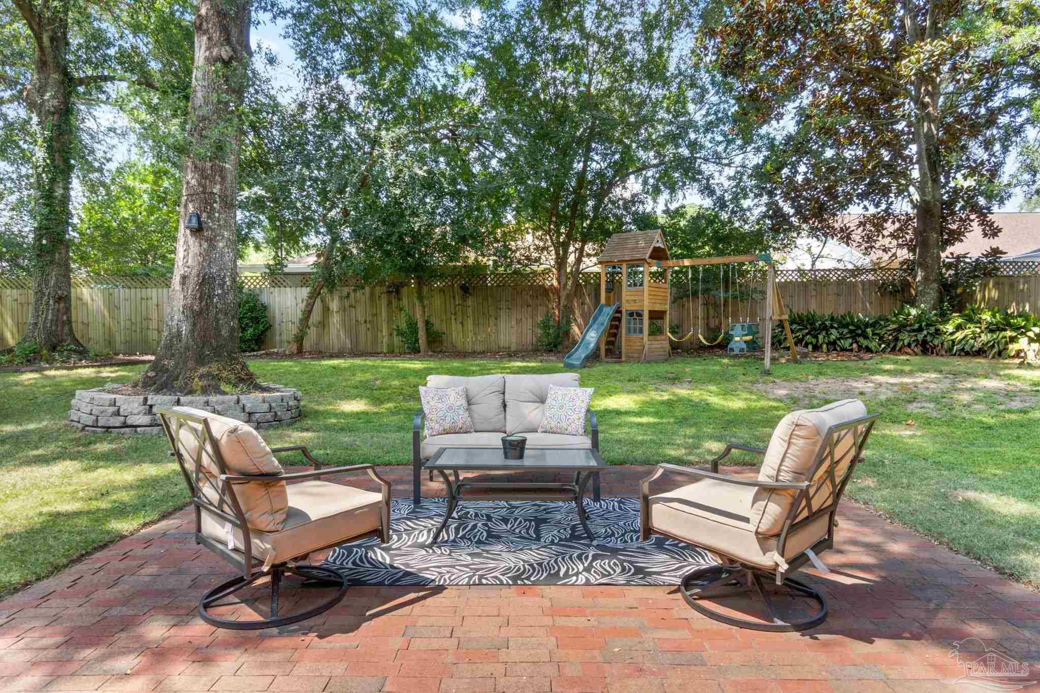 **OPEN HOUSE SATURDAY 10/25 @ 10-1!** Experience timeless elegance in this distinguished Colonial residence, gracefully situated in the desirable Marcus Pointe Golf Community. This unique 3-bedroom, 2.5-bath home offers refined living spaces including a formal living, den, office or formal dining room could be used and a guest bedroom, and breakfast area, enhanced by exquisite crown molding, rose motifs, 12-inch baseboards, and two fireplaces for comfort. (1 insert, 1 wood) The grand foyer, accented with marble tile flooring and a sweeping oak staircase, creates a truly impressive entry. A convenient half bath is located just off the foyer for guests. The kitchen is a chef’s delight with solid oak custom cabinetry, granite countertops, a breakfast bar, island with storage, walk-in pantry, and a window overlooking the backyard. Laminate, wood-look flooring and updated finishes add to the sophistication, while double French doors open to a screened porch, seamlessly blending indoor and outdoor living. Upstairs, the spacious primary suite offers a private retreat with a luxurious bath featuring a clawfoot tub, separate shower, double vanity, linen storage, tile flooring, and an expansive walk-in closet. The landing area provides space for a reading nook overlooking the grand entry, while two additional bedrooms share a full hall bath. Outdoors, enjoy the tranquil backyard with a screened porch, paver patio, firepit with seating, and a charming wooden bridge surrounded by mature landscaping and an irrigation system. A two-car garage with a rear roll-up door provides additional convenience for storage or lawn equipment. Residents of Marcus Pointe enjoy golf cart access to the clubhouse for dining and recreation, as well as a lifestyle defined by leisure and community. Ideally located just off I-10, this property offers both elegance and convenience, placing you within easy reach of all that Pensacola has to offer. Roof 2023, HVAC 2023/2024, Carpet replaced 2024.
