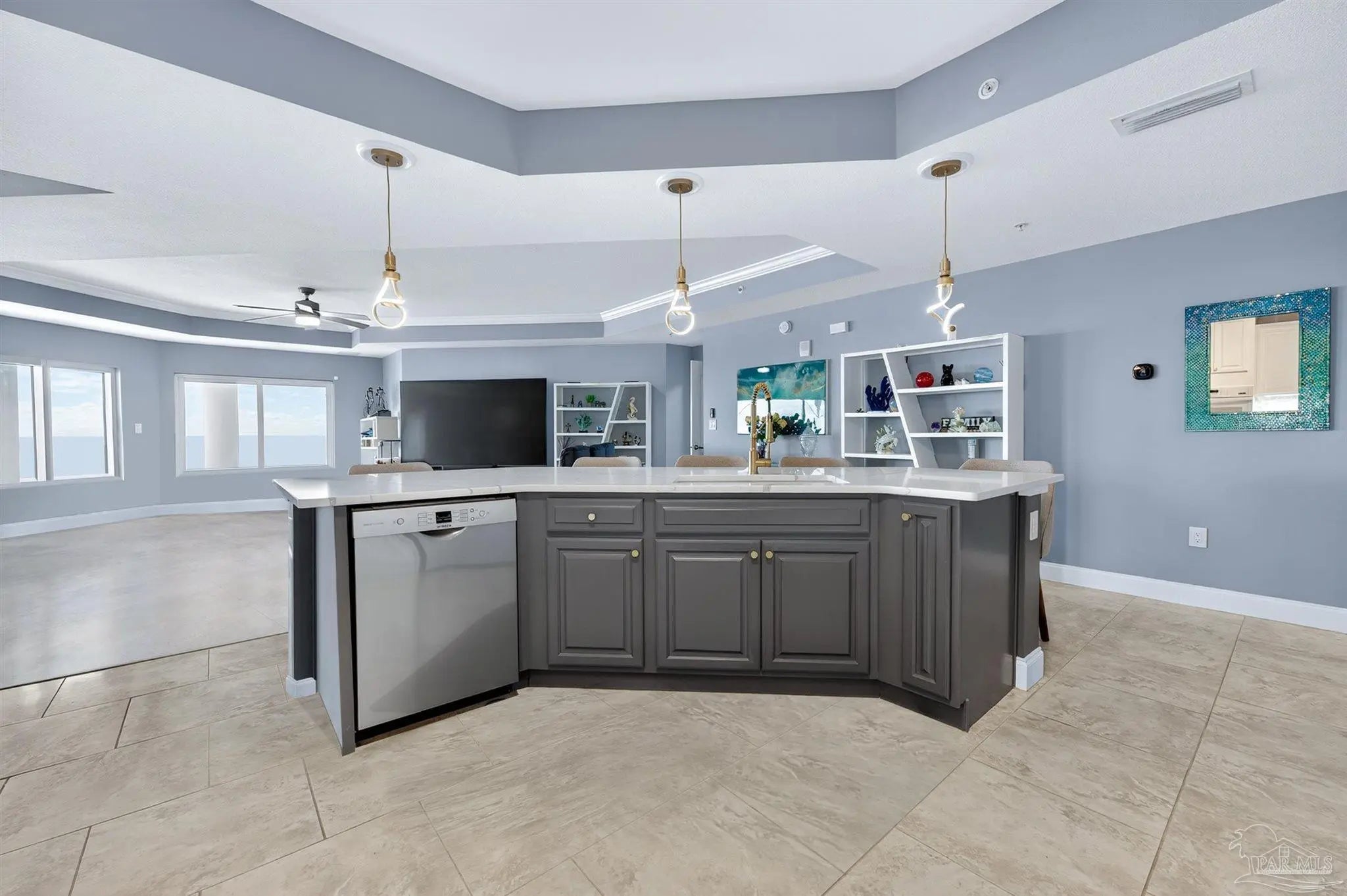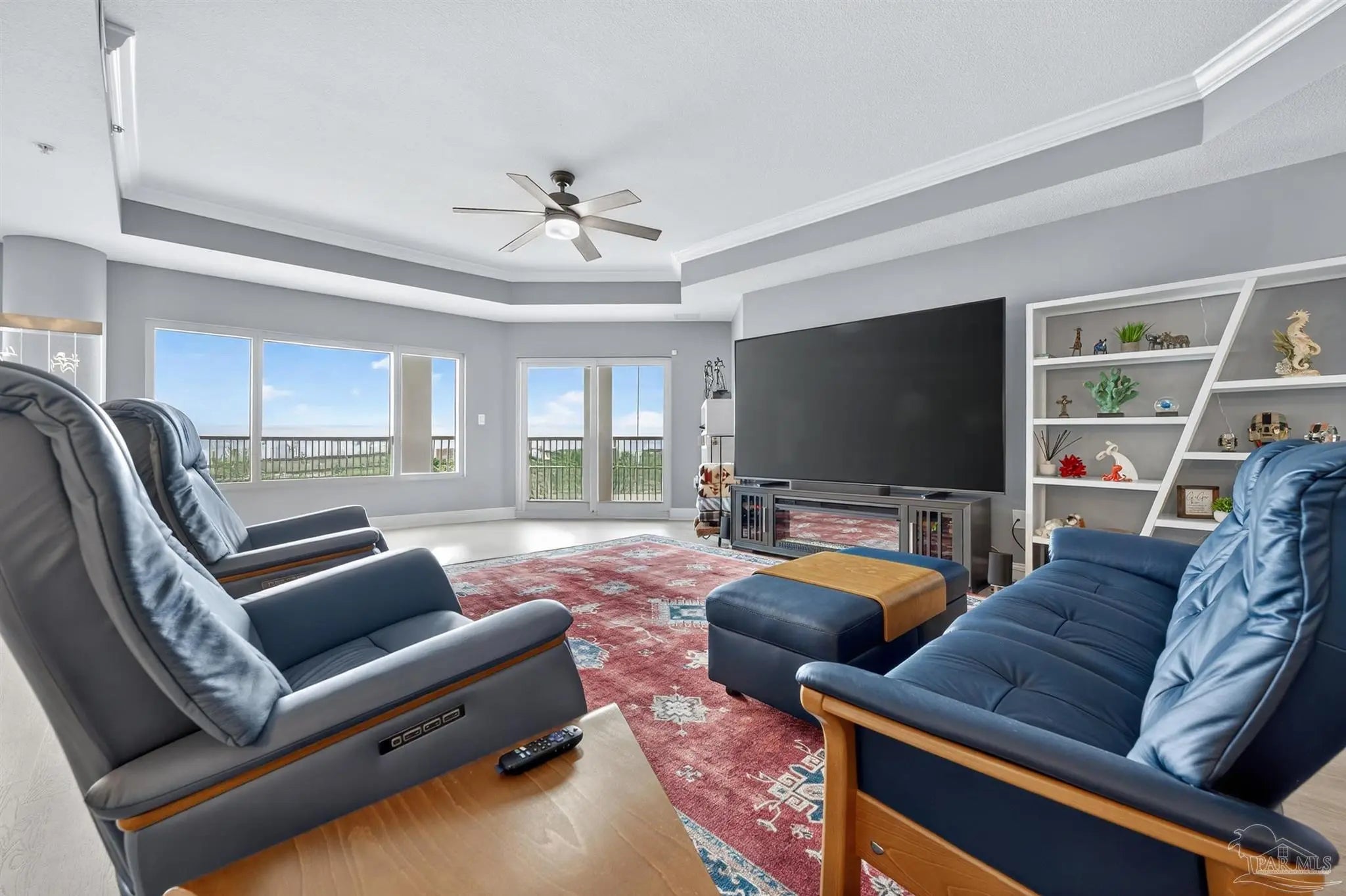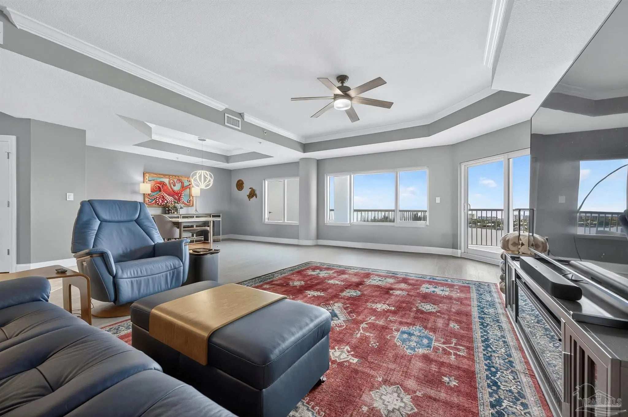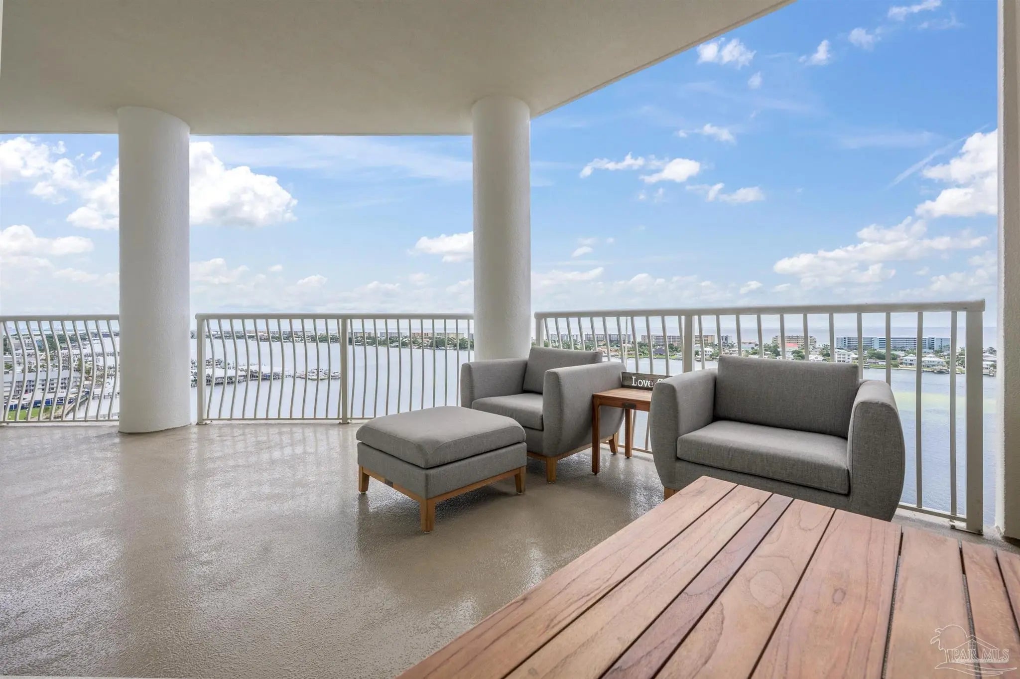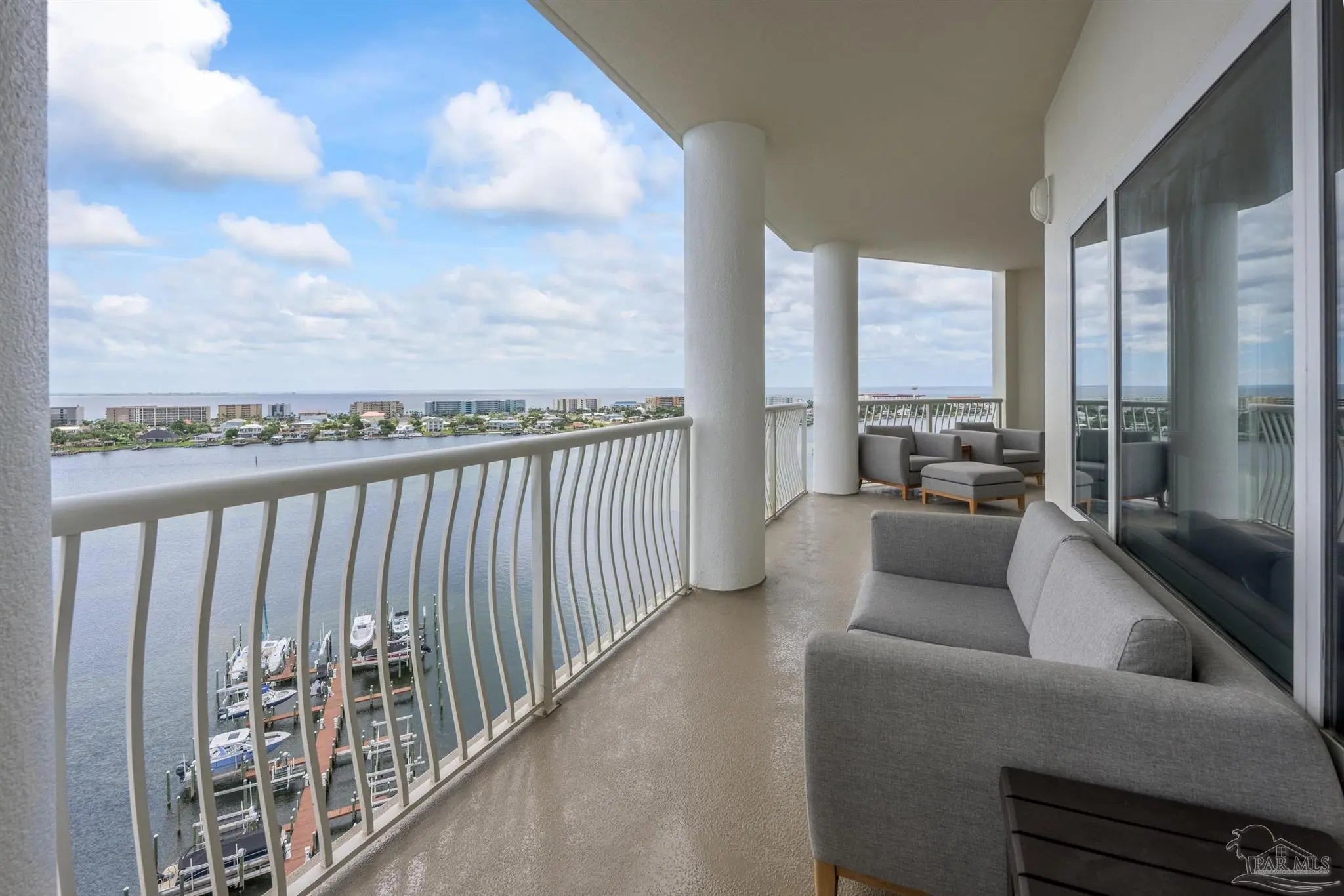 Come experience luxury living at Presidio Yacht Club, one of Fort Walton Beach’s most prestigious waterfront communities! Presidio offers high-end amenities including a pool and hot tub, marina, dock for fishing, theater room, owners’ community lounge, fitness center overlooking the water, and a guest quarters for visitors. This beautifully updated condo offers fresh paint, new flooring, a renovated bathroom and updated kitchen, creating a home that truly shines. Step onto the expansive balcony and take in breathtaking 180-degree views of the Santa Rosa Sound, Gulf, and Choctawhatchee bay. A rare feature of this unit is two deeded parking spaces located in the gated, covered garage and a storage closet just across the hall from the front door! Inside, the open living area boasts elegant tray ceilings and crown molding, with a wall of windows framing the gorgeous water views. The spacious kitchen is designed for both function and style, featuring abundant cabinetry, a large island with breakfast bar, pantry, updated appliances, and stylish lighting. Just off the kitchen, a dining area provides the perfect spot for everyday meals or entertaining. The split primary suite offers ample space for a sitting area and direct balcony access. Its spa-like en suite includes a jetted tub, separate walk-in shower, dual vanities, a private water closet, and a generous walk-in closet with custom wood shelving. Each guest bedroom enjoys its own en suite bathroom, both recently updated with new tile, vanities, mirrors, and lighting. One features a brand new tiled standing shower. The two guest bedrooms are thoughtfully placed at the front of the unit, each offering privacy and comfort. From sunrise to sunset, this residence delivers the perfect balance of luxury and waterfront serenity!