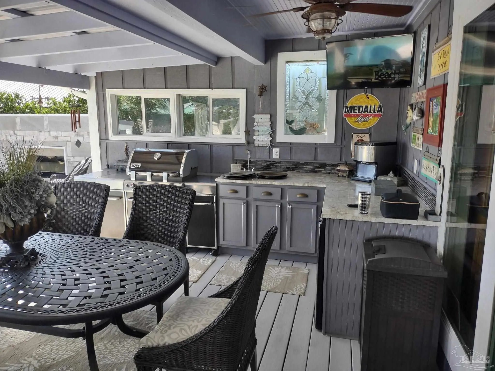 Boat Slip + Pool Home | No Flooding History | 80’ Protected Canal | Turnkey Furnished *Enjoy effortless waterfront living on sought-after Marina Road. This beautifully remodeled and expanded home offers 80 feet of protected canal frontage with a private boat slip—perfect for coastal living. *Designed for comfort and peace of mind, the home has remained high and dry through major storms including Opal, Ivan, and Sally. No pilings, steps, or stairs, provides true single-level living with easy access throughout. *An impressive 8-foot entry door opens to a welcoming foyer and dedicated dining area with porcelain tile flooring. The home features 5 spacious bedrooms, 2 full baths, 10-foot ceilings, crown molding, and abundant natural light & Southern Exposure The expansive 37’ x 16’ great room is ideal for entertaining, complete with a custom bar, ice maker, refrigerator, wet bar, and extensive cabinetry. The chef’s kitchen includes GE Monogram and Café appliances, double-drawer dishwasher and refrigerator, built-in oven, microwave, and cooktop. *The primary suite offers a large walk-in closet with custom built-ins and a spa-like bath with double vanity and clawfoot tub. A flexible bonus room (10’ x 12’) can serve as an office, media room, or 6th bedroom. *Outdoor living shines with a 41’ x 15’ covered porch, full outdoor kitchen, multiple dining areas, saltwater pool with tanning ledge, fireplace, and conversation pit. Fenced backyard includes an irrigation well system. *1,400 sq ft climate-controlled Garage fits 3+ vehicles, golf cart storage, built-ins, and a floored attic. *Additional features include Hurricane-rated windows and doors, generator transfer switch, and upgrades throughout. Offered turnkey furnished (with exceptions). Buyer to verify all information during due diligence.