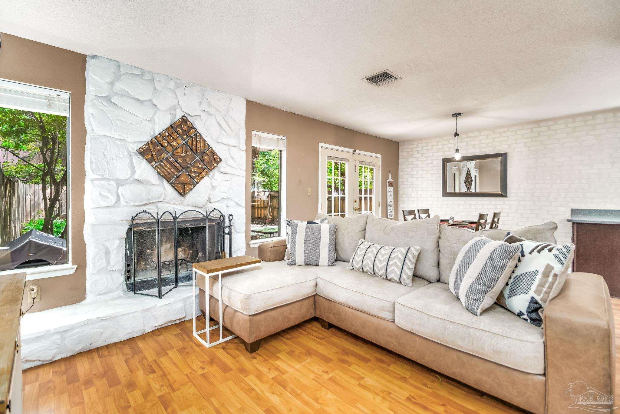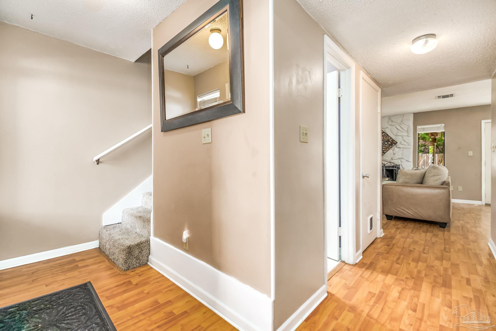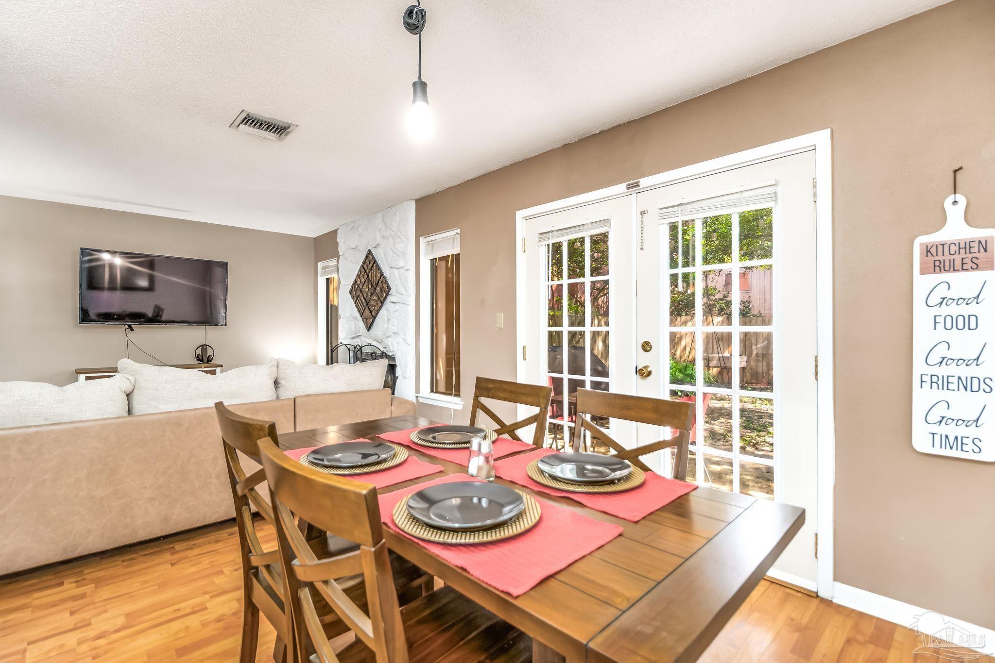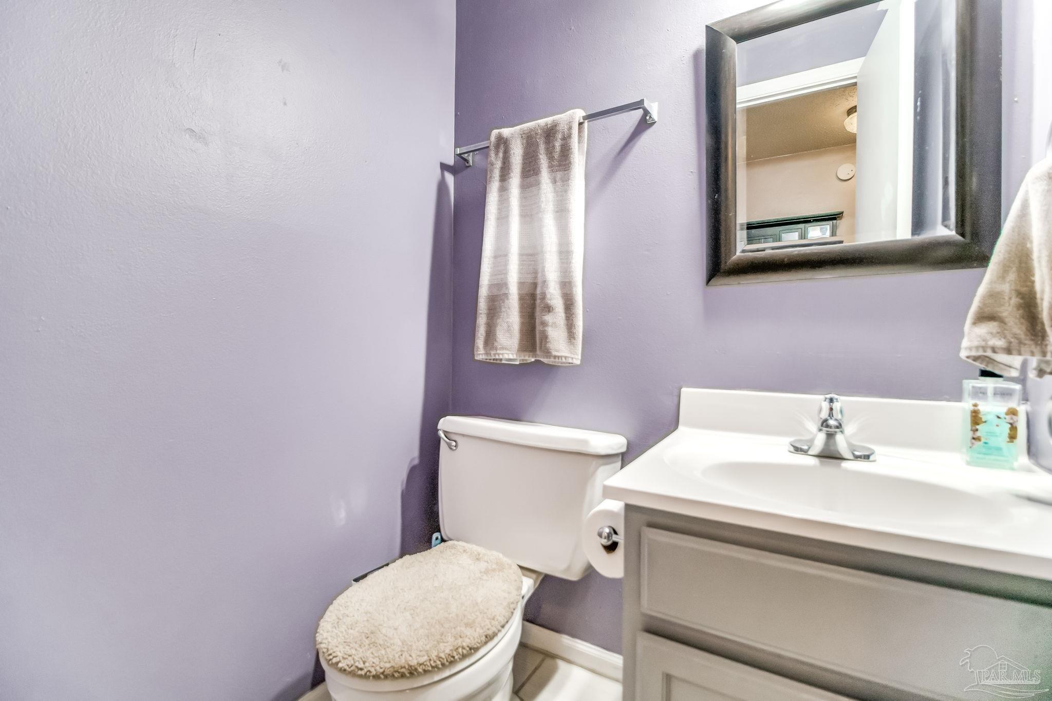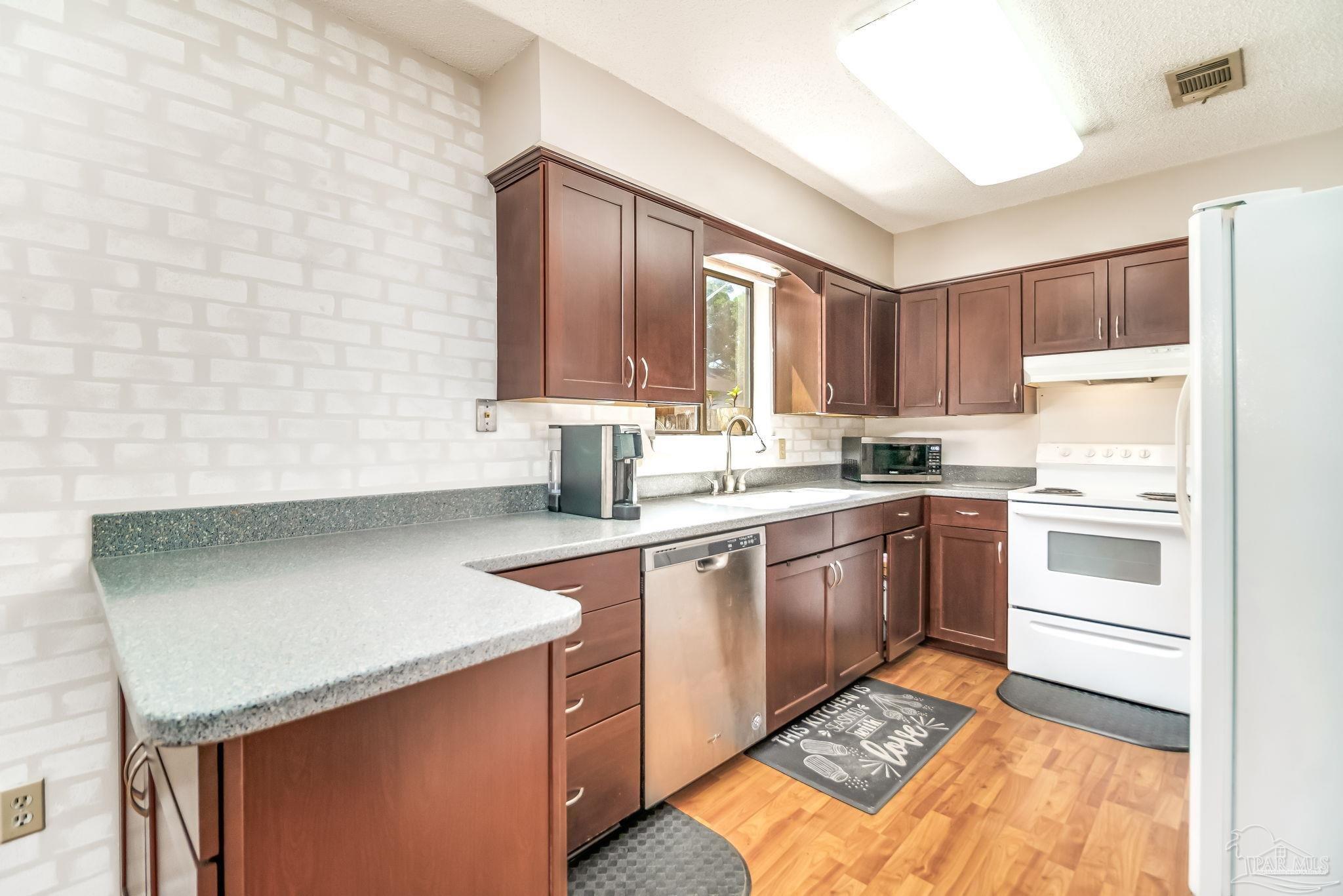 Adorable 3 bedroom 1 & 1/2 Bath Townhome in the heart of Northeast Pensacola! 1/2 bath downstairs. Wood burning fireplace in Great Room . Cherry cabinetry and corian countertops in the kitchen ~Laminate wood flooring downstairs~ Carpet in bedrooms and on stairs. Primary suite bedroom has a walk-in closet. Front and rear balconies for outside lounging. Single car garage. Full roof replacement in 2020. Very nice size backyard has privacy fenced and a storage building.