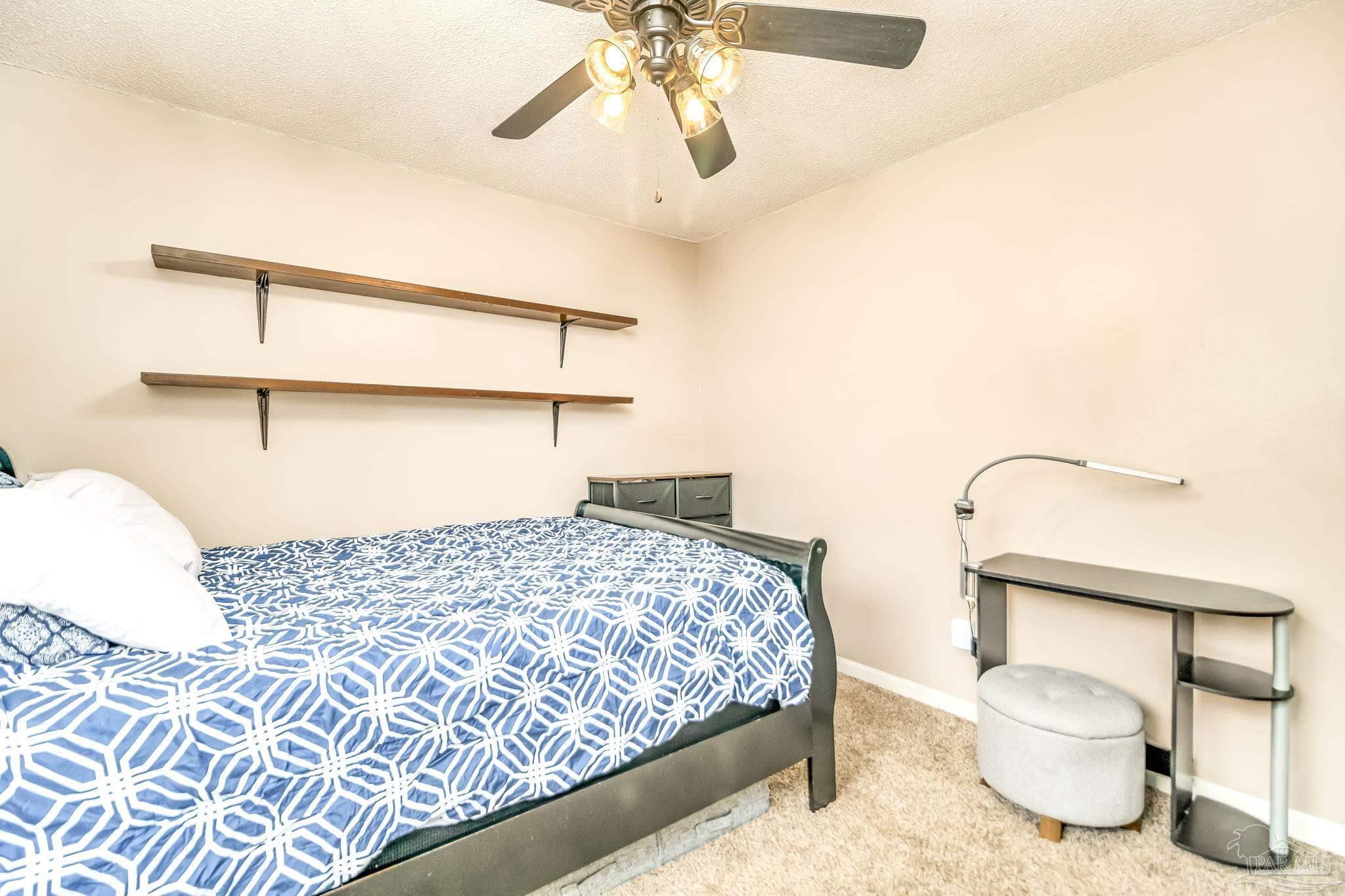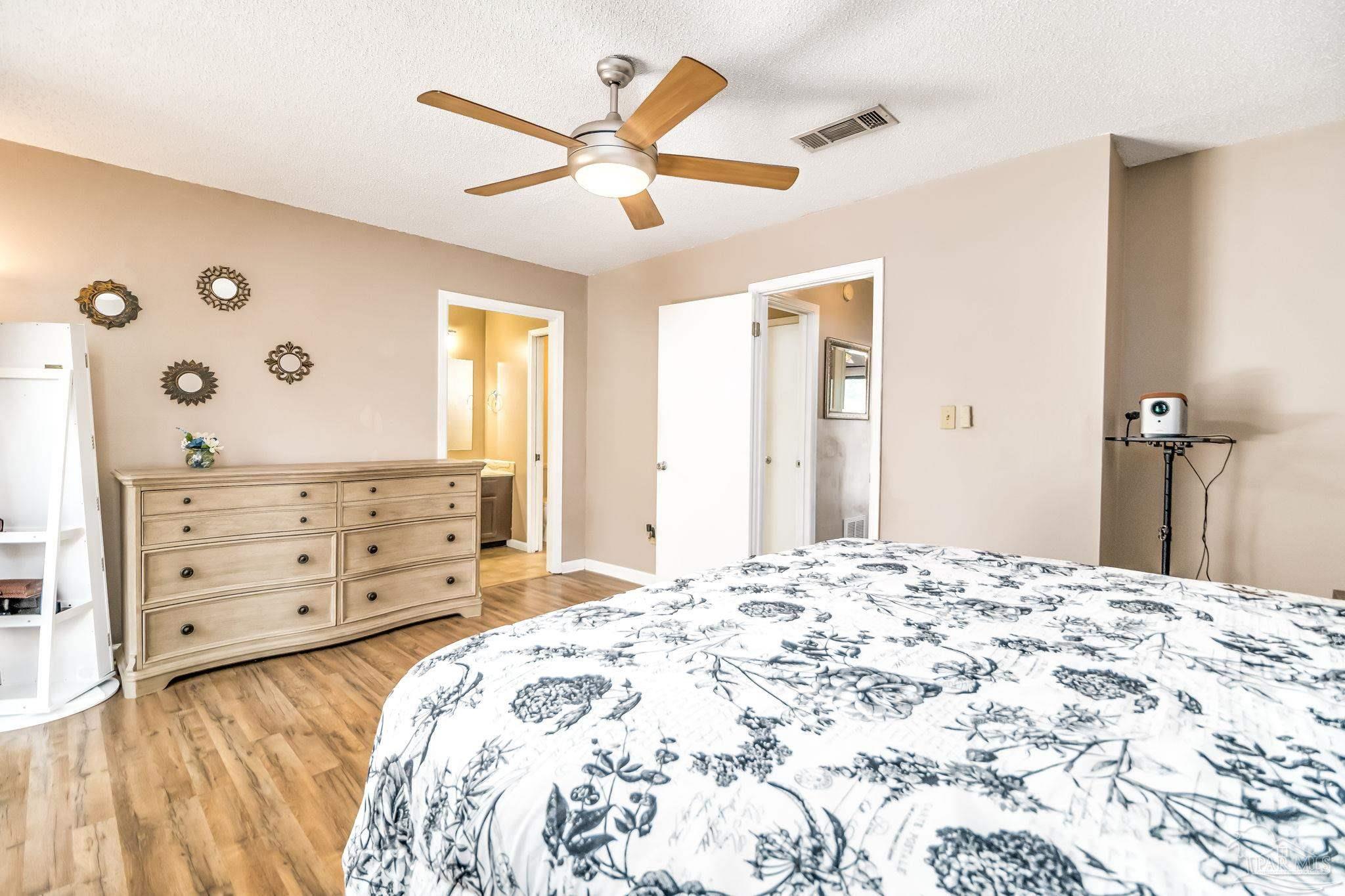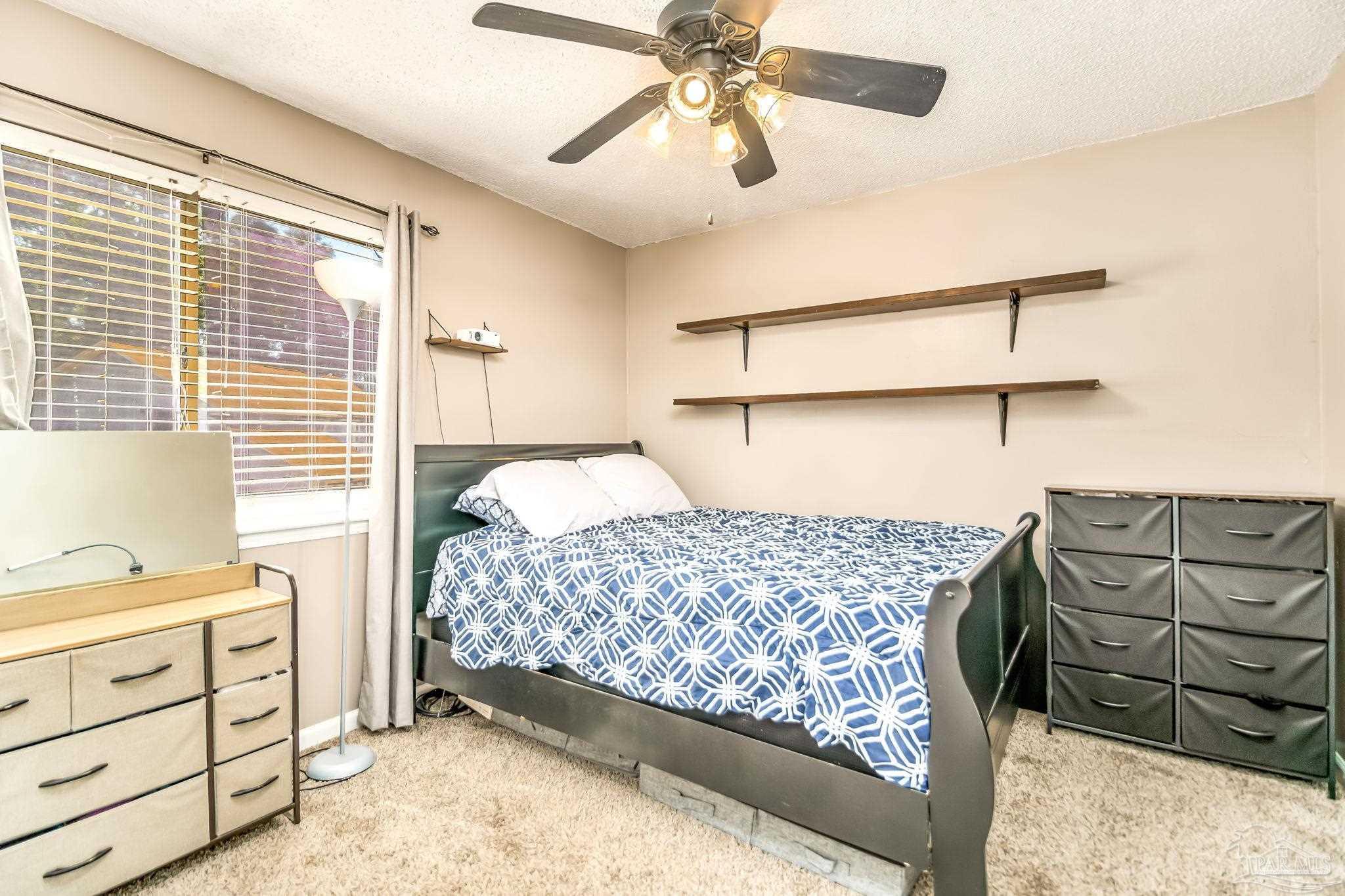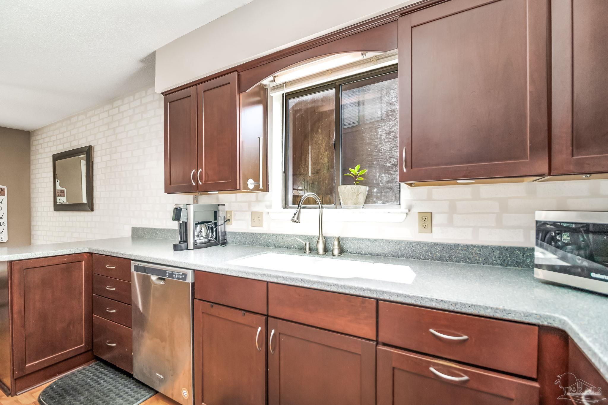 Adorable 3 bedroom 1 & 1/2 Bath Townhome in the heart of Northeast Pensacola! 1/2 bath downstairs. Wood burning fireplace in Great Room . Cherry cabinetry and corian countertops in the kitchen ~Laminate wood flooring downstairs~ Carpet in bedrooms and on stairs. Primary suite bedroom has a walk-in closet. Front and rear balconies for outside lounging. Single car garage. Full roof replacement in 2020. Very nice size backyard has privacy fenced and a storage building.