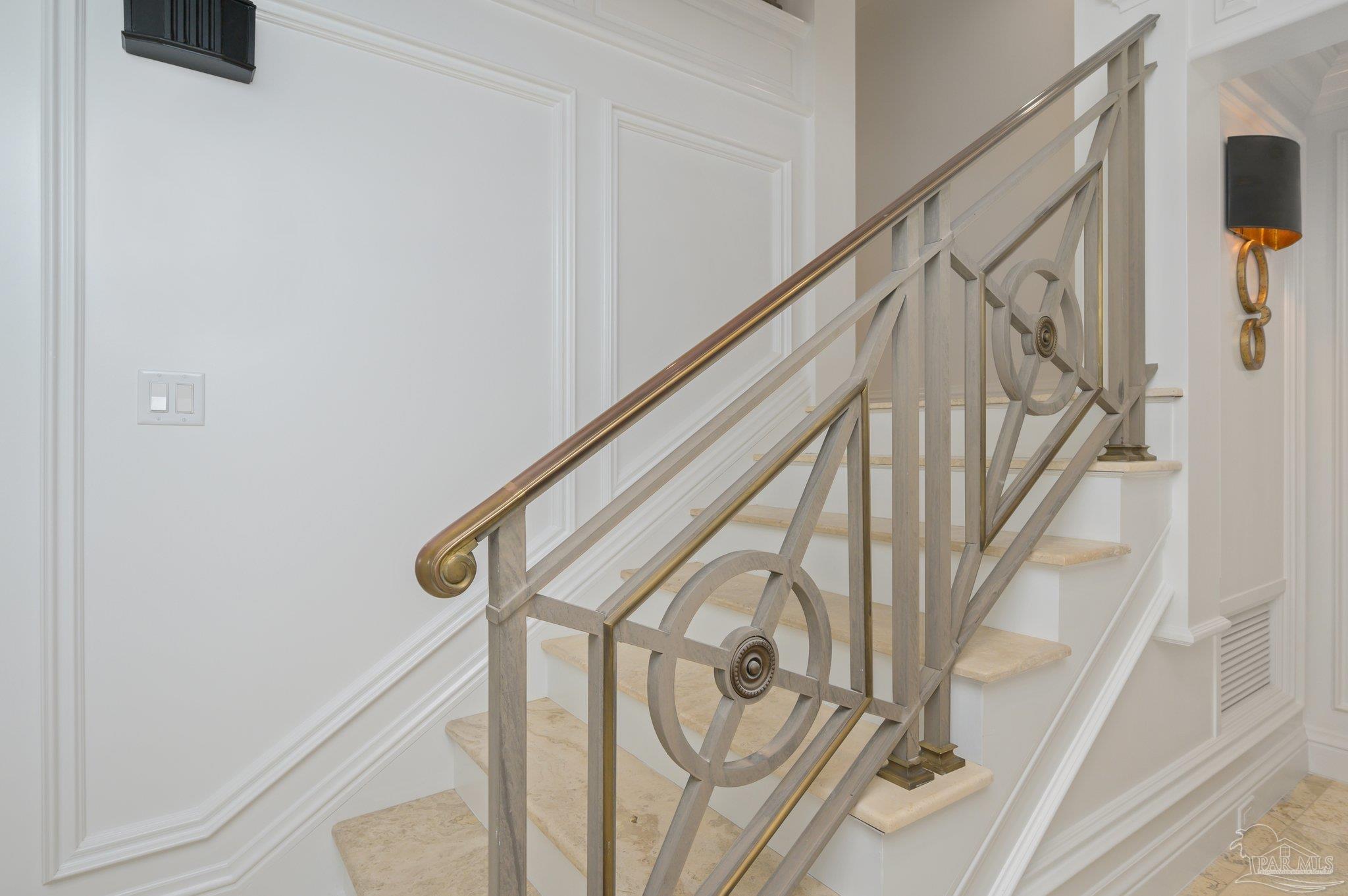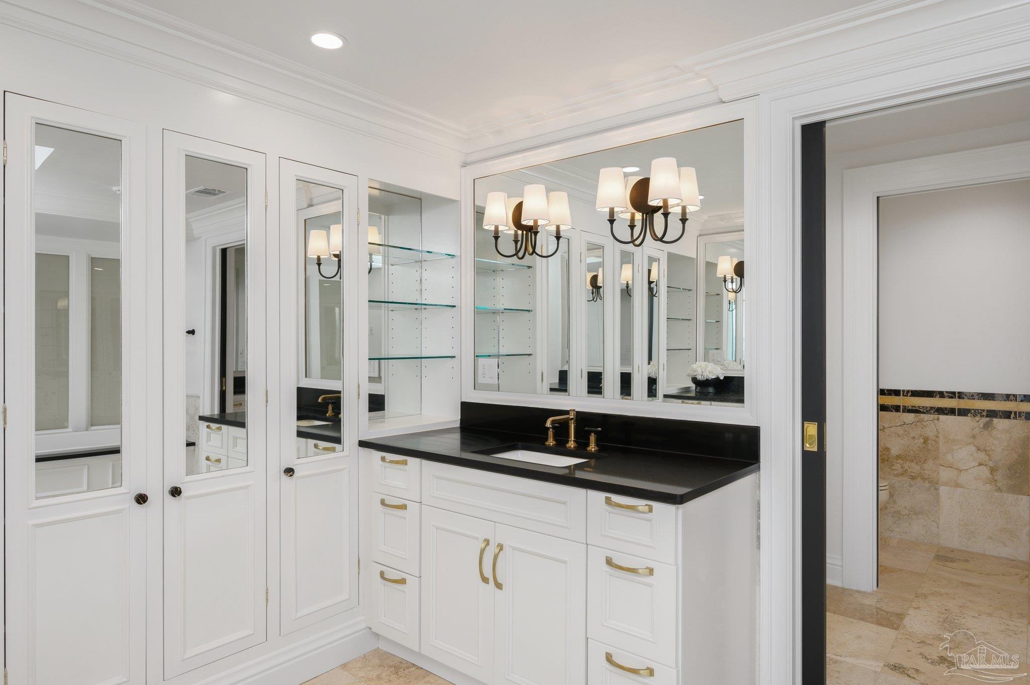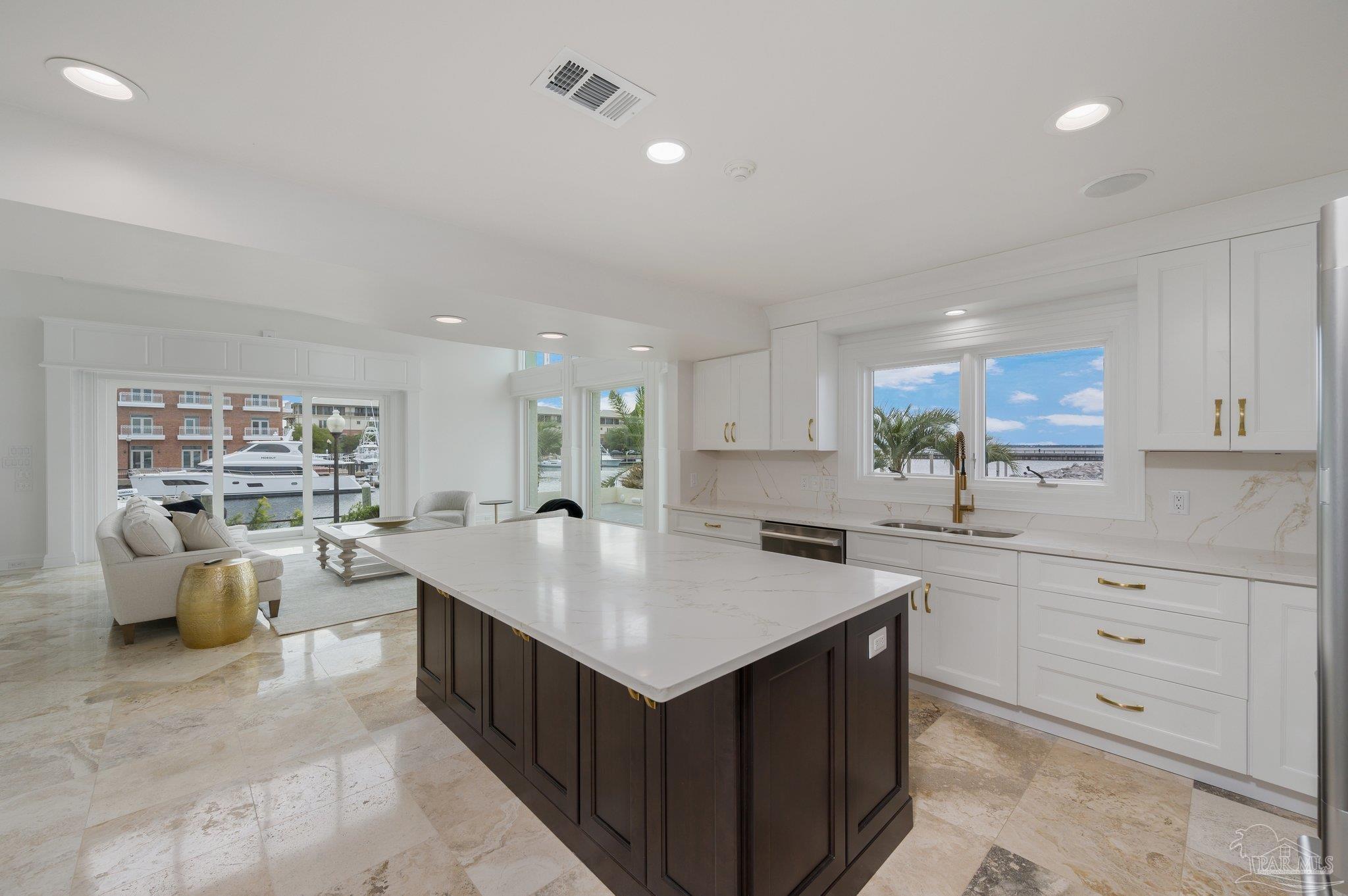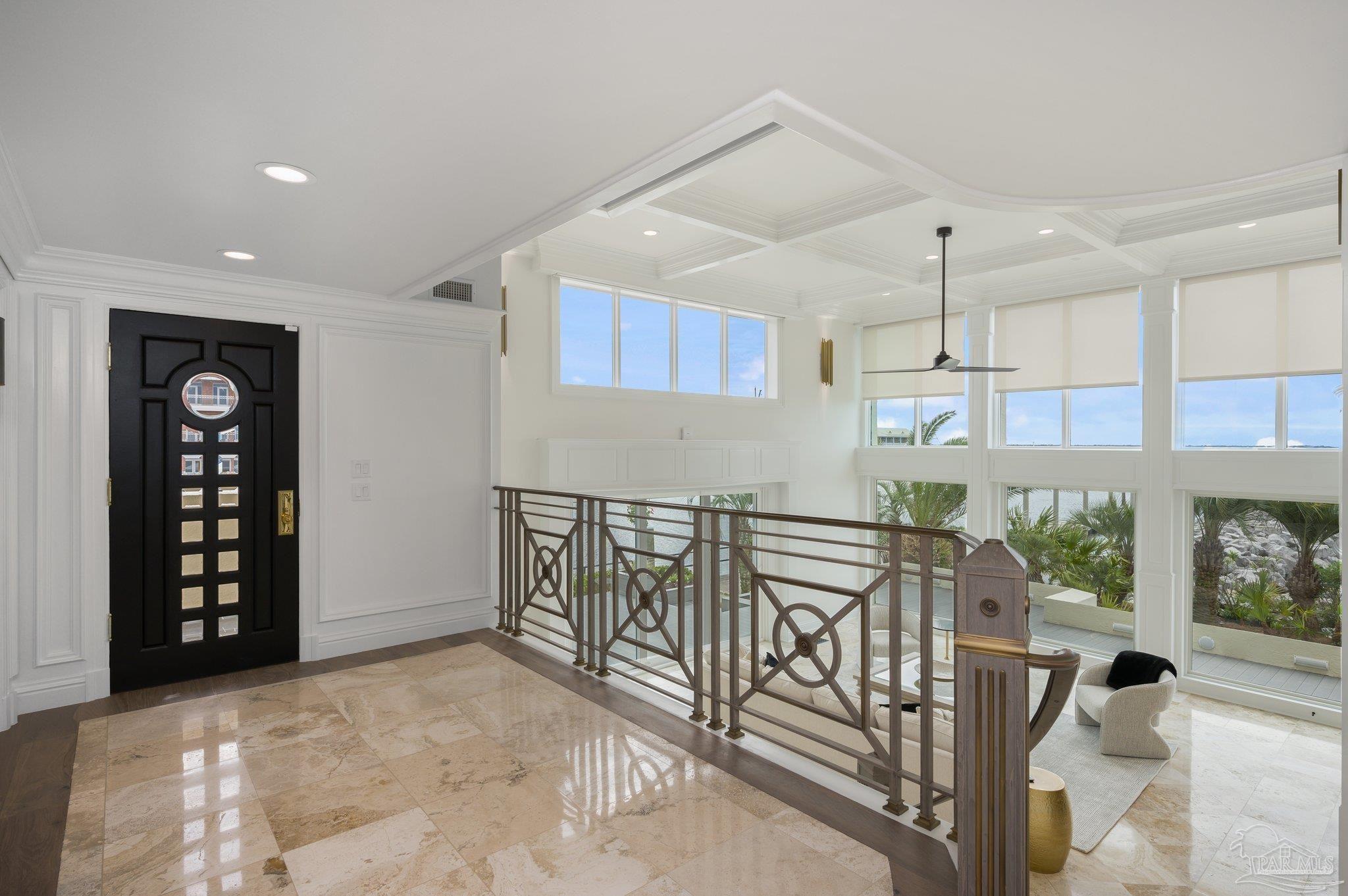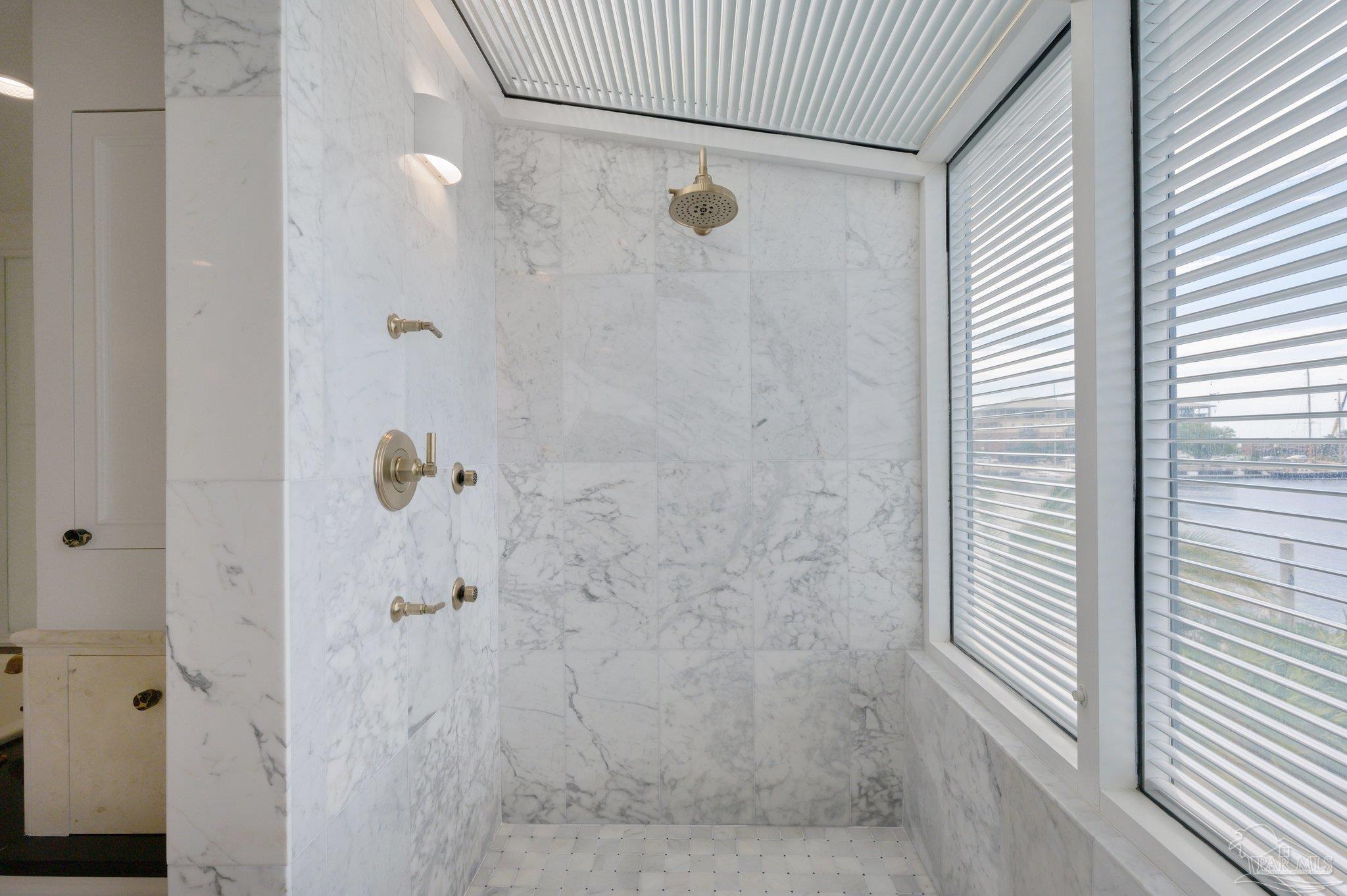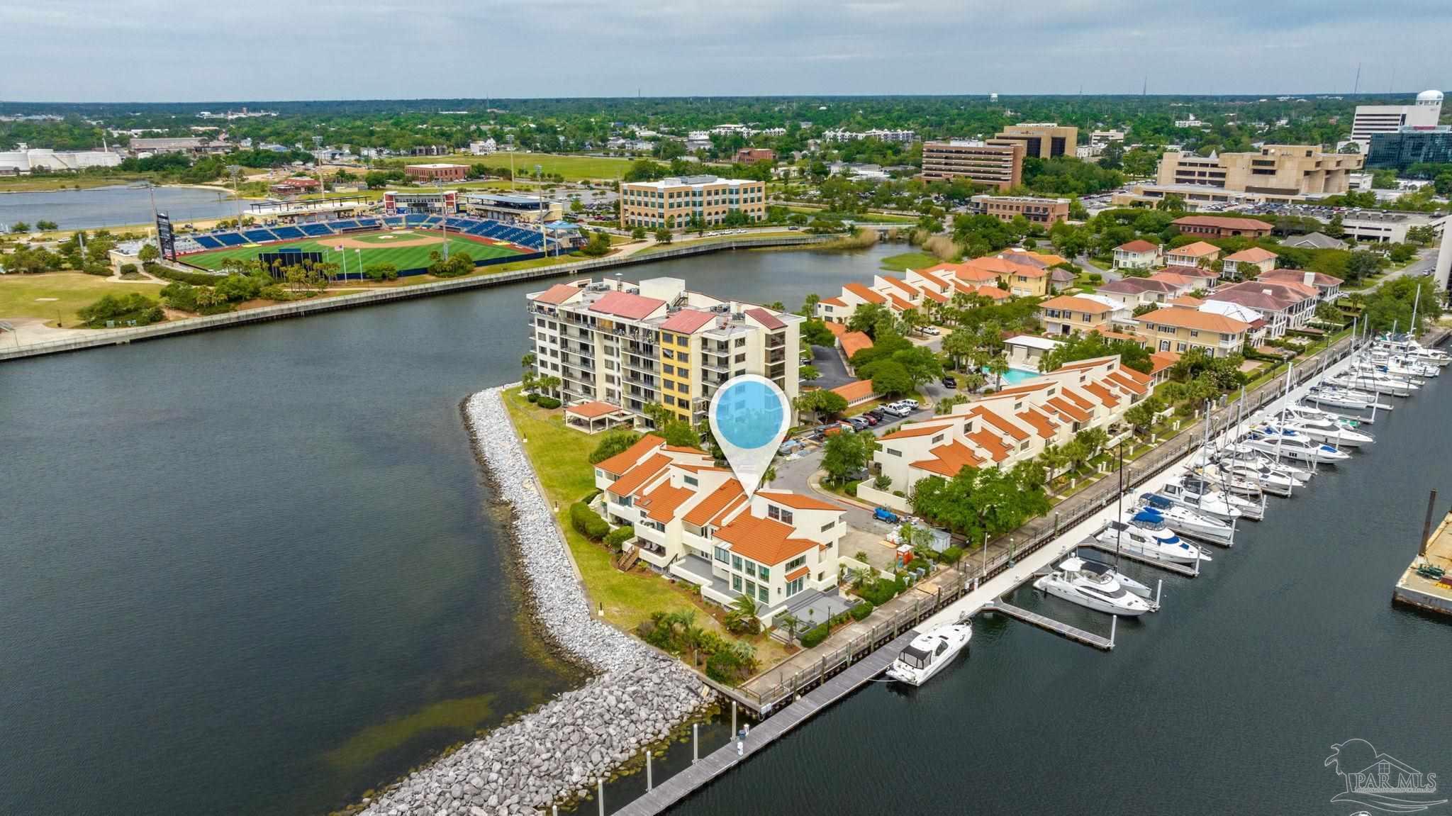 WATERFRONT LUXURY combined with the PERFECT LOCATION and unparalleled VIEWS of the Pensacola Bay are what make this impressive corner unit at Port Royal unique and one of a kind. Downtown living at its finest with access to shops, restaurants and Wahoo Stadium all within walking distance. This double unit has been completely renovated while maintaining its original charm with custom finishes and imported materials. The kitchen is a chef's dream with state of the art appliances, quartz countertops, gas range, center island and custom cabinetry. There is an additional catering kitchen that contains double ovens, dishwasher, and a full sized Sub-Zero refrigerator making this home perfect for entertaining guests. Conveniently situated between both kitchens is the formal dining room with an impressive refrigerated wine cellar with custom teak doors accessing the lanai. Off the kitchen is the grand living area with cathedral ceilings, floor to ceiling windows with breathtaking views of the Pensacola Bay and access to the lanai. The foyer is grand with custom metal railing and intricate glass French doors opening to a bonus room featuring a wet bar, ice maker, wine fridge, entertainment cabinet and even a secret door leading to a private safe. Down the hall is a powder bathroom & laundry room leading to a full bathroom and guest suite. The Master bedroom suite is located on its own private level with beautiful wood floors, balcony & custom two story closet that you have to see to believe! The Master bathroom is a sanctuary with separate vanities, dressing area, garden tub, private water closet and one of a kind marble shower with skylights overlooking the Bay. The next level features two additional guest bedrooms with full bathroom, and a bonus space accessed by a spiral staircase with stunning water views. This amazing home is complete with a spacious 3 car garage & community pool! Paradise Awaits!!