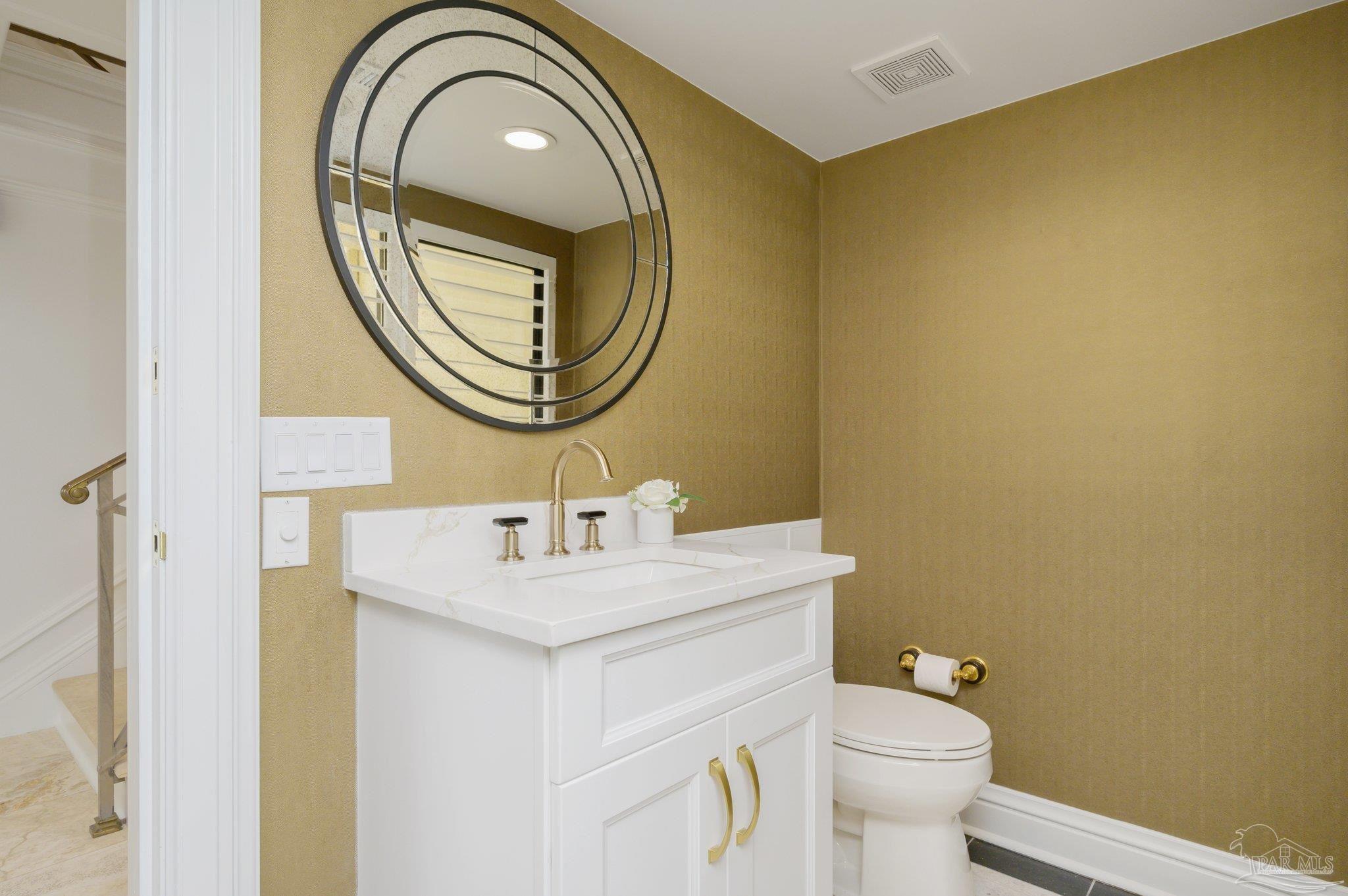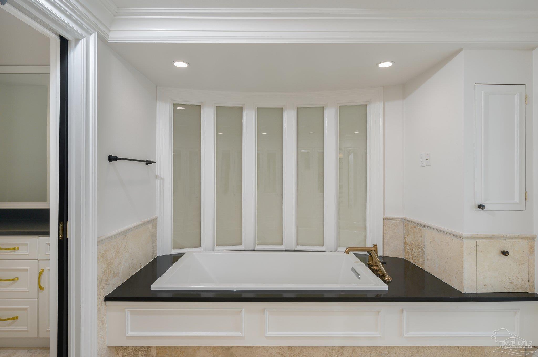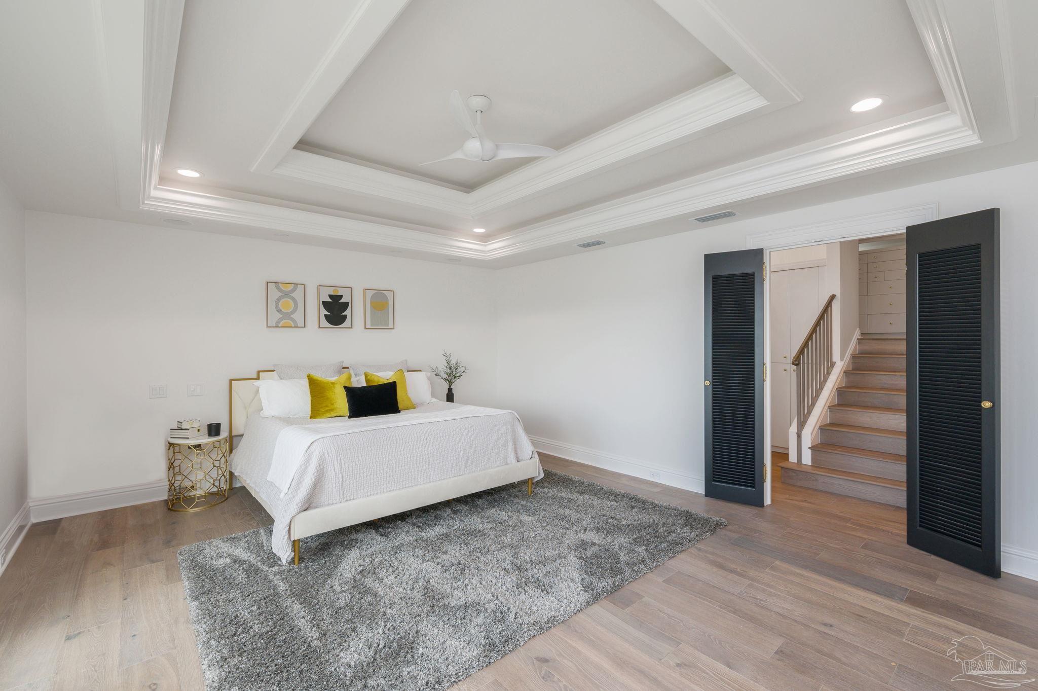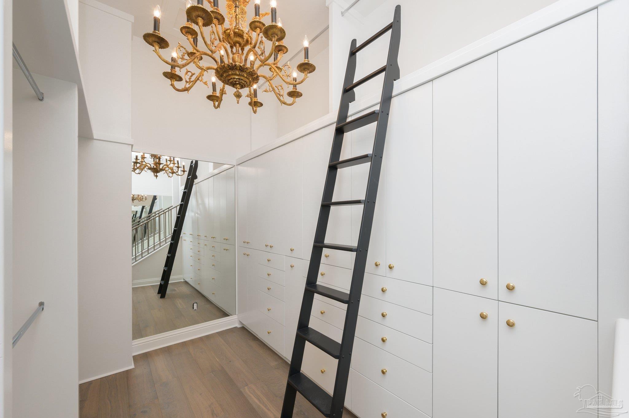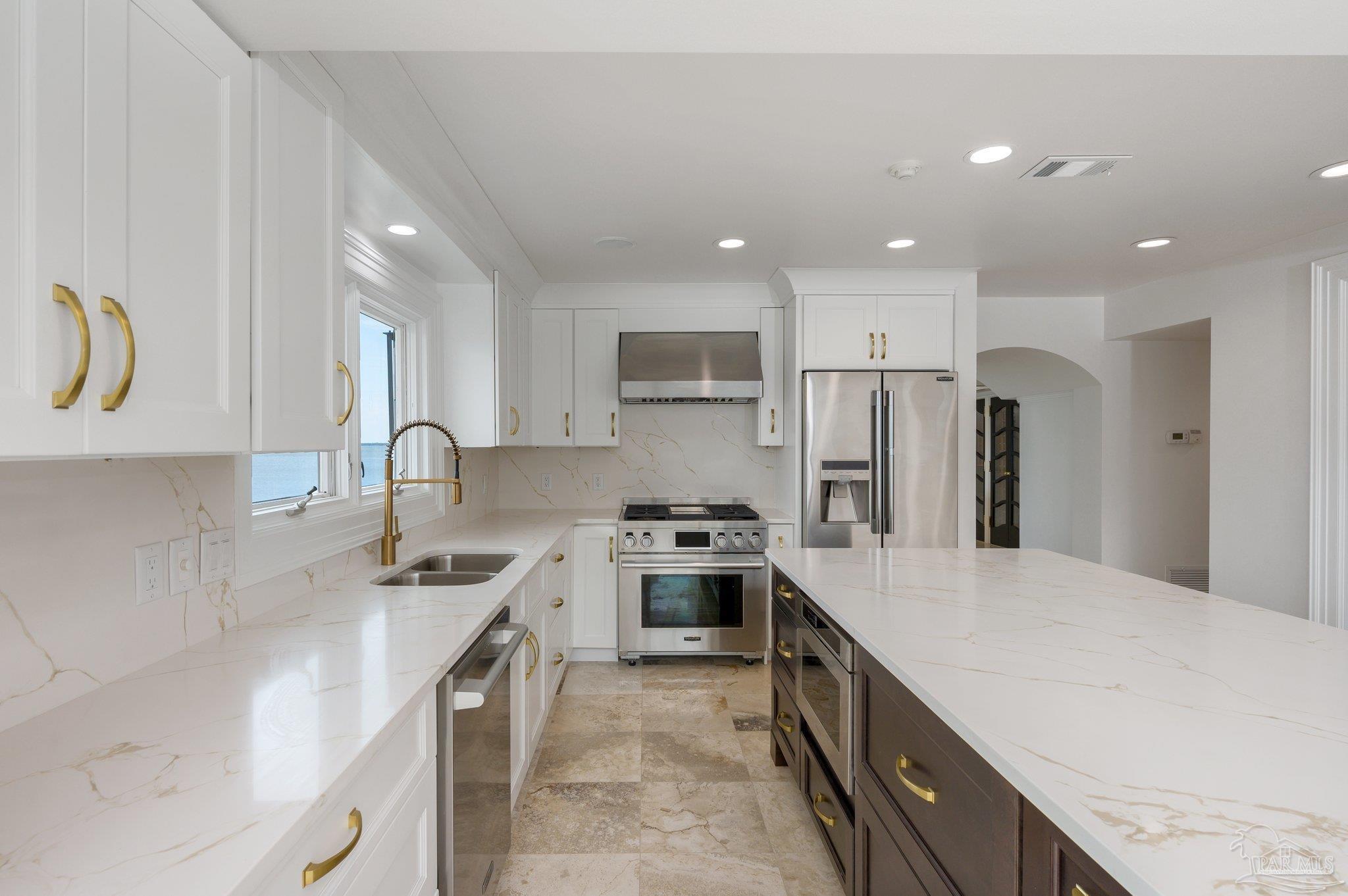 WATERFRONT LUXURY combined with the PERFECT LOCATION and unparalleled VIEWS of the Pensacola Bay are what make this impressive corner unit at Port Royal unique and one of a kind. Downtown living at its finest with access to shops, restaurants and Wahoo Stadium all within walking distance. This double unit has been completely renovated while maintaining its original charm with custom finishes and imported materials. The kitchen is a chef's dream with state of the art appliances, quartz countertops, gas range, center island and custom cabinetry. There is an additional catering kitchen that contains double ovens, dishwasher, and a full sized Sub-Zero refrigerator making this home perfect for entertaining guests. Conveniently situated between both kitchens is the formal dining room with an impressive refrigerated wine cellar with custom teak doors accessing the lanai. Off the kitchen is the grand living area with cathedral ceilings, floor to ceiling windows with breathtaking views of the Pensacola Bay and access to the lanai. The foyer is grand with custom metal railing and intricate glass French doors opening to a bonus room featuring a wet bar, ice maker, wine fridge, entertainment cabinet and even a secret door leading to a private safe. Down the hall is a powder bathroom & laundry room leading to a full bathroom and guest suite. The Master bedroom suite is located on its own private level with beautiful wood floors, balcony & custom two story closet that you have to see to believe! The Master bathroom is a sanctuary with separate vanities, dressing area, garden tub, private water closet and one of a kind marble shower with skylights overlooking the Bay. The next level features two additional guest bedrooms with full bathroom, and a bonus space accessed by a spiral staircase with stunning water views. This amazing home is complete with a spacious 3 car garage & community pool! Paradise Awaits!!