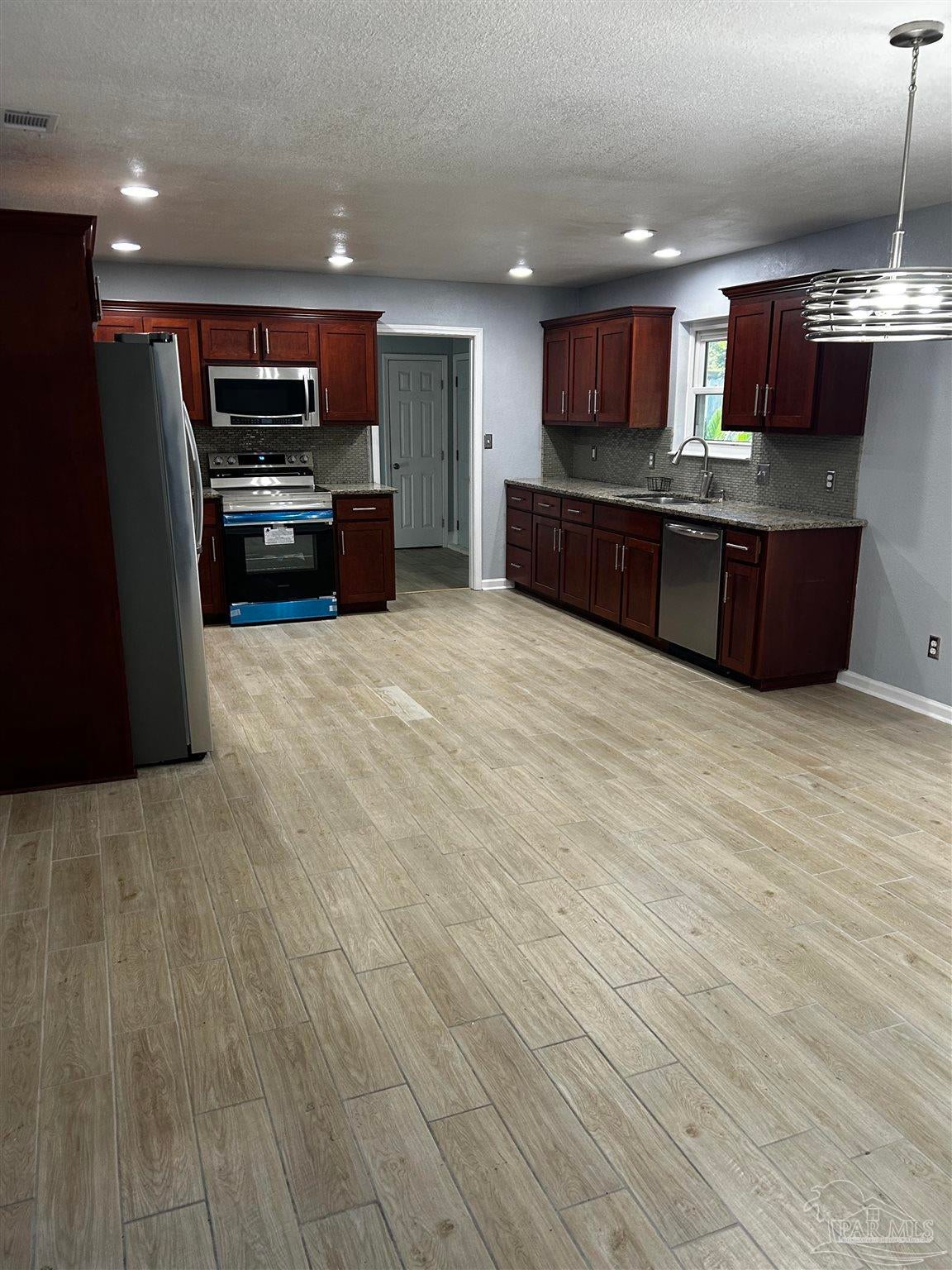 Location! Location! Location! Close to Escambia Bay, the Pensacola Airport and I-10. This Northpointe community is within a 5 minute walk to Regency Park and Lonnie G Jones dog park. 2025: new roof , new pool liner, new pool pump, new gates, new fence (1side) preexisting deck and a sprinkler system that is grounded just needs to be wired. 2018: cooper wiring, central heat and air, impact windows and water heater. Ceramic faux wood tile throughout, new carpet in 3 rooms. Kitchen provides an open concept, with soft close maple wood cabinets, granite counter tops, chic back splash, a 60/40 sink, Moen faucet and soap dispenser, garbage disposal & can lights throughout w/plenty space for an island. Home is equipped with natural gas hook ups, including an outdoor hookup for a generator. Buyer to verify all square footage.