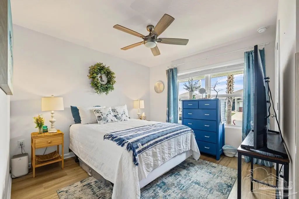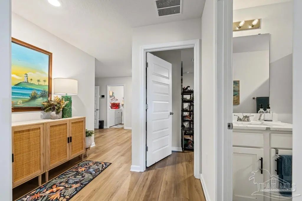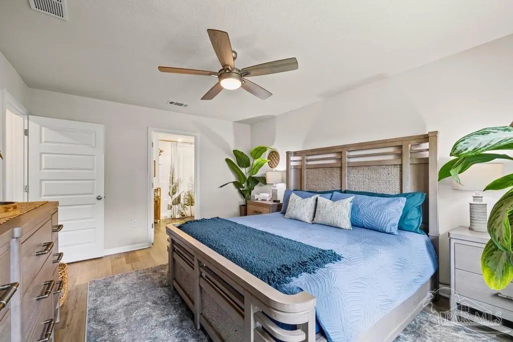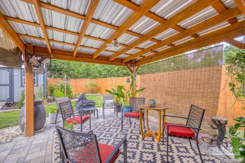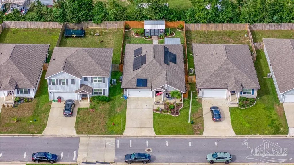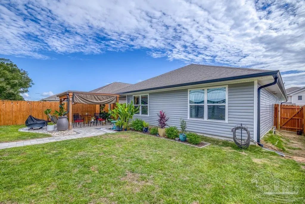 UPGRADES, COMFORT, AND COMMUNITY: Step into elevated living where every inch reflects care and investment. The entire home features upgraded luxury vinyl plank flooring. Custom blinds bring privacy and elegance to each space. The kitchen is a showpiece. Quartz counters, full-height backsplash, upgraded appliance suite, under-cabinet lighting, and a massive island anchor the space. A walk-in pantry with smart organization elevate the experience. Your primary retreat is very relaxing:The master suite includes a custom closet system built to impress. Upgraded fixtures elevate the bathrooms. Dual vanities, designer accent wall. Upgraded lighting. Your built-in walk-in closet with LED lighting and shelving makes organization a joy. Guest bedrooms feel spacious, light-filled, and comfortable. The secondary bedrooms are warm and welcoming, ready for family, guests and even home office use. Step outside and let the backyard steal your breath: a covered pergola with fans provides solace from the sun or rain. The yard is fully thought-out with an efficient sprinkler system, dual French drains, and custom gutters all around keep water in its place. The 10’×16’ Storage Pro shed, fully insulated and cooled, adds serious functional space. But the heart of this home is the community around it. Neighbors are familiar faces. Block gatherings, seasonal get togethers, and impromptu conversations on sidewalks happen organically. Many homeowners here are military or public servants, so care, respect, and consistency are common themes. Move into more than a house — move into a place where you belong. Location is stellar: close to schools, easy access to I-10, and a short drive to Pensacola or Milton. The HOA is reasonable The solar panels (on lease) help keep electric bills incredibly low -