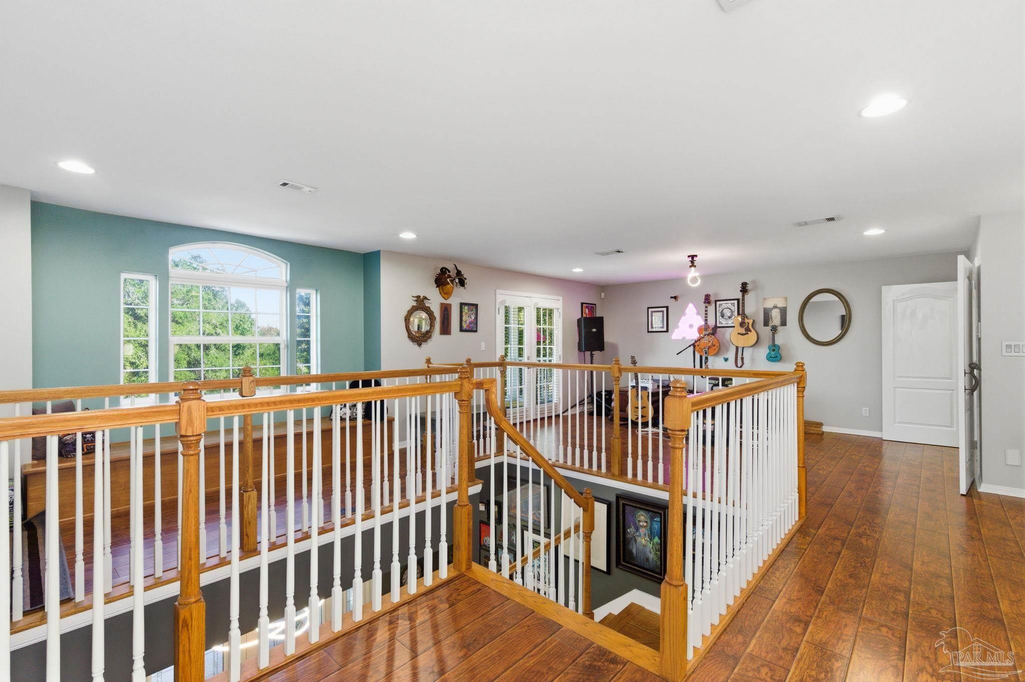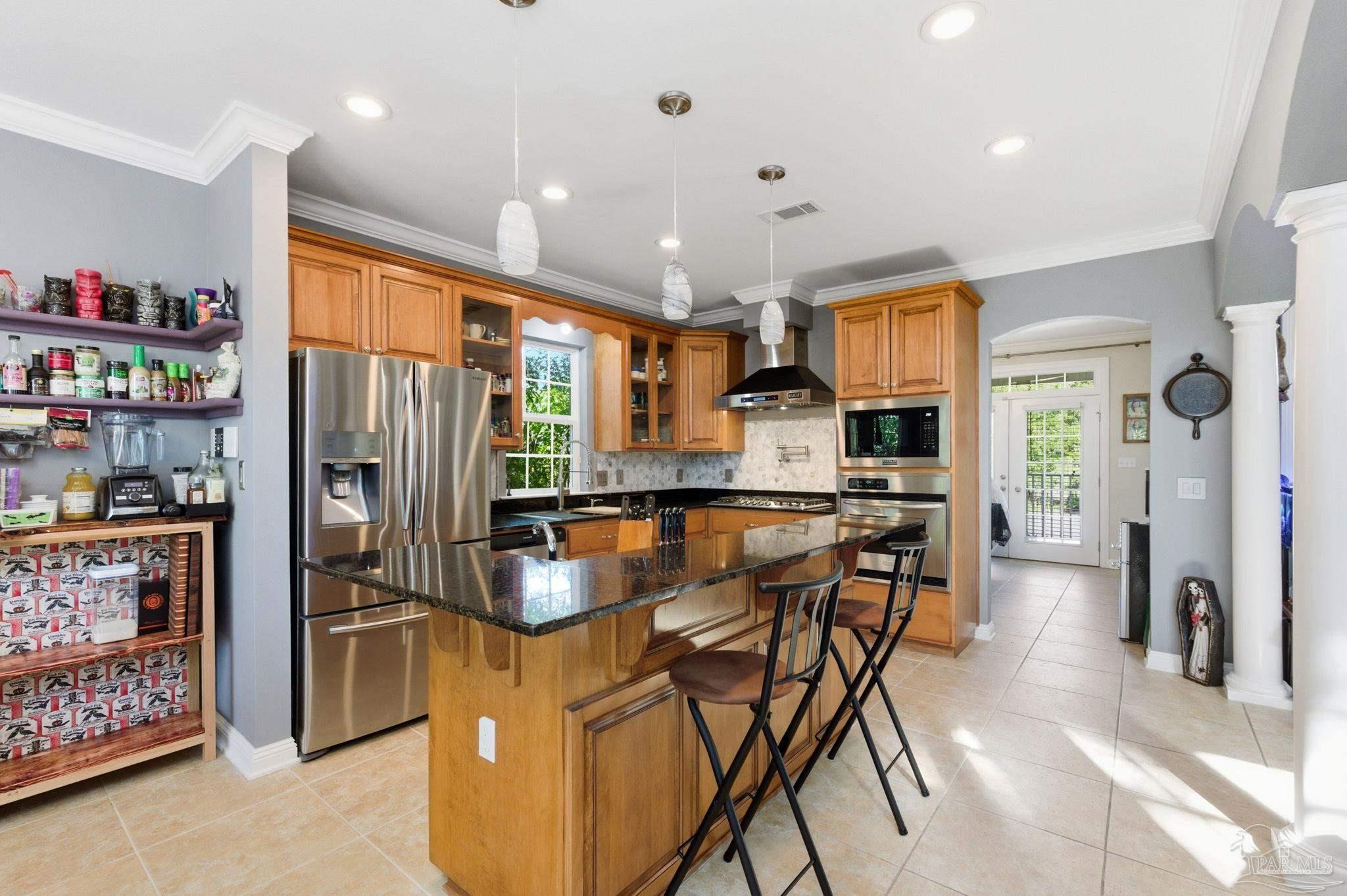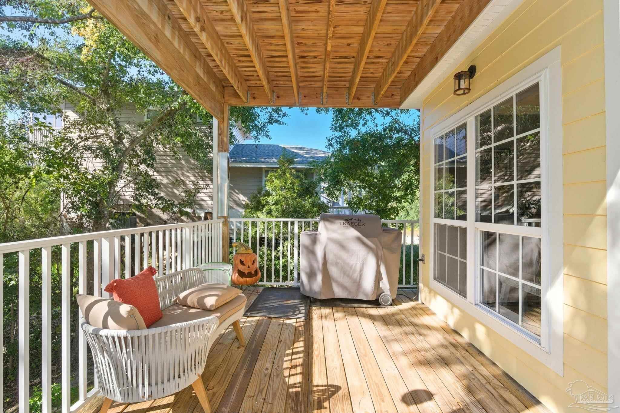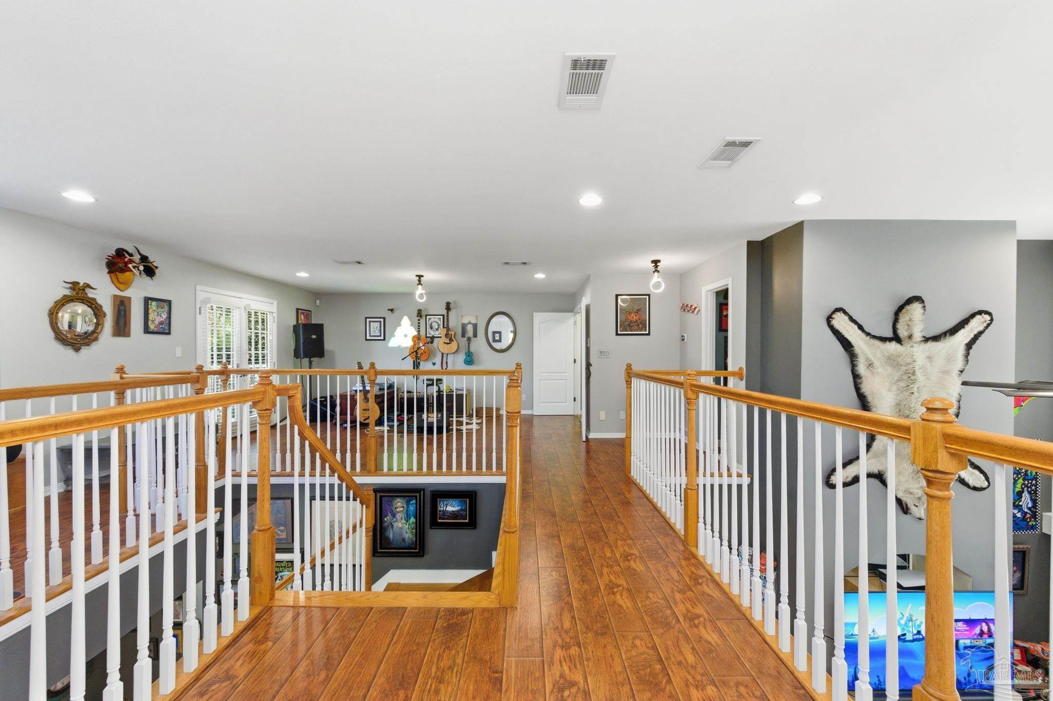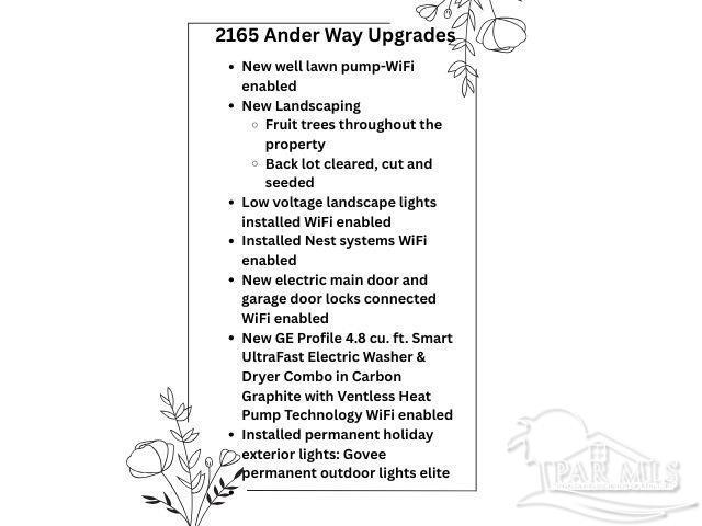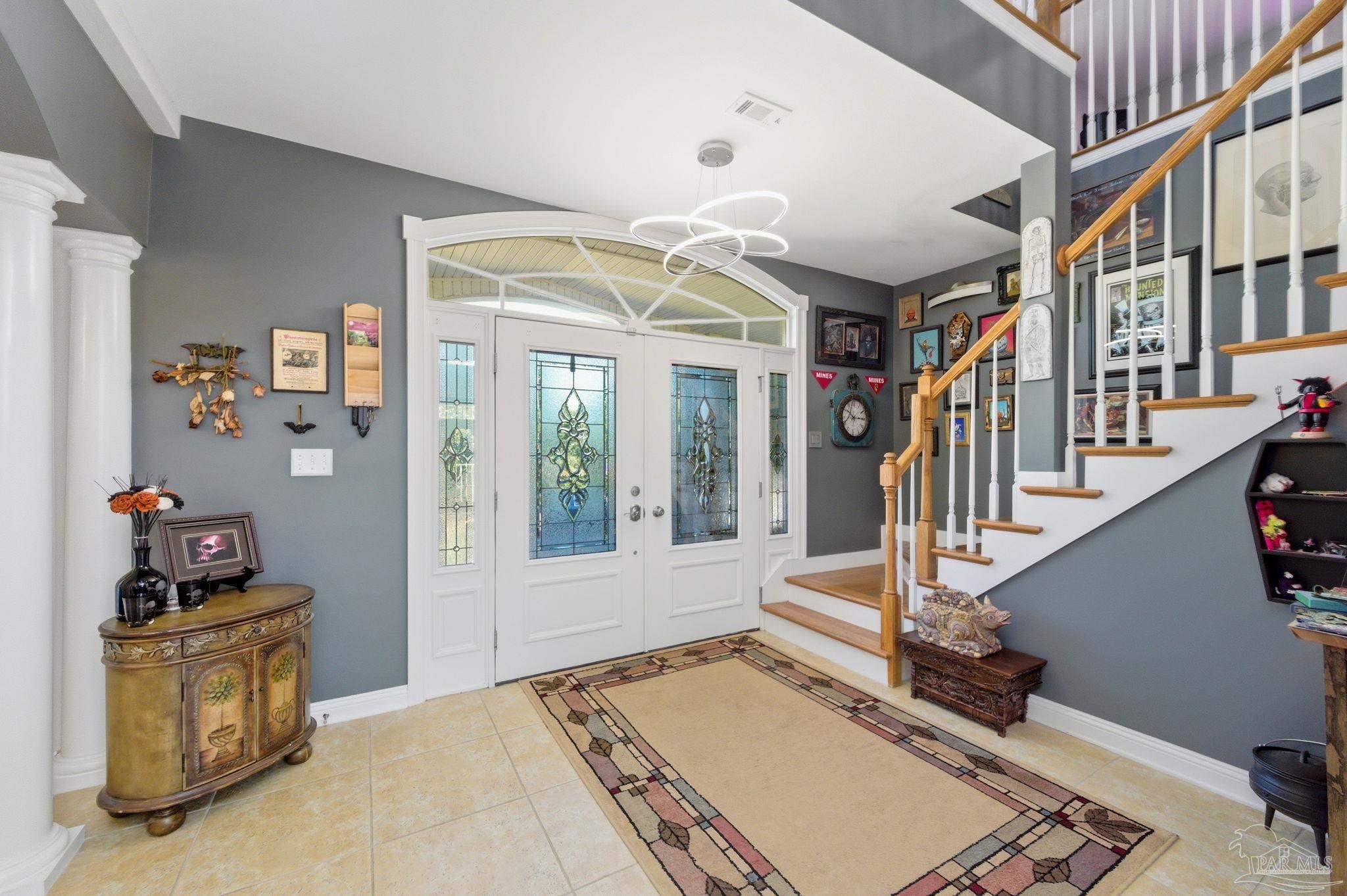 Welcome to 2165 Ander Way, where nature and convenience come together beautifully. Nestled on nearly half an acre (.44 acres) surrounded by lush greenery, this elevated home offers peaceful living with easy access to shopping, dining, and entertainment — plus over 615 DoorDash options when you’d rather stay in. You’ll feel tucked away in your own private oasis while being just minutes from everything. Set among the Escambia River, Ferry Pass, Murphy Cove, and Macky Bayou — all leading into the stunning Escambia Bay — this location is a dream for outdoor enthusiasts who love kayaking, fishing, and exploring Florida’s natural beauty. Step through the elegant double glass doors into a grand foyer with soaring ceilings and timeless details. The open living area centers around a cozy gas fireplace and flows seamlessly into the updated kitchen, complete with stainless steel appliances, granite countertops, rich wood cabinetry, a modern vent hood, and a coveted pot filler — a feature every home chef will love. Upstairs, a spacious second living area opens to its own balcony, providing the perfect flex space for a media room, studio, or home gym. The primary suite offers both a front balcony and a private back deck — perfect for a hot tub or relaxing under the stars. A converted utility closet now serves as a convenient home office, and the home provides plenty of storage throughout. The spacious two-car garage offers ample room for vehicles, tools, and outdoor gear. Outside, enjoy a large covered front porch and an expansive back deck surrounded by mature trees, unique plants, and fruit trees, creating a peaceful, park-like setting. Centrally located — approximately 35 minutes to Pensacola Beach, 40 minutes to Navarre Beach, 25 minutes to Whiting Field, 30 minutes to NAS Pensacola, 45 minutes to Hurlburt Field, and 50 minutes to Eglin AFB — this home truly captures the best of Northwest Florida living.