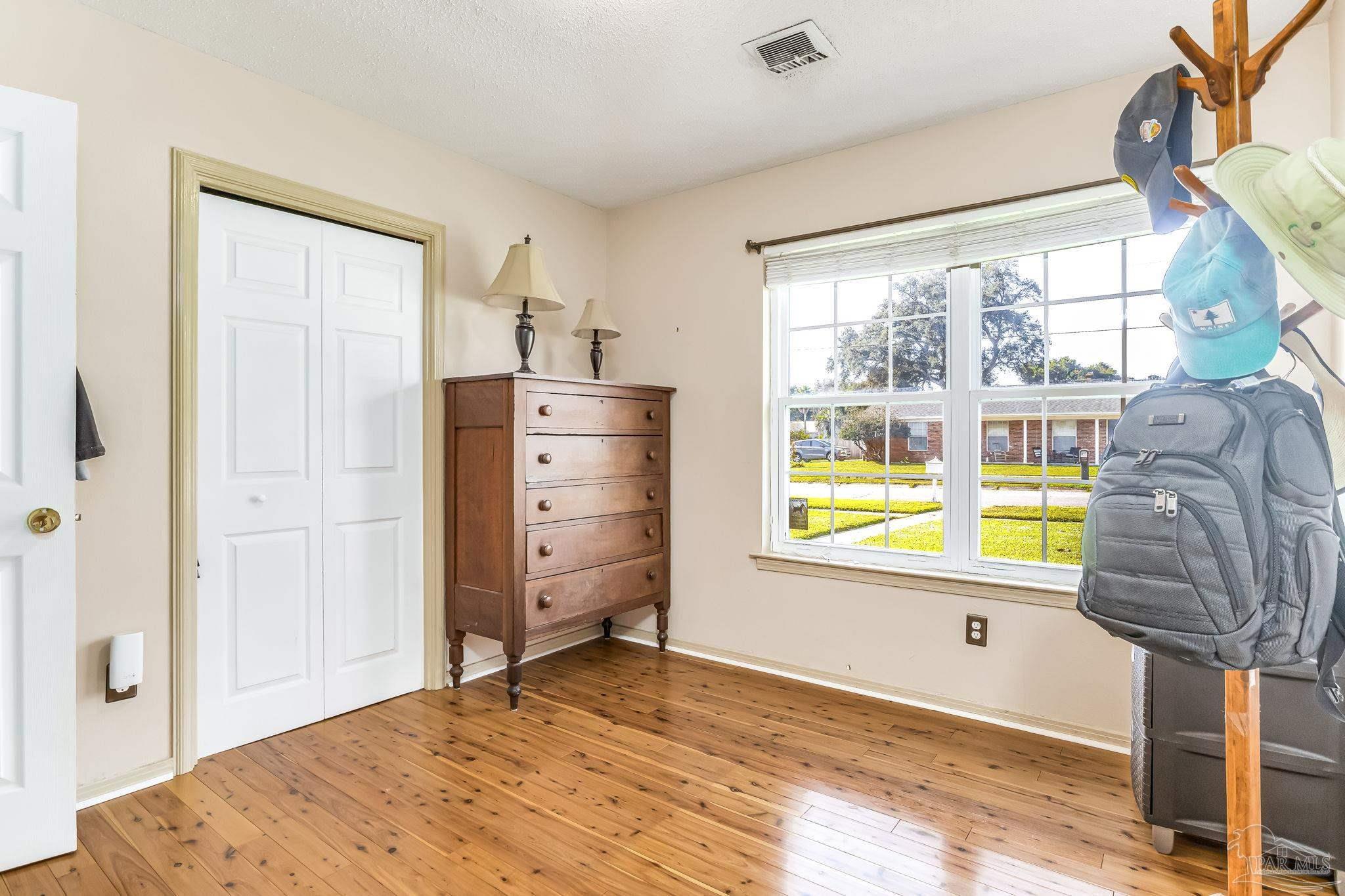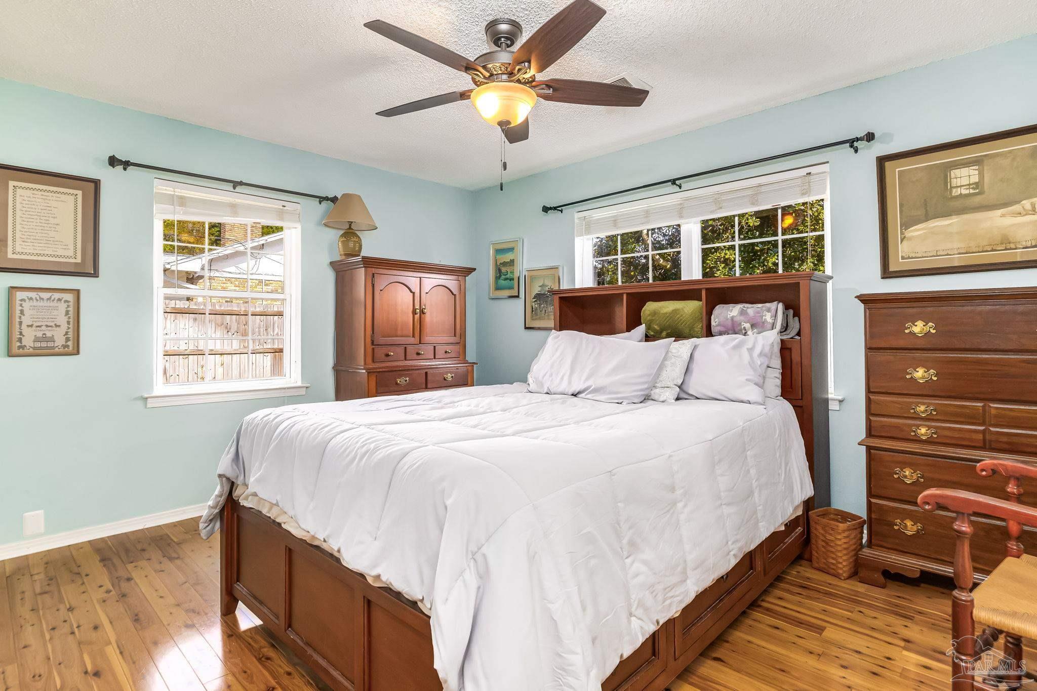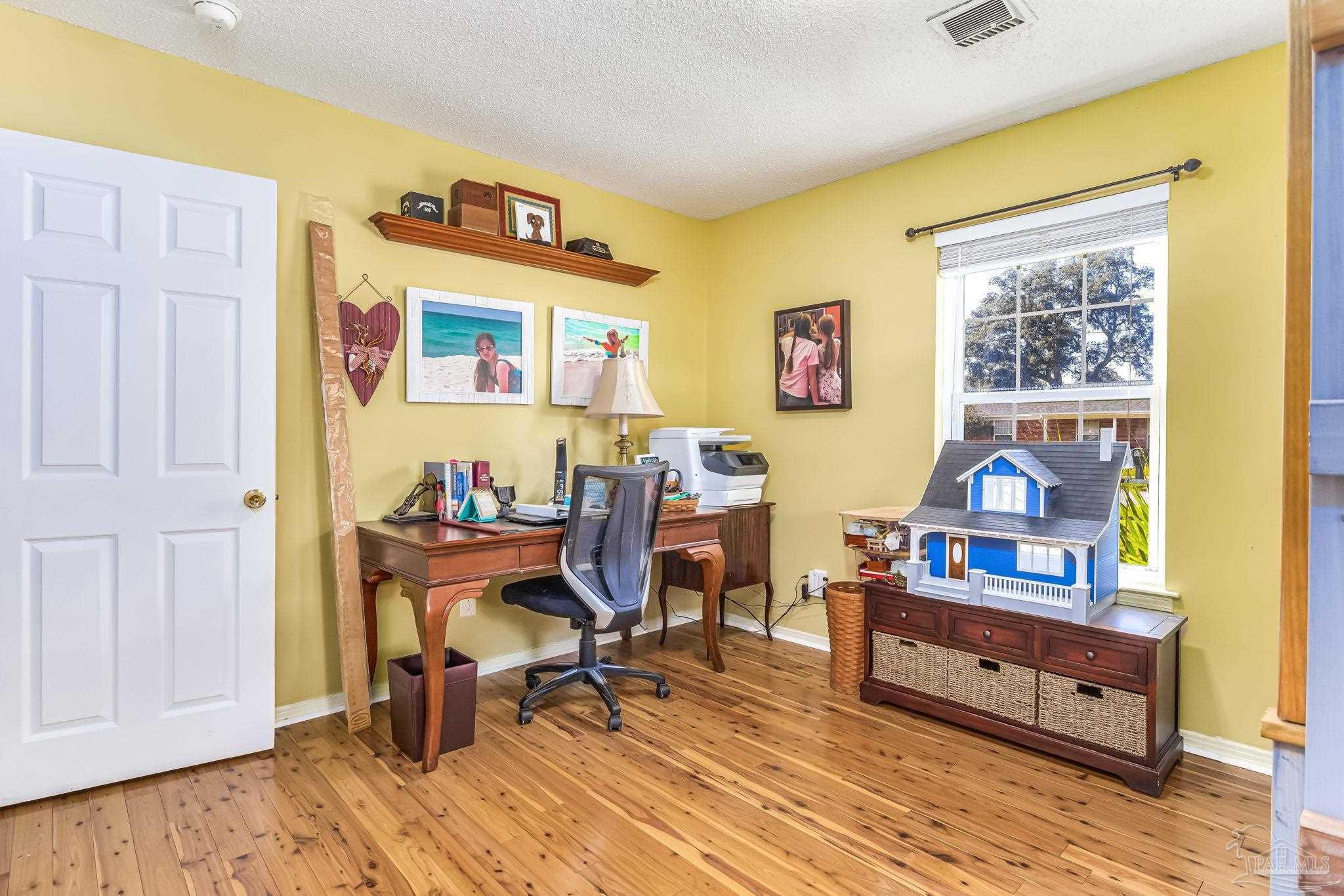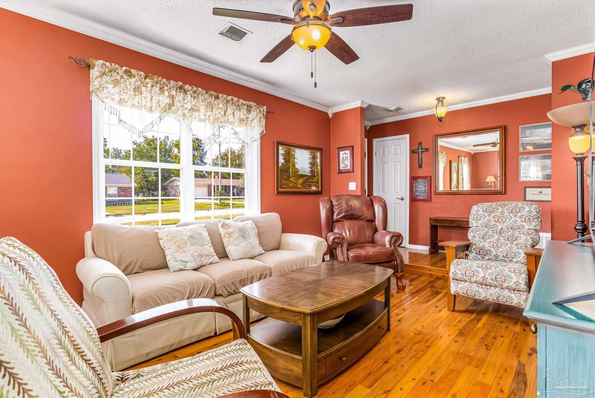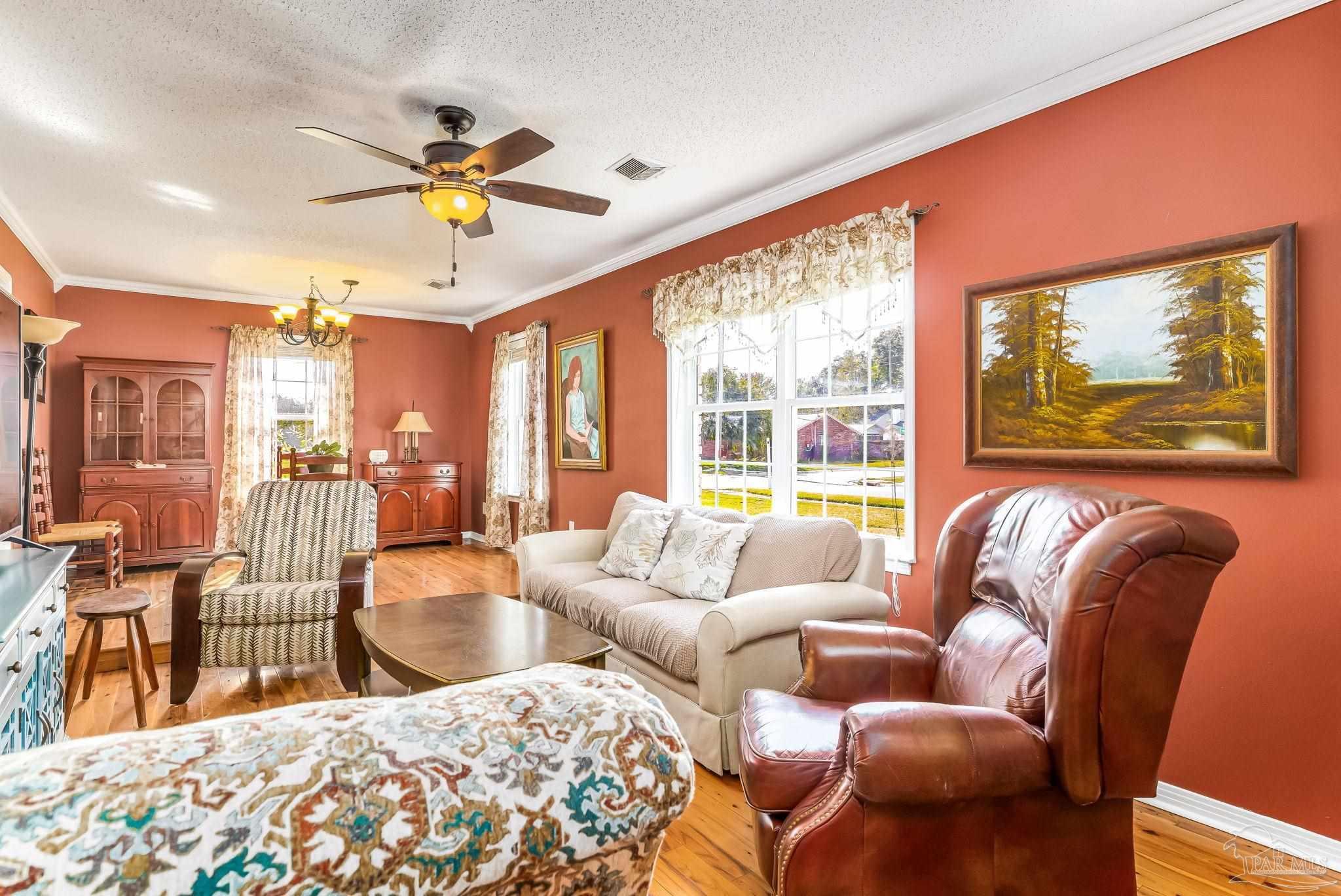 Brick home on a generously-sized corner lot in an established neighborhood - don't miss an opportunity to see why the first rule of home buying is the word "location"! The oversized side-entrance garage is connected to the home with a covered walkway, leading through a perfect private space for outdoor enjoyment and entertaining. The interior is classic ranch style, and there are separate spaces for any owner's flexible needs; a fireplace graces a family room that's open to the kitchen area. A dining area can be utilized as a home office or library that's open to the living room. This home has spaces that can adapt! Down the hall you'll find three bedrooms, a guest bath, and a main bedroom ensuite set up. Main living area has 1/2" Australian cypress hardwood, No high water bills here, an irrigation well for the yard will keep the grass and flower beds green all year round. Plus, a 10 X 12 yard building is secure and dry, and will hold all your tools and equipment. The fascia and soffits have been recently replaced and paint refreshed in main living area. 2016 Roof with NW Florida upgrades, brand new 2025 HVAC system and 2015 Water Heater. Located in a very walkable neighborhood with sidewalks, and near retail shopping areas, hospitals, and colleges, right down the street from Hitzman- Optimist Park, 15 minutes to downtown Pensacola and less than 30 minutes to Pensacola Beach. Make your appointment soon to see this wonderful family home!