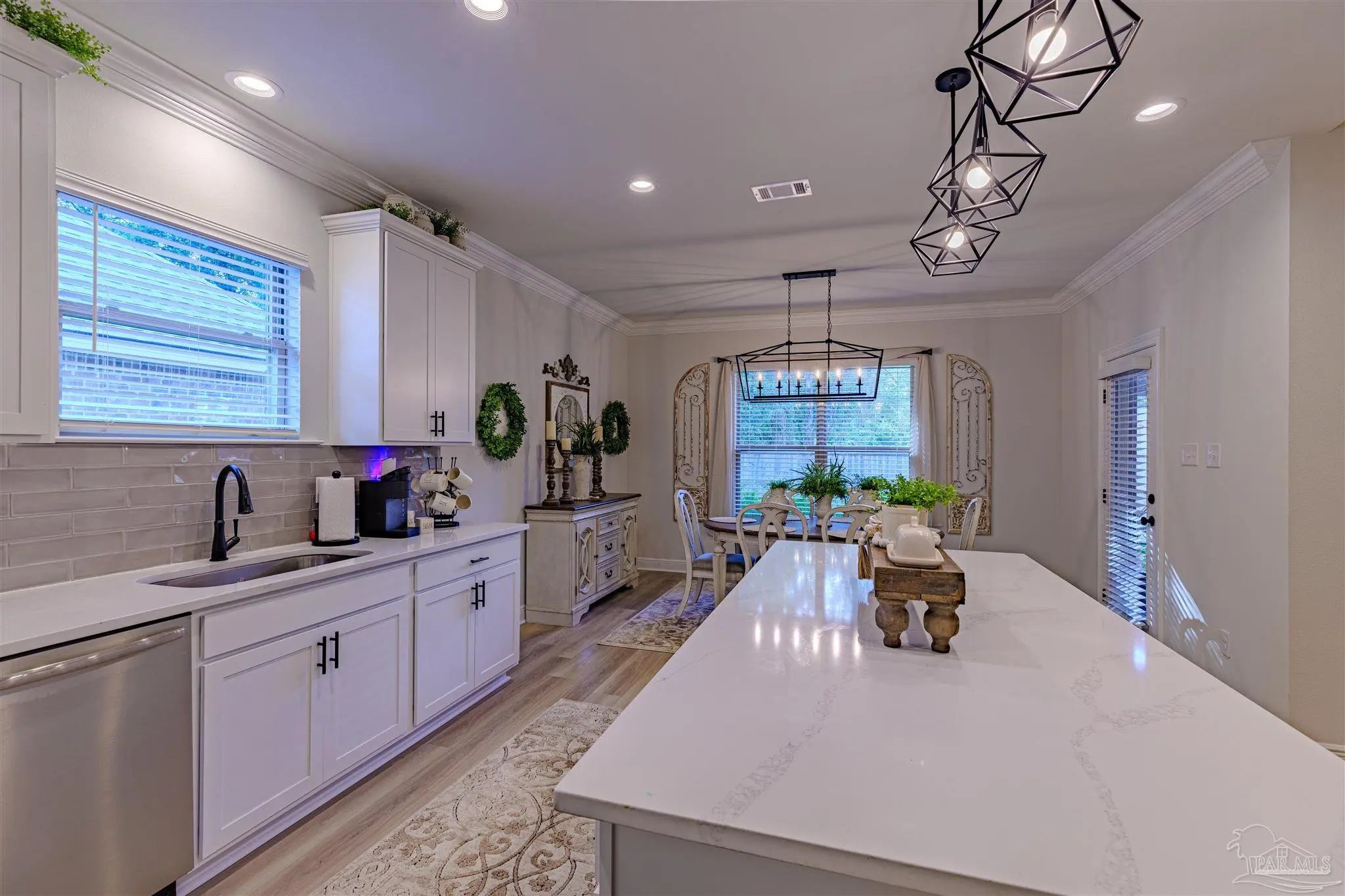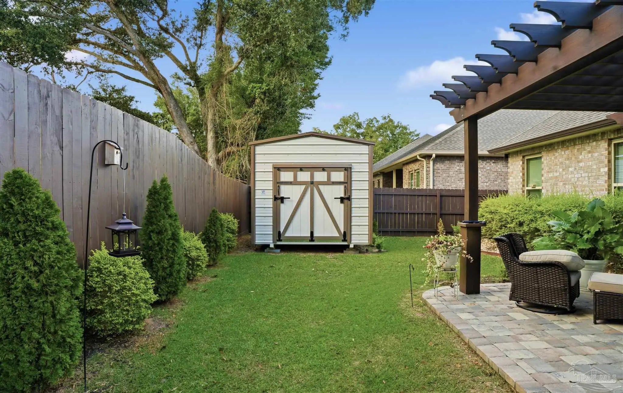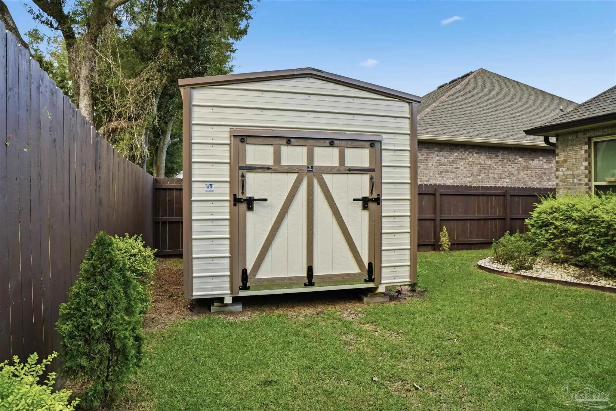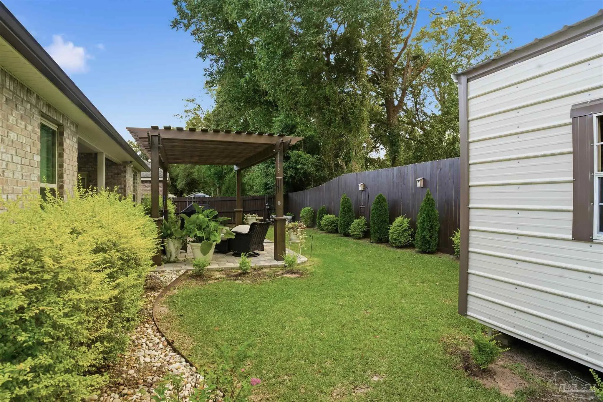 Welcome to your dream home in the heart of Pace, located in the desirable subdivision of Southern Palms! This meticulous 4-bedroom, 2-bath property combines timeless elegance with modern comfort. From the charming brick and stucco exterior to the thoughtfully designed open floor plan, this home is a haven for those who love both style and space. Step into the warm and welcoming eat-in kitchen, complete with a generous center island, oversized cabinets, and stainless steel appliances that make every meal a delight. An elegant formal dining room offers a beautiful space for hosting gatherings, while recessed lighting throughout the kitchen and living areas creates a cozy ambiance, perfect for family evenings or entertaining friends. With luxury vinyl plank flooring spanning the entire house, maintenance is a breeze, allowing you more time to enjoy the things that matter. The spacious owner’s suite feels like a retreat, complete with a luxurious bathroom featuring a separate tub and shower, and a large walk-in closet that offers ample storage. Outside, the large pergola with cobblestone pavers is a serene spot for morning coffee or evening relaxation, surrounded by exquisite landscaping in both the front and backyard. Additional features like a brand new 10x10 storage building, an epoxy-coated garage floor and charming front and back porches add the finishing touches to a home that’s as functional as it is beautiful.