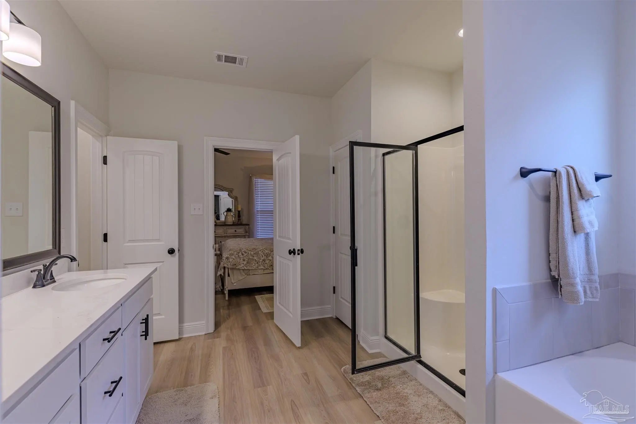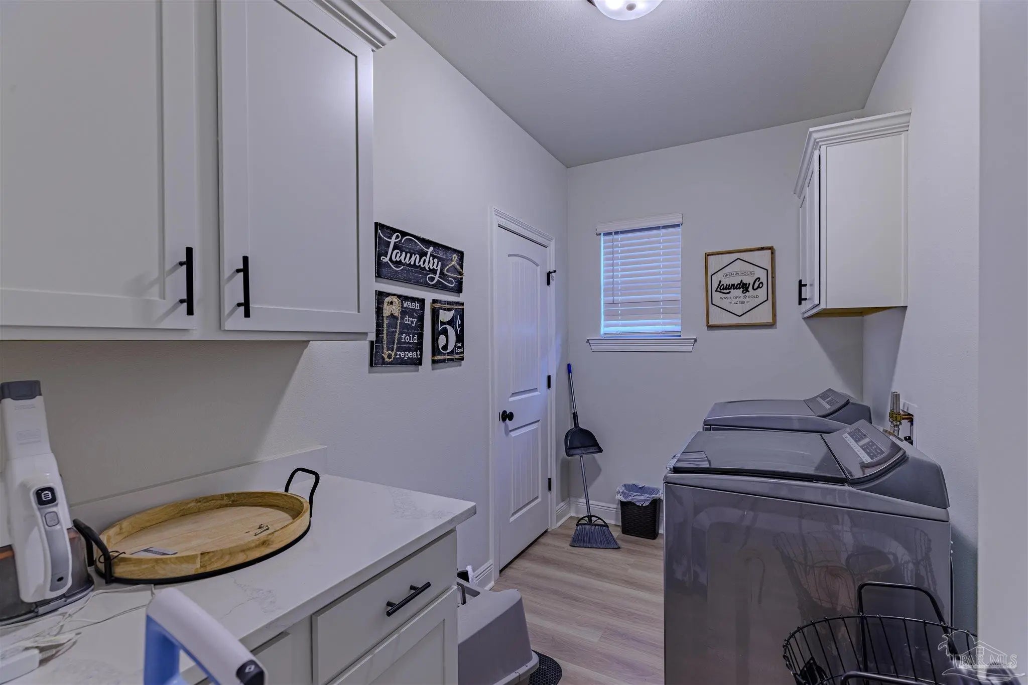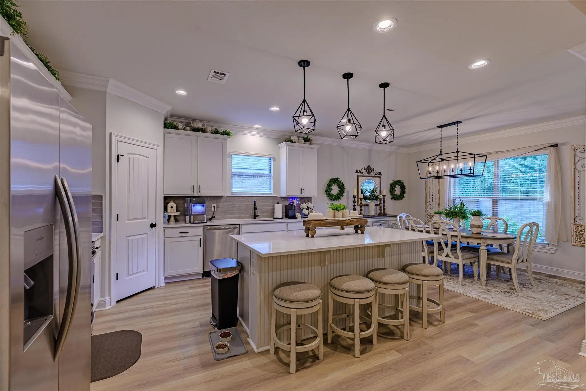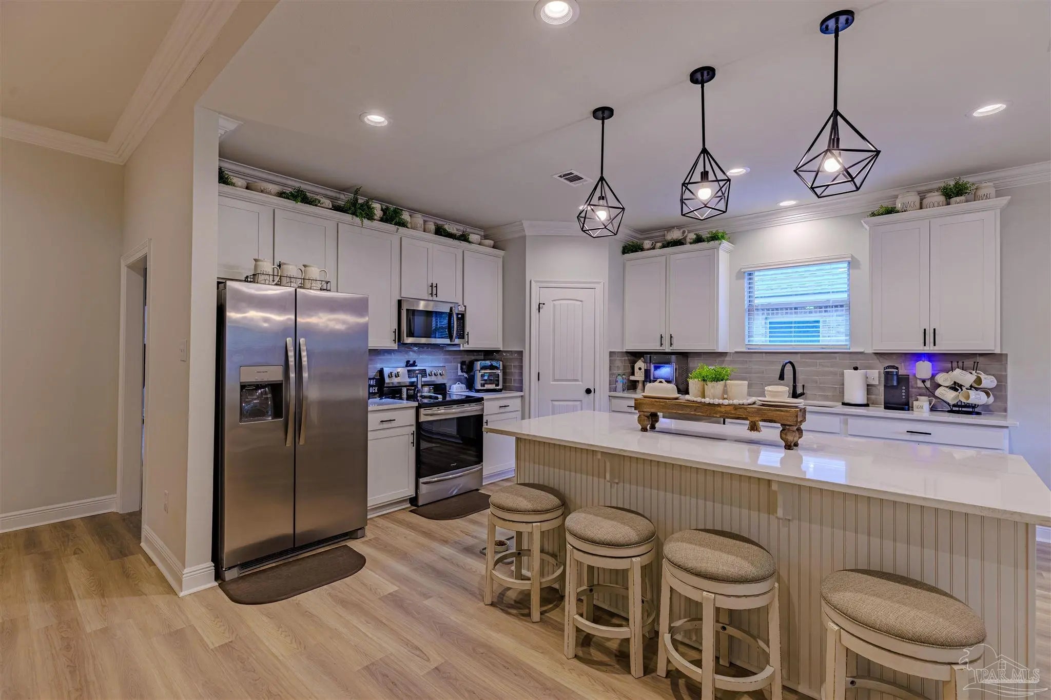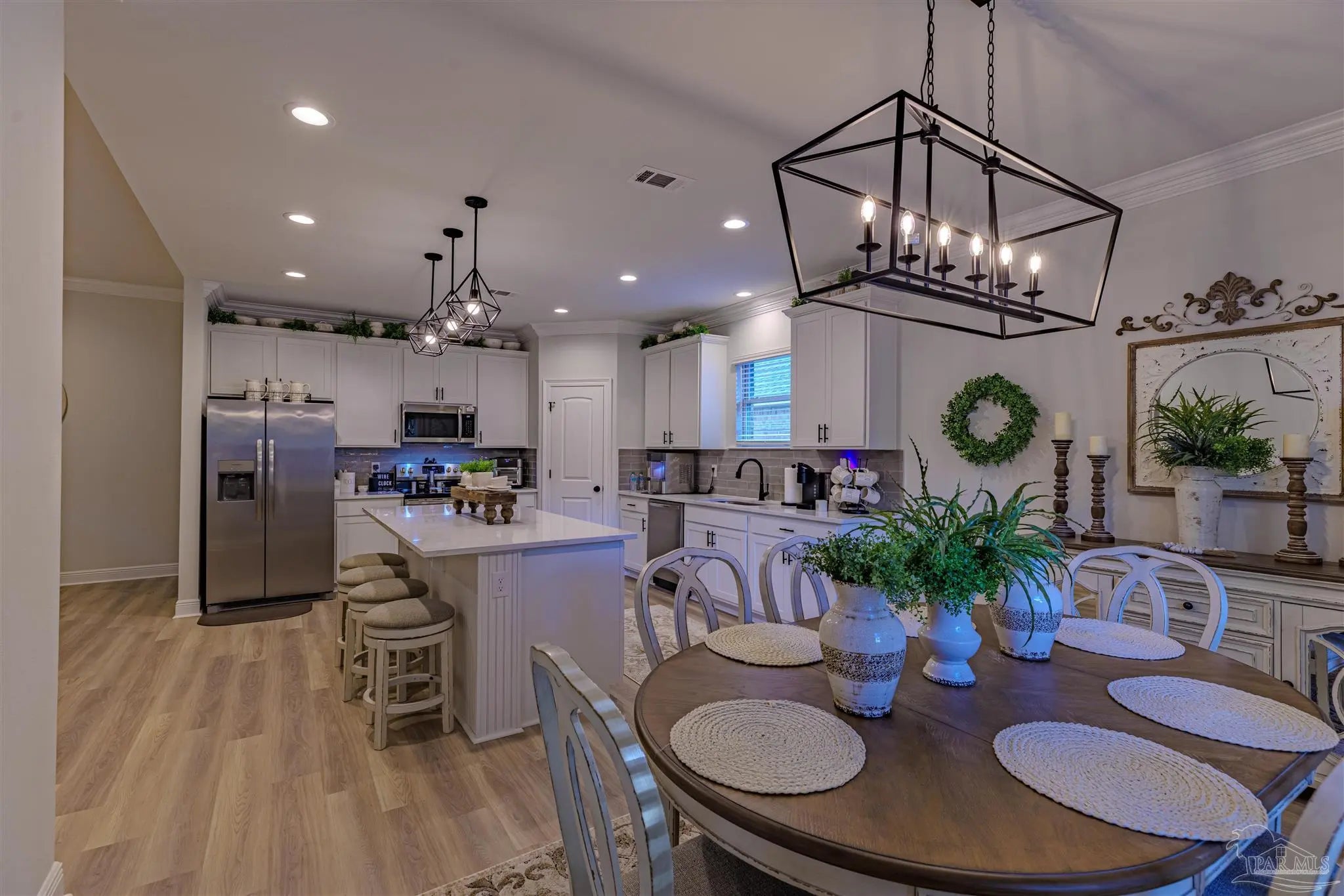 Welcome to your dream home in the heart of Pace, located in the desirable subdivision of Southern Palms! This meticulous 4-bedroom, 2-bath property combines timeless elegance with modern comfort. From the charming brick and stucco exterior to the thoughtfully designed open floor plan, this home is a haven for those who love both style and space. Step into the warm and welcoming eat-in kitchen, complete with a generous center island, oversized cabinets, and stainless steel appliances that make every meal a delight. An elegant formal dining room offers a beautiful space for hosting gatherings, while recessed lighting throughout the kitchen and living areas creates a cozy ambiance, perfect for family evenings or entertaining friends. With luxury vinyl plank flooring spanning the entire house, maintenance is a breeze, allowing you more time to enjoy the things that matter. The spacious owner’s suite feels like a retreat, complete with a luxurious bathroom featuring a separate tub and shower, and a large walk-in closet that offers ample storage. Outside, the large pergola with cobblestone pavers is a serene spot for morning coffee or evening relaxation, surrounded by exquisite landscaping in both the front and backyard. Additional features like a brand new 10x10 storage building, an epoxy-coated garage floor and charming front and back porches add the finishing touches to a home that’s as functional as it is beautiful.