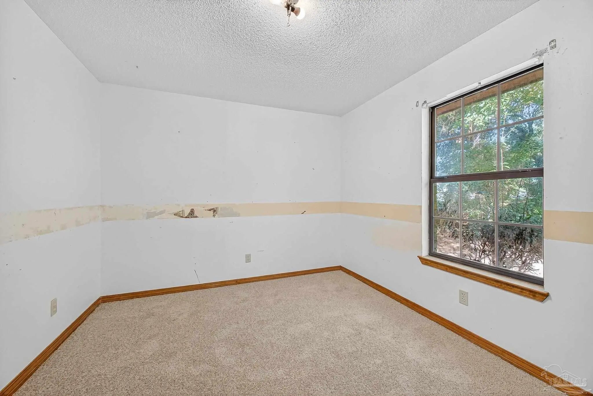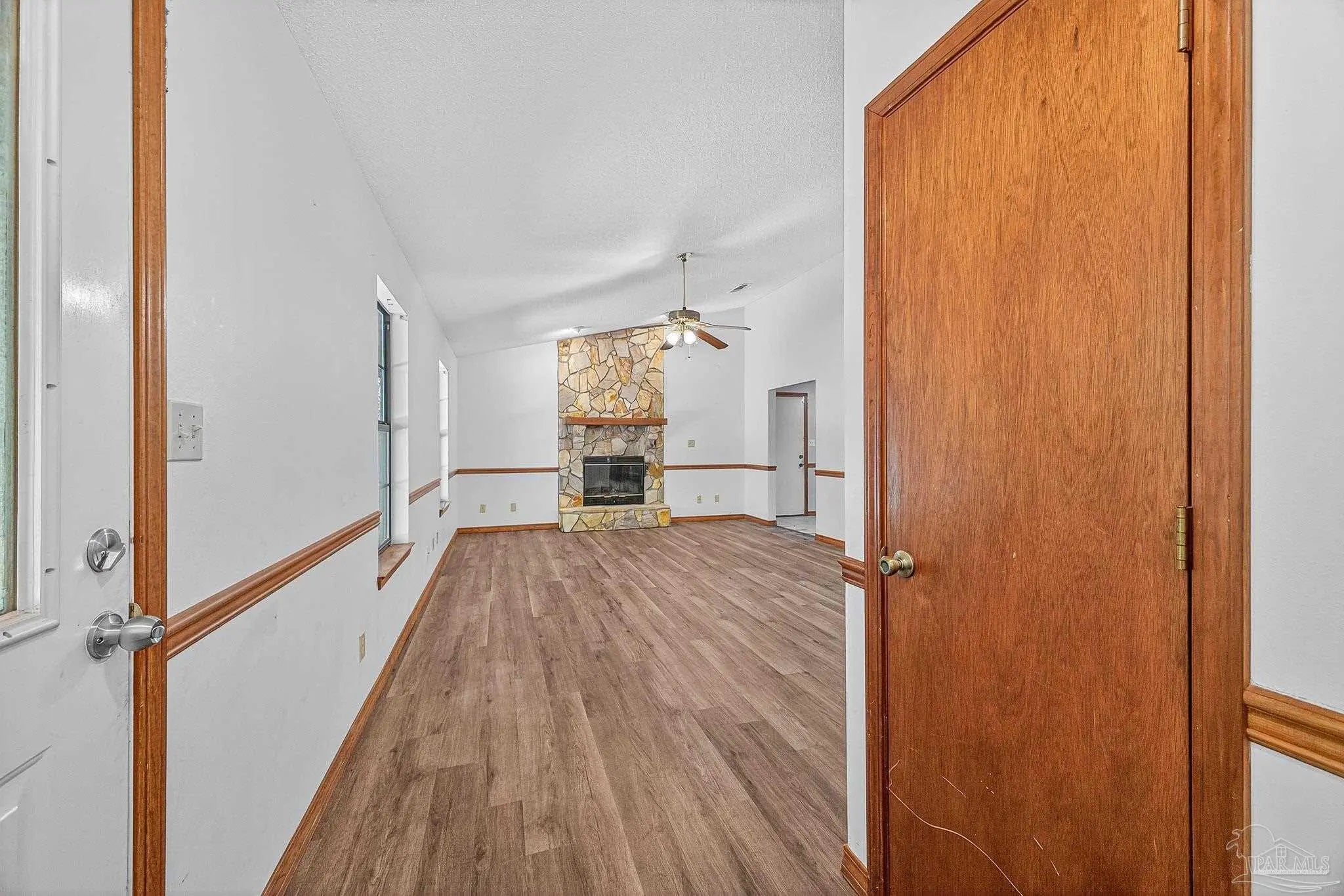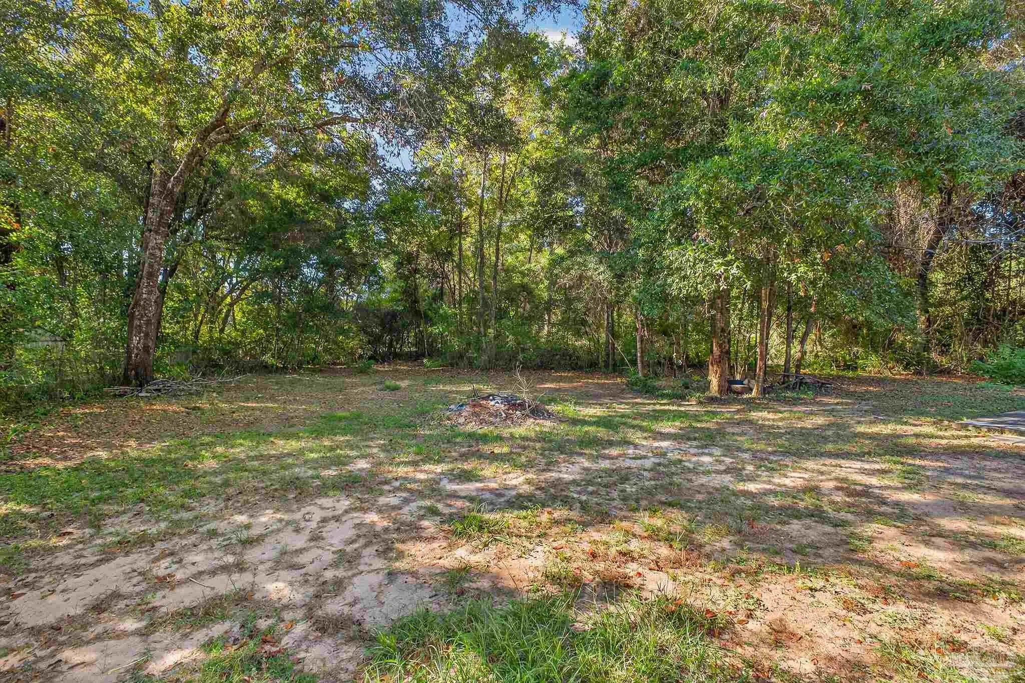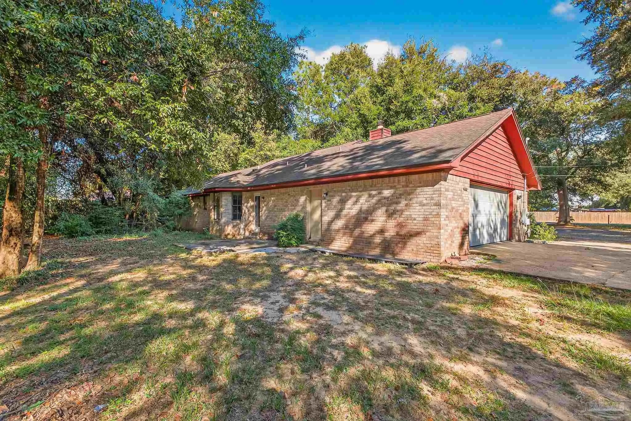 Now is your chance on this very spacious home on an expansive ONE ACRE lot. Brick home with wood siding, nice country style open front porch for rocking in the evening. New LVP flooring in the great room and hallway, with new carpet in the bedrooms. New HVAC unit installed in 2025. House features vaulted ceiling and fireplace in the Great Room; a formal dining room; breakfast nook in kitchen with island, smooth-top burners on cooktop, separate oven, new microwave, and new refrigerator; chair rail through Great Room, dining room, hallway, master bedroom; oversized 2-Car garage with washer/dryer hookup, pull-down stairs with lighting and storage. Master Bed/Bath area has 2 master closets and double vanity sinks. Hallway has extra large storage room with shelving. Ceiling fans located in master bedroom and great room. New roof installed in 2005. Two septic tanks - one large, one small. Seller has left portions of front and rear yard in natural state for privacy. Do not miss your chance to own a full acre of land while still being in the heart of Pace.