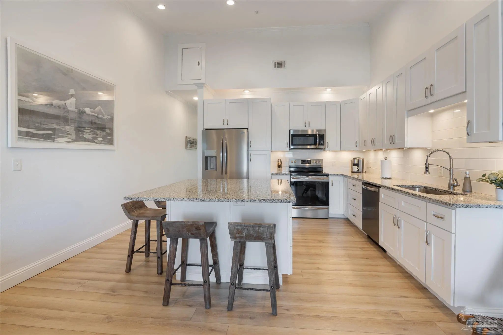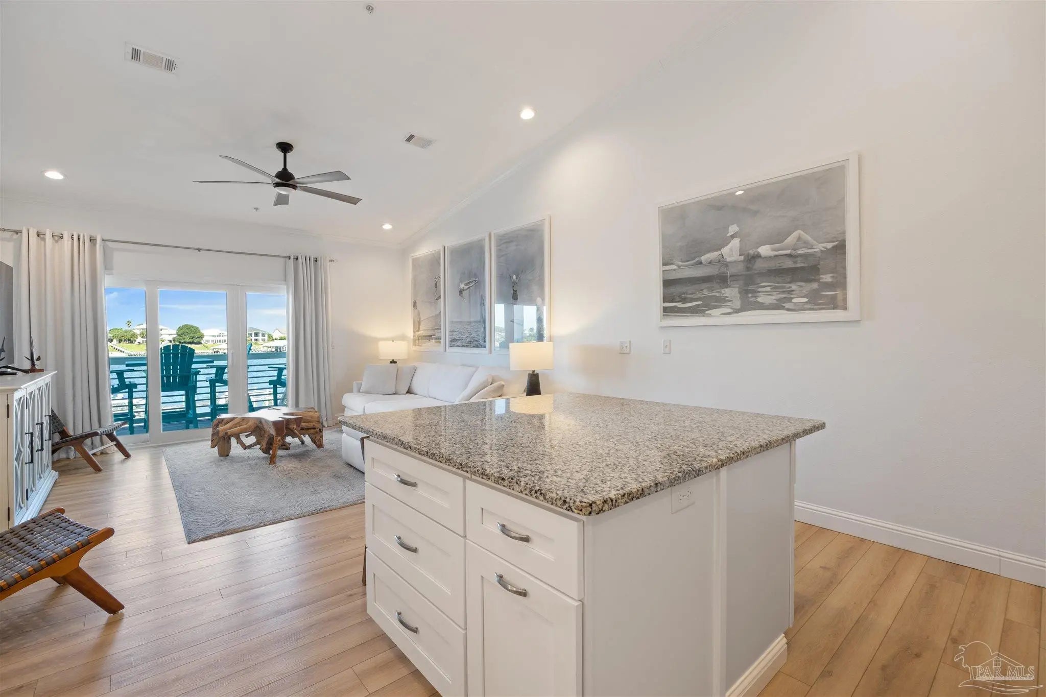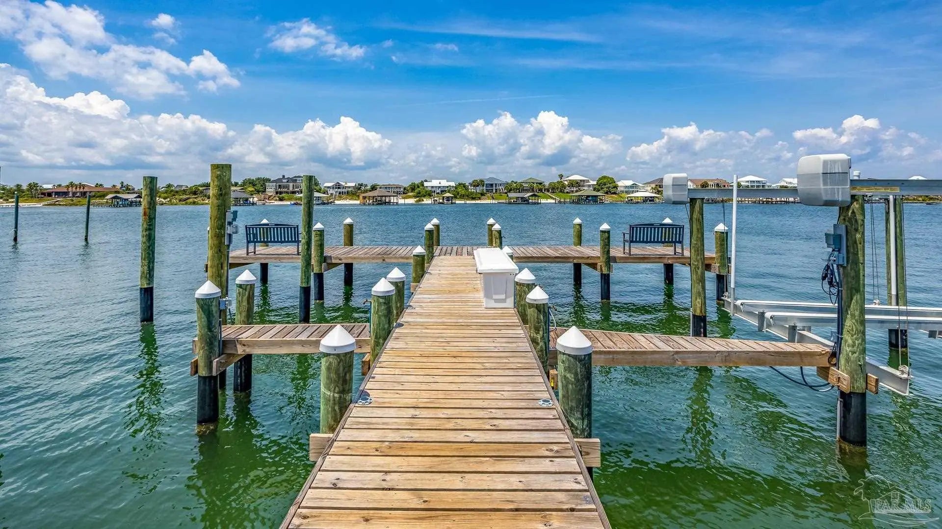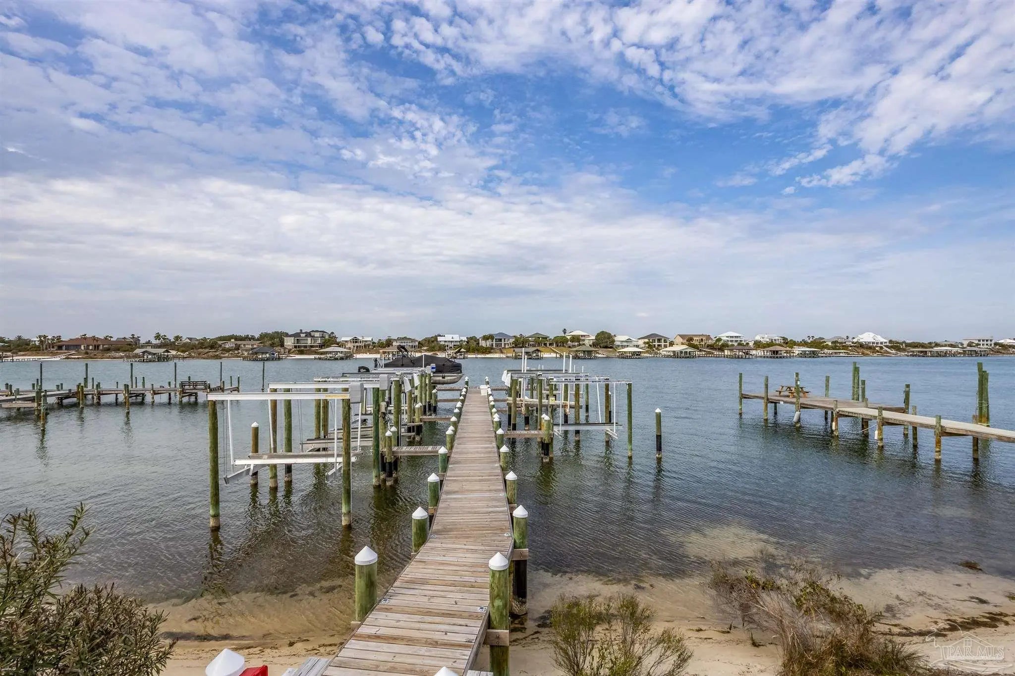 A Boater's Dream! Don't miss the opportunity to view this spacious 1-bedroom, 2-bath condo, built in 2022 and offering coastal living at its finest. Located directly on Old River, you’ll enjoy breathtaking waterfront views and some of the most stunning sunsets on the Gulf Coast. Filled with natural light from the double doors leading to a covered balcony, this condo features an open living and dining layout with a large island, ample cabinetry, and generous counter space — perfect for entertaining or relaxing. The flooring throughout is a natural wood-look plank tile, offering both beauty and low maintenance. The primary bedroom comfortably fits a king-size bed, matching nightstands, and a chest of drawers. The primary bathroom boasts dual sinks and a walk-in shower with classic subway tile. A second full bath offers convenience for guests, featuring a single vanity, toilet, and another walk-in shower. Bonus: This home has never been rented but is zoned for short-term rentals — ideal if you’re considering an investment opportunity! Even better, the condo comes with an assigned deep-water boat slip (B-2) equipped with a brand-new 10,000 lb boat lift. Located just minutes from the Flora-Bama and The Yacht Club Restaurant, this is a turnkey, fully furnished unit — just bring your suitcase! This is one you don’t want to miss — schedule your showing today!