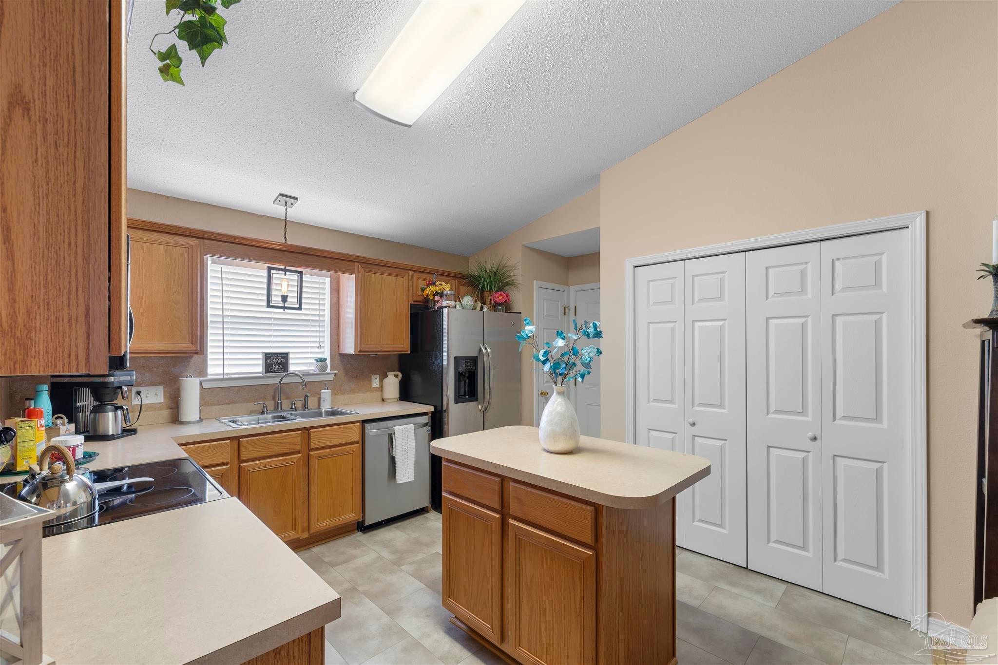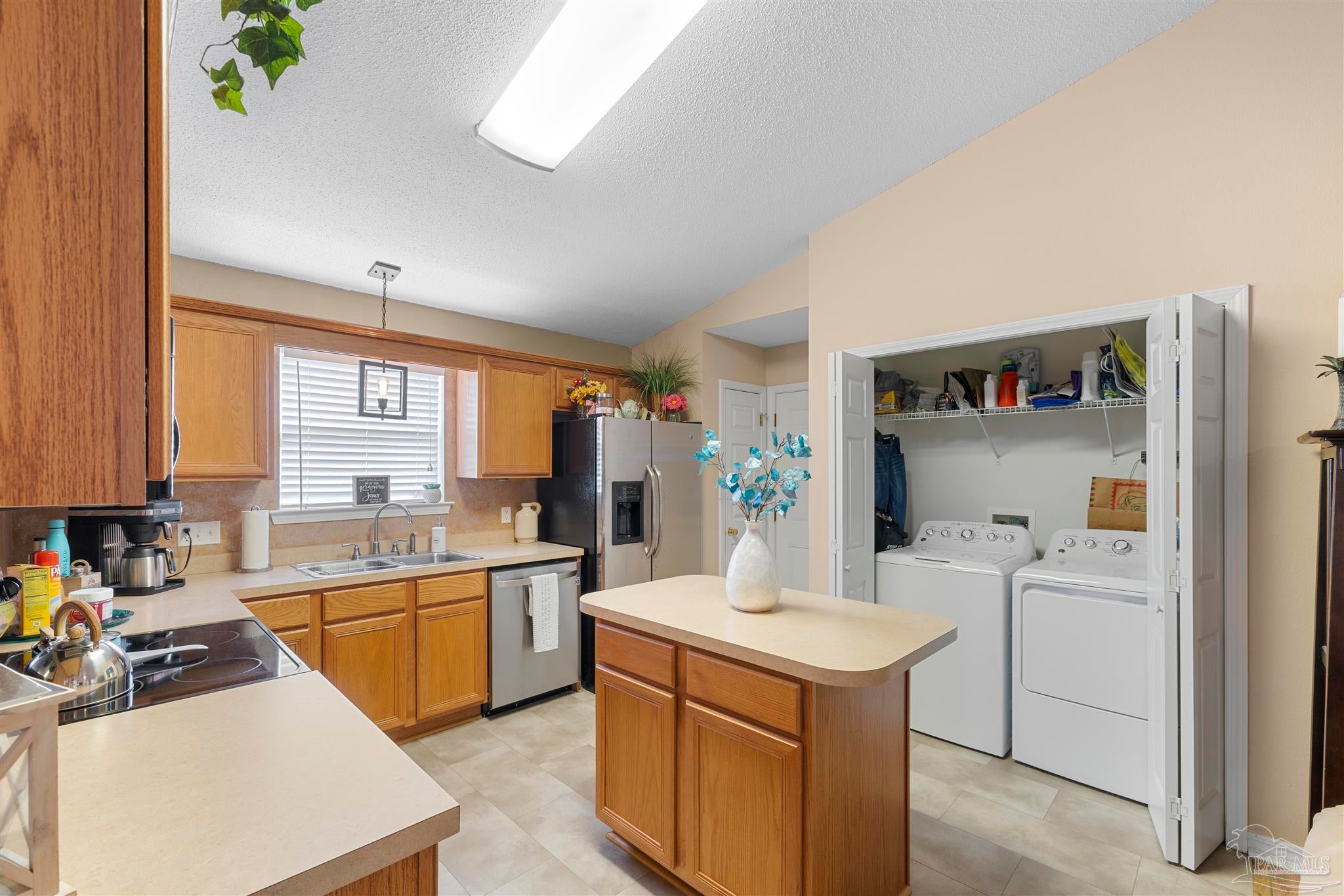 - Electric Water Heater, Built In Microwave, Dishwasher, Disposal, Refrigerator, Self Cleaning Oven