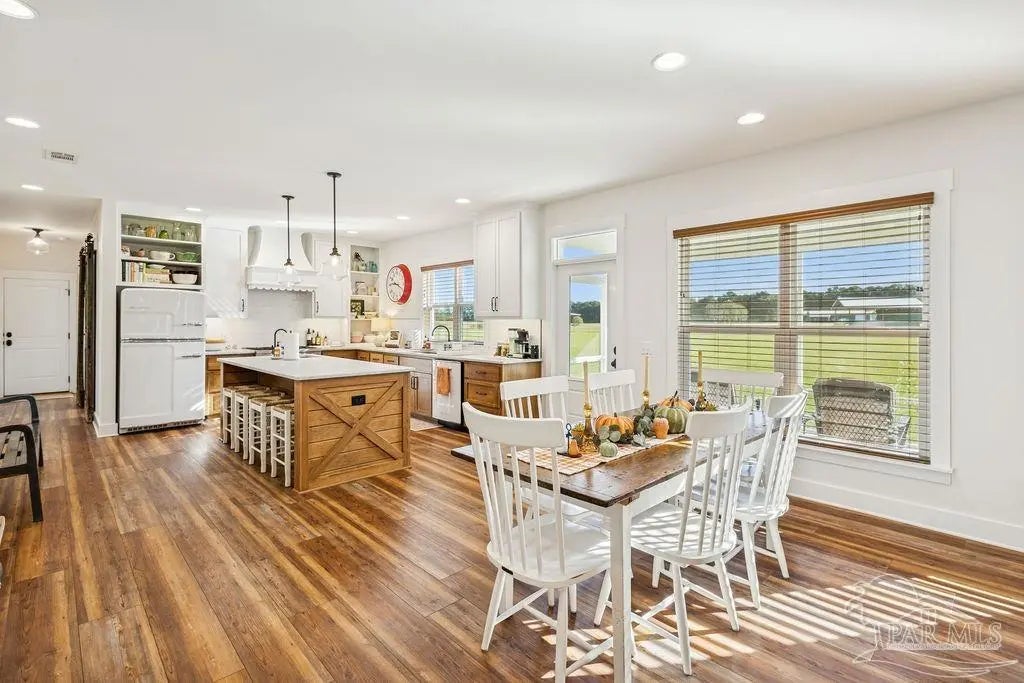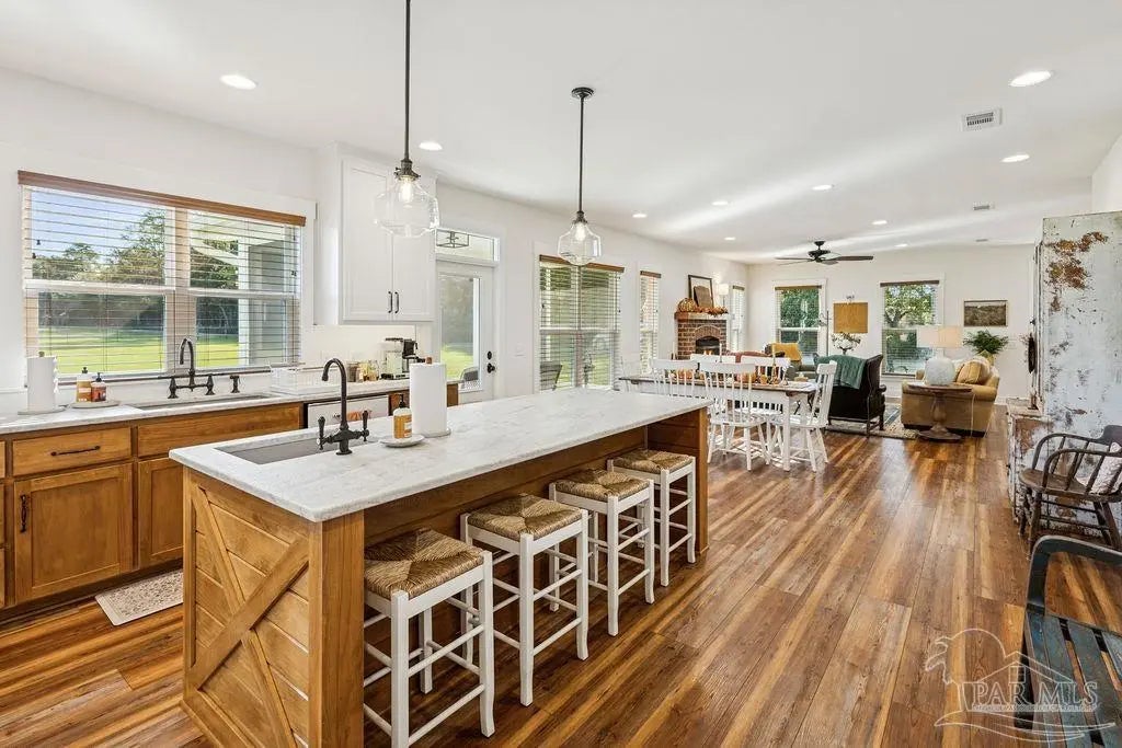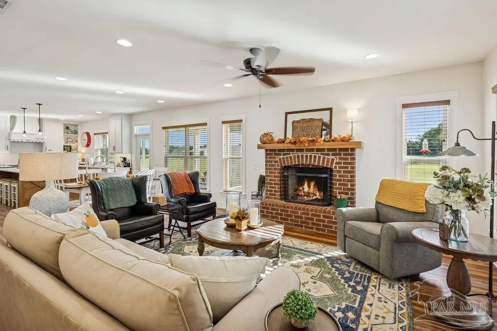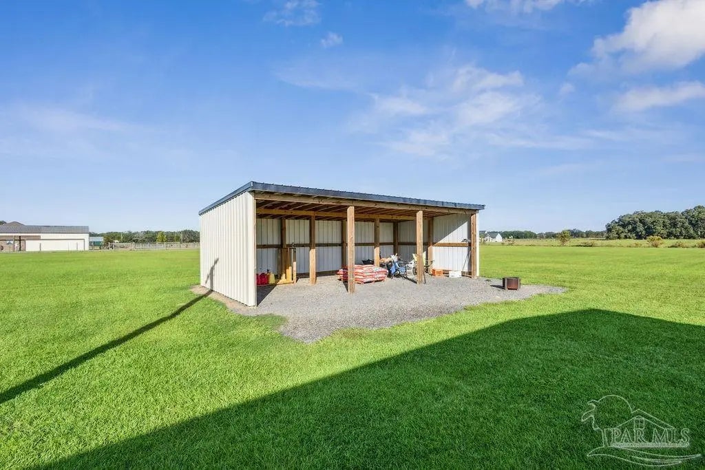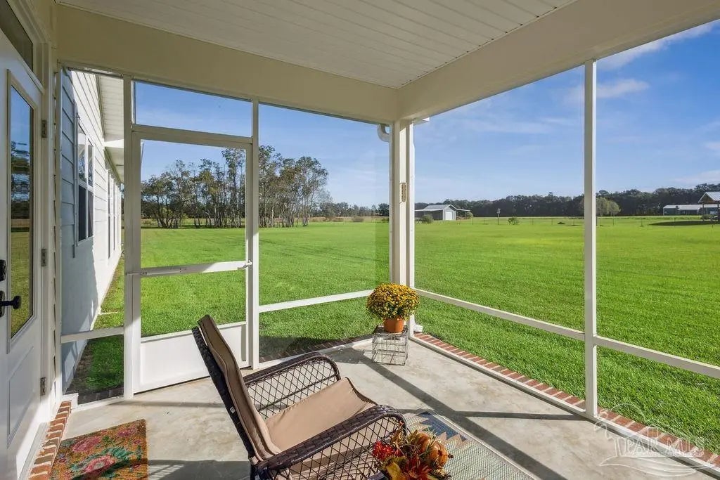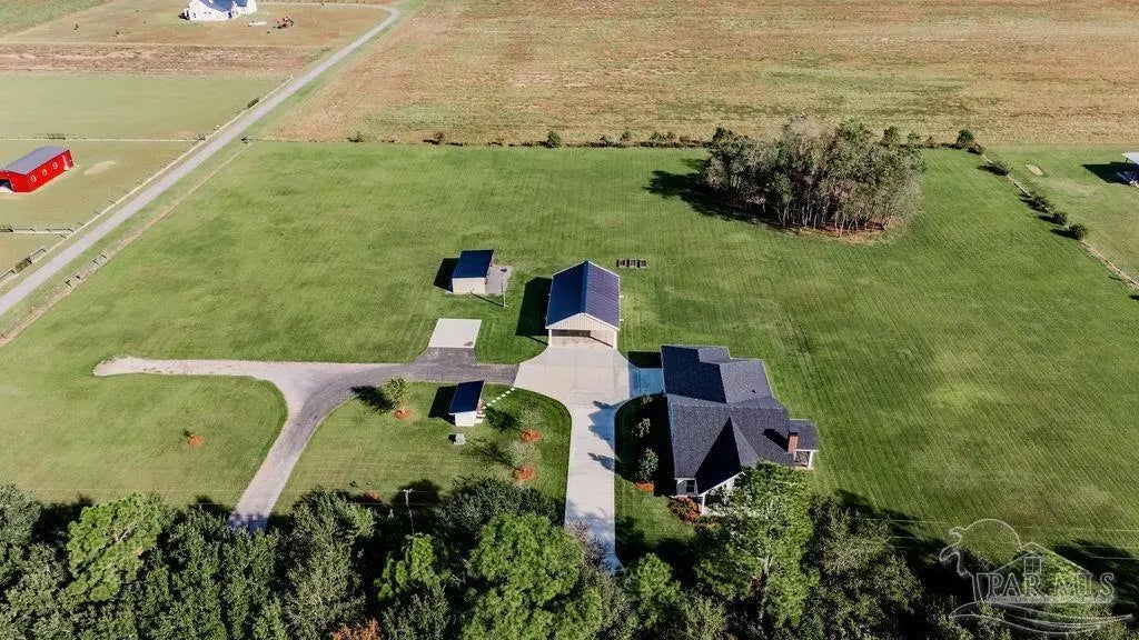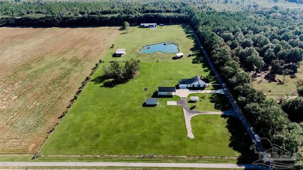 Beautifully designed home on 5 scenic acres surrounded by high-end estates. Ideally located just 5 minutes to Five Points and 20 minutes to Pensacola, this property features 2,263 sq ft of well-planned living space, a 30x50 insulated red-iron workshop, and quality finishes throughout. Interior highlights include LVP flooring, a wood-burning fireplace, and soft-close cabinetry paired with leathered Dolomite countertops and Big Chill appliances, including a gas range. The kitchen offers a tile backsplash, built-in pantry shelving with a charming screen door, and a separate mudroom entry with beautiful built-ins. The primary suite includes a walk-in closet with built-ins, a drop-in tub, and a marble walk-in shower. Additional bedrooms feature a 1 bedroom w a private en-suite and 2 additional bedrooms sharing a hallway bath with dual sinks and hallway linen storage. Additional features include: • Whole-home air purifier integrated into HVAC • Spray-foam insulation • Two 50-gallon electric water heaters • Screened back porch with dual exterior doors & transoms • Spacious laundry room with Charles Phillips barn doors • Well with pH neutralizer and filtration system Exterior amenities include a 30x50 engineered red-iron shop (25x30 enclosed + 25x30 carport) with concrete flooring, RV hookup (50 amp), generator switch, concrete drive, gutters, irrigation, wet-weather pond, and fencing. 3500 Red Ryder Lane offers the perfect balance of luxury, privacy, and convenience in a highly desirable Northwest Florida setting.
