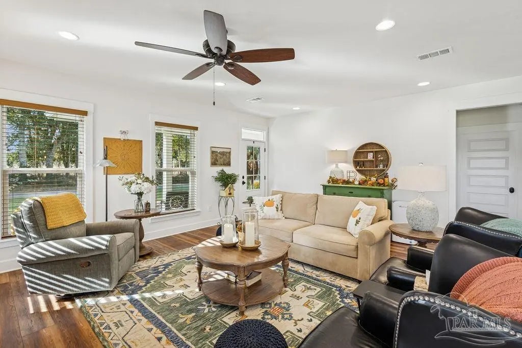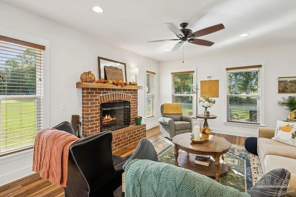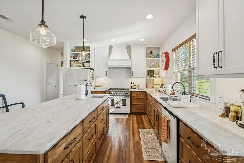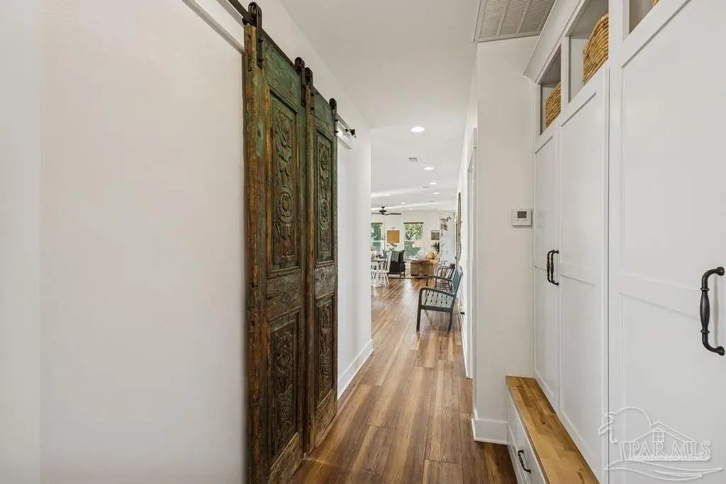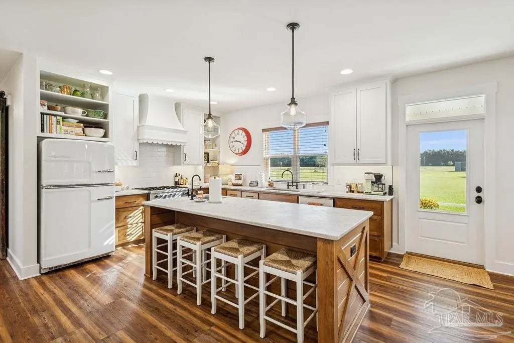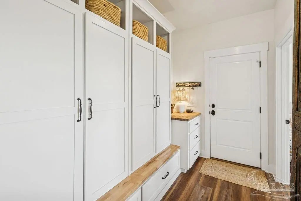 Beautifully designed home on 5 scenic acres surrounded by high-end estates. Ideally located just 5 minutes to Five Points and 20 minutes to Pensacola, this property features 2,263 sq ft of well-planned living space, a 30x50 insulated red-iron workshop, and quality finishes throughout. Interior highlights include LVP flooring, a wood-burning fireplace, and soft-close cabinetry paired with leathered Dolomite countertops and Big Chill appliances, including a gas range. The kitchen offers a tile backsplash, built-in pantry shelving with a charming screen door, and a separate mudroom entry with beautiful built-ins. The primary suite includes a walk-in closet with built-ins, a drop-in tub, and a marble walk-in shower. Additional bedrooms feature a 1 bedroom w a private en-suite and 2 additional bedrooms sharing a hallway bath with dual sinks and hallway linen storage. Additional features include: • Whole-home air purifier integrated into HVAC • Spray-foam insulation • Two 50-gallon electric water heaters • Screened back porch with dual exterior doors & transoms • Spacious laundry room with Charles Phillips barn doors • Well with pH neutralizer and filtration system Exterior amenities include a 30x50 engineered red-iron shop (25x30 enclosed + 25x30 carport) with concrete flooring, RV hookup (50 amp), generator switch, concrete drive, gutters, irrigation, wet-weather pond, and fencing. 3500 Red Ryder Lane offers the perfect balance of luxury, privacy, and convenience in a highly desirable Northwest Florida setting.