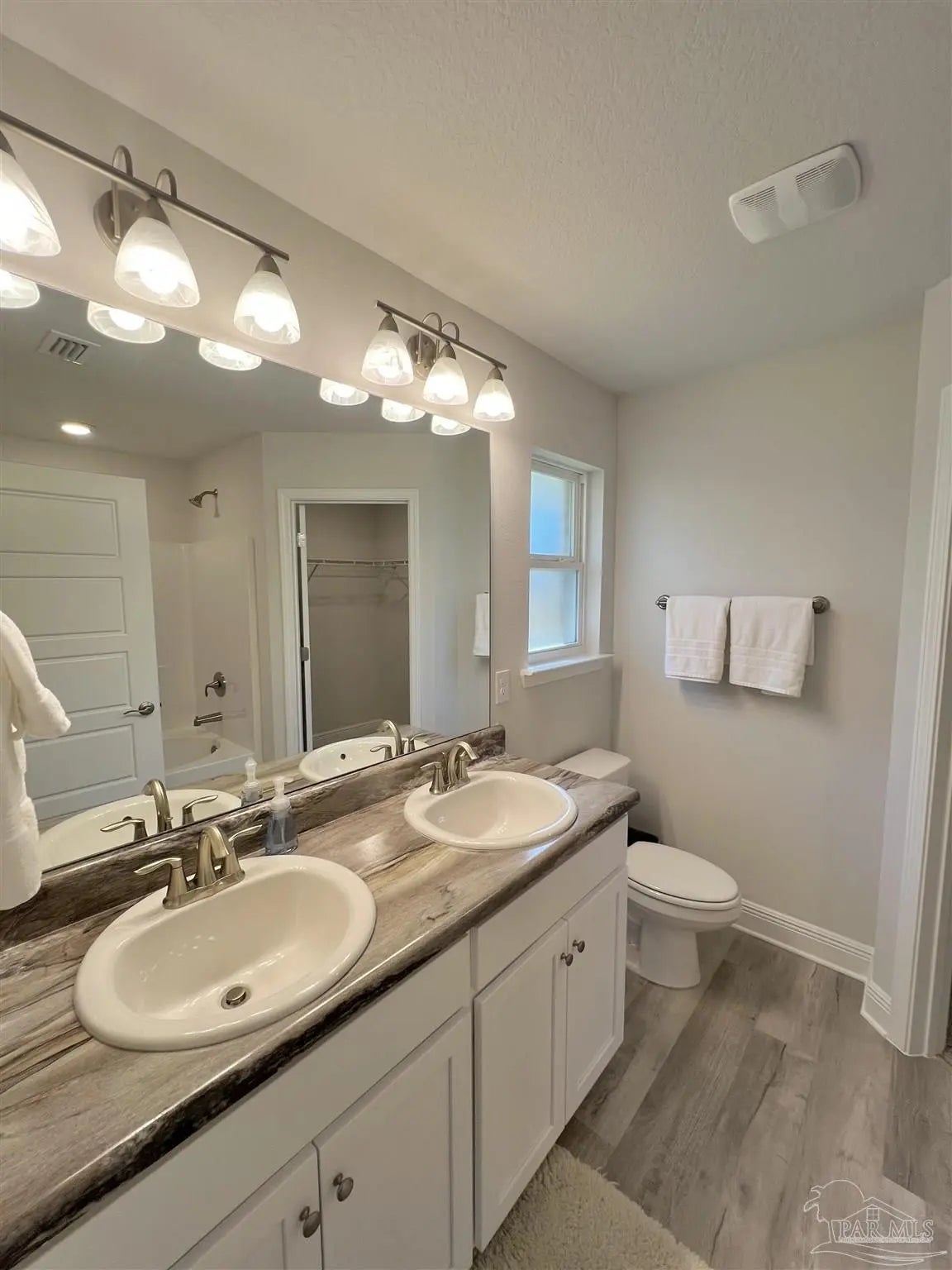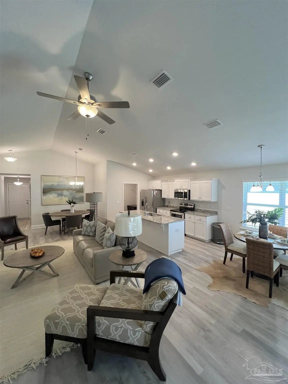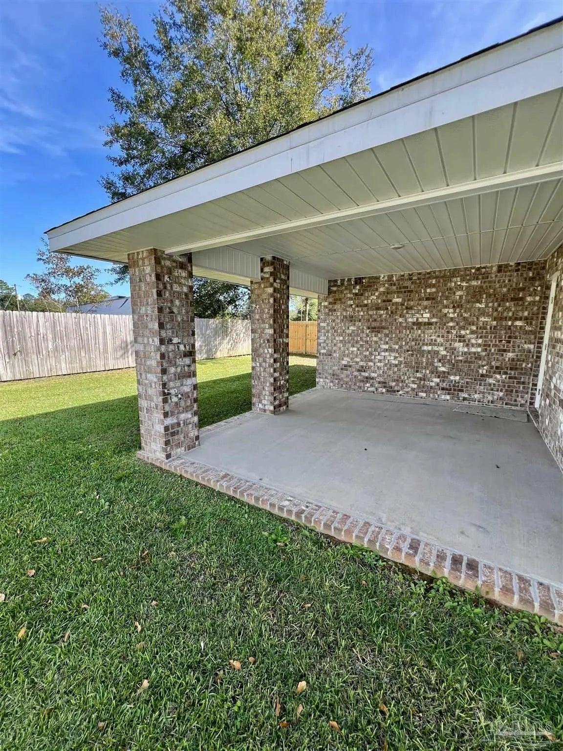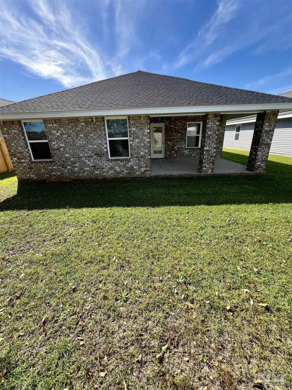 ***MOVE IN READY!!!*** CONVENIENTLY LOCATED TO NAVY FEDERAL, UWF AND ALL THE SHOPPING NEEDED FOR YOUR EVERYDAY NEEDS. THIS 4 SIDES BRICK 1425 PLAN IS A 3 BEDROOM 2 BATH THAT IS SURE TO IMPRESS YOU FROM THE TIME YOU ENTER INTO THE HOME THROUGH THE FOYER. THE ENTIRE HOME HAS LUXURY VINYL PLANK FLOORING THROUGHOUT WITH CARPET IN THE BEDROOMS ONLY. AS YOU LEAVE THE FOYER, YOU ARE GREETED BY THE MASSIVE OPEN FLOOR PLAN. THE GIANT FAMILY ROOM HAS A CEILING FAN. THERE IS A SINGLE FRENCH DOOR THAT OPENS ONTO A 15 X 13 COVERED PATIO THAT IS PERFECT FOR A MORNING CUP OF COFFEE OR ENTERTAINING ON THE WEEKEND. THE KITCHEN IS OPEN TO THE FAMILY ROOM AND CONTAINS STAINLESS STEEL APPLIANCES, WHITE SOLID WOOD SHAKER STYLE CABINETS AND A COUNTER HEIGHT BAR WITH GRANITE COUNTER TOPS. OFF OF THE KITCHEN, THERE IS A LAUNDRY ROOM THAT LEADS TO A FINISHED 2 CAR GARAGE THAT HAS A GARAGE DOOR OPENER. THE MASTER BEDROOM IS OFF OF THE FAMILY ROOM AND HAS A CEILING FAN AND BOXED CEILING. THE MASTER BEDROOM OPENS UP TO THE MASTER BATH THAT HAS A DOUBLE VANITY, WALK-IN CLOSET AND SHOWER/ TUB COMBO. THE ADDITIONAL BEDROOMS ARE IN A SEPARATE HALLWAY AND HAVE AMPLE CLOSET SPACE. BOTH SPARE BEDROOMS SHARE A BATH THAT CONTAINS A SINGLE VANITY AND SHOWER/ TUB COMBO. HOME ALSO HAS A 4 ZONE SPRINKLER SYSTEM ALREADY INSTALLED!