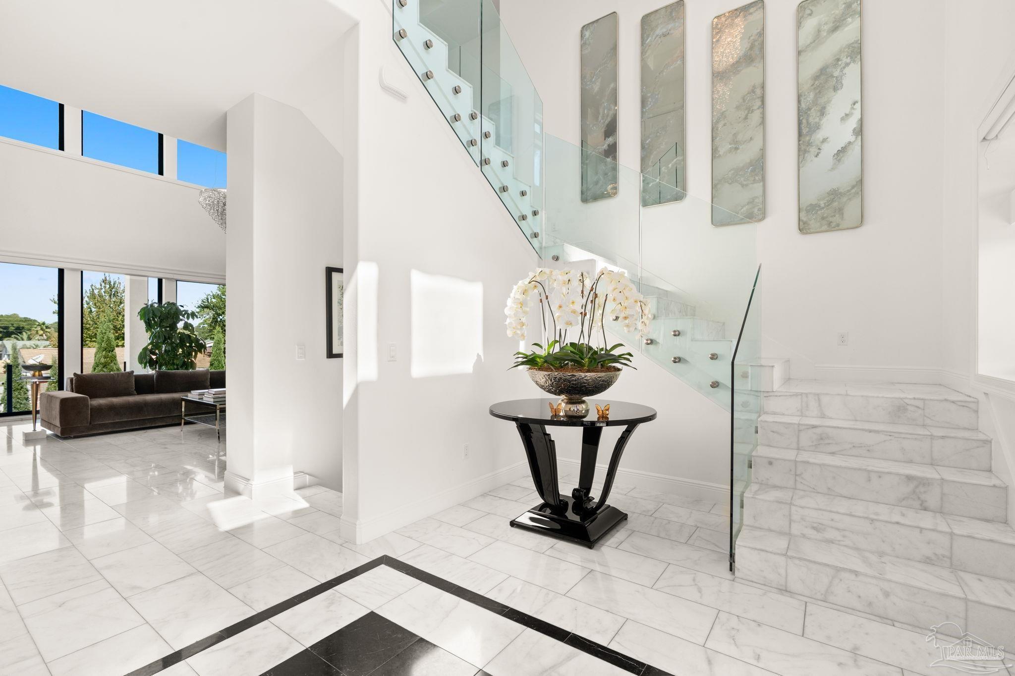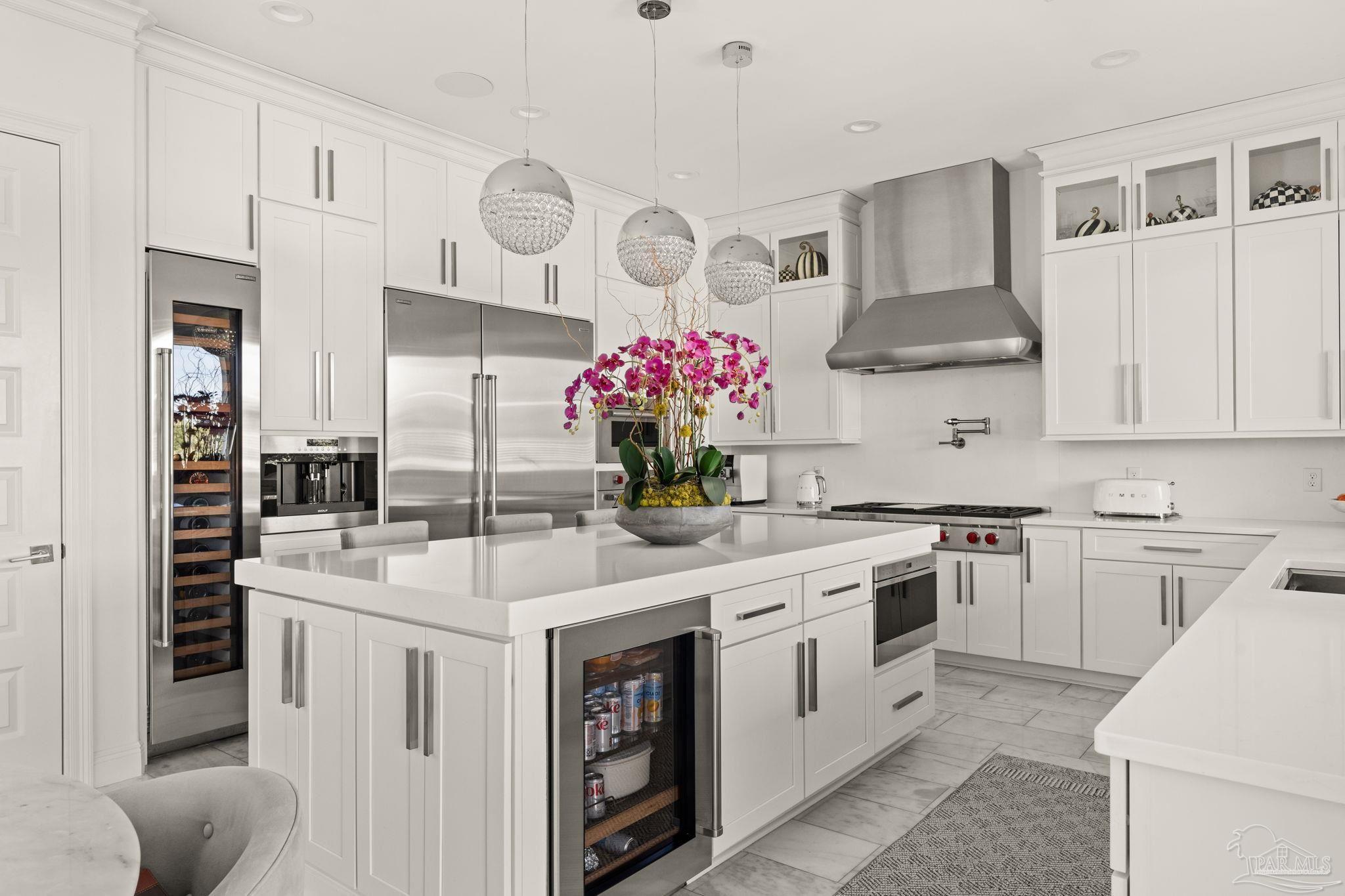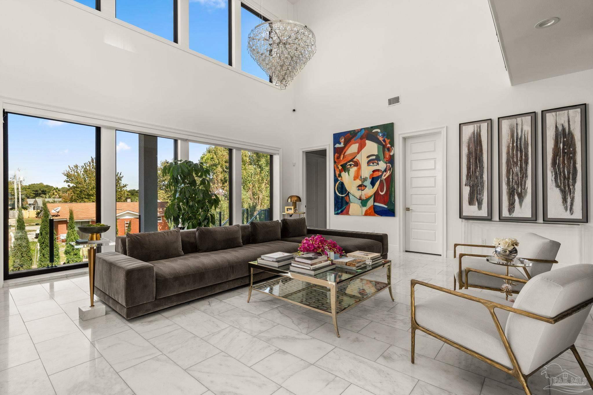 Experience modern coastal elegance in this architecturally stunning Brian Spencer home, ideally located in the prestigious Santa Rosa Shores community of Gulf Breeze. Built in 2021 with ICF construction, this residence was designed for strength, efficiency, and enduring beauty — blending timeless craftsmanship with contemporary design. This 5-bedroom, 5-bath home offers expansive, light-filled spaces with soaring ceilings, designer lighting, and exquisite millwork throughout. The chef’s kitchen is a showpiece featuring Wolf appliances, a built-in coffee system, quartz countertops, custom cabinetry, and a generous walk-in pantry — seamlessly connected to the open-concept living and dining areas, perfect for both entertaining and everyday living. A private elevator provides access to all levels, while the primary suite offers a priceless views and a serene retreat with a spa-inspired bath. The oversized walk incloset will bring so much joy to the Lady of the house with its ambiance and luxe feel. Additional highlights include a dedicated 8.1 surround-sound theater, smart home automation, and an oversized tandem garage with built-in storage. The outdoor living space rivals any resort, showcasing a newly constructed gourmet kitchen with premium appliances, bar seating, and stone detailing, all overlooking a sparkling pool and spacious patio surrounded by tropical landscaping. Located minutes from Tiger Point Golf Club, the public boat launch, boutique dining, playground, pickle ball courts, top-rated schools — and just a short drive to the sugar-white sands of Pensacola Beach — this property captures the best of coastal living. Listed below appraised value, this Brian Spencer masterpiece offers unmatched quality, innovation, and lifestyle along the Gulf Coast.