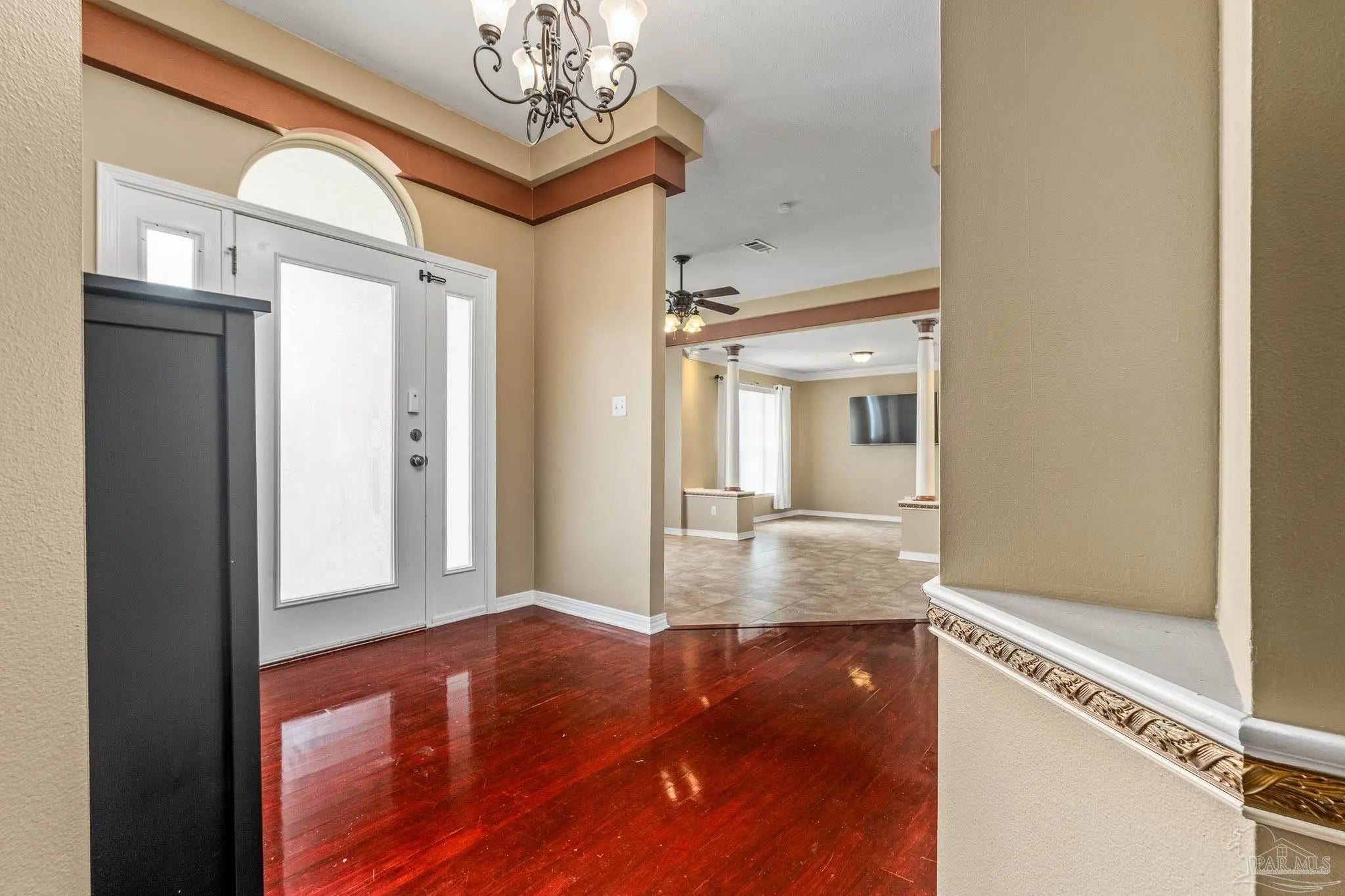 Welcome to this beautifully appointed 4-bedroom, 2-bathroom residence in the sought-after Kings Road area of Cantonment, Florida—a bright, open-and-welcoming space designed for both comfort and style. From the moment you arrive, you’re greeted by a spacious entry that flows seamlessly into an open-floor-plan living area. Vaulted ceilings rise above the living space, where natural light floods through expansive windows, and a cozy fireplace anchors the room – perfect for gatherings and quiet evenings alike. The heart of the home is the chef’s kitchen: bright and airy, featuring an island for casual dining and entertaining, generous counter space, and sleek finishes—all designed for ease and elegance with the Crown Molding throughout the house. Brand New HVAC replaces 2025, Water Heater replaces 2025, Roof replaces 2021. Come check this out.