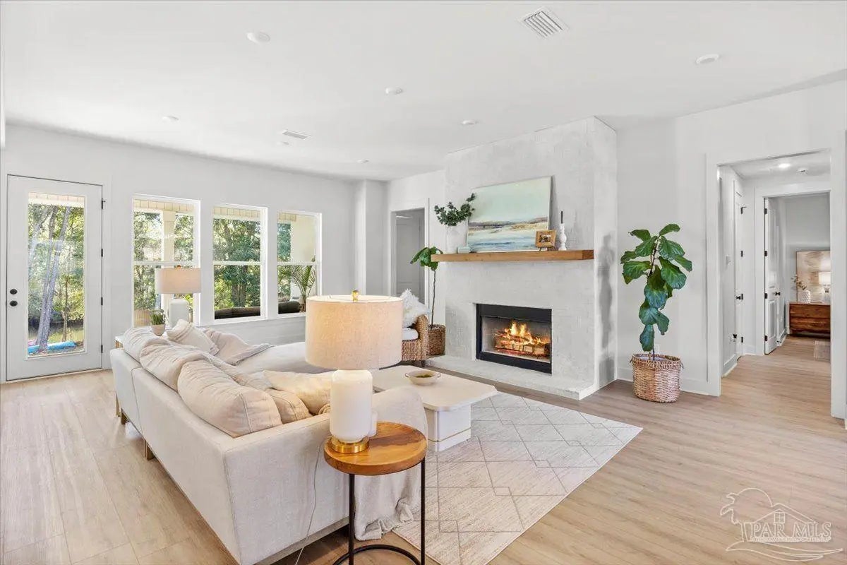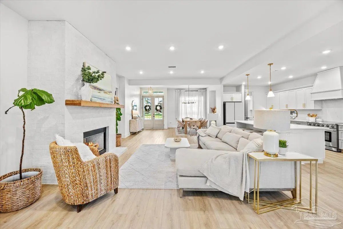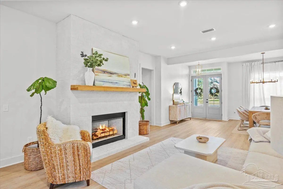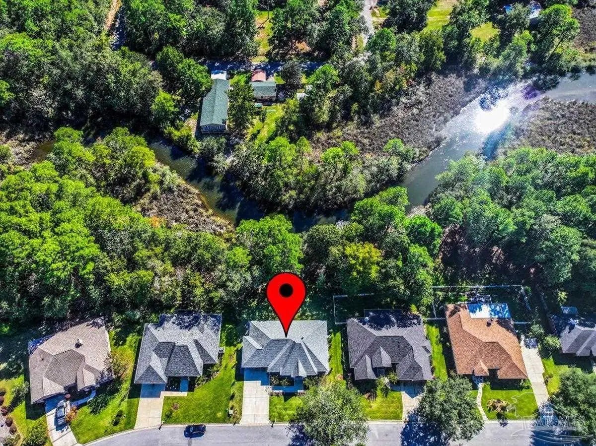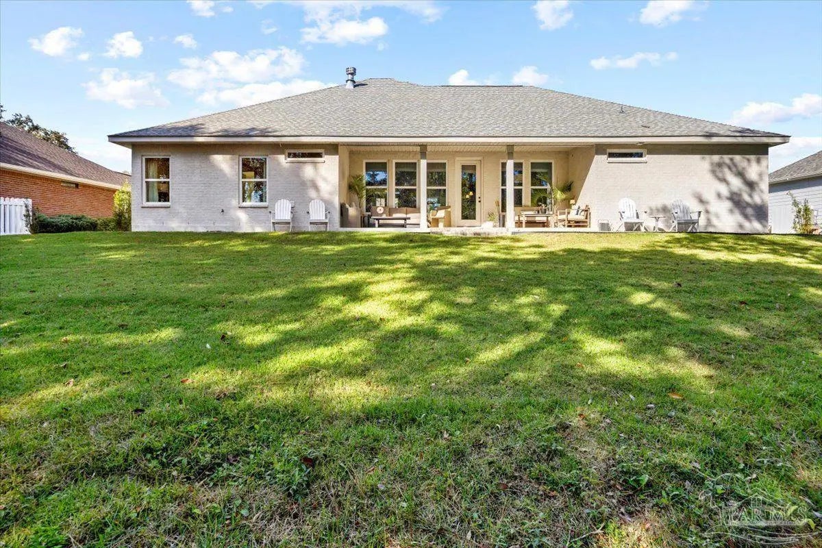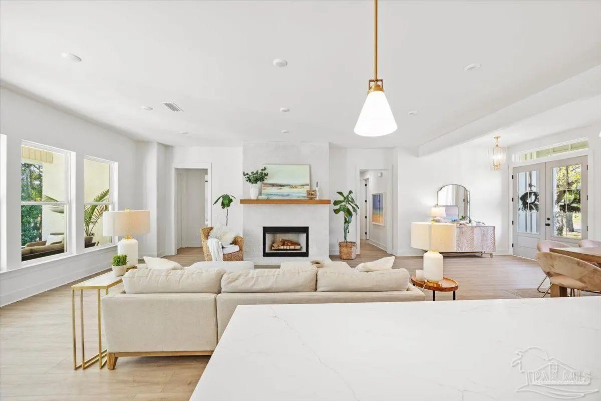 Experience serene waterfront living in this custom built home offering 90 ft of private water frontage on Mulat Bayou, directly connecting to Escambia Bay. Designed with a sleek minimalist aesthetic, this home features 10’ ceilings, 8’ doors, and smooth flat-finish walls for a refined, modern look. The open-concept layout showcases extra-long 6’ luxury vinyl plank flooring that flows seamlessly throughout, paired with white and gold accents, recessed lighting, and wide modern base trim. A floor-to-ceiling brick fireplace with cedar mantle anchors the great room, creating a warm yet sophisticated centerpiece. The chef’s kitchen impresses with 36” THOR range, solid maple shaker cabinets, quartz counters and backsplash, butler’s pantry with sink, and handle-free glass refrigerator. The triple-split floor plan offers ideal privacy: two front bedrooms share a full bath, the primary suite enjoys a spa-style ensuite with frameless double shower and gold MOEN fixtures, and a fourth bedroom with adjacent bath near the garage provides flexible guest or office space. Built to last, the home includes hurricane-rated (170 mph) windows, steel corner plates, rafter brackets, and reinforced sill plates, contributing to impressive insurance savings The brick + Hardie exterior is complemented by soffit lighting, irrigated landscaping, and cushy zoysia sod. Enjoy kayaking, fishing, or quiet mornings or sunset views by the water in this peaceful community.